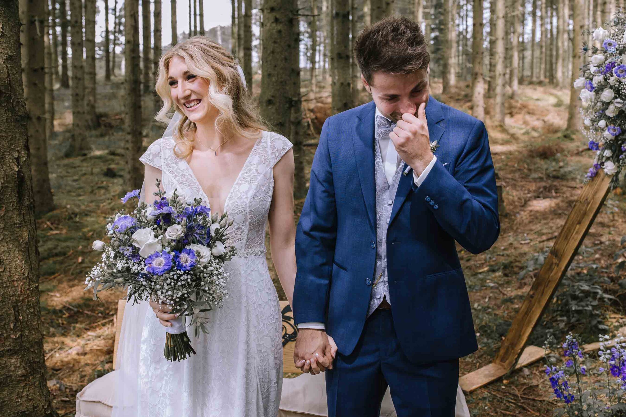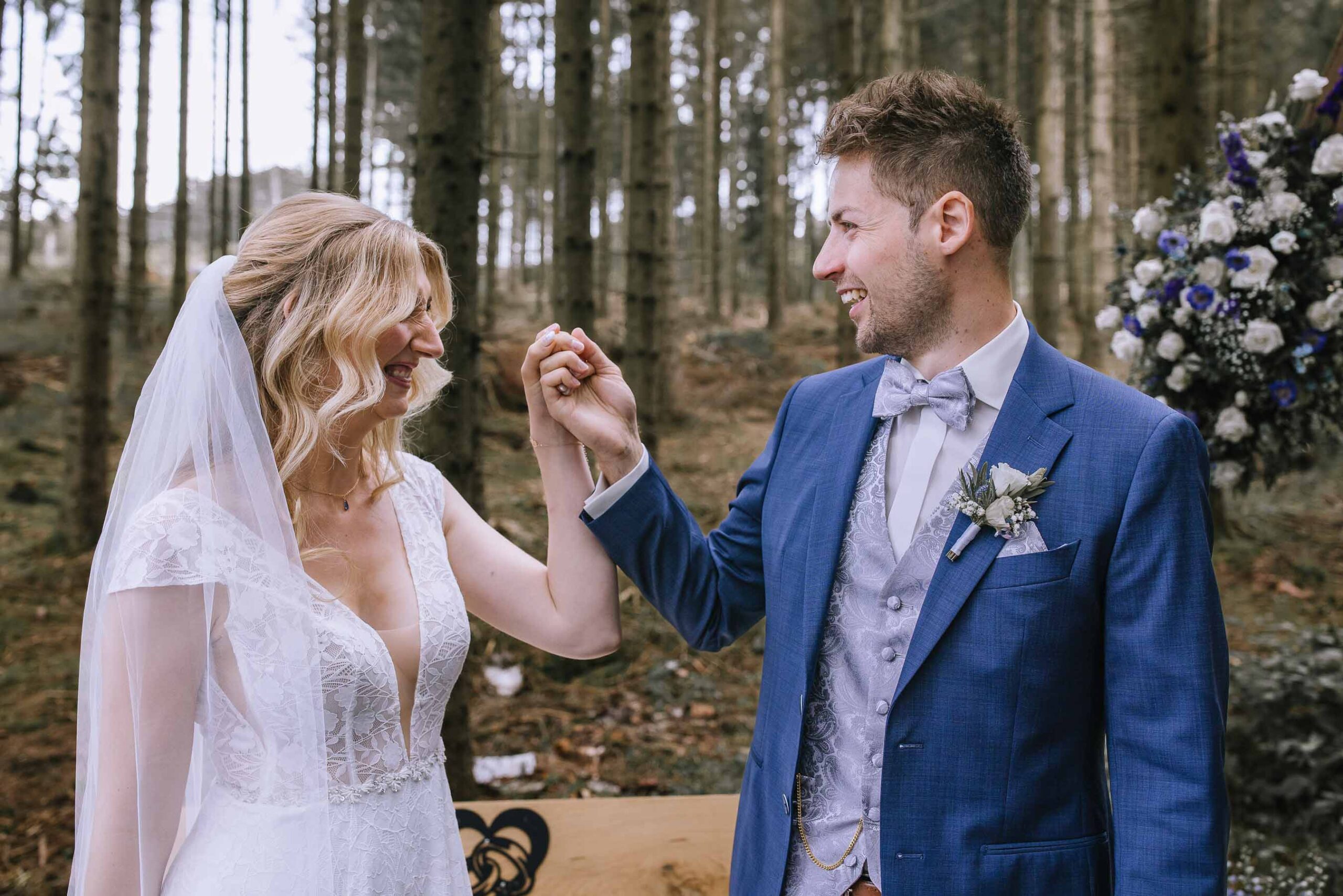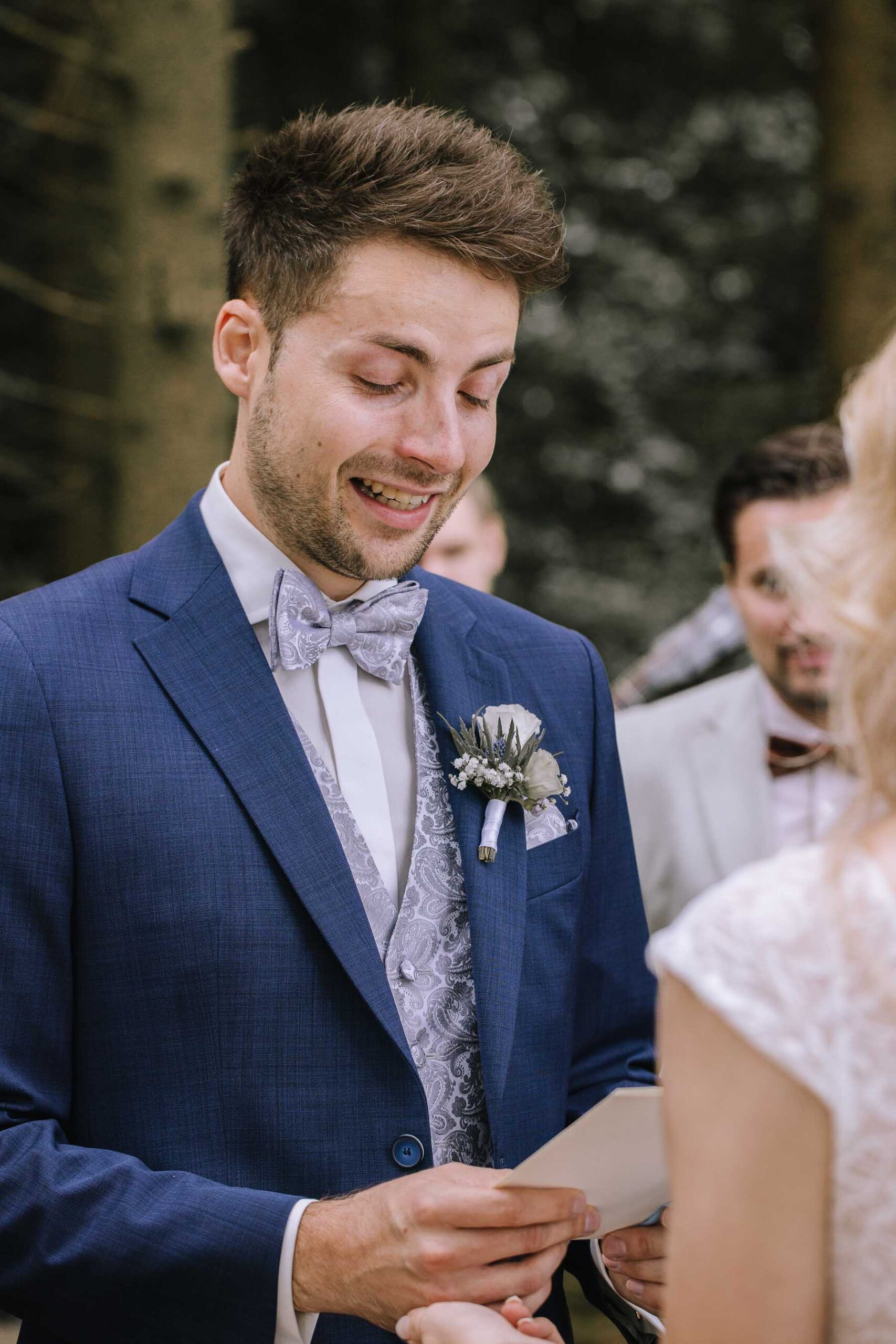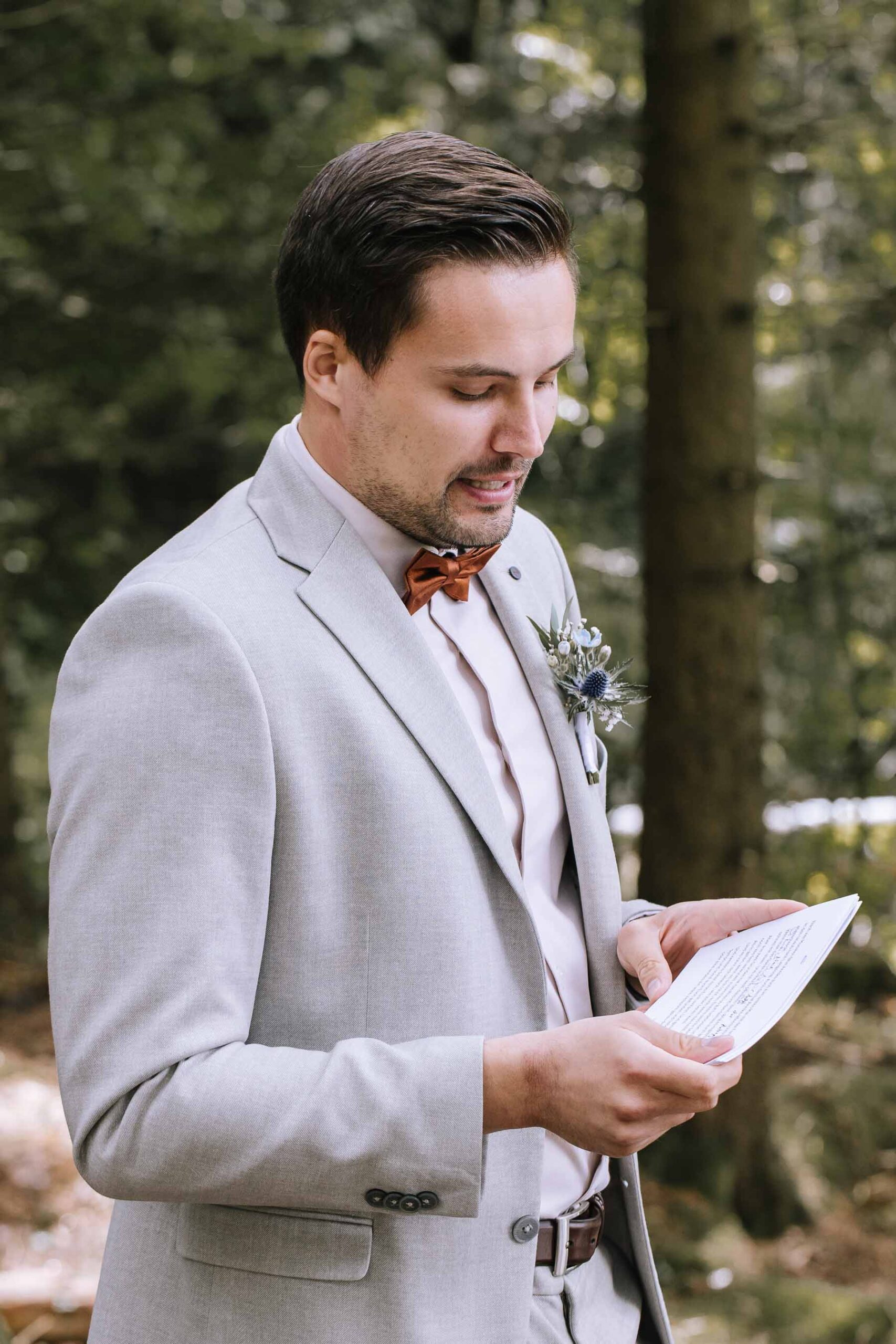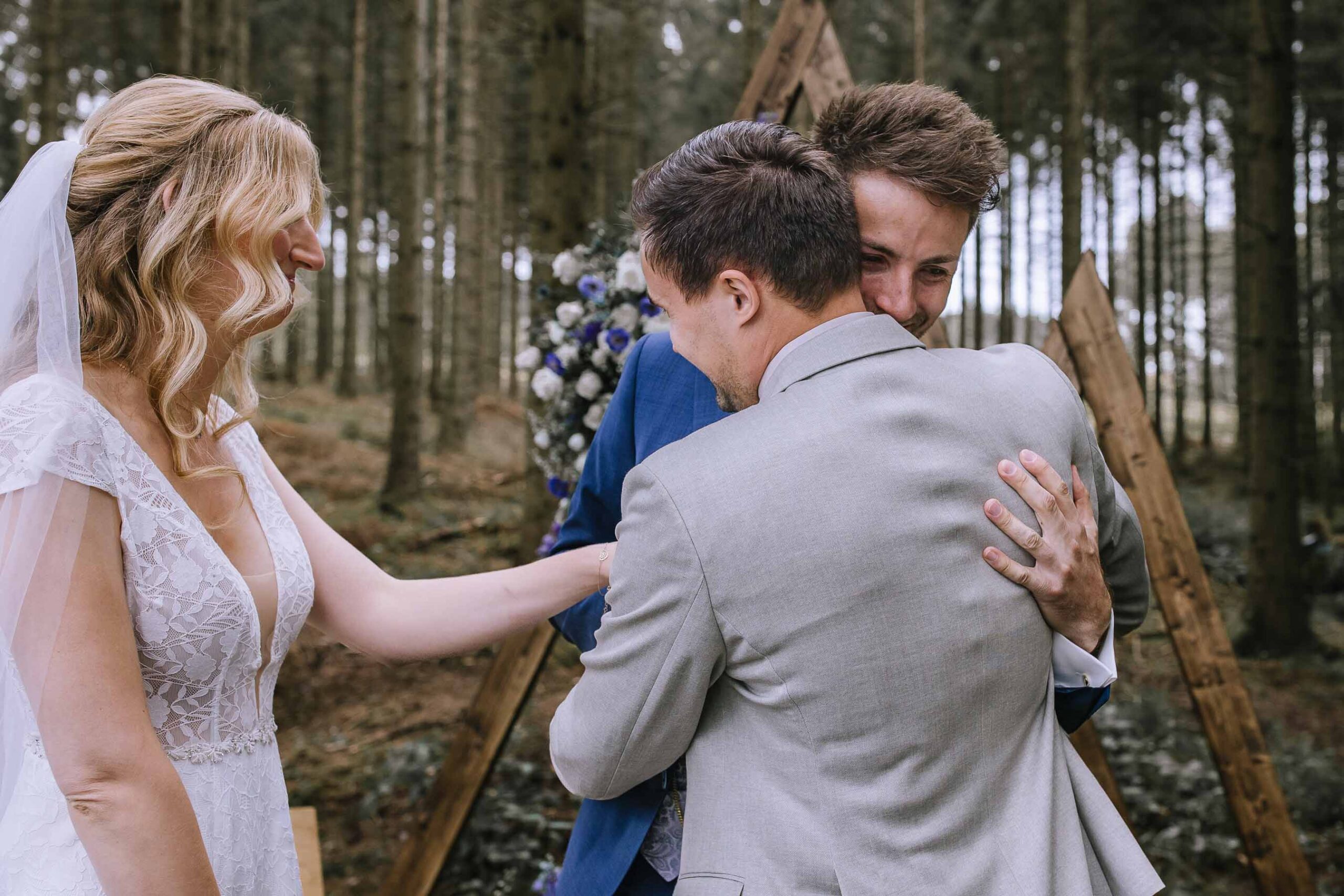 Die freie Trauung von Annika und Sven im Wald in der Hochzeitslocation Friggen (Gut Ahe) war ein wahres Highlight dieses unvergesslichen Hochzeitstages. Der Vormittag hatte uns noch mit Regen und unklaren Wetterbedingungen einen kleinen Strich durch die Rechnung gemacht, aber als die Trauung schließlich beginnen konnte, hörte der Regen auf und der Wald zeigte sich in seiner vollen Schönheit. Der Moment, als die Sonne sanft durch die Bäume brach, war einfach magisch. Es war genau das, was die beiden sich erträumt hatten – eine Trauung im Freien, inmitten der Natur, in einer der schönsten Hochzeitslocations im Sauerland. Die Vorbereitungen für die Hochzeit waren ebenfalls voller liebevoller Details. Bevor die Trauung aber losging, hatte ich die Gelegenheit, die wunderschöne Hochzeitslocation Friggen, den Neubau von Gut Ahe, zu fotografieren. Den Saal, den Willi von Blumen Schepper zusammen mit Annika und Sven vorbereitet hatte, war perfekt auf das Waldthema abgestimmt und trug zur besonderen Atmosphäre bei. Nach dem Einfangen dieser Eindrücke ging es weiter mit dem Getting Ready von Sven, der von seinen beiden Trauzeugen unterstützt wurde. Es war eine entspannte, fröhliche Stimmung, die den Tag von Anfang an begleitete. Annika hingegen bereitete sich in einem rustikalen Hotelzimmer auf die Zeremonie vor, mit ihren Omas als „Flower Grannies“, die für den perfekten Moment sorgten, als sie mit Annika gemeinsam zur Traulocation im Wald gingen. Sven war sichtlich gerührt, als er Annika sah – der perfekte Moment, um in die Trauung zu starten.