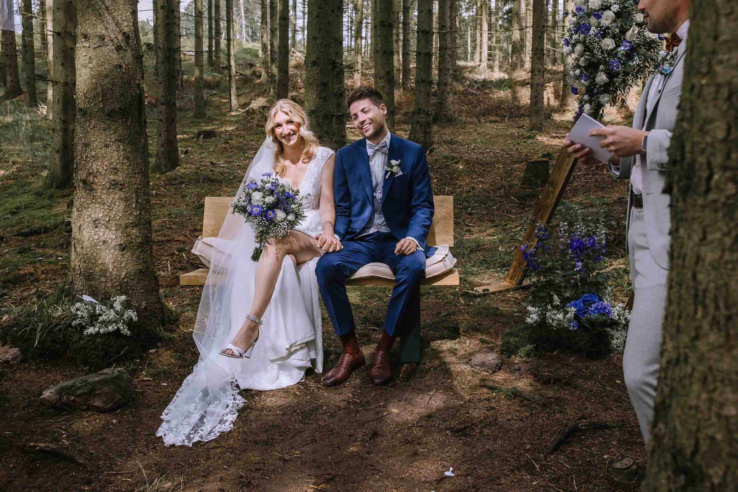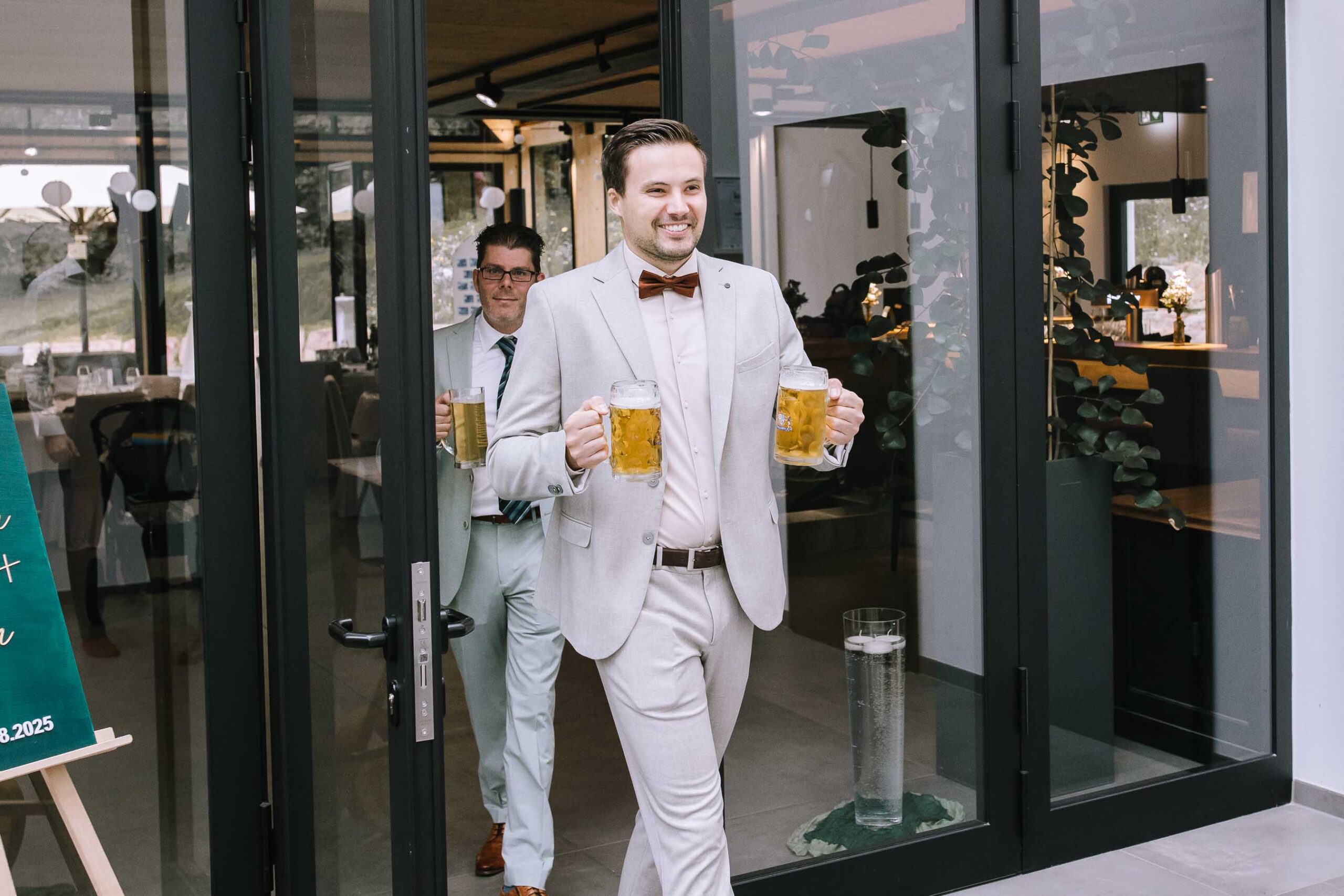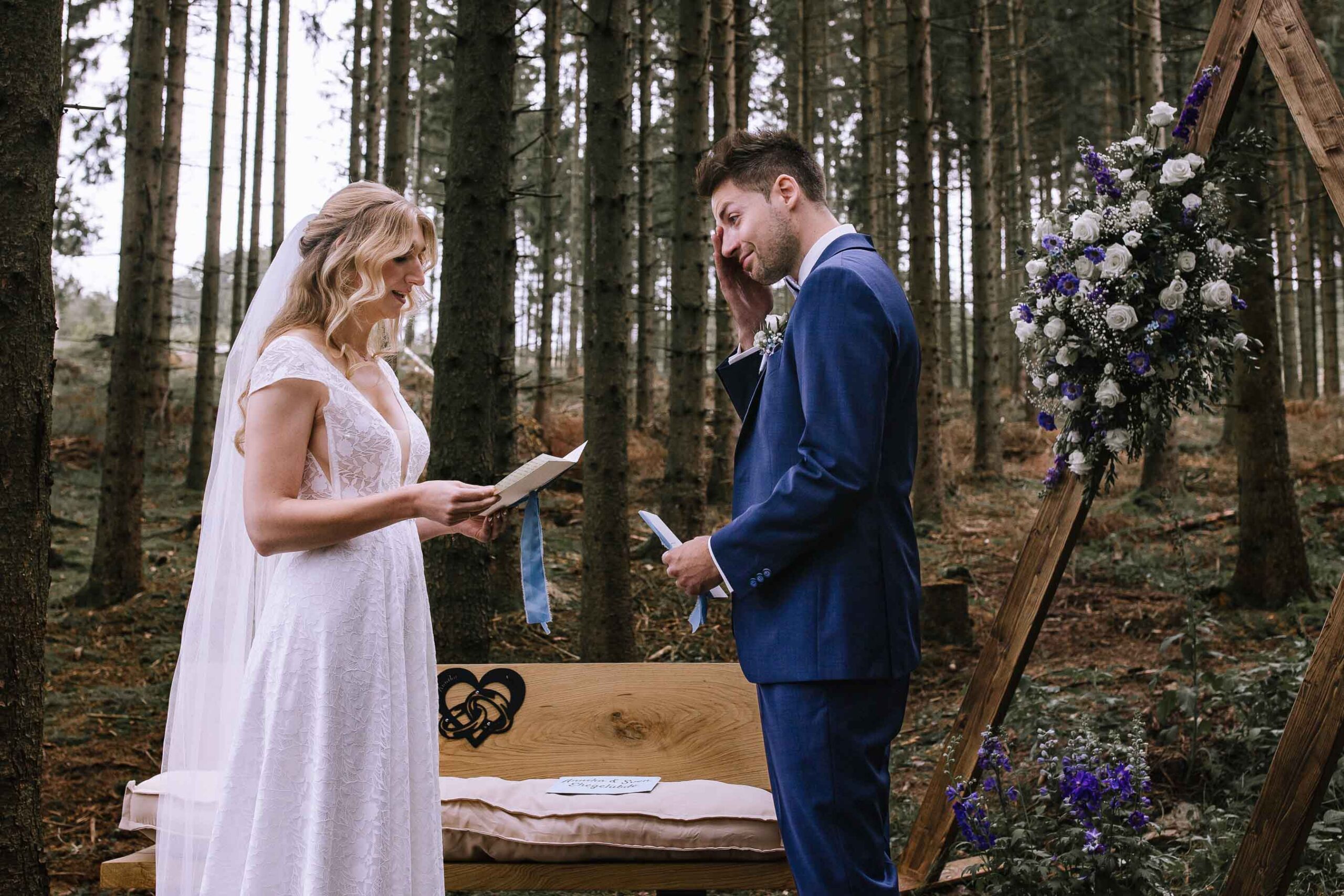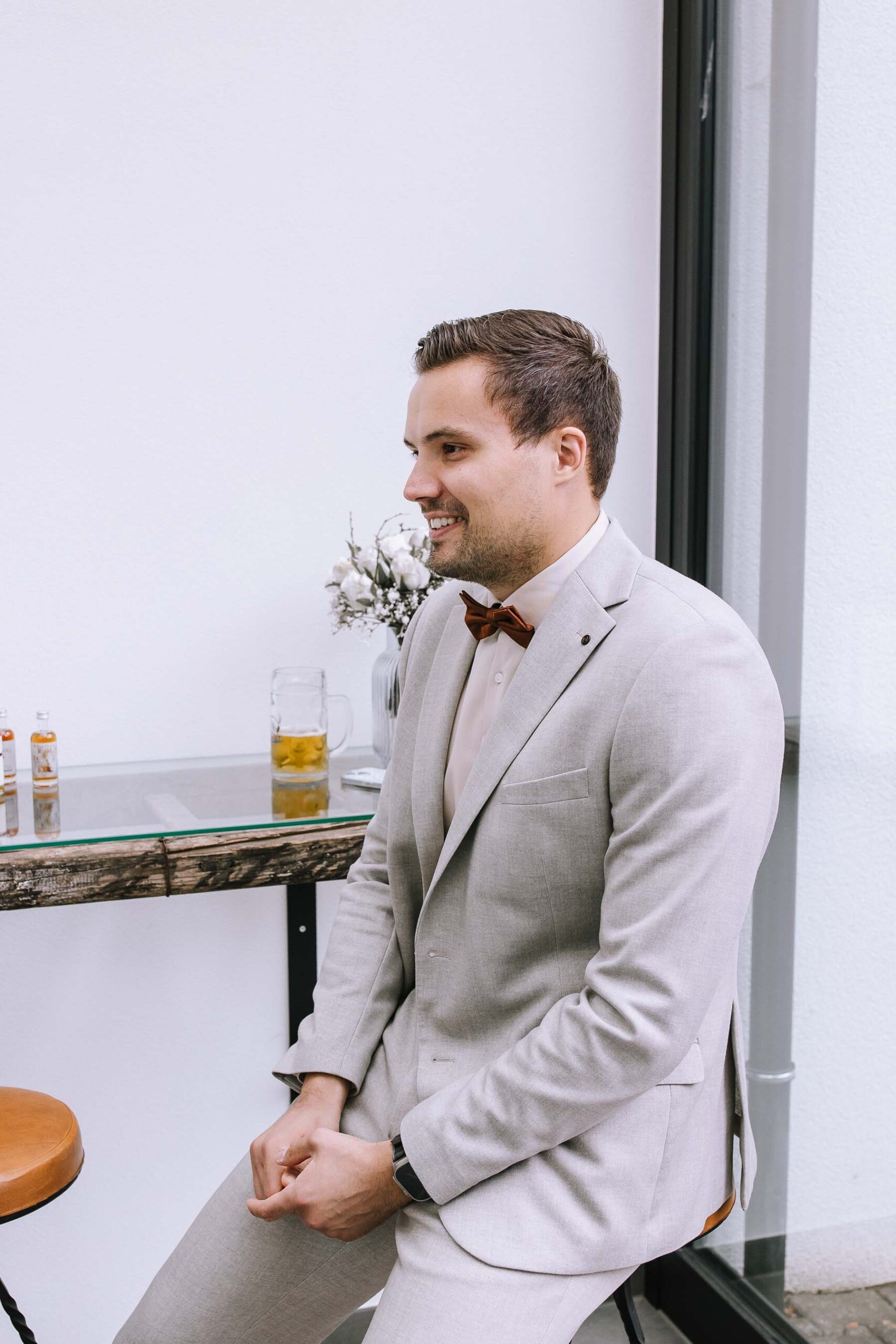 Die freie Trauung von Annika und Sven im Wald in der Hochzeitslocation Friggen (Gut Ahe) war ein wahres Highlight dieses unvergesslichen Hochzeitstages. Der Vormittag hatte uns noch mit Regen und unklaren Wetterbedingungen einen kleinen Strich durch die Rechnung gemacht, aber als die Trauung schließlich beginnen konnte, hörte der Regen auf und der Wald zeigte sich in seiner vollen Schönheit. Der Moment, als die Sonne sanft durch die Bäume brach, war einfach magisch. Es war genau das, was die beiden sich erträumt hatten – eine Trauung im Freien, inmitten der Natur, in einer der schönsten Hochzeitslocations im Sauerland. Die Vorbereitungen für die Hochzeit waren ebenfalls voller liebevoller Details. Bevor die Trauung aber losging, hatte ich die Gelegenheit, die wunderschöne Hochzeitslocation Friggen, den Neubau von Gut Ahe, zu fotografieren. Den Saal, den Willi von Blumen Schepper zusammen mit Annika und Sven vorbereitet hatte, war perfekt auf das Waldthema abgestimmt und trug zur besonderen Atmosphäre bei. Nach dem Einfangen dieser Eindrücke ging es weiter mit dem Getting Ready von Sven, der von seinen beiden Trauzeugen unterstützt wurde. Es war eine entspannte, fröhliche Stimmung, die den Tag von Anfang an begleitete. Annika hingegen bereitete sich in einem rustikalen Hotelzimmer auf die Zeremonie vor, mit ihren Omas als „Flower Grannies“, die für den perfekten Moment sorgten, als sie mit Annika gemeinsam zur Traulocation im Wald gingen. Sven war sichtlich gerührt, als er Annika sah – der perfekte Moment, um in die Trauung zu starten.