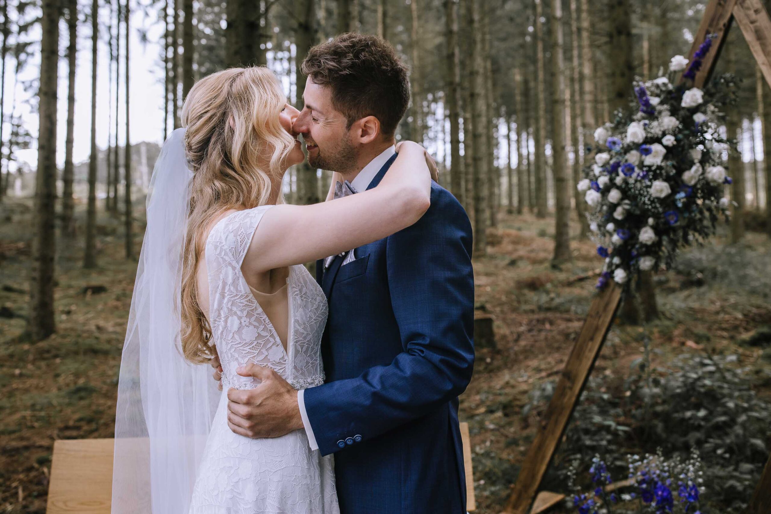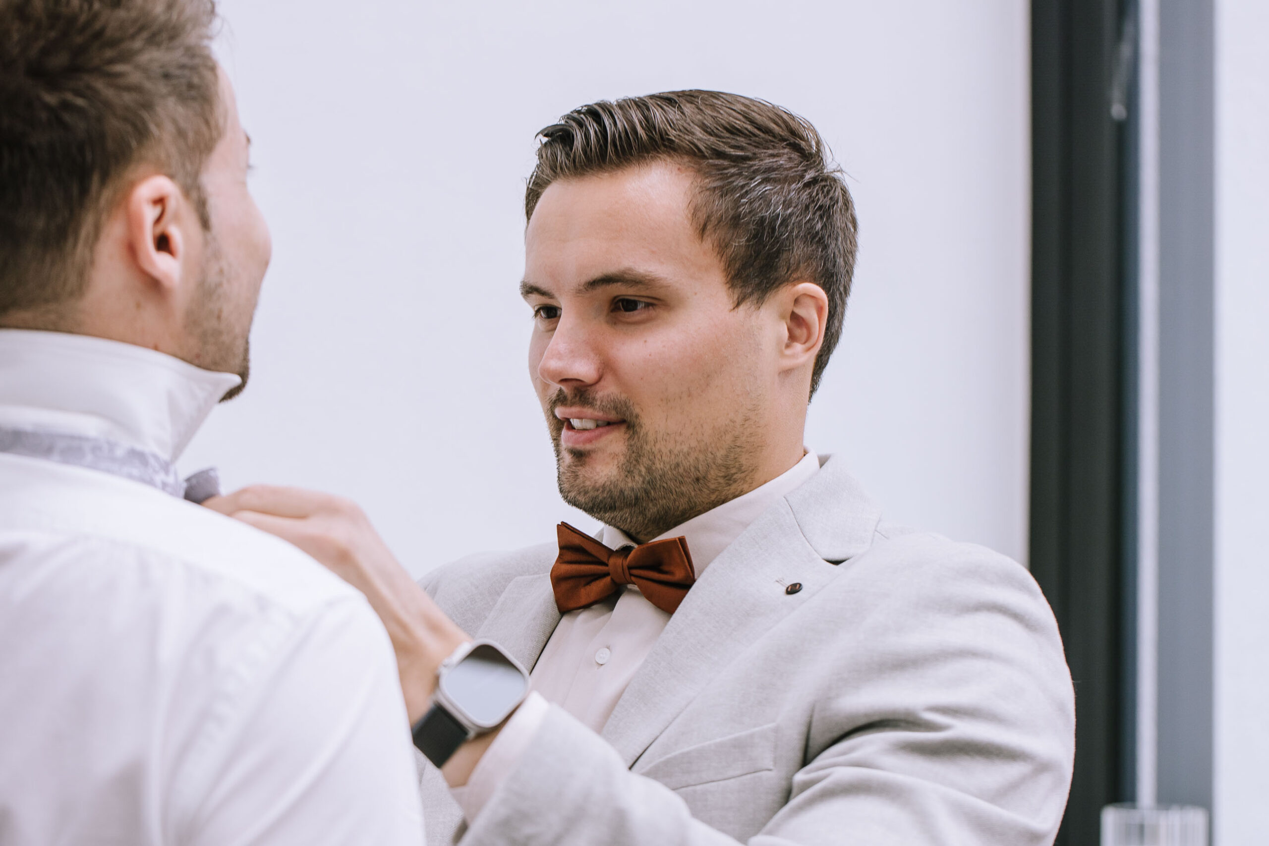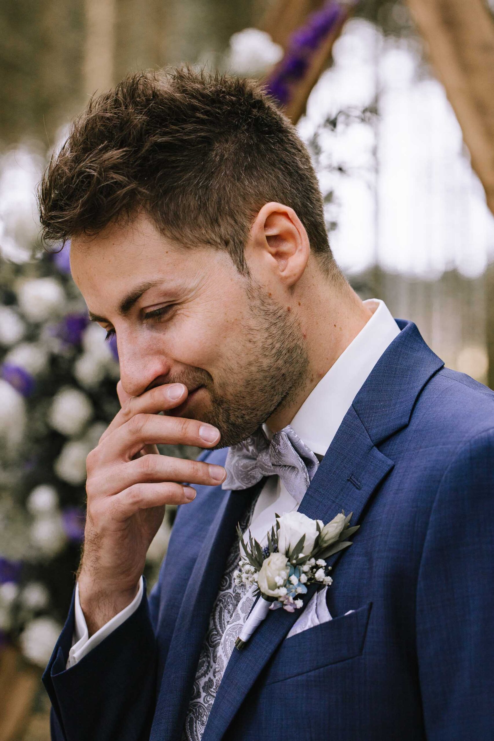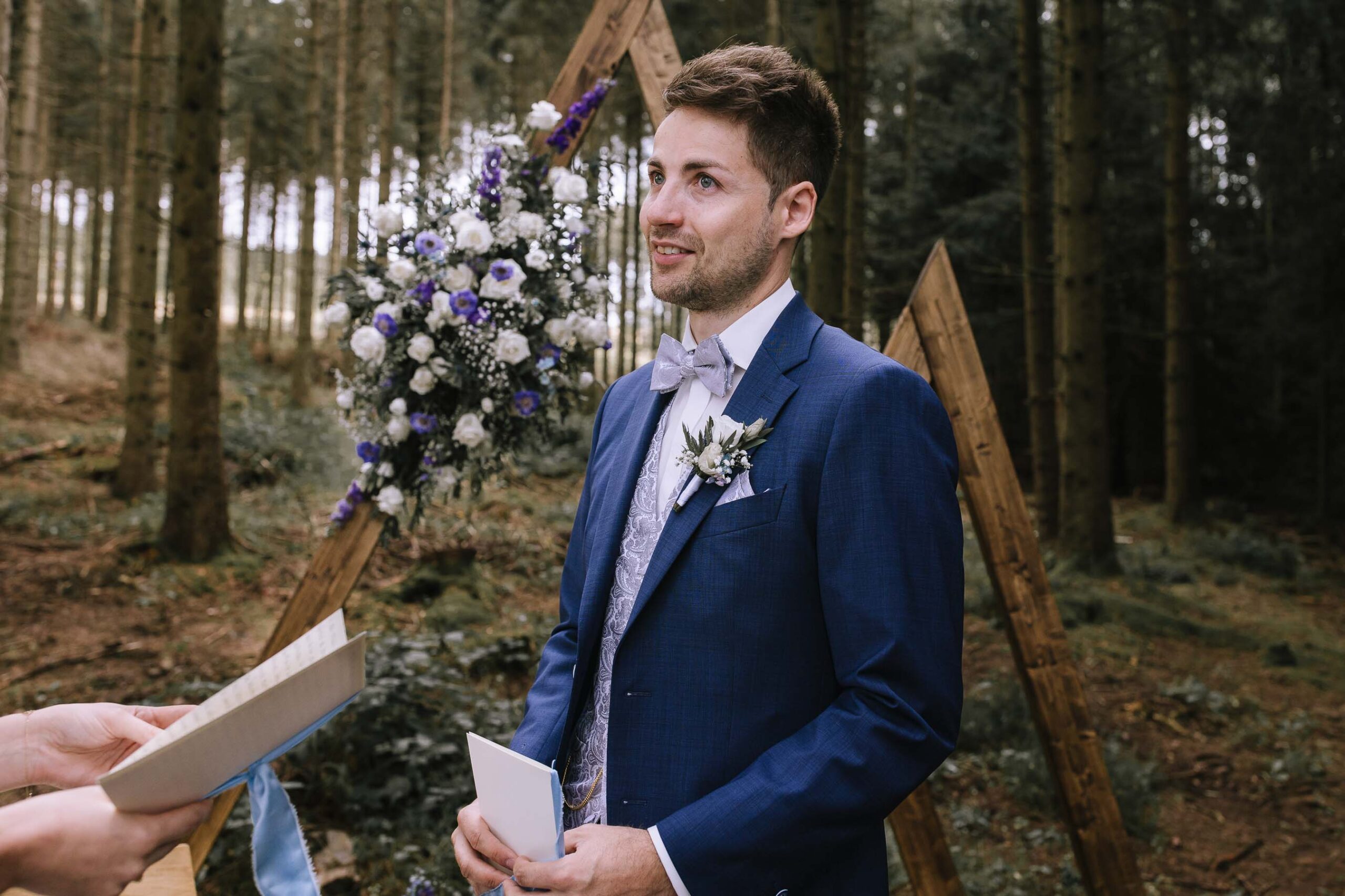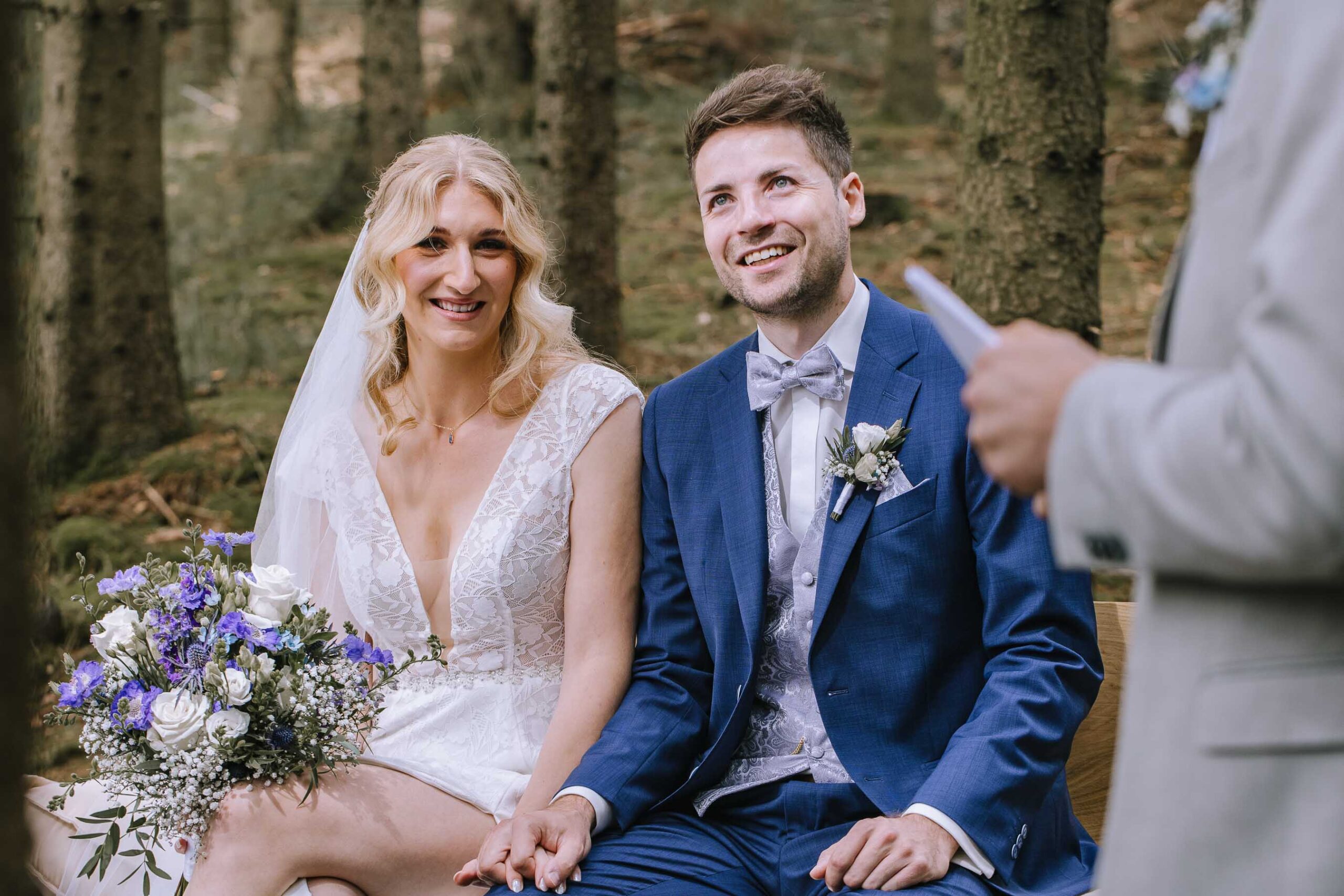Die freie Trauung von Annika und Sven im Wald in der Hochzeitslocation Friggen (Gut Ahe) war ein wahres Highlight dieses unvergesslichen Hochzeitstages. Der Vormittag hatte uns noch mit Regen und unklaren Wetterbedingungen einen kleinen Strich durch die Rechnung gemacht, aber als die Trauung schließlich beginnen konnte, hörte der Regen auf und der Wald zeigte sich in seiner vollen Schönheit. Der Moment, als die Sonne sanft durch die Bäume brach, war einfach magisch. Es war genau das, was die beiden sich erträumt hatten – eine Trauung im Freien, inmitten der Natur, in einer der schönsten Hochzeitslocations im Sauerland. Die Vorbereitungen für die Hochzeit waren ebenfalls voller liebevoller Details. Bevor die Trauung aber losging, hatte ich die Gelegenheit, die wunderschöne Hochzeitslocation Friggen, den Neubau von Gut Ahe, zu fotografieren. Den Saal, den Willi von Blumen Schepper zusammen mit Annika und Sven vorbereitet hatte, war perfekt auf das Waldthema abgestimmt und trug zur besonderen Atmosphäre bei. Nach dem Einfangen dieser Eindrücke ging es weiter mit dem Getting Ready von Sven, der von seinen beiden Trauzeugen unterstützt wurde. Es war eine entspannte, fröhliche Stimmung, die den Tag von Anfang an begleitete. Annika hingegen bereitete sich in einem rustikalen Hotelzimmer auf die Zeremonie vor, mit ihren Omas als „Flower Grannies“, die für den perfekten Moment sorgten, als sie mit Annika gemeinsam zur Traulocation im Wald gingen. Sven war sichtlich gerührt, als er Annika sah – der perfekte Moment, um in die Trauung zu starten.
