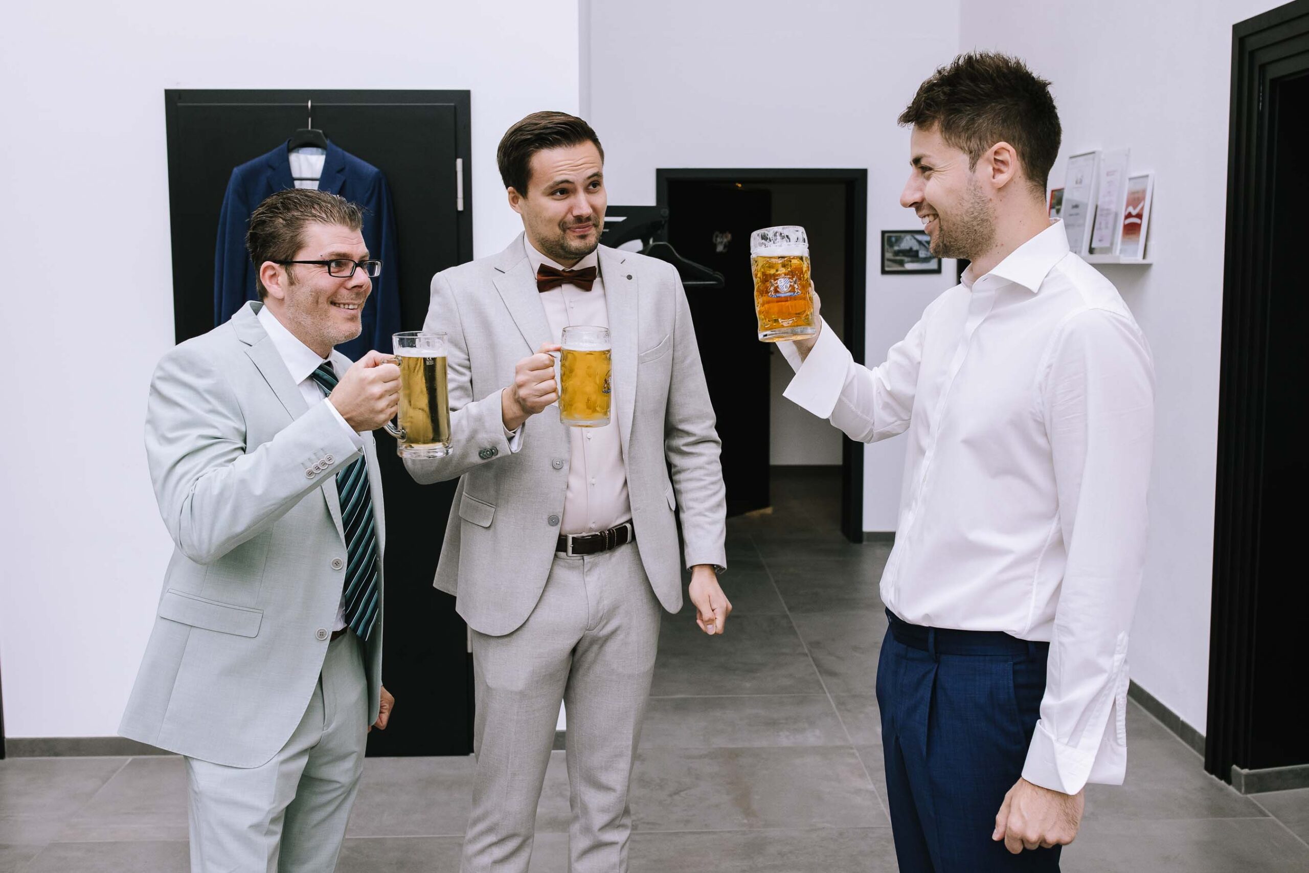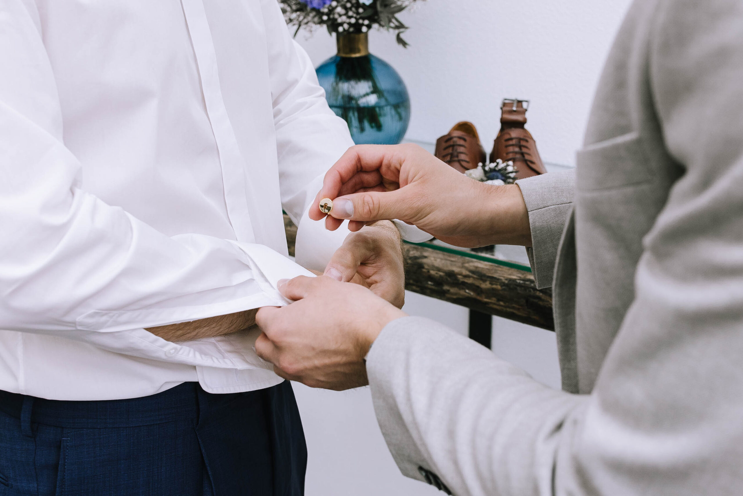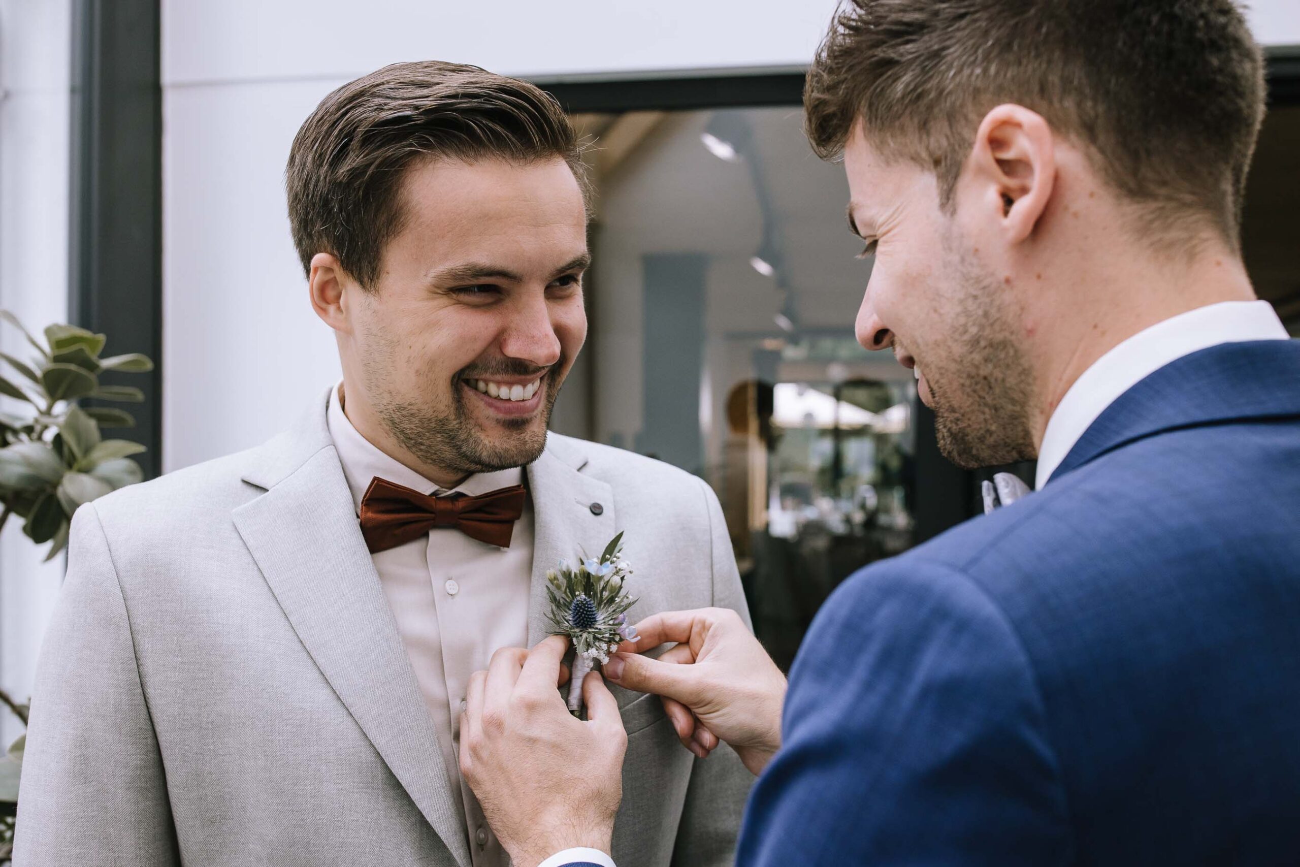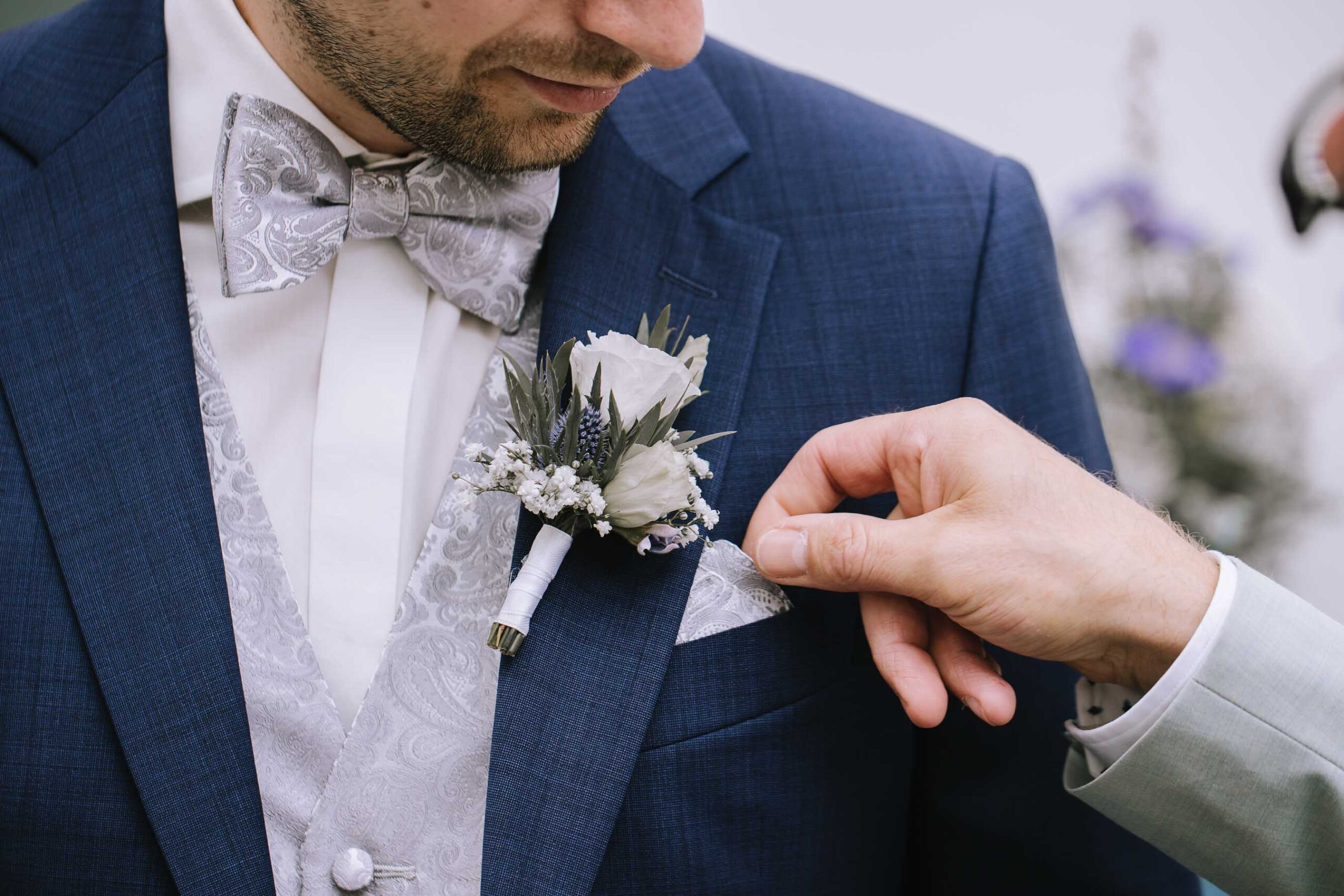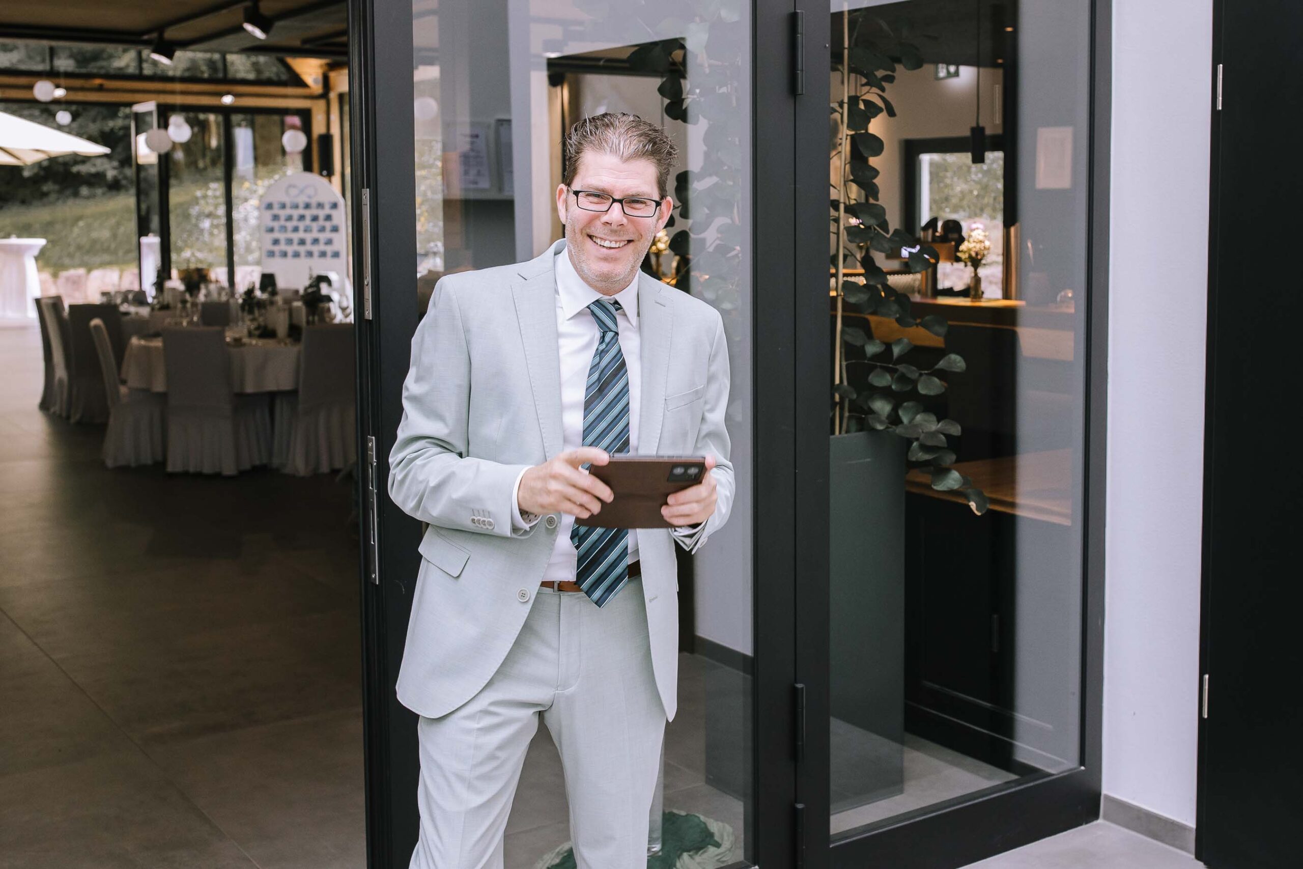 Die freie Trauung von Annika und Sven im Wald in der Hochzeitslocation Friggen (Gut Ahe) war ein wahres Highlight dieses unvergesslichen Hochzeitstages. Der Vormittag hatte uns noch mit Regen und unklaren Wetterbedingungen einen kleinen Strich durch die Rechnung gemacht, aber als die Trauung schließlich beginnen konnte, hörte der Regen auf und der Wald zeigte sich in seiner vollen Schönheit. Der Moment, als die Sonne sanft durch die Bäume brach, war einfach magisch. Es war genau das, was die beiden sich erträumt hatten – eine Trauung im Freien, inmitten der Natur, in einer der schönsten Hochzeitslocations im Sauerland. Die Vorbereitungen für die Hochzeit waren ebenfalls voller liebevoller Details. Bevor die Trauung aber losging, hatte ich die Gelegenheit, die wunderschöne Hochzeitslocation Friggen, den Neubau von Gut Ahe, zu fotografieren. Den Saal, den Willi von Blumen Schepper zusammen mit Annika und Sven vorbereitet hatte, war perfekt auf das Waldthema abgestimmt und trug zur besonderen Atmosphäre bei. Nach dem Einfangen dieser Eindrücke ging es weiter mit dem Getting Ready von Sven, der von seinen beiden Trauzeugen unterstützt wurde. Es war eine entspannte, fröhliche Stimmung, die den Tag von Anfang an begleitete. Annika hingegen bereitete sich in einem rustikalen Hotelzimmer auf die Zeremonie vor, mit ihren Omas als „Flower Grannies“, die für den perfekten Moment sorgten, als sie mit Annika gemeinsam zur Traulocation im Wald gingen. Sven war sichtlich gerührt, als er Annika sah – der perfekte Moment, um in die Trauung zu starten.