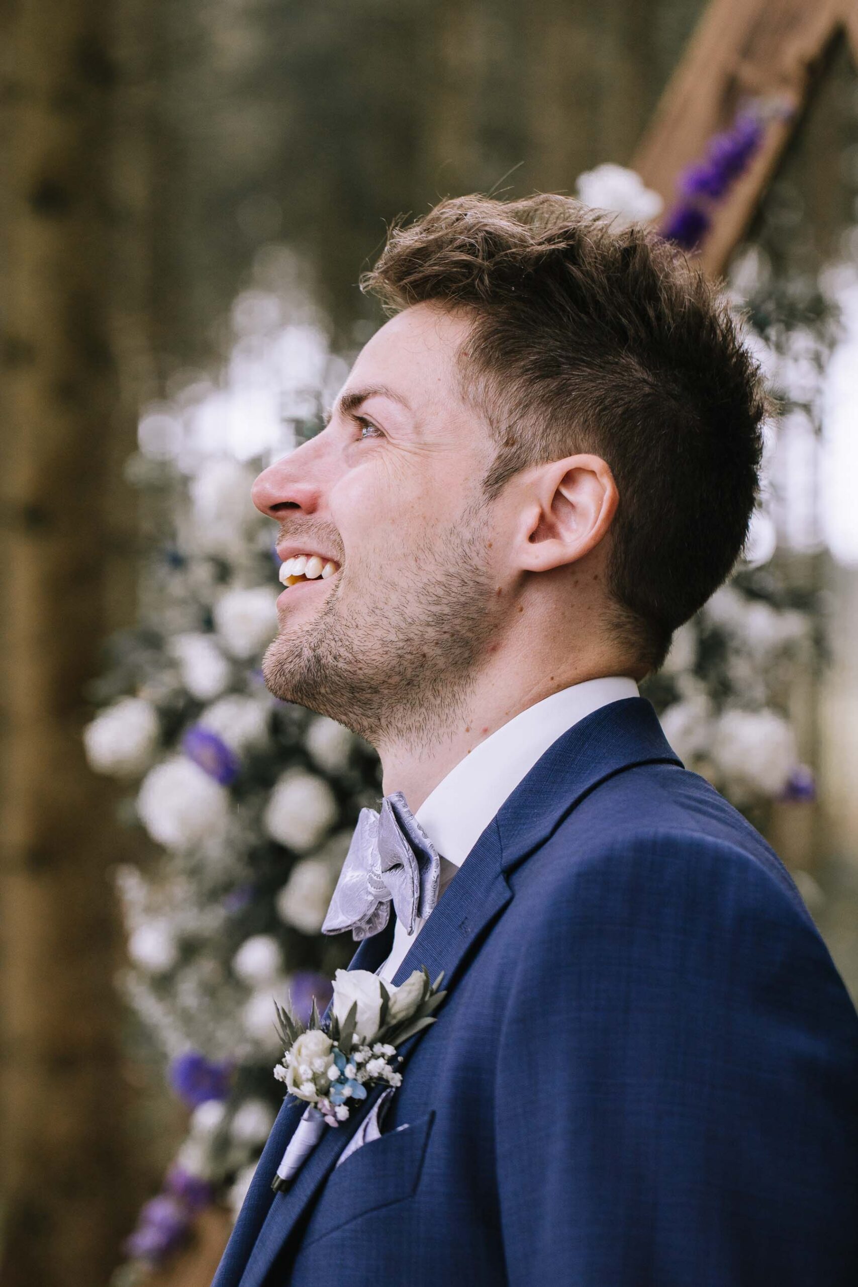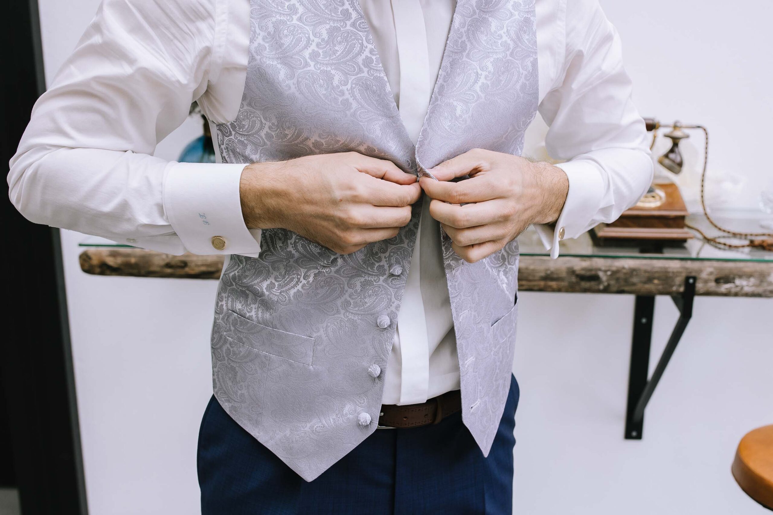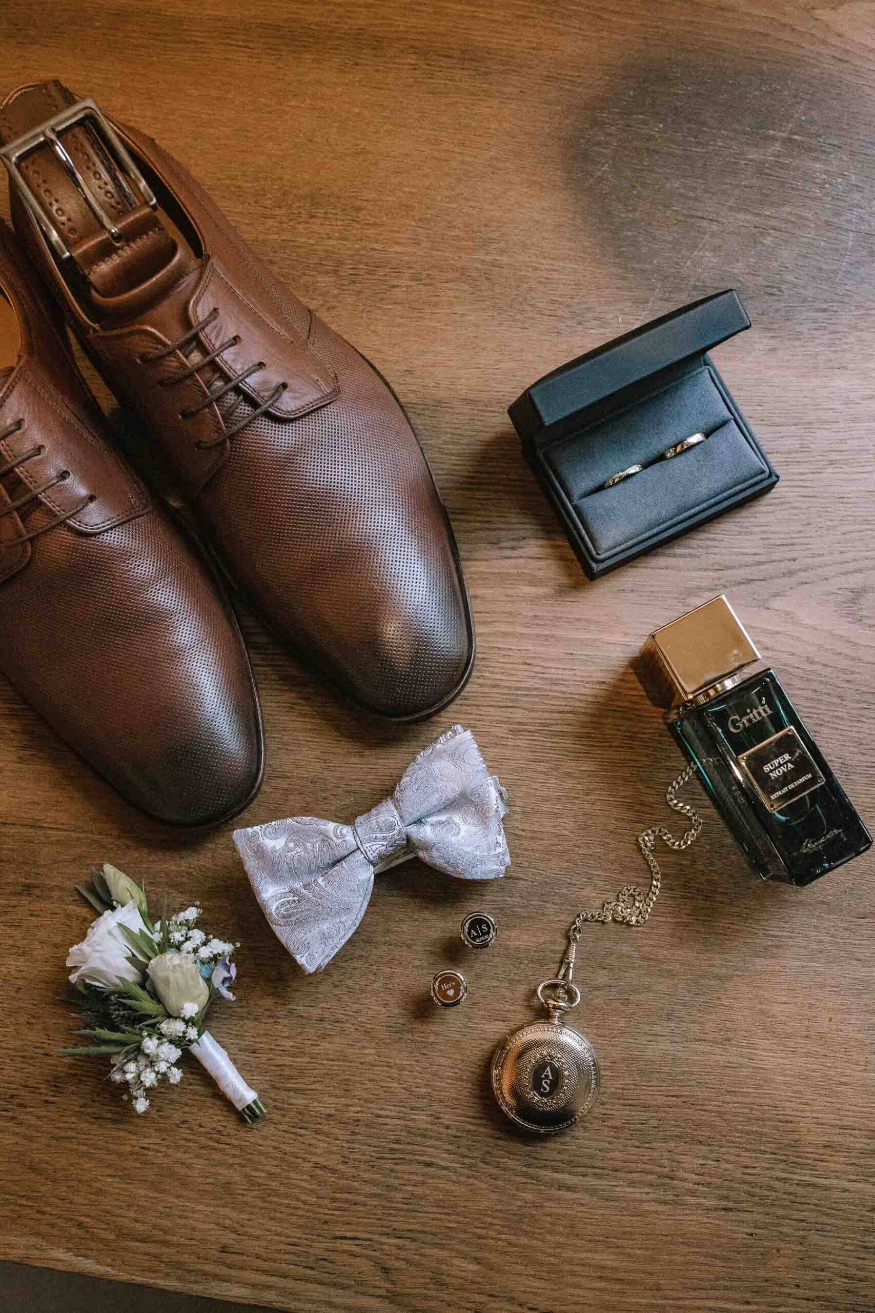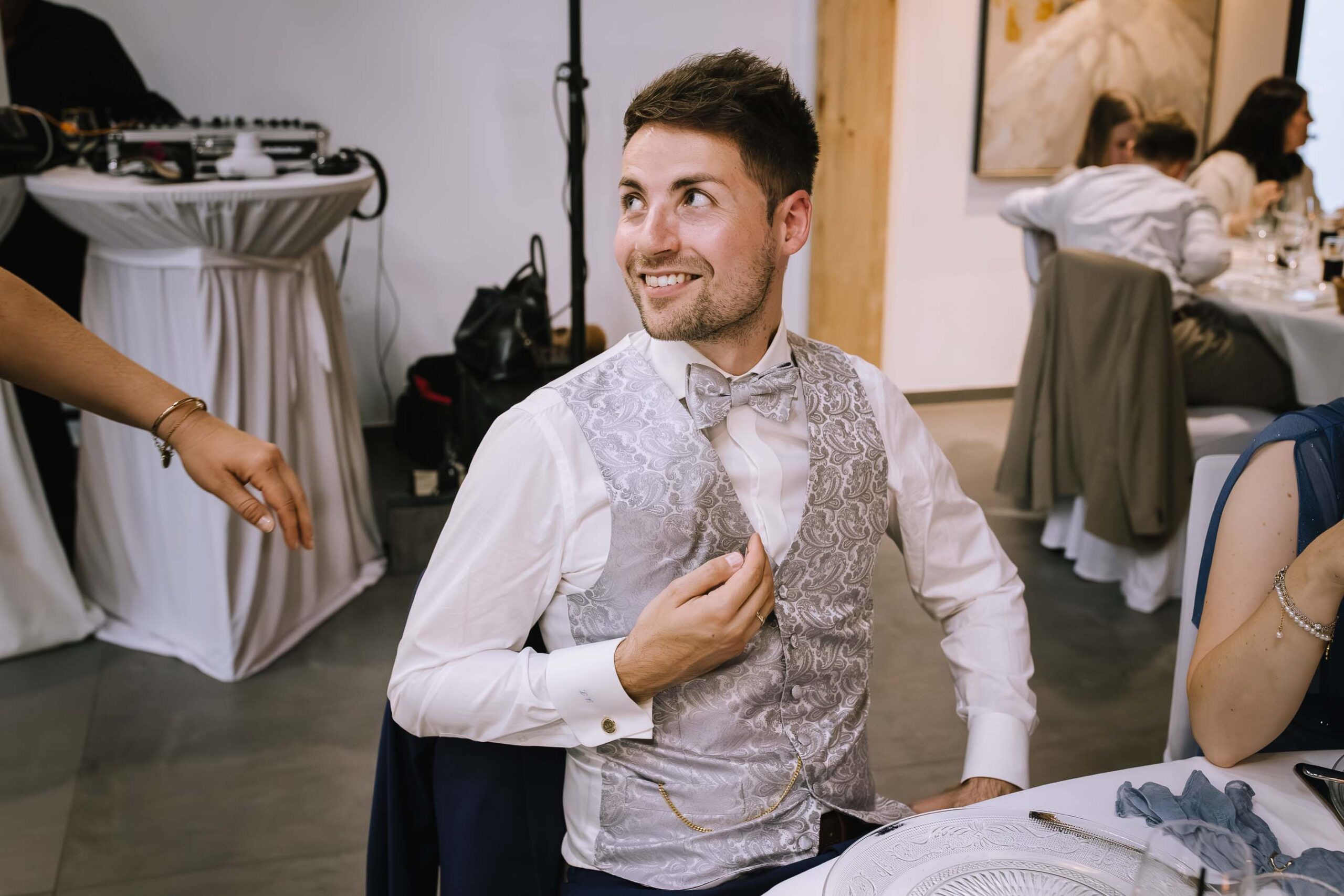 Die freie Trauung von Annika und Sven im Wald in der Hochzeitslocation Friggen (Gut Ahe) war ein wahres Highlight dieses unvergesslichen Hochzeitstages. Der Vormittag hatte uns noch mit Regen und unklaren Wetterbedingungen einen kleinen Strich durch die Rechnung gemacht, aber als die Trauung schließlich beginnen konnte, hörte der Regen auf und der Wald zeigte sich in seiner vollen Schönheit. Der Moment, als die Sonne sanft durch die Bäume brach, war einfach magisch. Es war genau das, was die beiden sich erträumt hatten – eine Trauung im Freien, inmitten der Natur, in einer der schönsten Hochzeitslocations im Sauerland. Die Vorbereitungen für die Hochzeit waren ebenfalls voller liebevoller Details. Bevor die Trauung aber losging, hatte ich die Gelegenheit, die wunderschöne Hochzeitslocation Friggen, den Neubau von Gut Ahe, zu fotografieren. Den Saal, den Willi von Blumen Schepper zusammen mit Annika und Sven vorbereitet hatte, war perfekt auf das Waldthema abgestimmt und trug zur besonderen Atmosphäre bei. Nach dem Einfangen dieser Eindrücke ging es weiter mit dem Getting Ready von Sven, der von seinen beiden Trauzeugen unterstützt wurde. Es war eine entspannte, fröhliche Stimmung, die den Tag von Anfang an begleitete. Annika hingegen bereitete sich in einem rustikalen Hotelzimmer auf die Zeremonie vor, mit ihren Omas als „Flower Grannies“, die für den perfekten Moment sorgten, als sie mit Annika gemeinsam zur Traulocation im Wald gingen. Sven war sichtlich gerührt, als er Annika sah – der perfekte Moment, um in die Trauung zu starten.