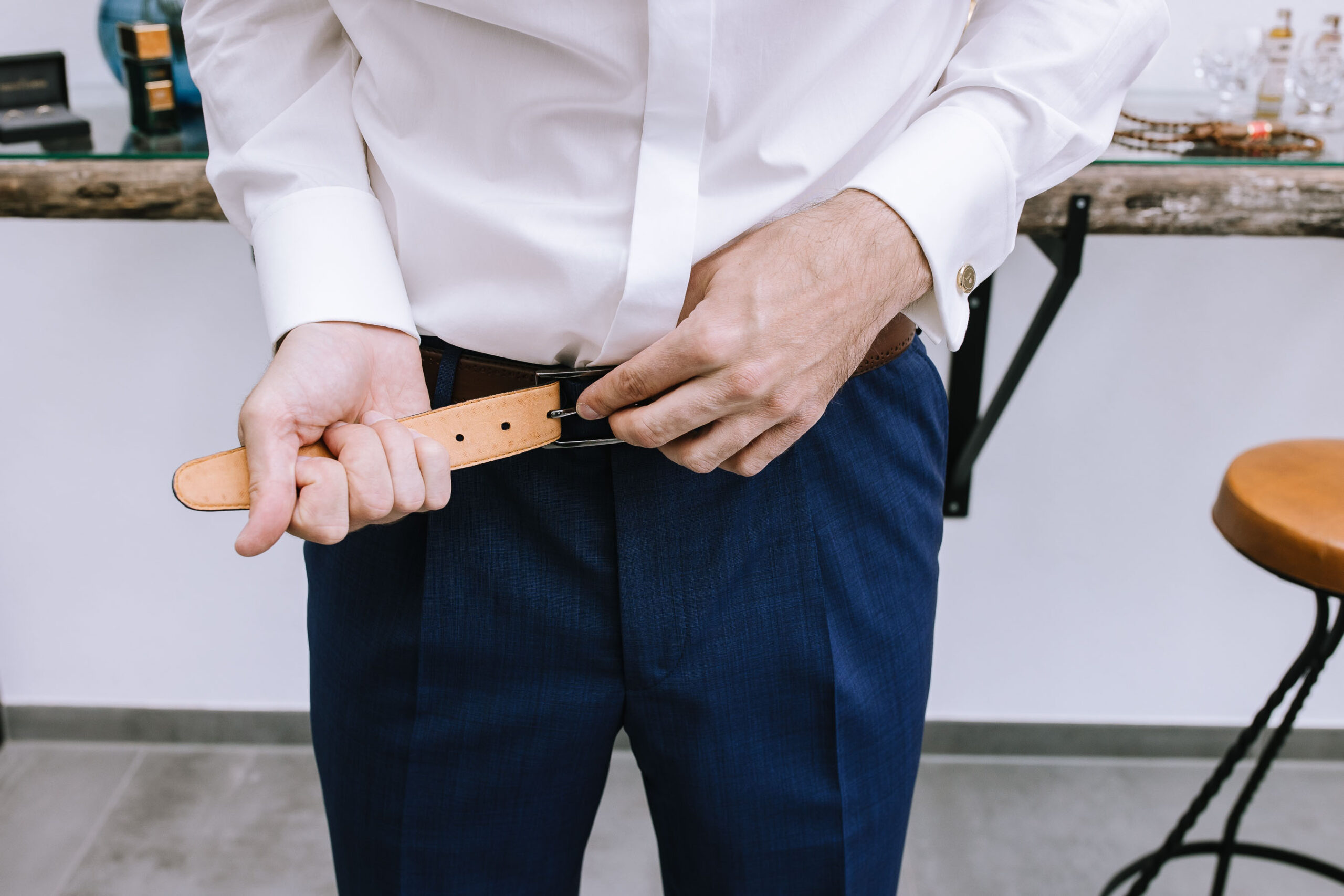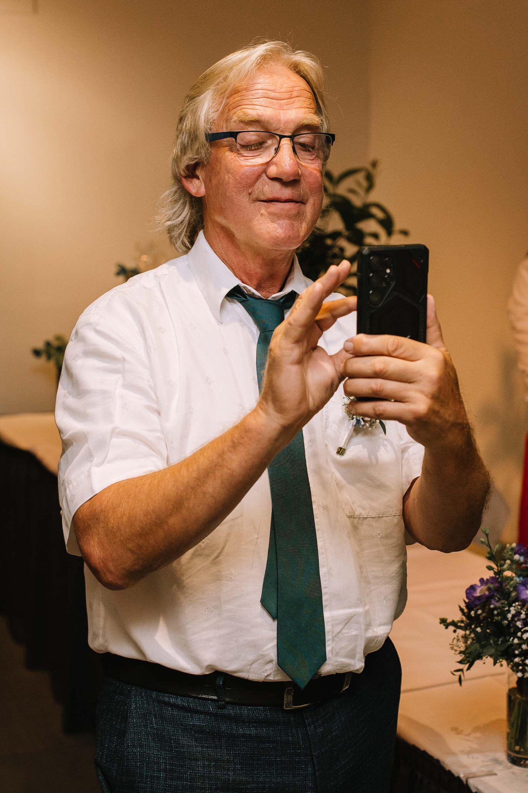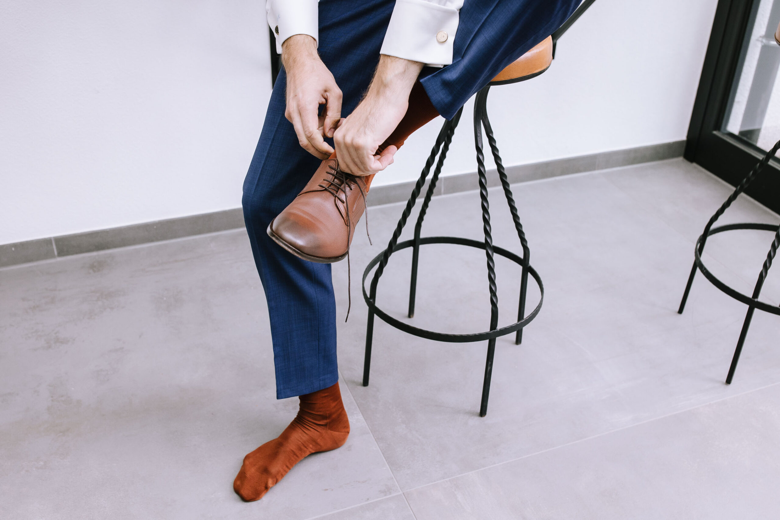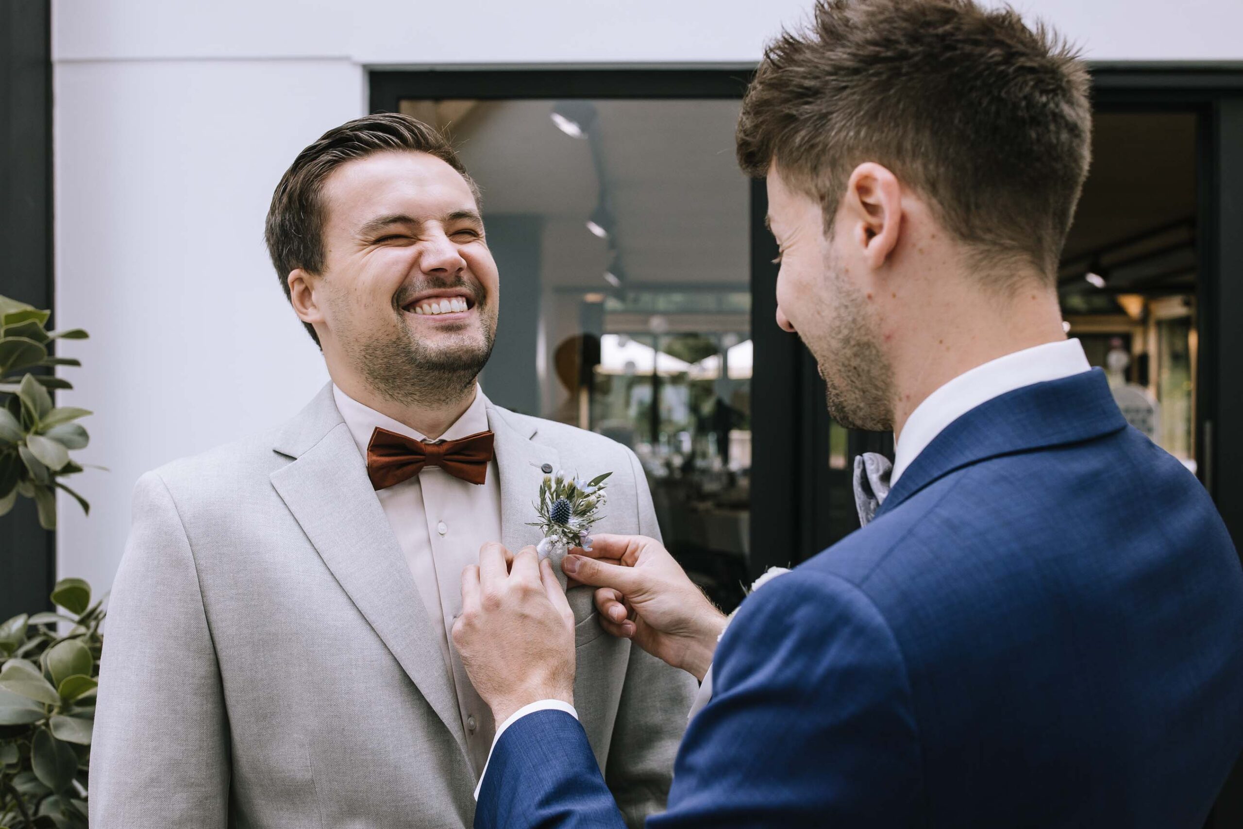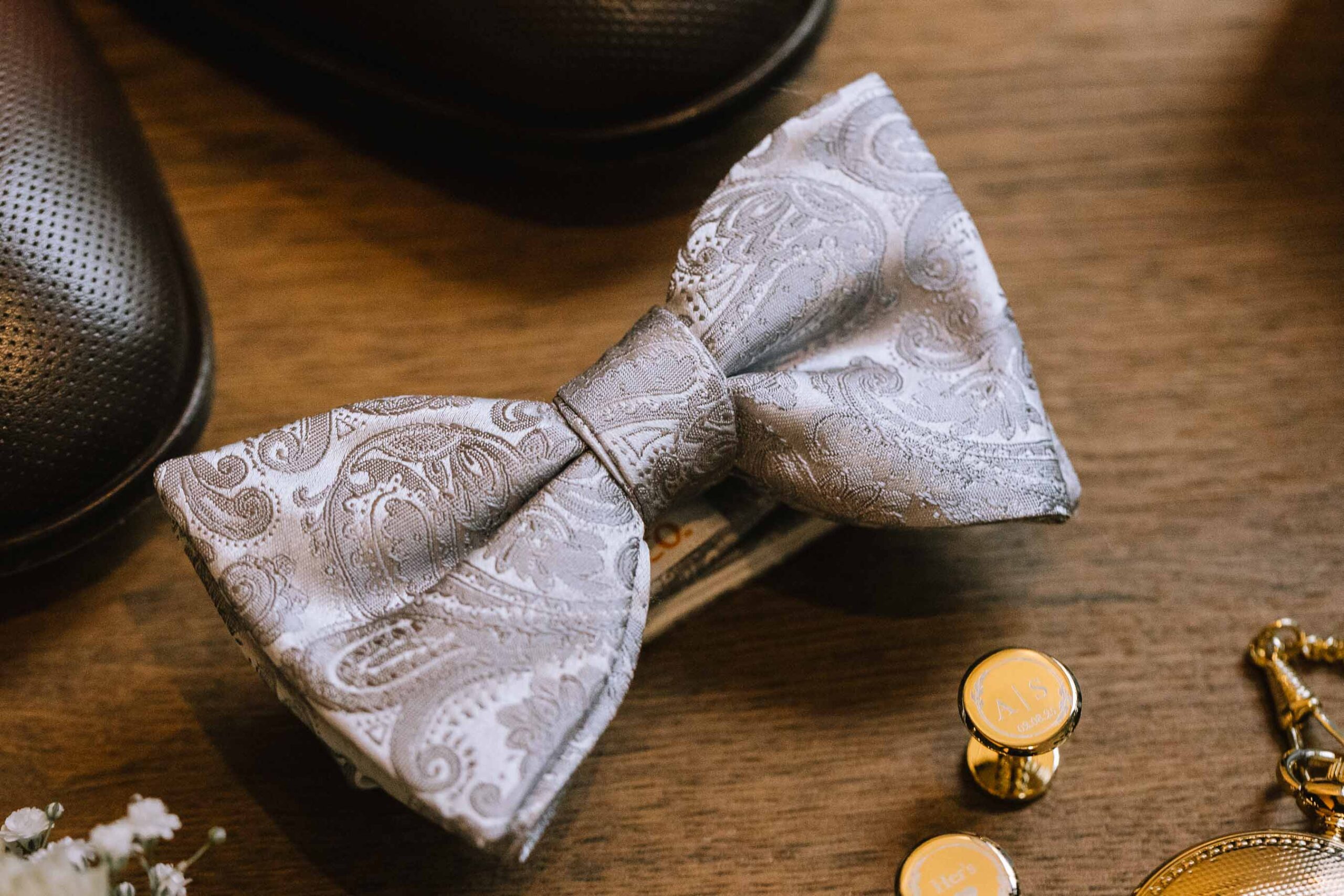 Die freie Trauung von Annika und Sven im Wald in der Hochzeitslocation Friggen (Gut Ahe) war ein wahres Highlight dieses unvergesslichen Hochzeitstages. Der Vormittag hatte uns noch mit Regen und unklaren Wetterbedingungen einen kleinen Strich durch die Rechnung gemacht, aber als die Trauung schließlich beginnen konnte, hörte der Regen auf und der Wald zeigte sich in seiner vollen Schönheit. Der Moment, als die Sonne sanft durch die Bäume brach, war einfach magisch. Es war genau das, was die beiden sich erträumt hatten – eine Trauung im Freien, inmitten der Natur, in einer der schönsten Hochzeitslocations im Sauerland. Die Vorbereitungen für die Hochzeit waren ebenfalls voller liebevoller Details. Bevor die Trauung aber losging, hatte ich die Gelegenheit, die wunderschöne Hochzeitslocation Friggen, den Neubau von Gut Ahe, zu fotografieren. Den Saal, den Willi von Blumen Schepper zusammen mit Annika und Sven vorbereitet hatte, war perfekt auf das Waldthema abgestimmt und trug zur besonderen Atmosphäre bei. Nach dem Einfangen dieser Eindrücke ging es weiter mit dem Getting Ready von Sven, der von seinen beiden Trauzeugen unterstützt wurde. Es war eine entspannte, fröhliche Stimmung, die den Tag von Anfang an begleitete. Annika hingegen bereitete sich in einem rustikalen Hotelzimmer auf die Zeremonie vor, mit ihren Omas als „Flower Grannies“, die für den perfekten Moment sorgten, als sie mit Annika gemeinsam zur Traulocation im Wald gingen. Sven war sichtlich gerührt, als er Annika sah – der perfekte Moment, um in die Trauung zu starten.
