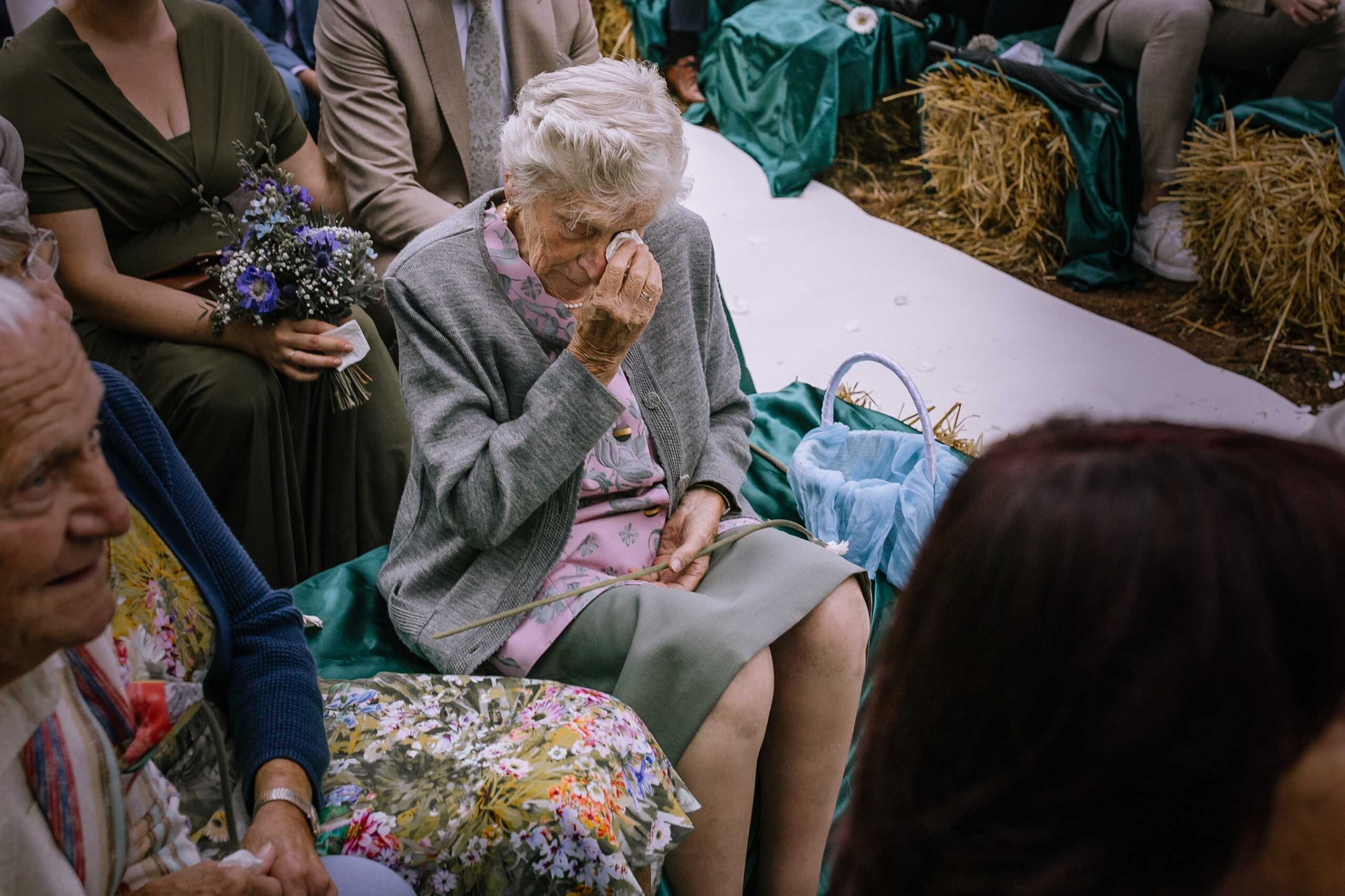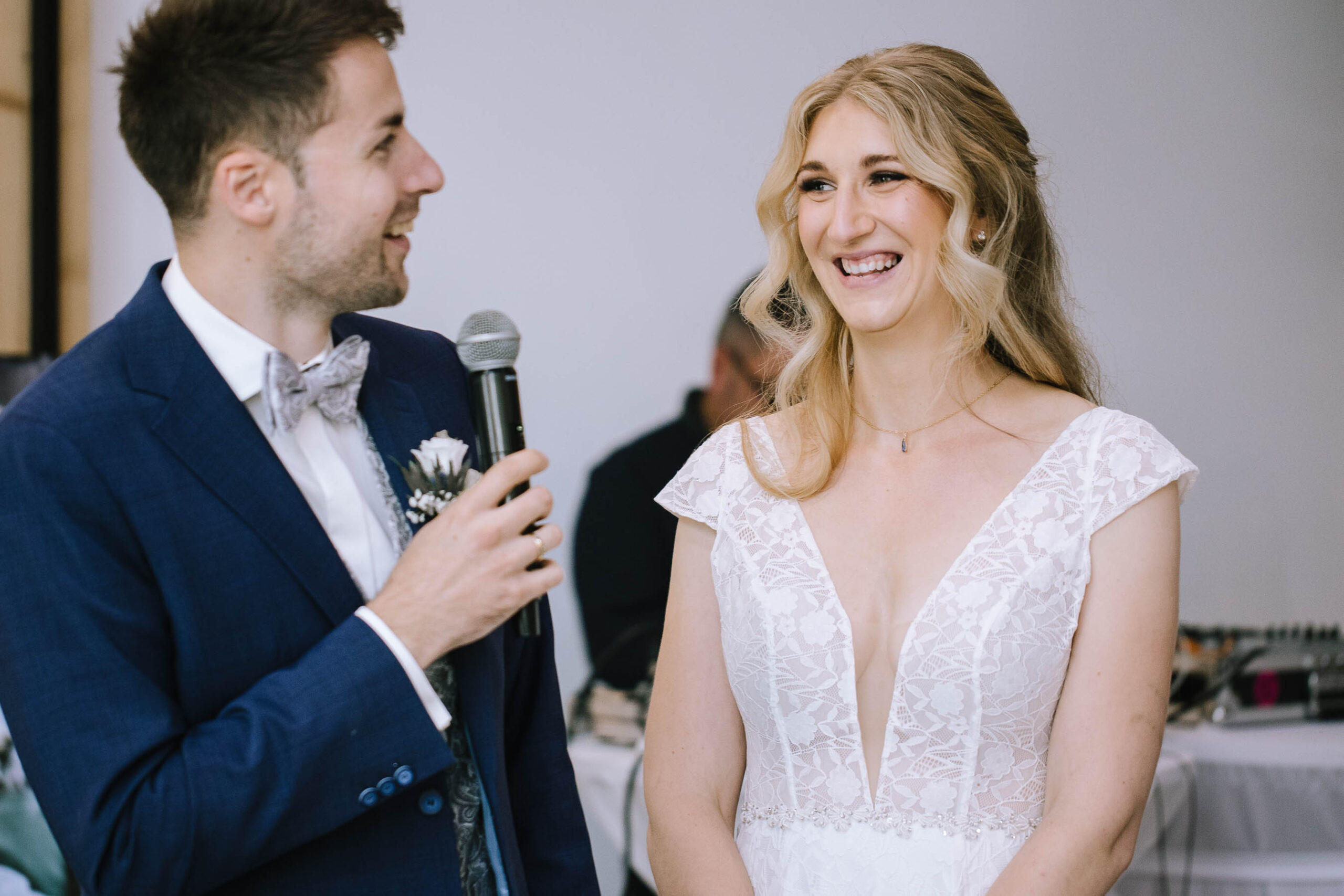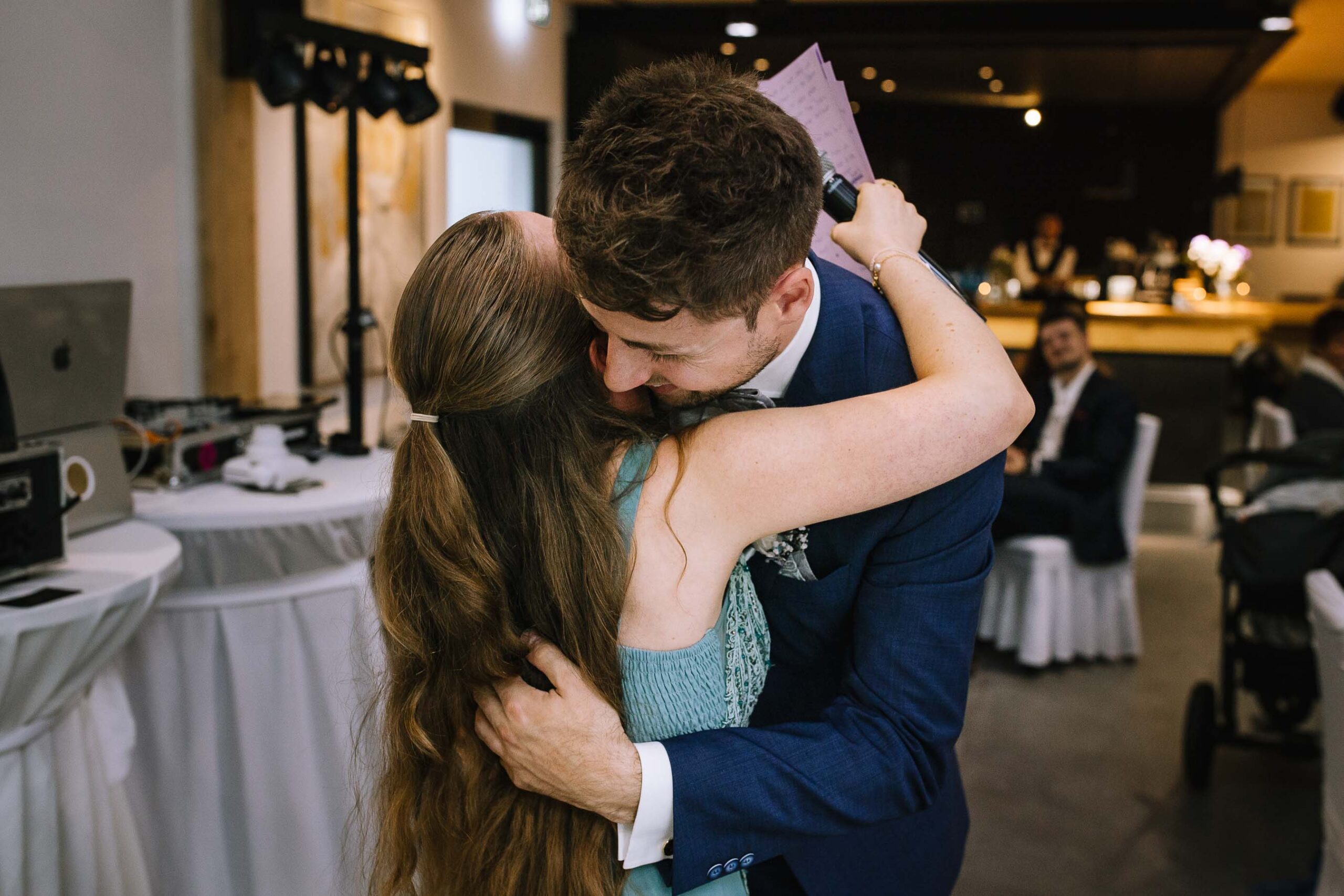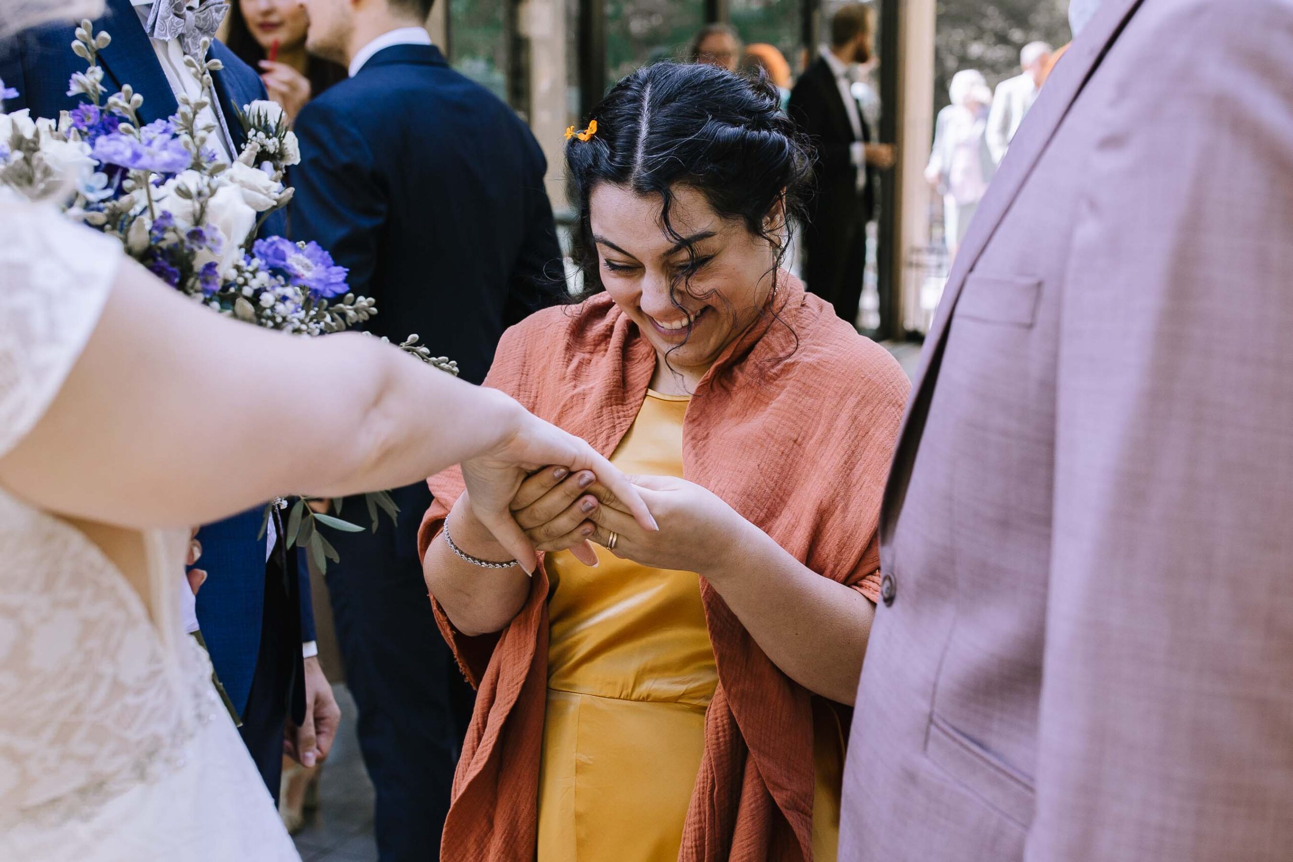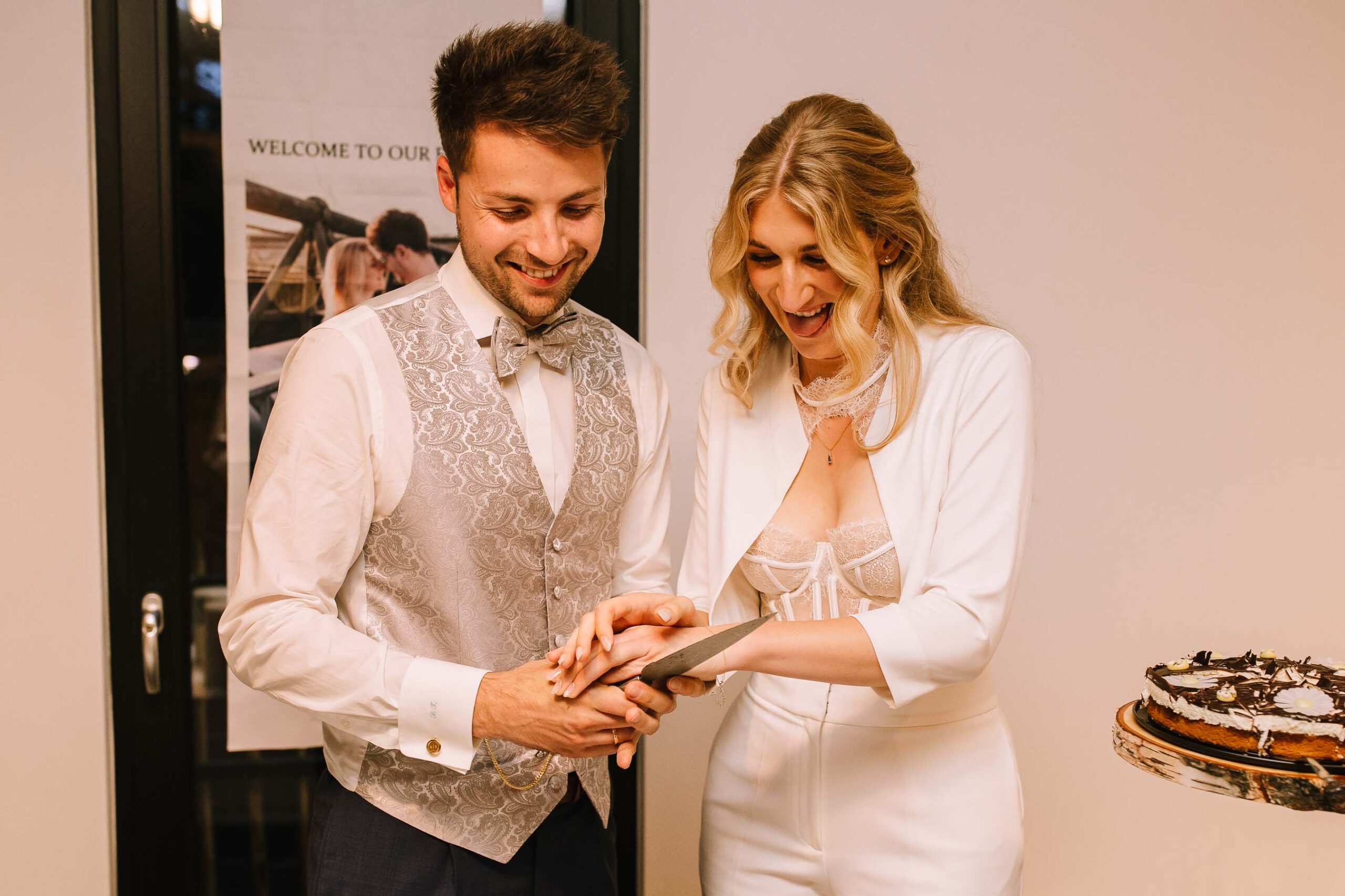 Direkt nach dem First Look ging es weiter zur standesamtlichen Trauung in der gemütlichen Scheune von Gut Ahe. Die Scheune ist ein super schöner Ort für eine Ambientetrauung in NRW, da man auch bei Sauerländer Regenwetter im trockenen sitzt. Sie hat genau das, was eine Trauung braucht: Wärme, Geborgenheit und einen Hauch von rustikalem Charme. Annika und Sven gaben sich dort das Ja-Wort und der Moment war genauso emotional und einzigartig wie der First Look. Nach der Trauung folgte ein Sektempfang, bei dem sich alle Gäste herzlich beglückwünschten und die Stimmung genauso leicht und herzlich war wie der Tag selbst.