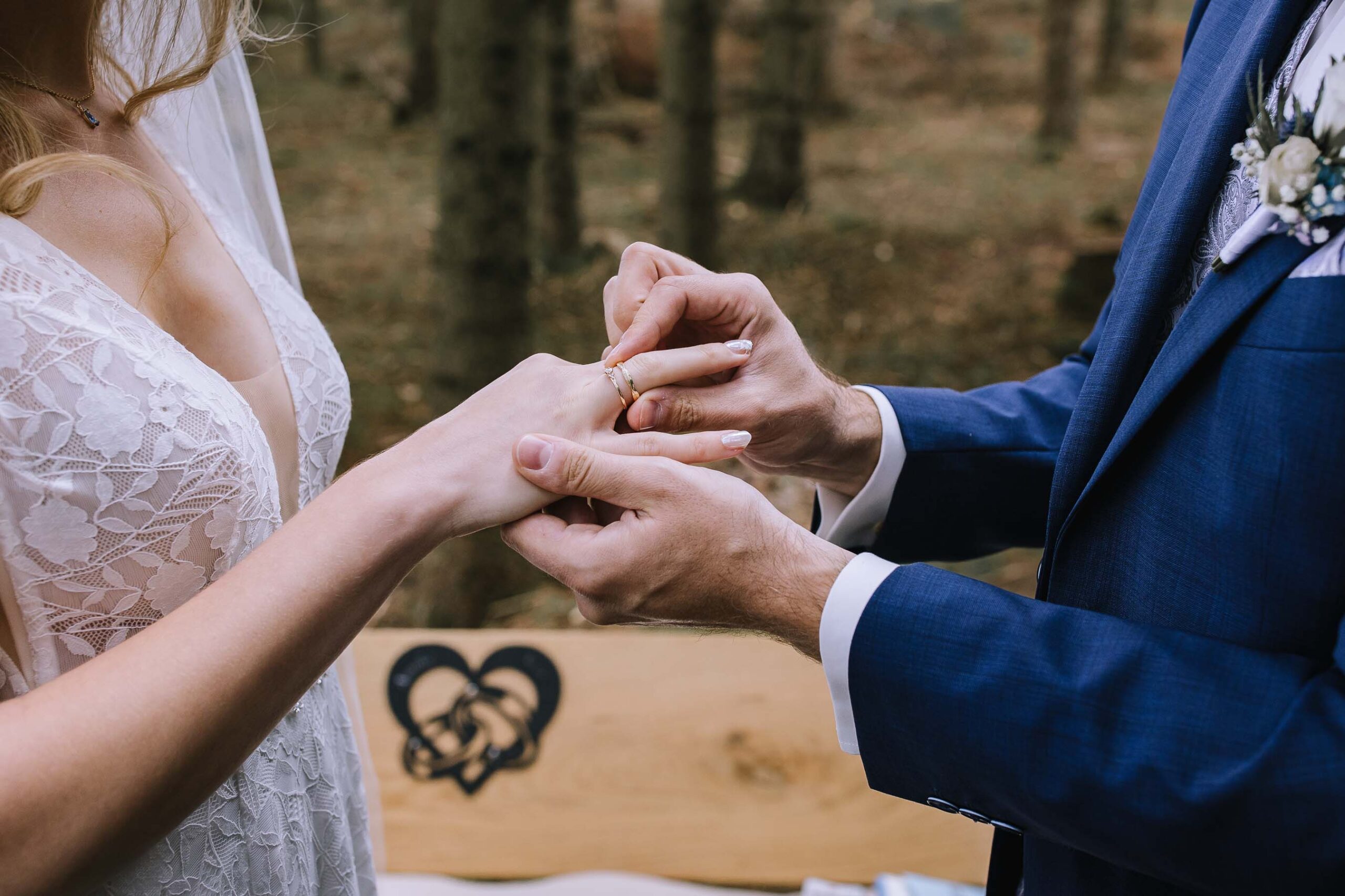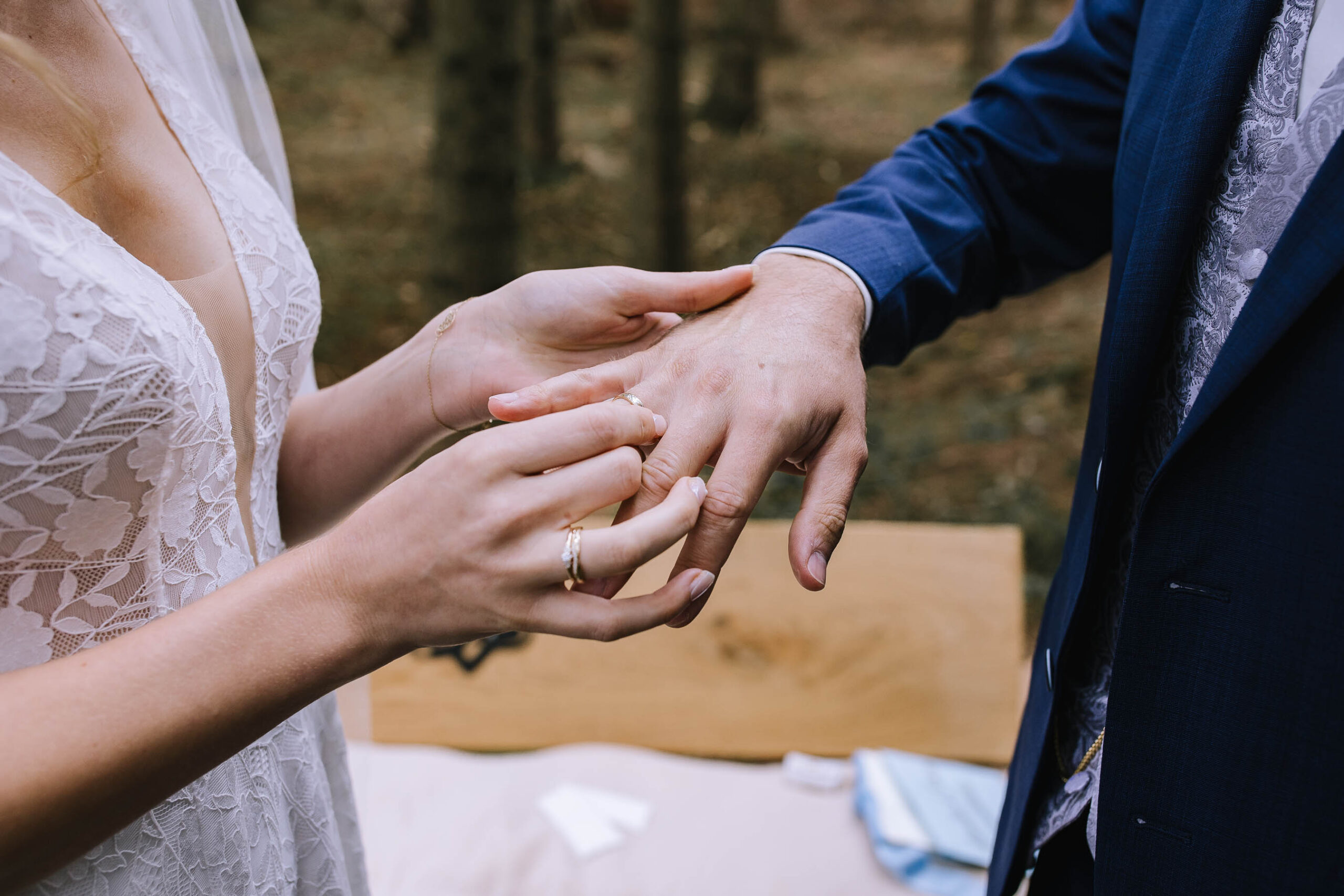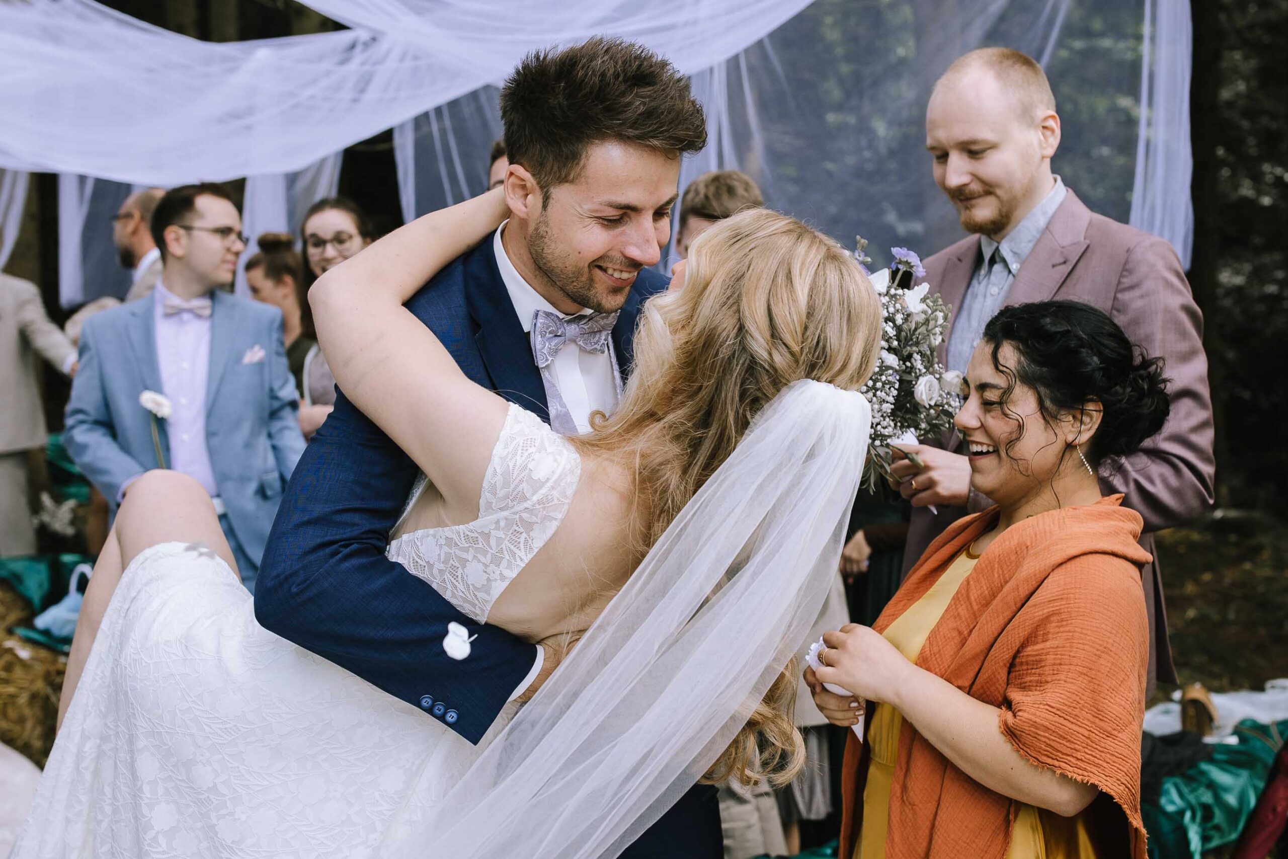 Ein bisschen Zeit für Umarmungen, Lachen und die ersten gemeinsamen Momente als frisch vermähltes Paar. Und auch als Hochzeitsfotografin ist es immer wieder ein Highlight, all die liebevollen Details einzufangen – die Blicke, die Berührungen, die Details. Ein weiterer schöner Moment war das Liebesschloss-Ritual, das Annika und Sven an zwei Metallherzen auf dem Gut Ahe Gelände vollzogen. Ein symbolisches Zeichen ihrer „unzerbrechlichen“ Liebe – und ein toller Fotomoment, den ich natürlich für die Beiden festhalten musste. Solche persönlichen Rituale machen jede Hochzeit einzigartig und auch in dieser besonderen Hochzeitslocation in NRW kommen diese Details perfekt zur Geltung. Der Tag neigte sich dem Ende zu, aber ich konnte kaum aufhören, an die nahende Freie Trauung zu denken. Denn Annika und Sven planten eine freie Trauung im Wald – und das war der Moment, auf den ich mich besonders freute. Die Schönheit des Waldes, das intime Setting und natürlich die beiden als Paar. Schon als die Beiden mir davon erzählten, wusste ich, dass das eine weitere unvergessliche Erinnerung für die Beiden werden würde. Gut Ahe und die Hochzeitslocation Friggen bieten nicht nur eine wunderschönen ORt für eine Hochzeitsfeier im Sauerland, sondern auch einen unglaublichen Service, der diesen Tag unvergesslich gemacht hat – man hat einfach alles an einem Ort. Für mich als Hochzeitsfotografin ist es immer wieder eine Freude, Paare wie Annika und Sven an solch wunderschönen Orten zu begleiten und die Geschichte ihrer Liebe in Bildern festzuhalten.