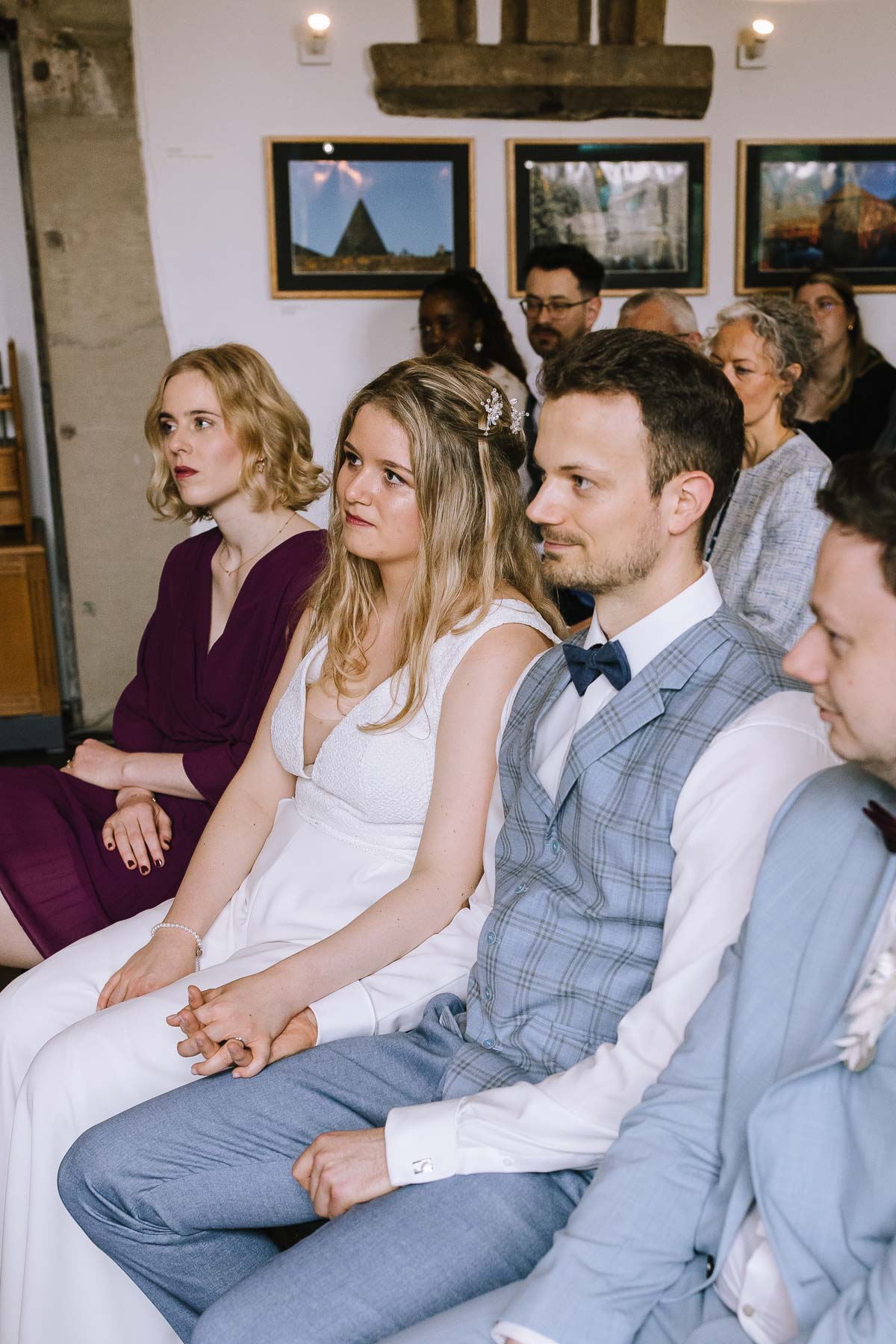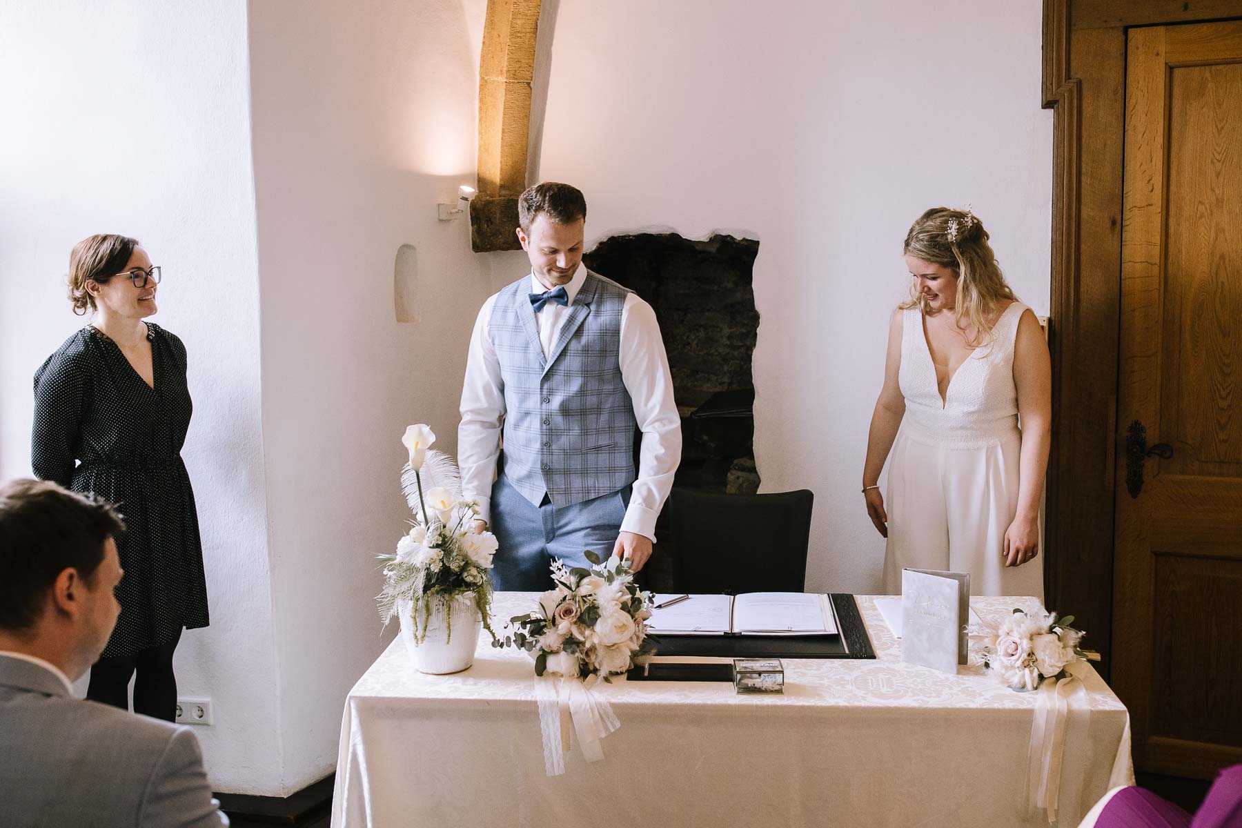 Auch wenn sich einige andere Hochzeitsgesellschaften auf dem Gelände befanden, war es mir wichtig, die ruhigen, intimen Momente von Lena und Chris einzufangen, die ihre Liebe zueinander zeigten. Das natürliche Licht und die beeindruckende Architektur des Hauses verliehen den Bildern einen einzigartigen Charakter. Nach dem Brautpaarshooting warteten bereits die Gäste, um mit dem Paar in die Burg zu gehen. Der Zugang zur Burg führte über eine wunderschöne Brücke, die über den Wassergraben des Hauses führte – ein Detail, das ich sofort in die Reportage einbaute. Es war ein magischer Moment, als die Gäste mit Lena und Chris die Brücke überquerten und in das historische Gebäude eintraten. Die standesamtliche Trauung fand im mittelalterlichen Trauzimmer statt – ein absolut beeindruckender Raum, der perfekt für solch eine feierliche Zeremonie war. Die Trauung war emotional und voller schöner Worte und es war mir eine Freude, diese Momente der Liebe und Freude in Bildern festzuhalten. Nach der Trauung wurde der Tag mit einem kleinen Sektempfang draußen fortgesetzt, bei dem die Gäste dem frisch vermählten Paar ihre Glückwünsche aussprachen.
