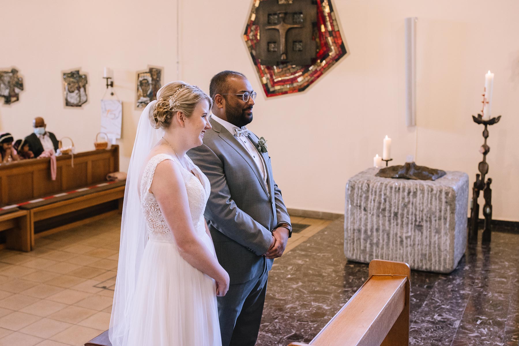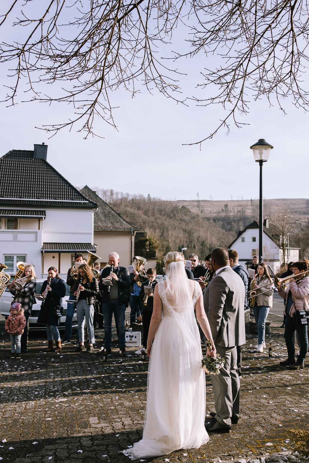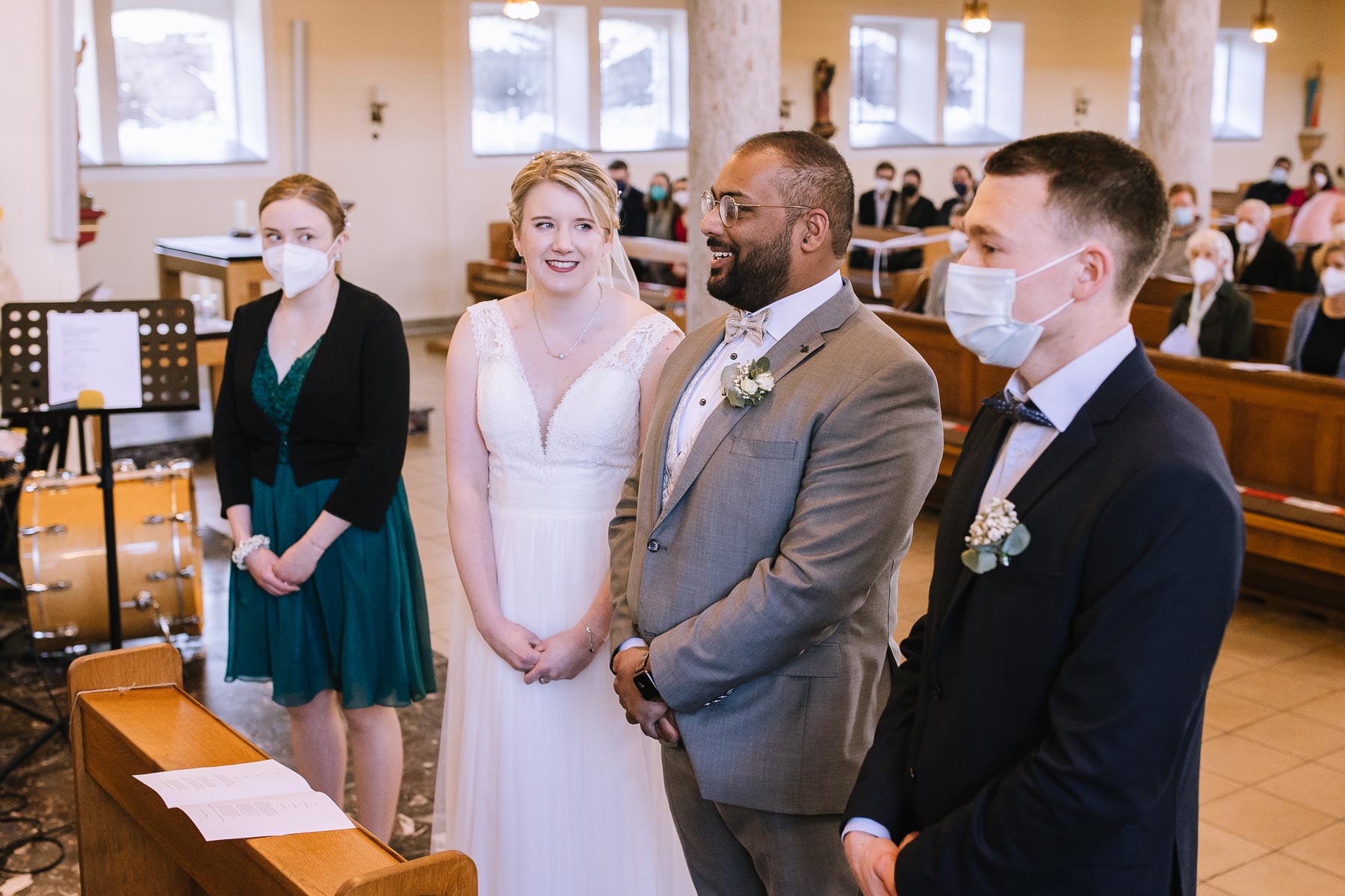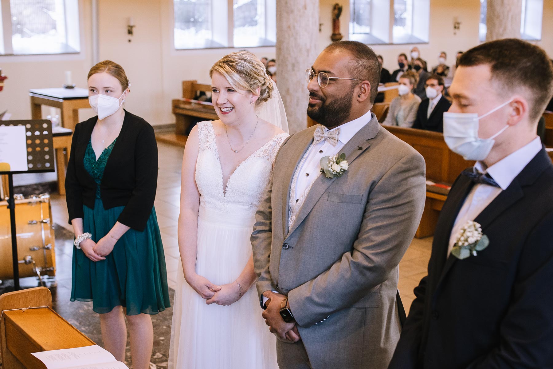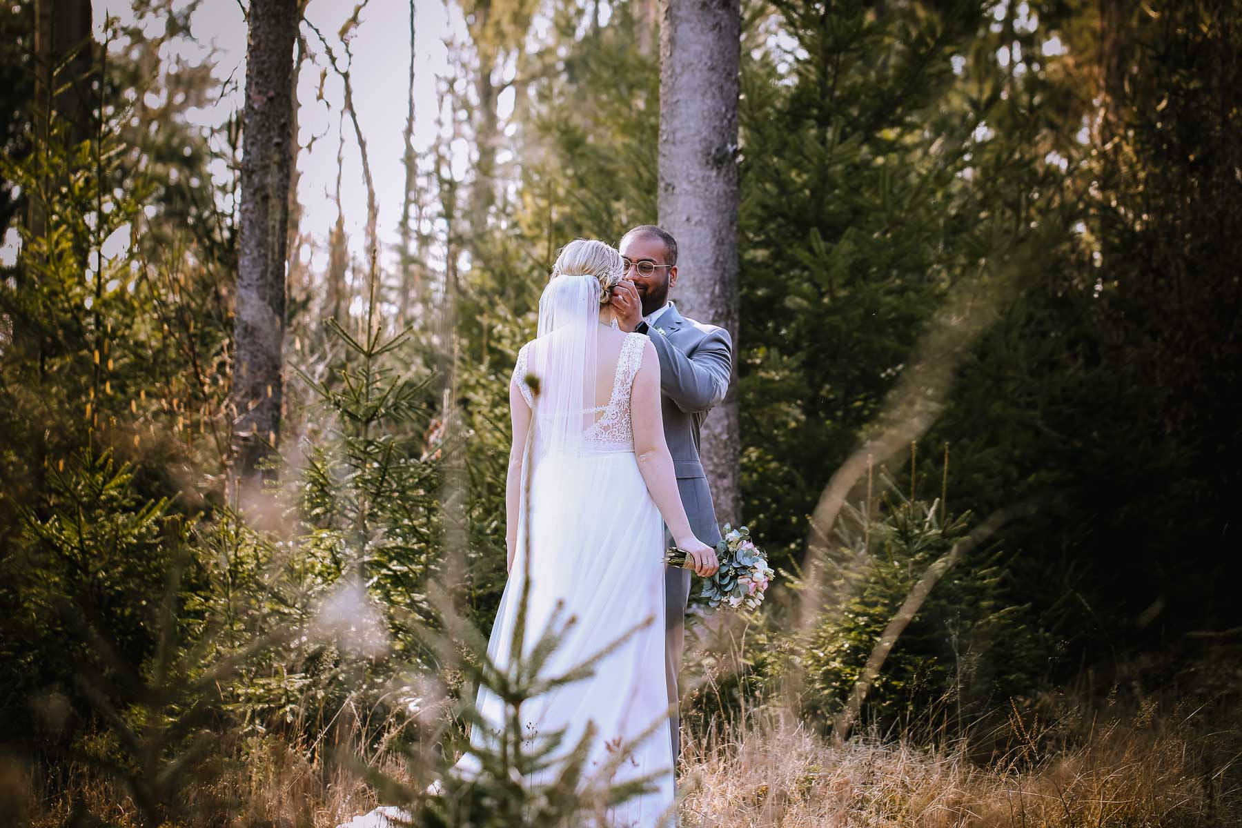 Marlin und Krishna lernte ich im Herbst in einem Videomeeting kennen. Nachdem wir gemerkt haben, dass die Chemie stimmt, haben wir direkt alles fest gemacht. Leider kam mal wieder die Pandemie dazwischen, sodass die Hochzeitspläne verschoben werden mussten. Anderthalb Jahre später war es dann im März soweit: die kirchliche Hochzeit von Marlin und Krishna konnte endlich stattfinden. Die Beiden haben sich dazu entschieden, das Brautpaarshooting in Ruhe vor der Trauung stattfinden zu lassen, um den Nachmittag in vollen Zügen mit den Gästen genießen zu können. Krishna holte Marlin in ihrem Elternhaus ab und wir fuhren zusammen zu einem Waldstück, das ich kurz vorher entdeckt hatte. Sauerländer Fichten, ein paar hohe Gräser und schon ist die Location perfekt geeignet für eine klassische Hochzeit im Sauerland. Zwischen Marsberg und Bredelar parkten wir am Straßenrand und trafen uns dort mit Marlins Vater, der mit Marlins Hund hinterhergefahren war. Der musste natürlich auch auf ein paar Bildern mit drauf sein. Nach einem entspannten Shooting machten wir uns auf den Weg zur Erlebniskirche Bredelar, wo die Gäste schon auf das Brautpaar warteten. Obwohl die beiden sich schon vorher gesehen hatten, wollte Krishna vorne am Altar auf seine Liebste warten. Marlin wurde von ihrem Vater nach vorne