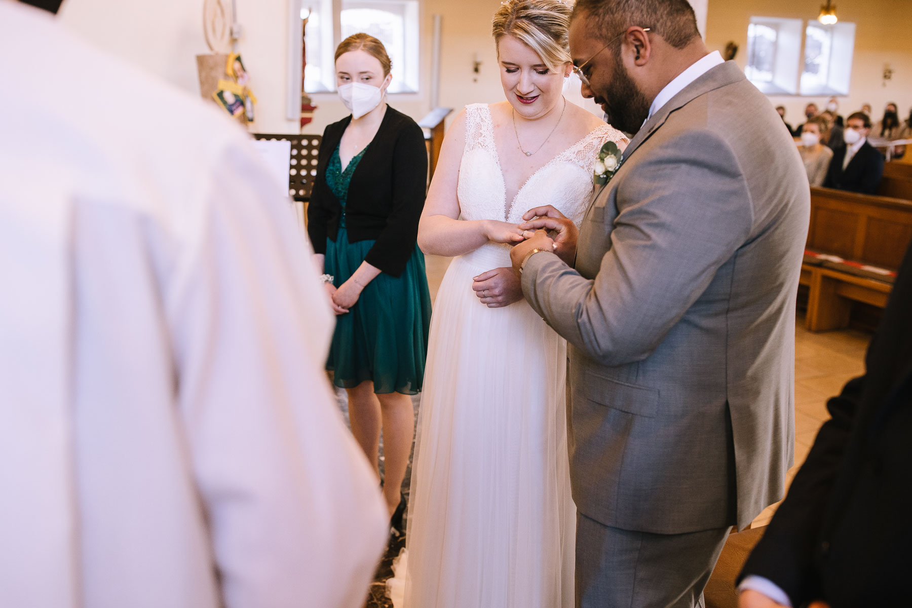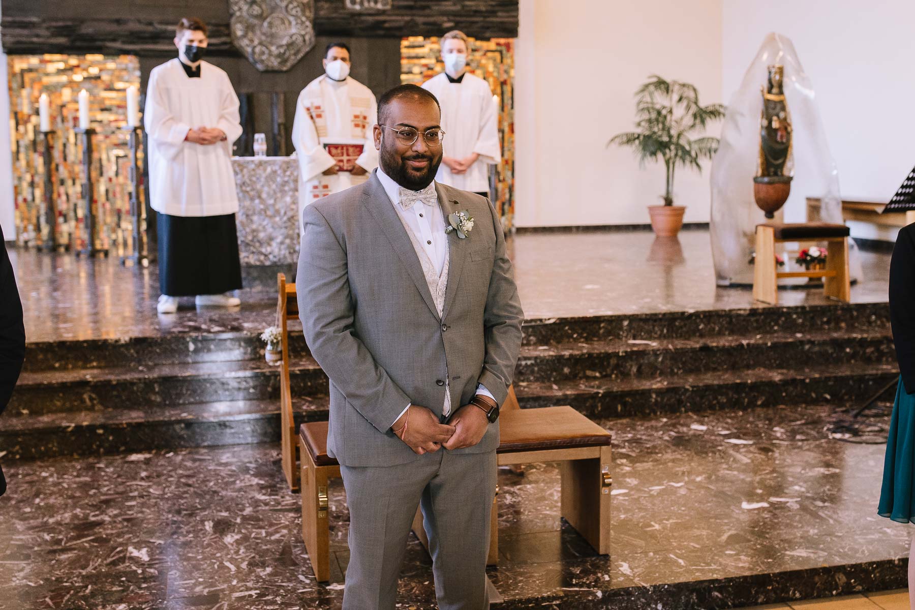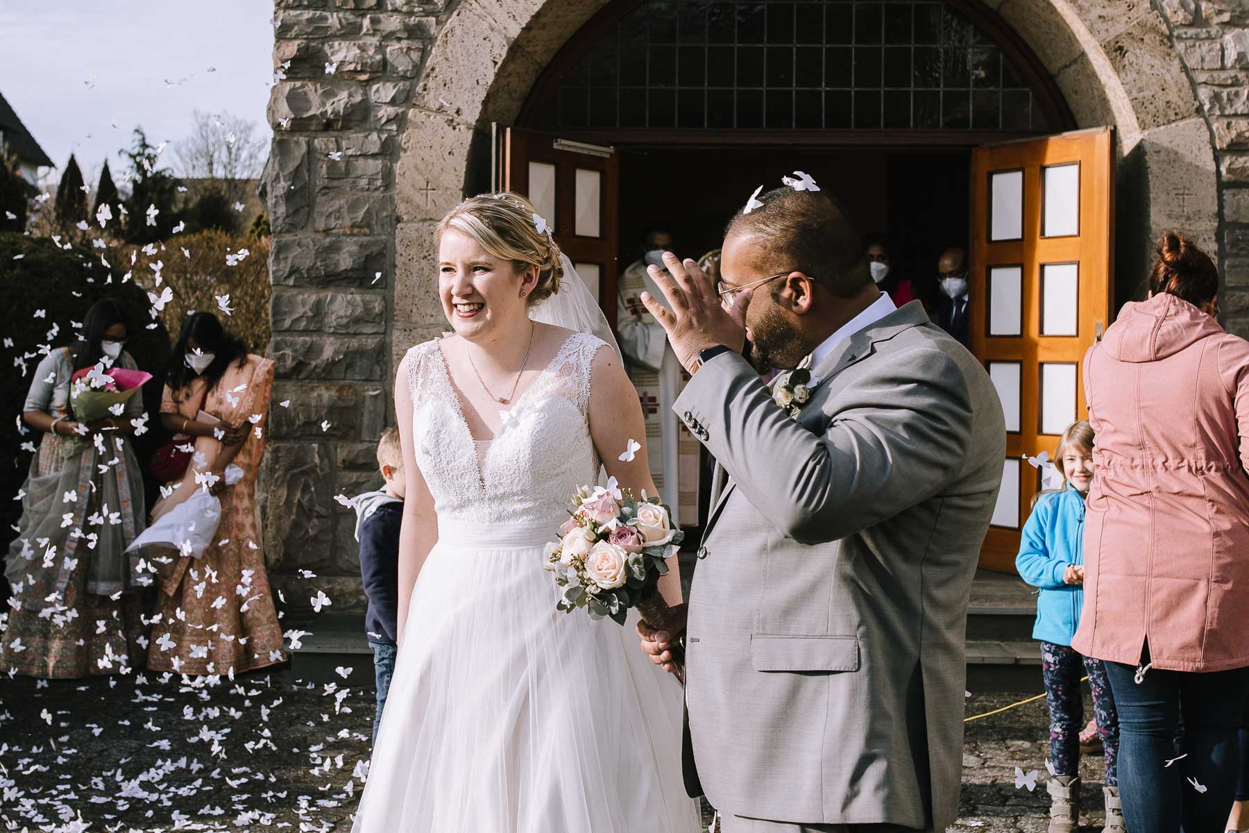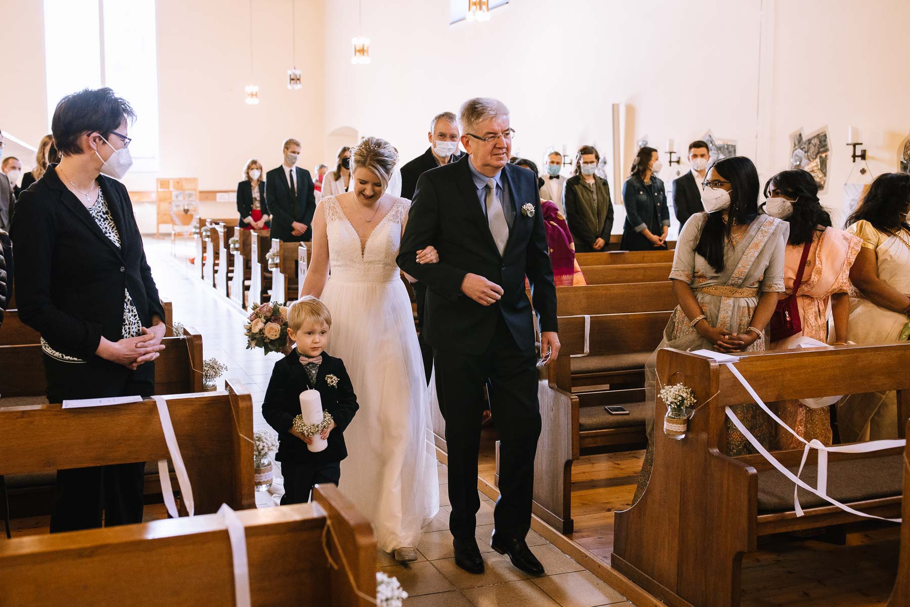 Marlin und Krishna lernte ich im Herbst in einem Videomeeting kennen. Nachdem wir gemerkt haben, dass die Chemie stimmt, haben wir direkt alles fest gemacht. Leider kam mal wieder die Pandemie dazwischen, sodass die Hochzeitspläne verschoben werden mussten. Anderthalb Jahre später war es dann im März soweit: die kirchliche Hochzeit von Marlin und Krishna konnte endlich stattfinden. Die Beiden haben sich dazu entschieden, das Brautpaarshooting in Ruhe vor der Trauung stattfinden zu lassen, um den Nachmittag in vollen Zügen mit den Gästen genießen zu können. Krishna holte Marlin in ihrem Elternhaus ab und wir fuhren zusammen zu einem Waldstück, das ich kurz vorher entdeckt hatte. Sauerländer Fichten, ein paar hohe Gräser und schon ist die Location perfekt geeignet für eine klassische Hochzeit im Sauerland. Zwischen Marsberg und Bredelar parkten wir am Straßenrand und trafen uns dort mit Marlins Vater, der mit Marlins Hund hinterhergefahren war. Der musste natürlich auch auf ein paar Bildern mit drauf sein. Nach einem entspannten Shooting machten wir uns auf den Weg zur Erlebniskirche Bredelar, wo die Gäste schon auf das Brautpaar warteten. Obwohl die beiden sich schon vorher gesehen hatten, wollte Krishna vorne am Altar auf seine Liebste warten. Marlin wurde von ihrem Vater nach vorne