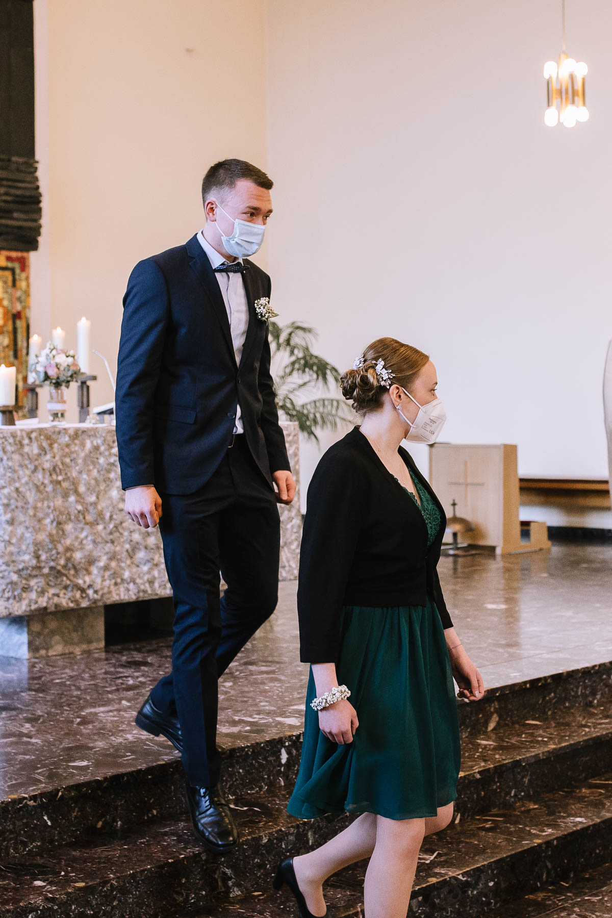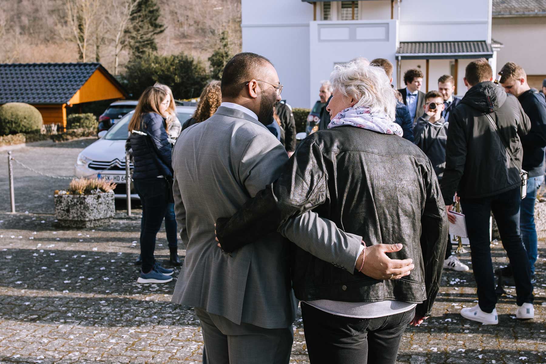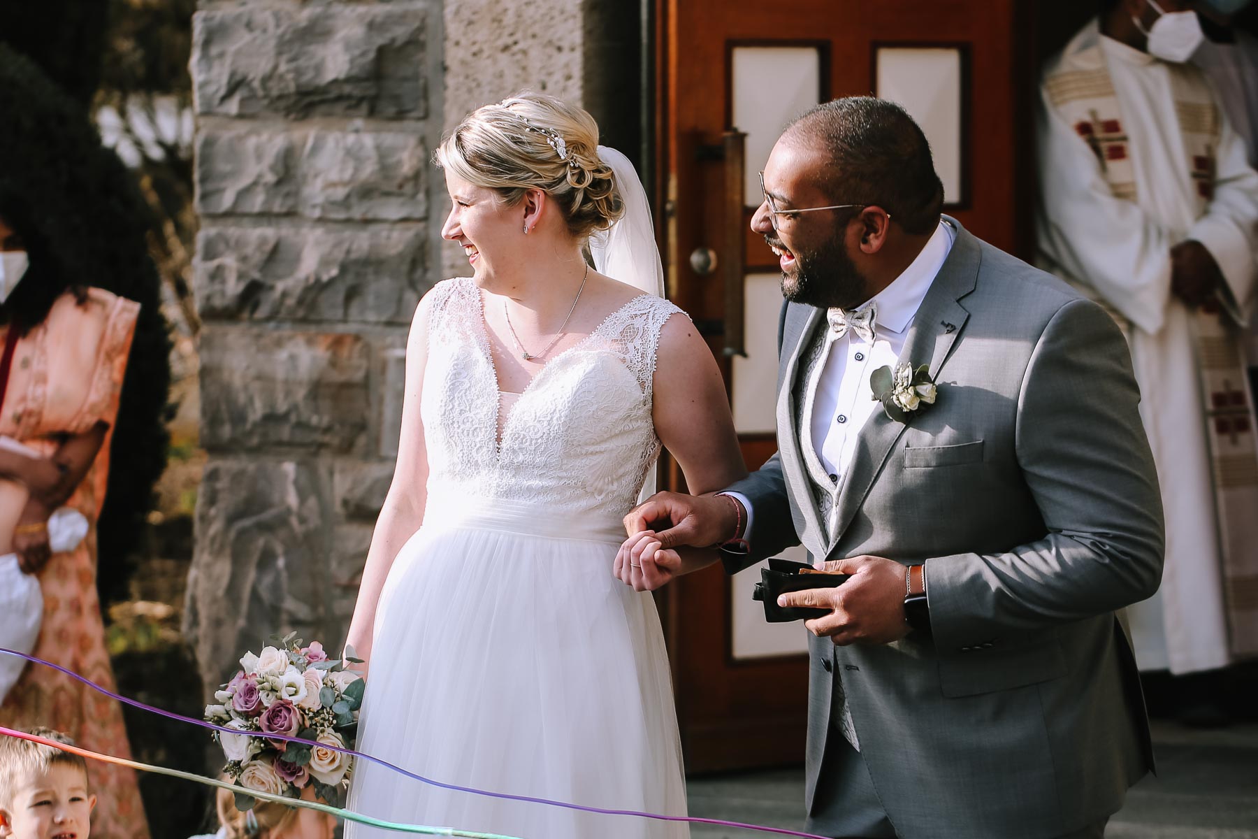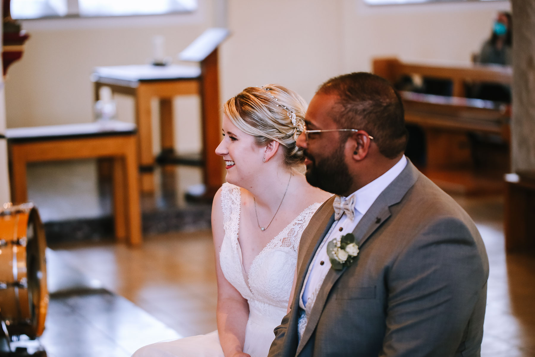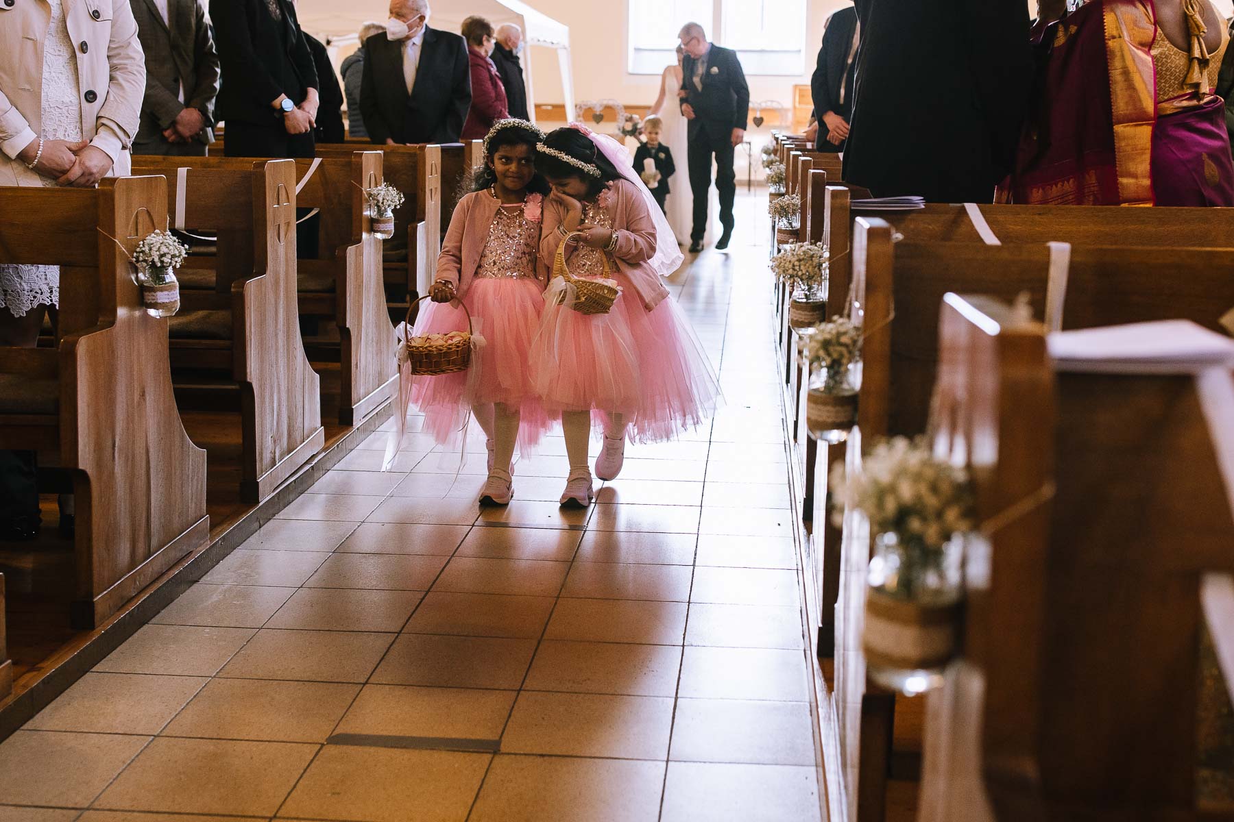 Marlin und Krishna lernte ich im Herbst in einem Videomeeting kennen. Nachdem wir gemerkt haben, dass die Chemie stimmt, haben wir direkt alles fest gemacht. Leider kam mal wieder die Pandemie dazwischen, sodass die Hochzeitspläne verschoben werden mussten. Anderthalb Jahre später war es dann im März soweit: die kirchliche Hochzeit von Marlin und Krishna konnte endlich stattfinden. Die Beiden haben sich dazu entschieden, das Brautpaarshooting in Ruhe vor der Trauung stattfinden zu lassen, um den Nachmittag in vollen Zügen mit den Gästen genießen zu können. Krishna holte Marlin in ihrem Elternhaus ab und wir fuhren zusammen zu einem Waldstück, das ich kurz vorher entdeckt hatte. Sauerländer Fichten, ein paar hohe Gräser und schon ist die Location perfekt geeignet für eine klassische Hochzeit im Sauerland. Zwischen Marsberg und Bredelar parkten wir am Straßenrand und trafen uns dort mit Marlins Vater, der mit Marlins Hund hinterhergefahren war. Der musste natürlich auch auf ein paar Bildern mit drauf sein. Nach einem entspannten Shooting machten wir uns auf den Weg zur Erlebniskirche Bredelar, wo die Gäste schon auf das Brautpaar warteten. Obwohl die beiden sich schon vorher gesehen hatten, wollte Krishna vorne am Altar auf seine Liebste warten. Marlin wurde von ihrem Vater nach vorne