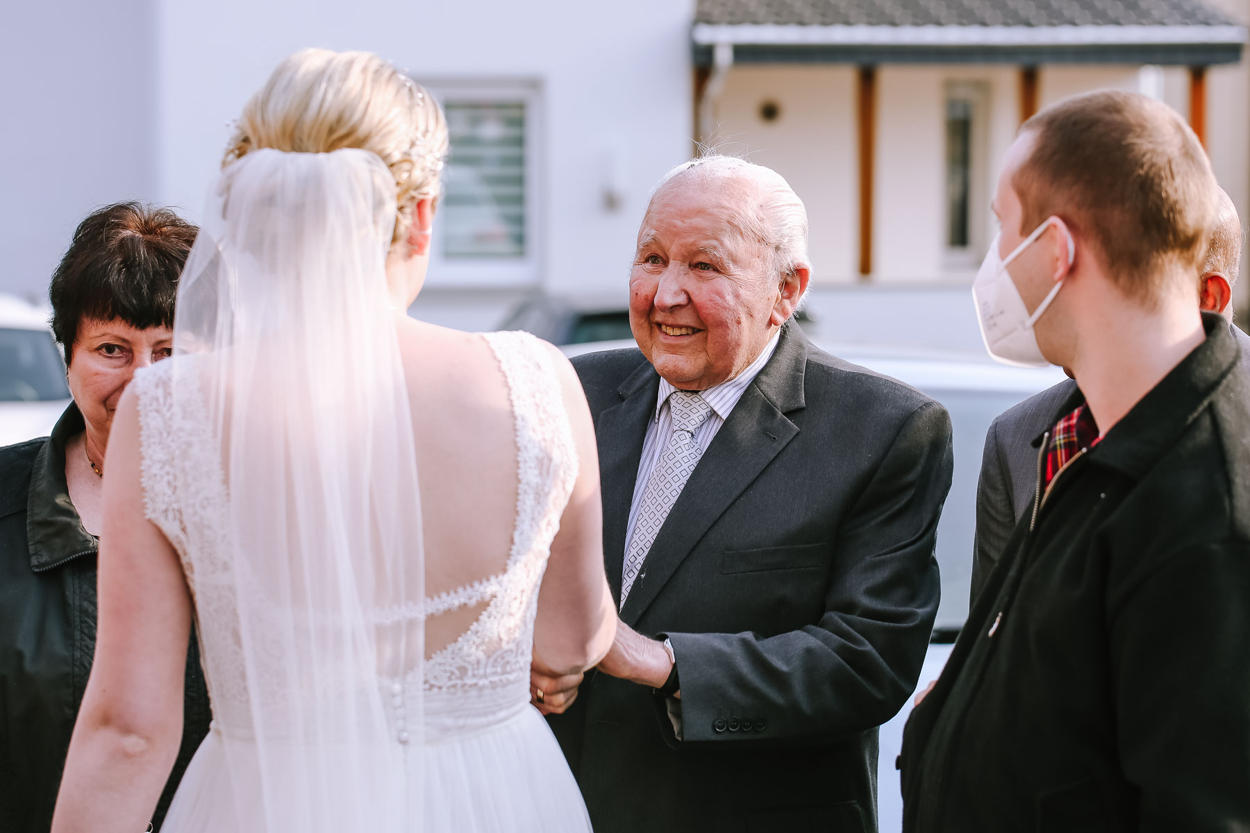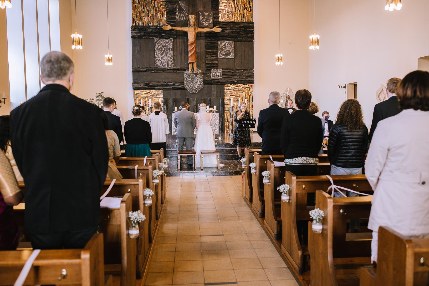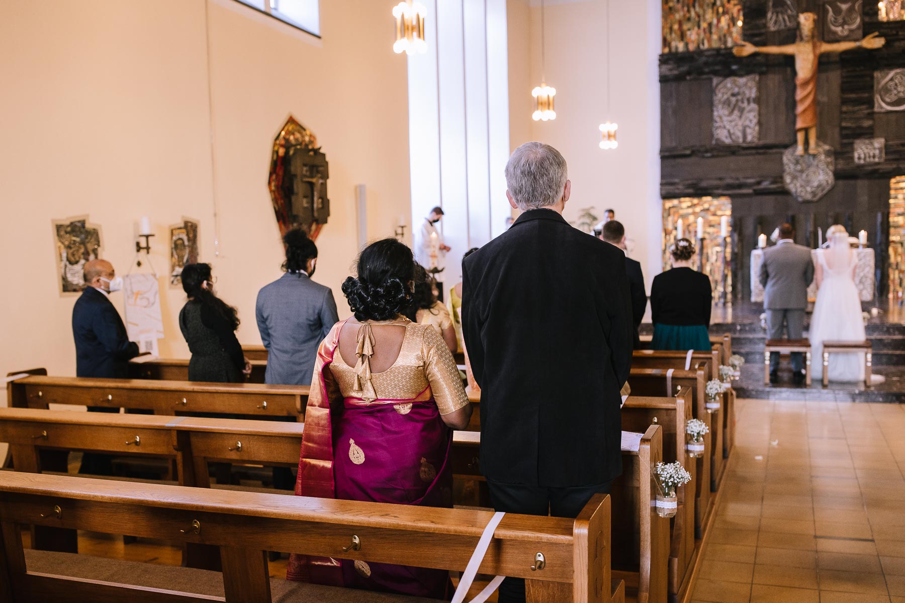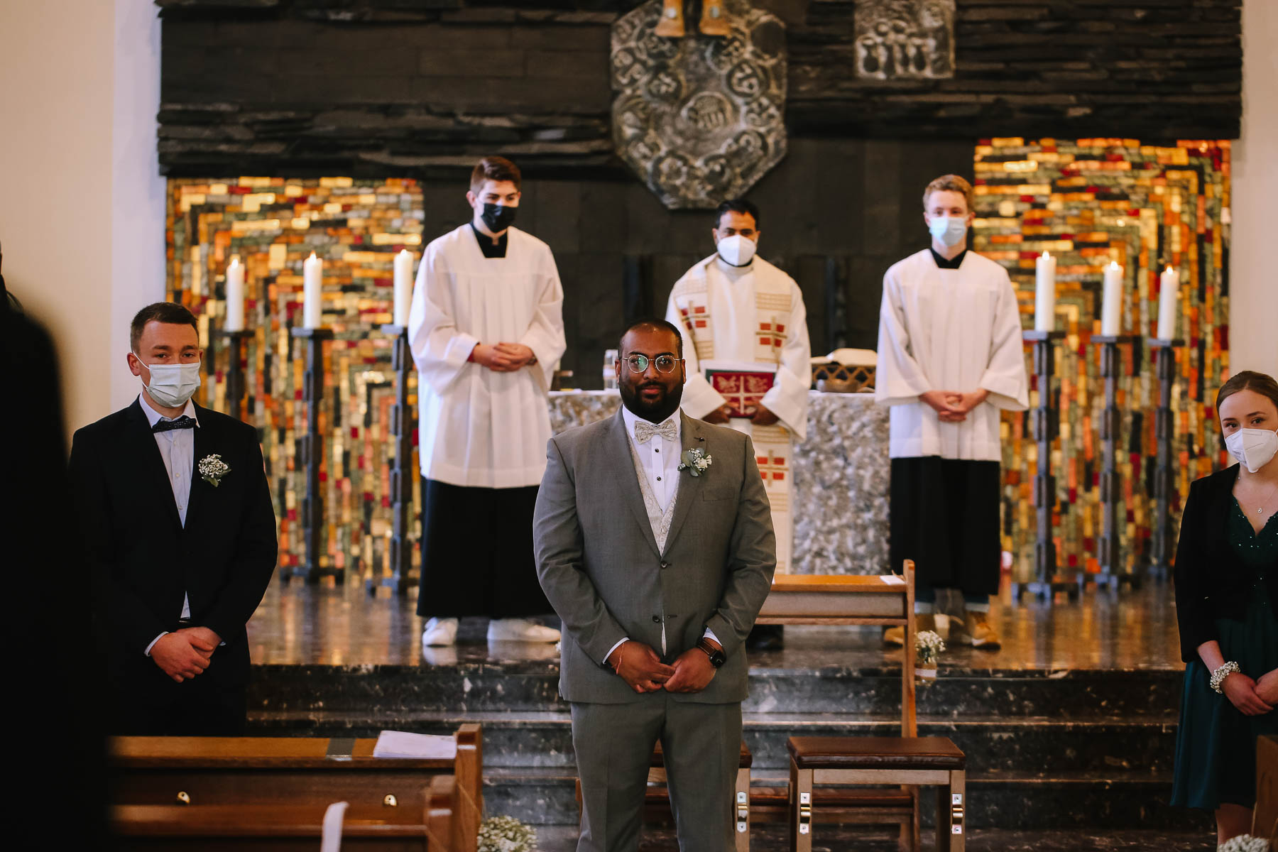 Marlin und Krishna lernte ich im Herbst in einem Videomeeting kennen. Nachdem wir gemerkt haben, dass die Chemie stimmt, haben wir direkt alles fest gemacht. Leider kam mal wieder die Pandemie dazwischen, sodass die Hochzeitspläne verschoben werden mussten. Anderthalb Jahre später war es dann im März soweit: die kirchliche Hochzeit von Marlin und Krishna konnte endlich stattfinden. Die Beiden haben sich dazu entschieden, das Brautpaarshooting in Ruhe vor der Trauung stattfinden zu lassen, um den Nachmittag in vollen Zügen mit den Gästen genießen zu können. Krishna holte Marlin in ihrem Elternhaus ab und wir fuhren zusammen zu einem Waldstück, das ich kurz vorher entdeckt hatte. Sauerländer Fichten, ein paar hohe Gräser und schon ist die Location perfekt geeignet für eine klassische Hochzeit im Sauerland. Zwischen Marsberg und Bredelar parkten wir am Straßenrand und trafen uns dort mit Marlins Vater, der mit Marlins Hund hinterhergefahren war. Der musste natürlich auch auf ein paar Bildern mit drauf sein. Nach einem entspannten Shooting machten wir uns auf den Weg zur Erlebniskirche Bredelar, wo die Gäste schon auf das Brautpaar warteten. Obwohl die beiden sich schon vorher gesehen hatten, wollte Krishna vorne am Altar auf seine Liebste warten. Marlin wurde von ihrem Vater nach vorne
