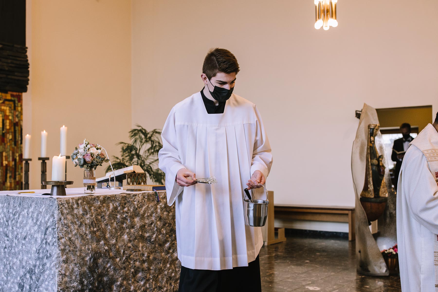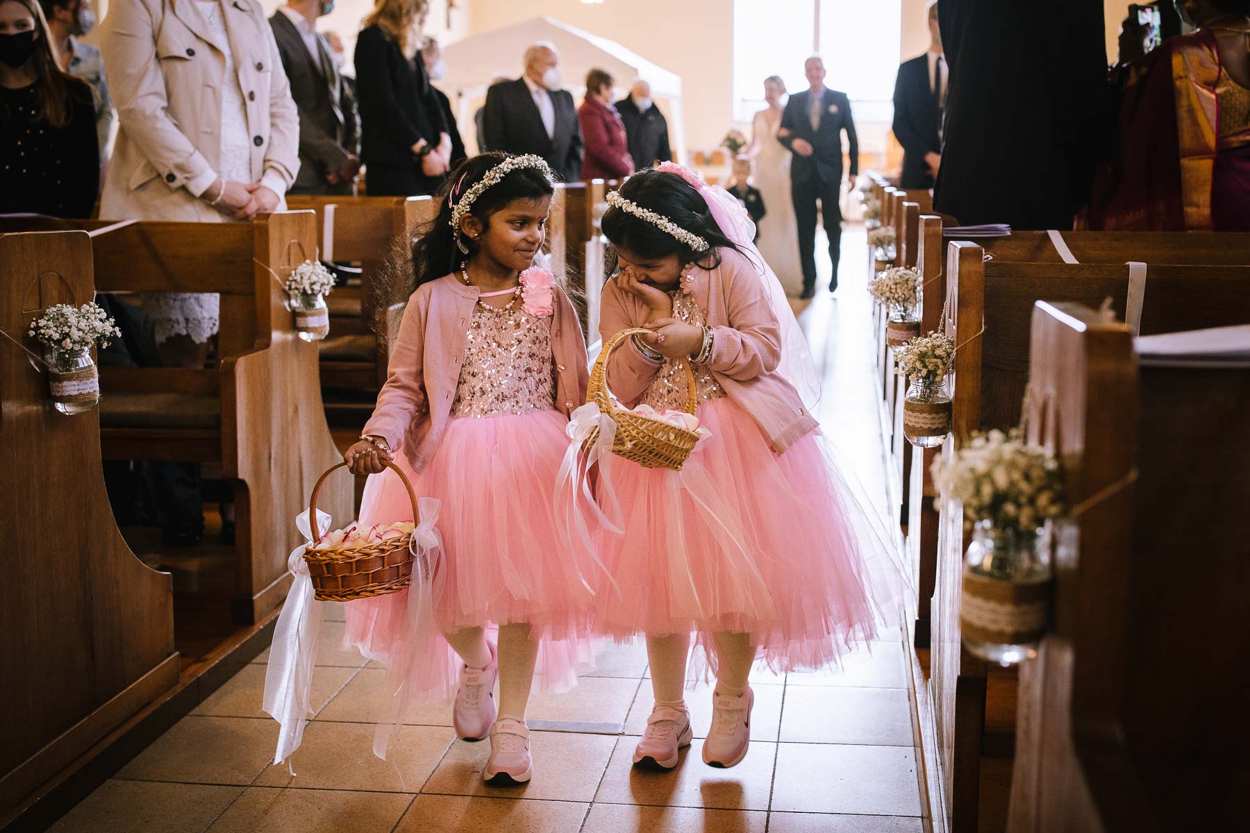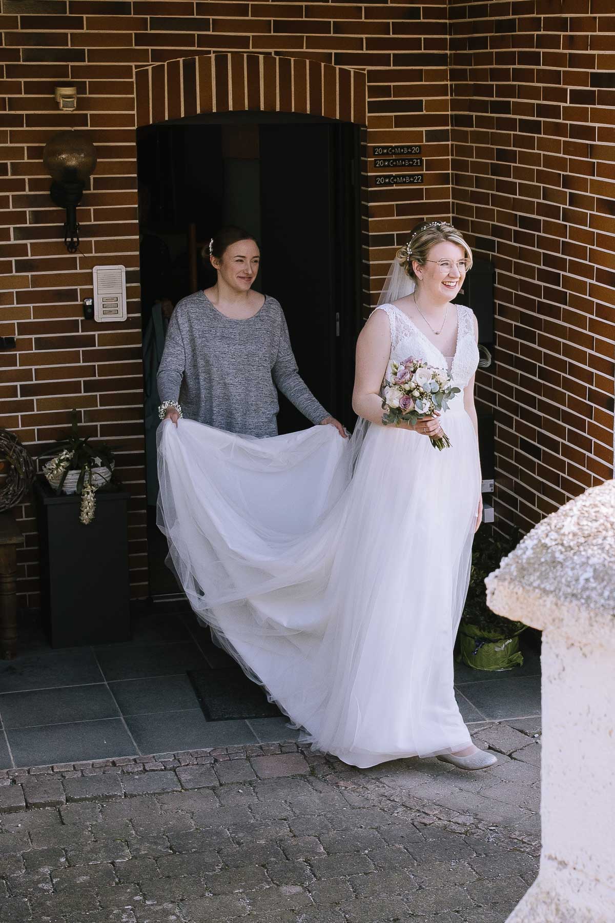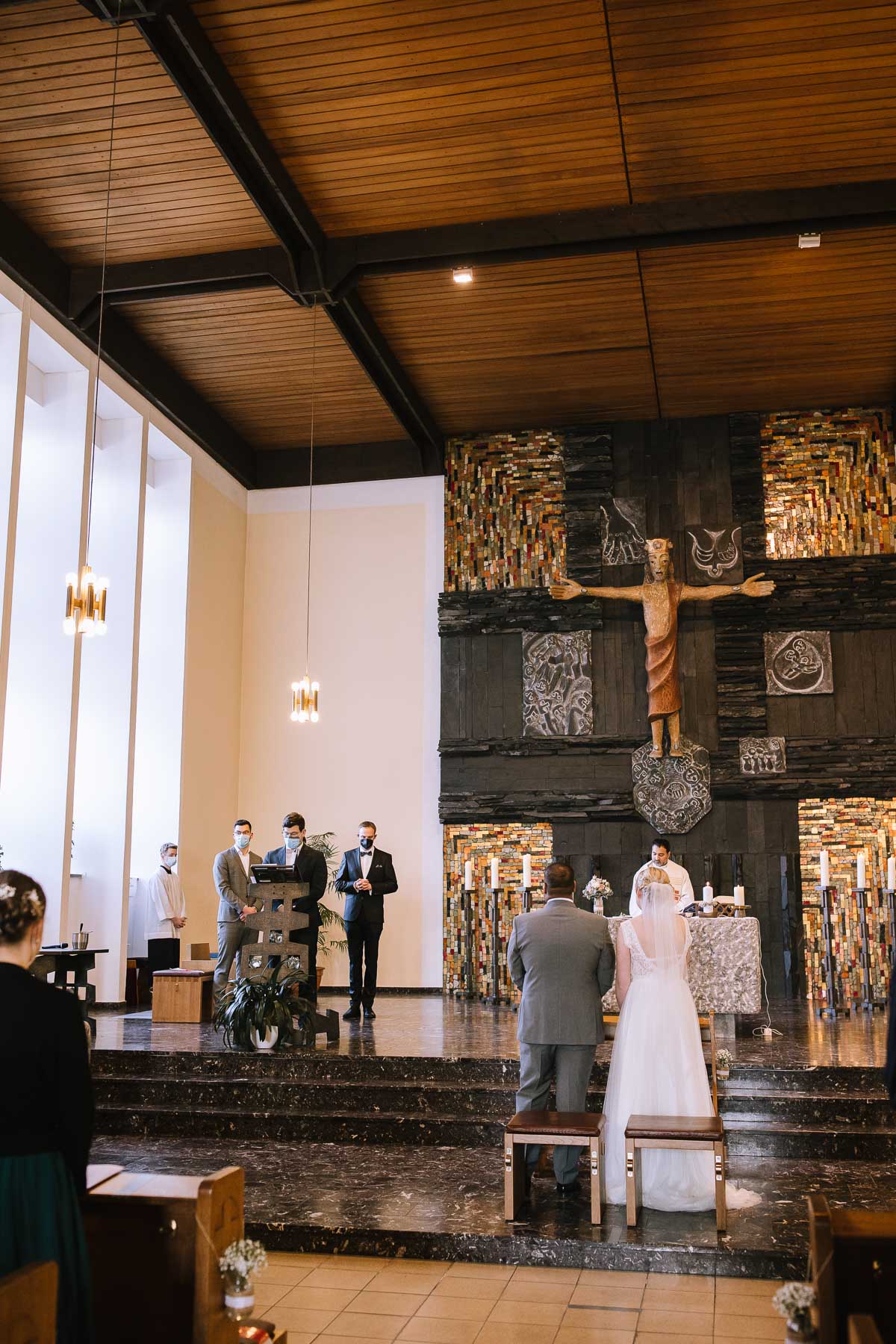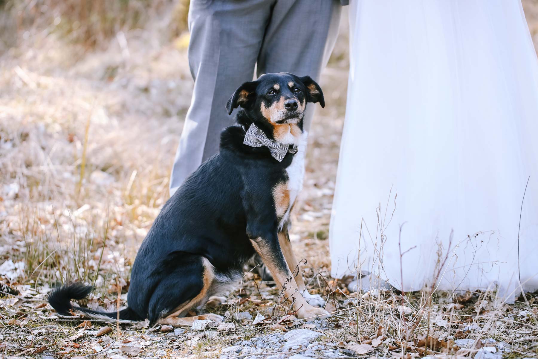 Marlin und Krishna lernte ich im Herbst in einem Videomeeting kennen. Nachdem wir gemerkt haben, dass die Chemie stimmt, haben wir direkt alles fest gemacht. Leider kam mal wieder die Pandemie dazwischen, sodass die Hochzeitspläne verschoben werden mussten. Anderthalb Jahre später war es dann im März soweit: die kirchliche Hochzeit von Marlin und Krishna konnte endlich stattfinden. Die Beiden haben sich dazu entschieden, das Brautpaarshooting in Ruhe vor der Trauung stattfinden zu lassen, um den Nachmittag in vollen Zügen mit den Gästen genießen zu können. Krishna holte Marlin in ihrem Elternhaus ab und wir fuhren zusammen zu einem Waldstück, das ich kurz vorher entdeckt hatte. Sauerländer Fichten, ein paar hohe Gräser und schon ist die Location perfekt geeignet für eine klassische Hochzeit im Sauerland. Zwischen Marsberg und Bredelar parkten wir am Straßenrand und trafen uns dort mit Marlins Vater, der mit Marlins Hund hinterhergefahren war. Der musste natürlich auch auf ein paar Bildern mit drauf sein. Nach einem entspannten Shooting machten wir uns auf den Weg zur Erlebniskirche Bredelar, wo die Gäste schon auf das Brautpaar warteten. Obwohl die beiden sich schon vorher gesehen hatten, wollte Krishna vorne am Altar auf seine Liebste warten. Marlin wurde von ihrem Vater nach vorne