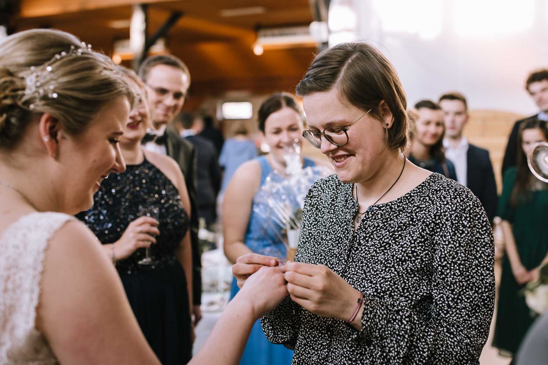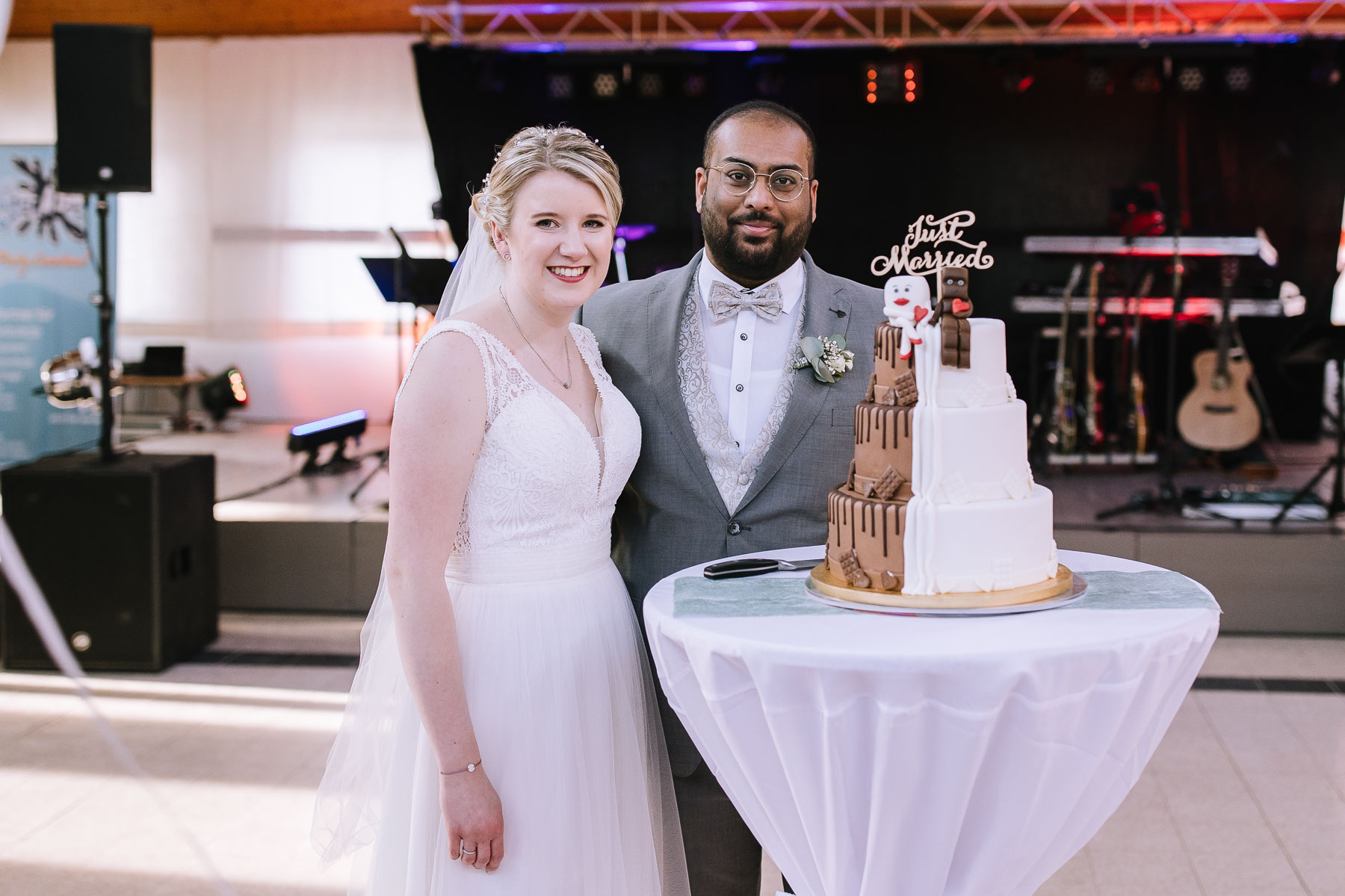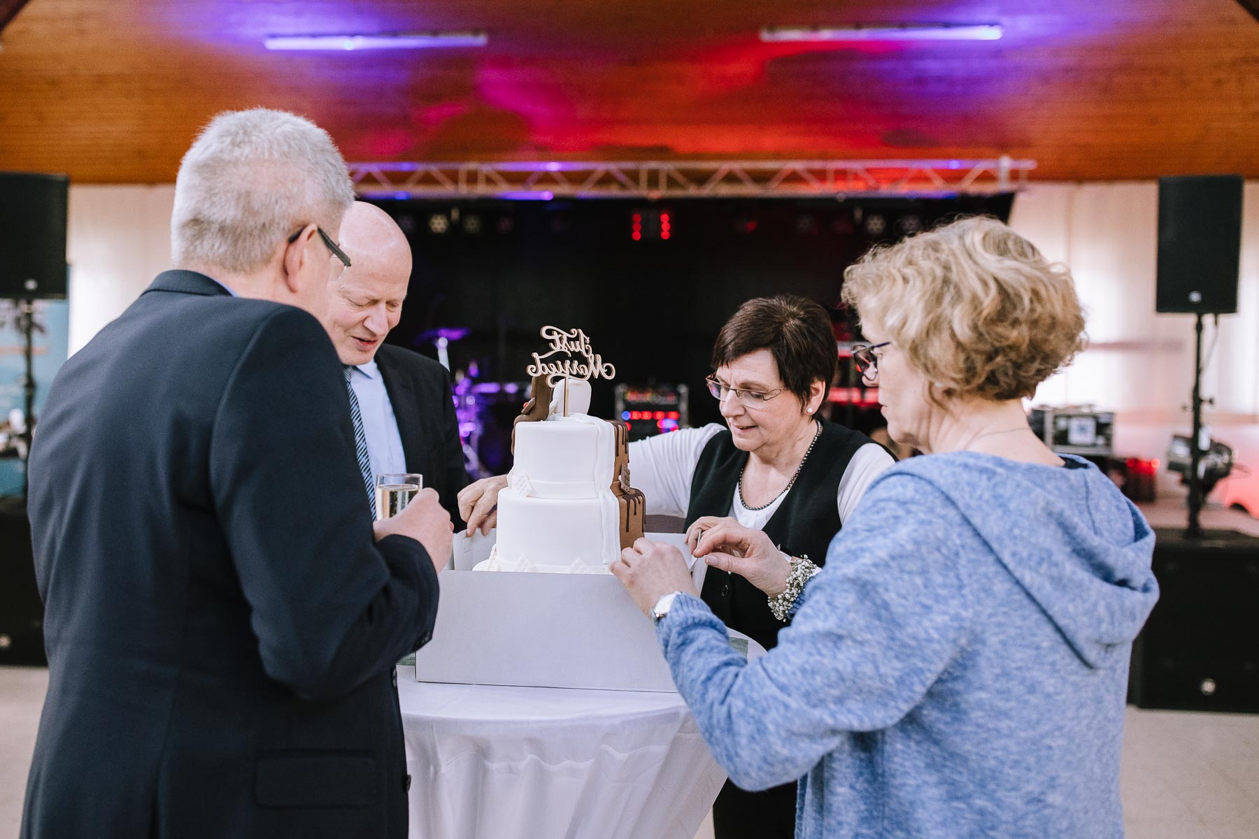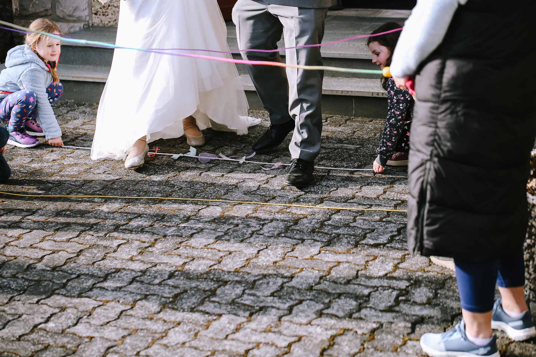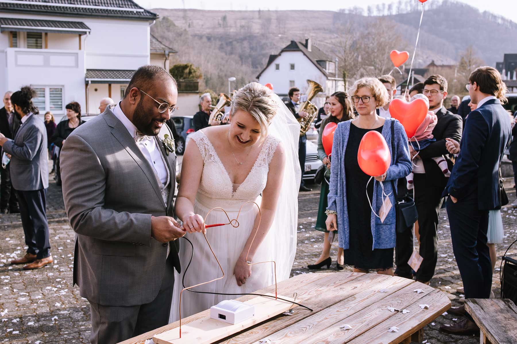 begleitet. Nach einer schönen Trauung, warteten die Gäste draußen schon mit einem selbstgebastelten heißen Draht auf das Brautpaar, das diese erste Aufgabe gemeinsam meistern musste. Anschließend wurde laut musiziert und beglückwünscht. Da die Kirche direkt neben der Schützenhalle lag, in der die Feier stattfand, konnten wir direkt nach nebenan gehen. Dort wartete ein leckeres Kuchenbuffet und die Hochzeitstorte auf das Brautpaar und die Gäste. Später machten wir dann noch ein paar Gruppenfotos.