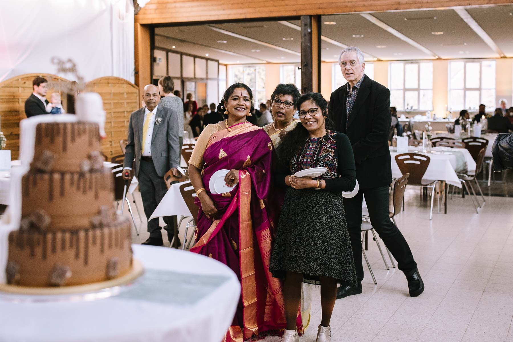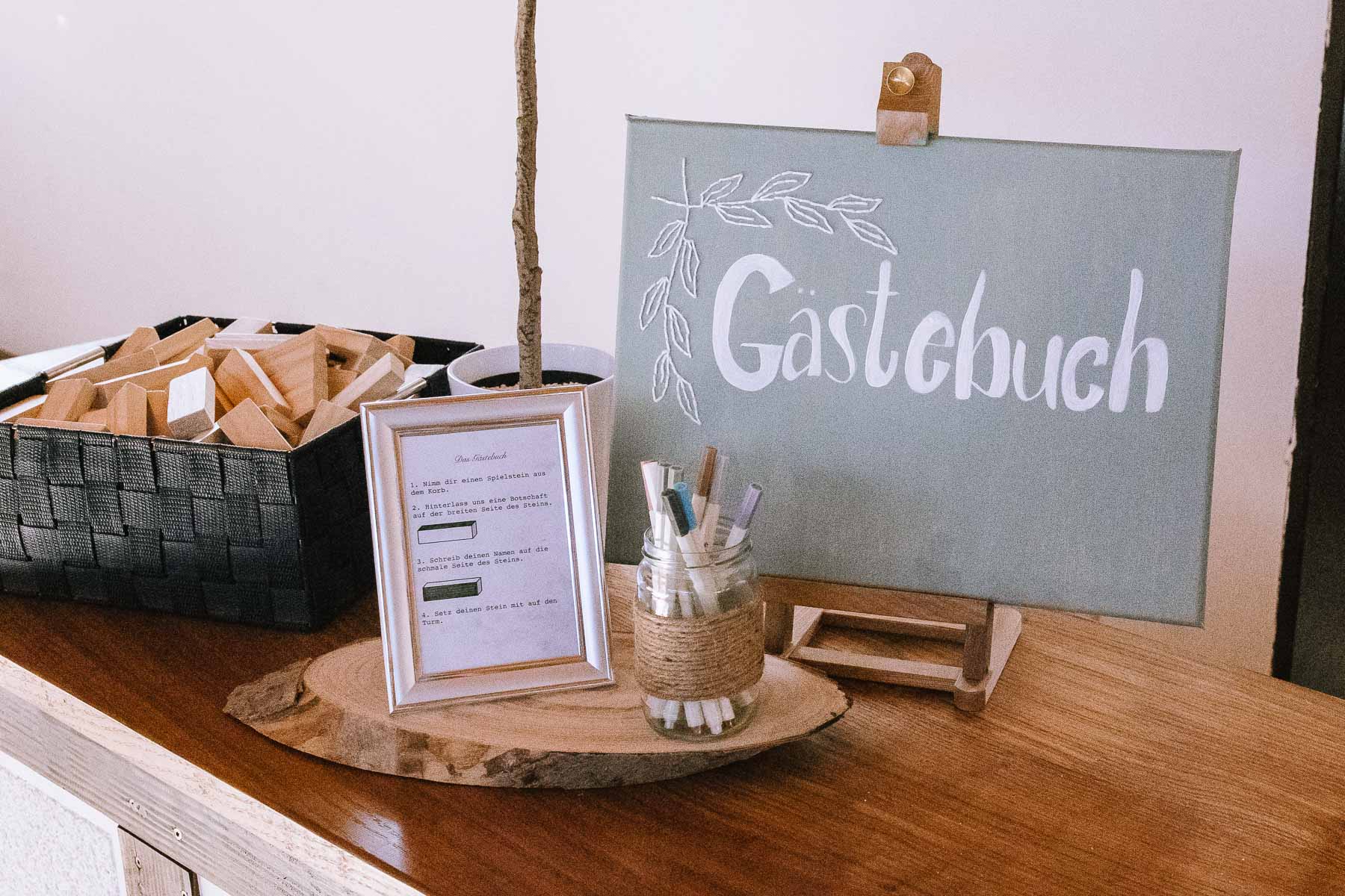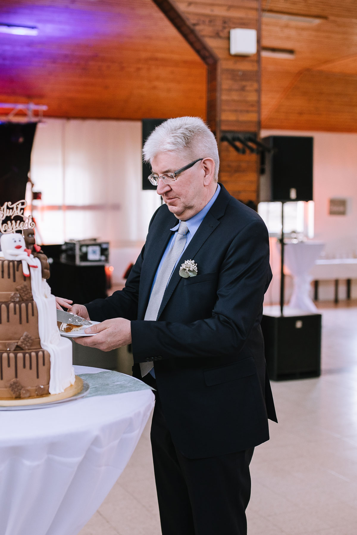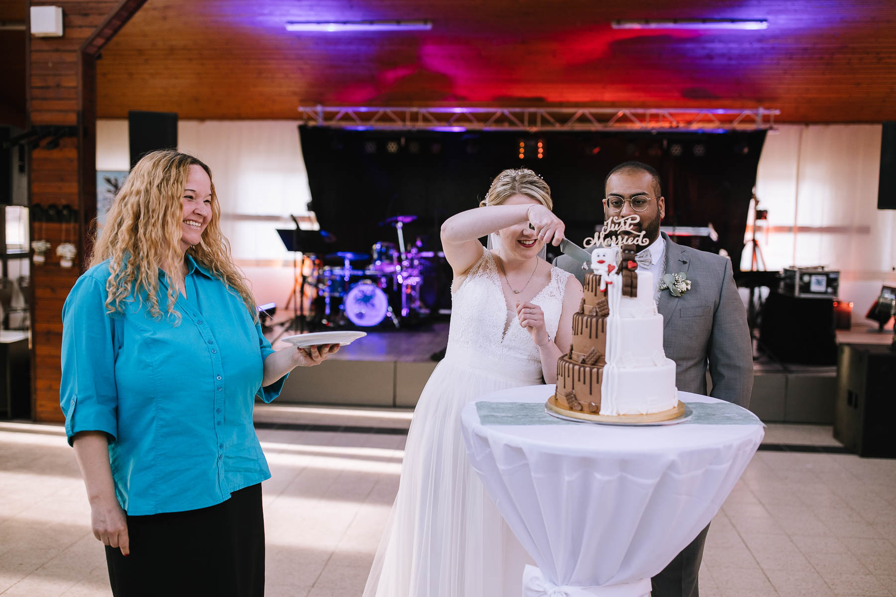begleitet. Nach einer schönen Trauung, warteten die Gäste draußen schon mit einem selbstgebastelten heißen Draht auf das Brautpaar, das diese erste Aufgabe gemeinsam meistern musste. Anschließend wurde laut musiziert und beglückwünscht. Da die Kirche direkt neben der Schützenhalle lag, in der die Feier stattfand, konnten wir direkt nach nebenan gehen. Dort wartete ein leckeres Kuchenbuffet und die Hochzeitstorte auf das Brautpaar und die Gäste. Später machten wir dann noch ein paar Gruppenfotos.
