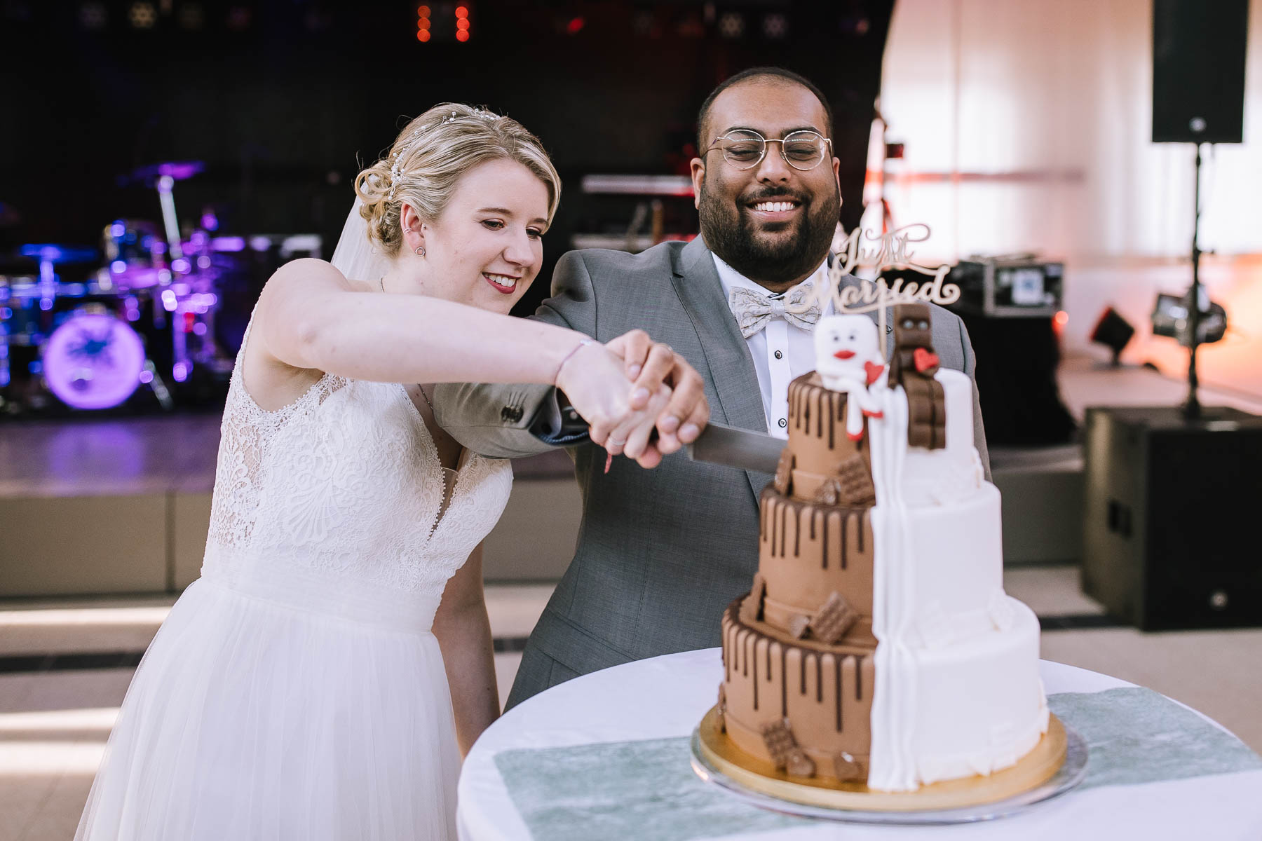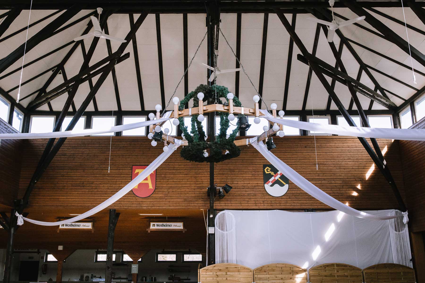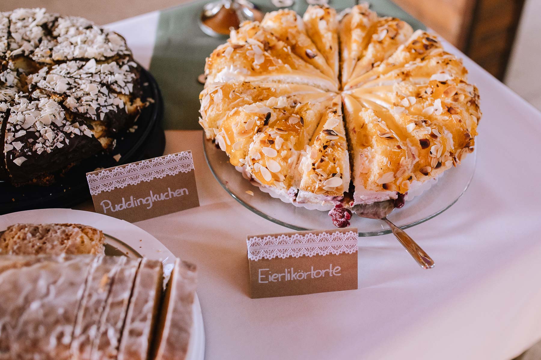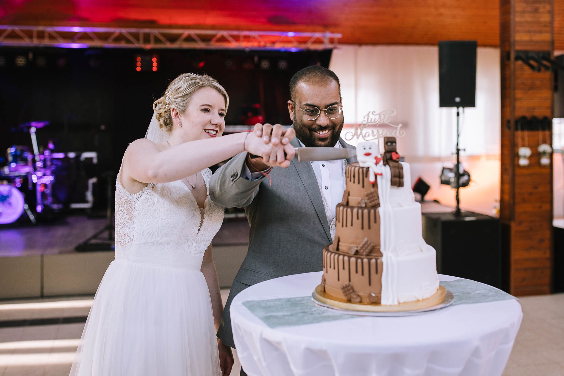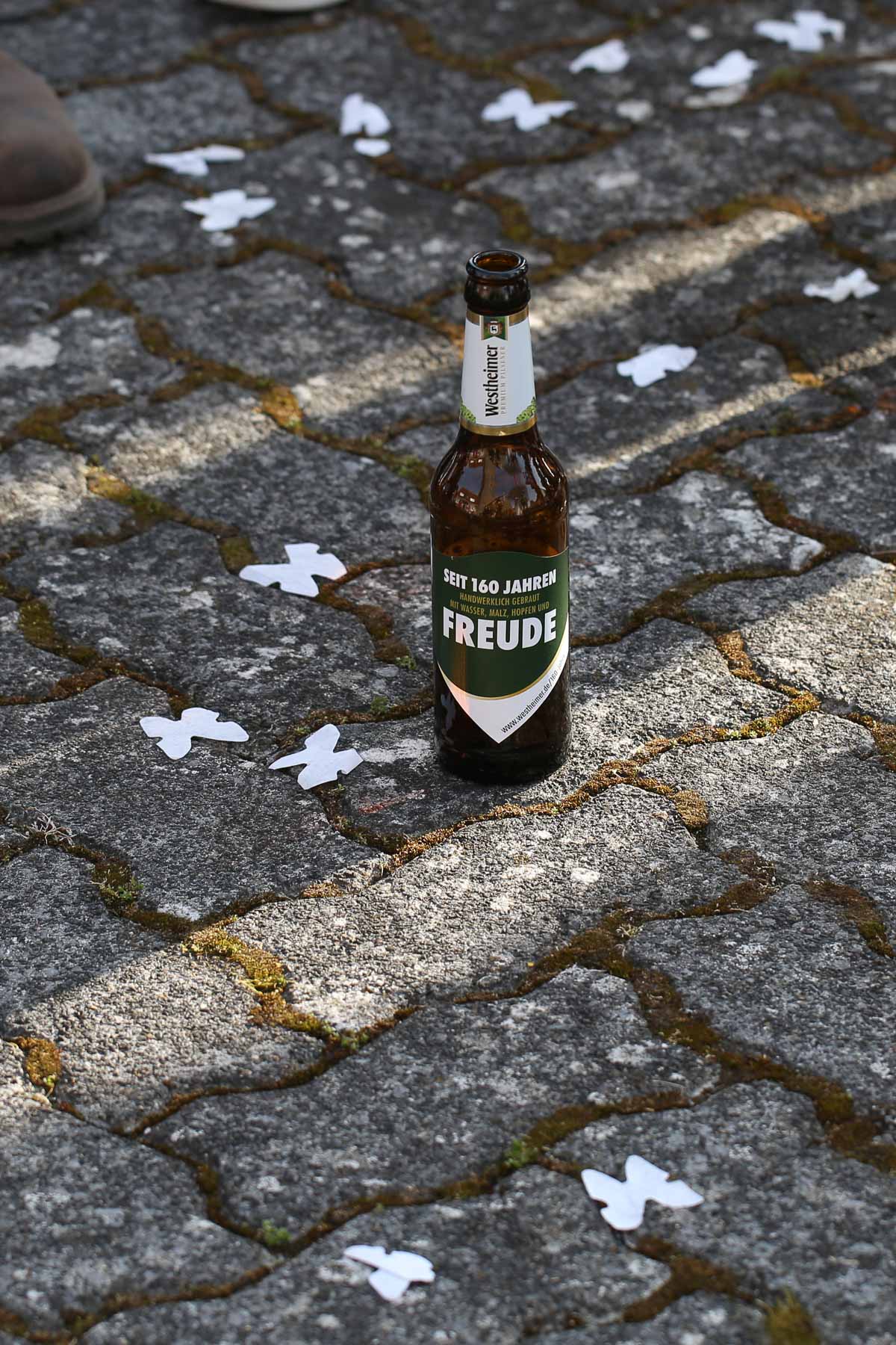 begleitet. Nach einer schönen Trauung, warteten die Gäste draußen schon mit einem selbstgebastelten heißen Draht auf das Brautpaar, das diese erste Aufgabe gemeinsam meistern musste. Anschließend wurde laut musiziert und beglückwünscht. Da die Kirche direkt neben der Schützenhalle lag, in der die Feier stattfand, konnten wir direkt nach nebenan gehen. Dort wartete ein leckeres Kuchenbuffet und die Hochzeitstorte auf das Brautpaar und die Gäste. Später machten wir dann noch ein paar Gruppenfotos.