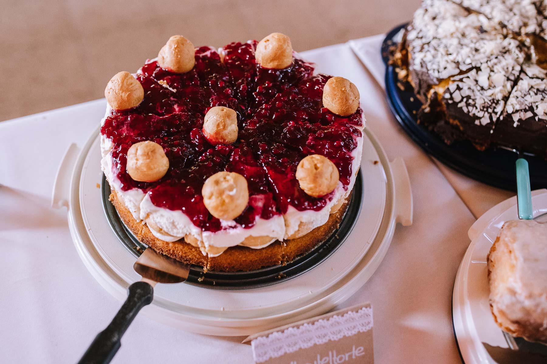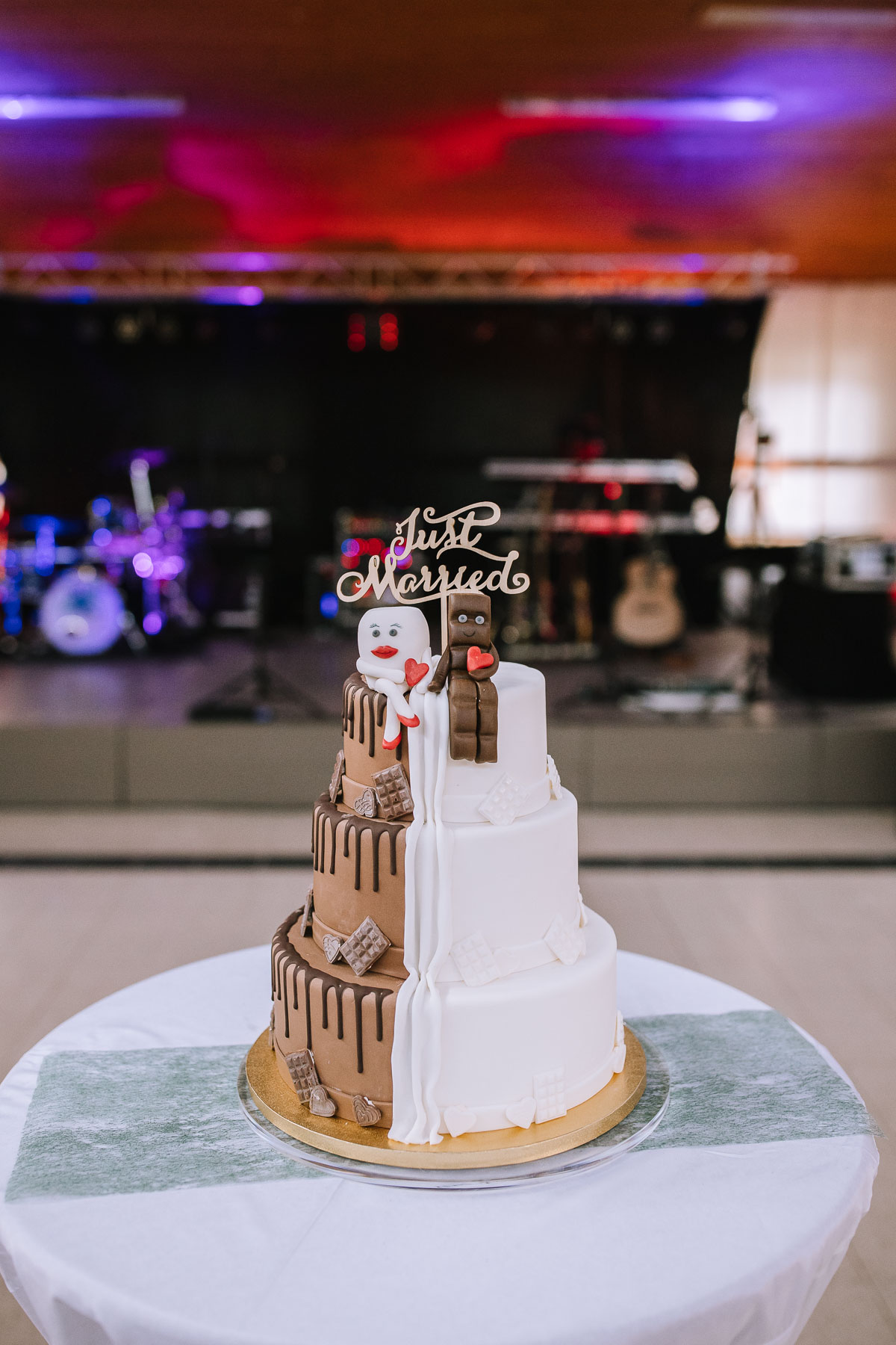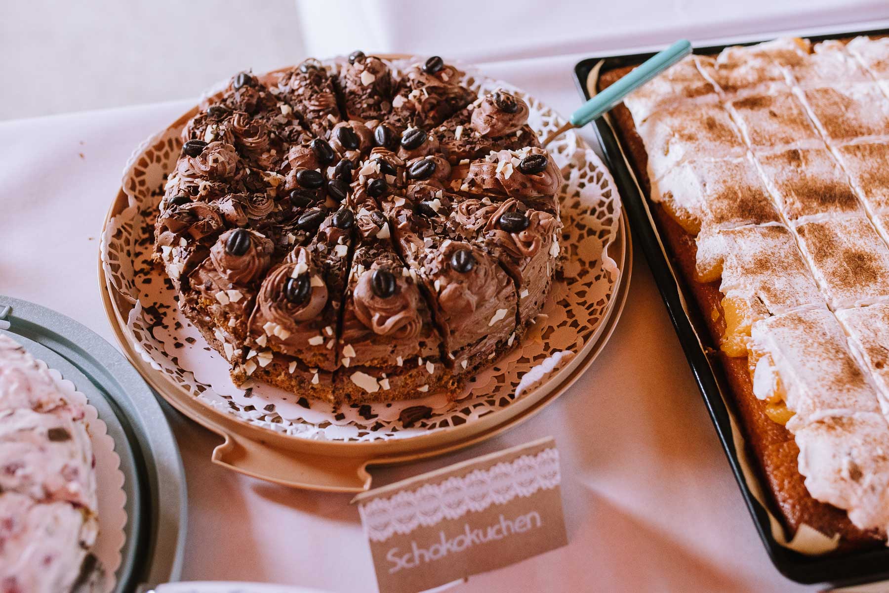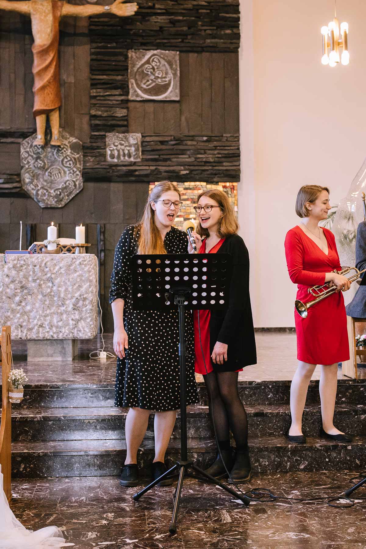 begleitet. Nach einer schönen Trauung, warteten die Gäste draußen schon mit einem selbstgebastelten heißen Draht auf das Brautpaar, das diese erste Aufgabe gemeinsam meistern musste. Anschließend wurde laut musiziert und beglückwünscht. Da die Kirche direkt neben der Schützenhalle lag, in der die Feier stattfand, konnten wir direkt nach nebenan gehen. Dort wartete ein leckeres Kuchenbuffet und die Hochzeitstorte auf das Brautpaar und die Gäste. Später machten wir dann noch ein paar Gruppenfotos.