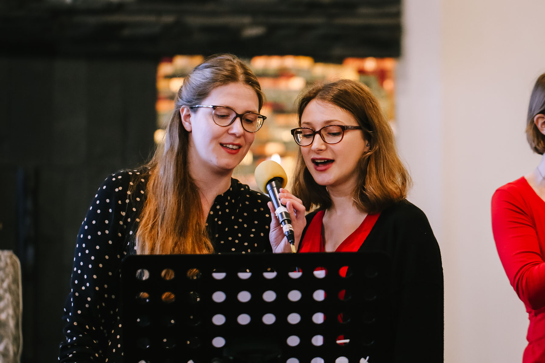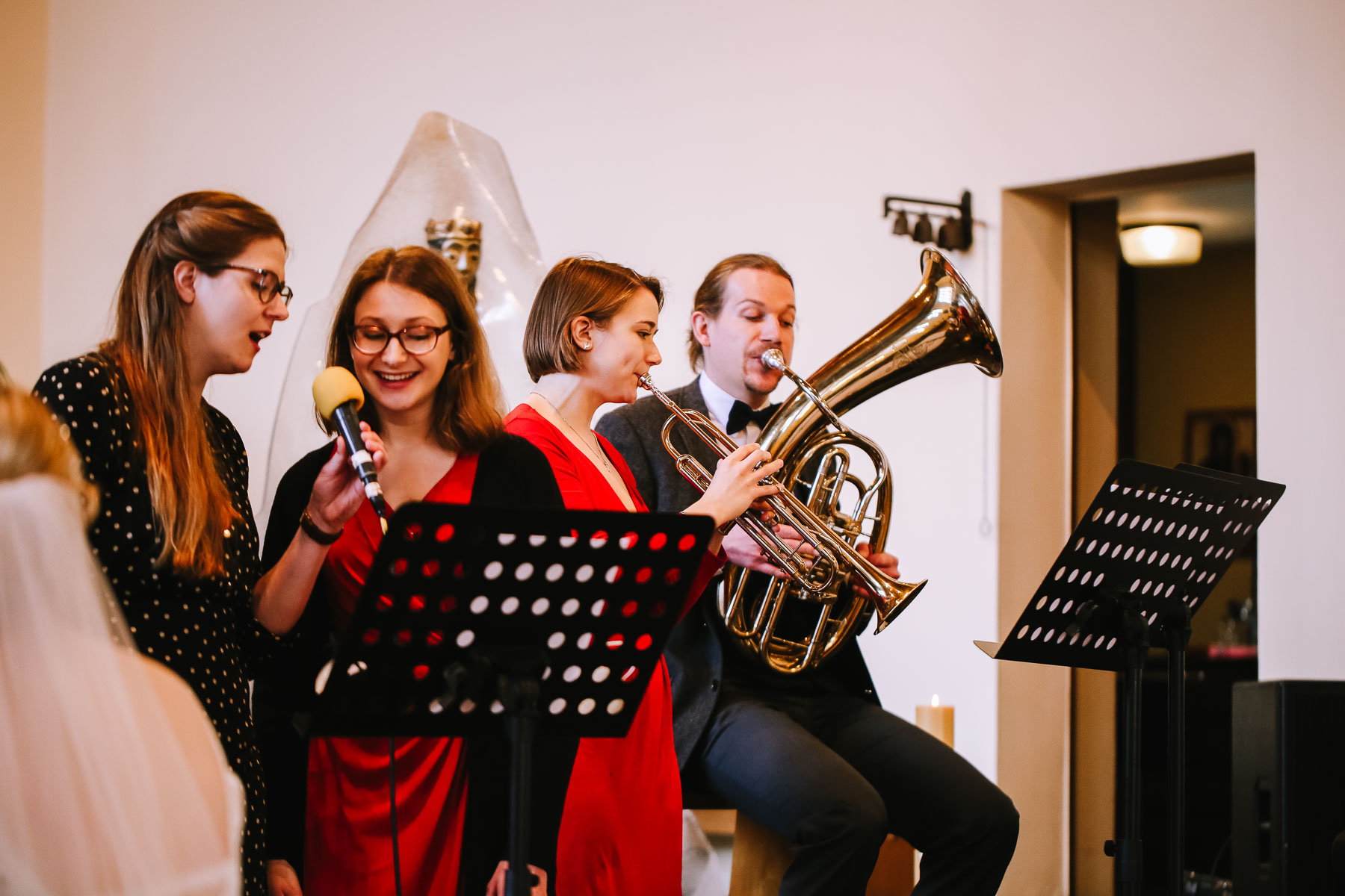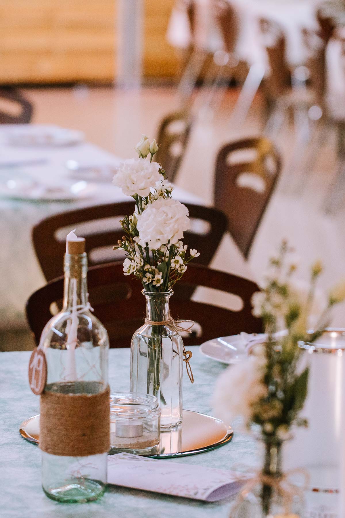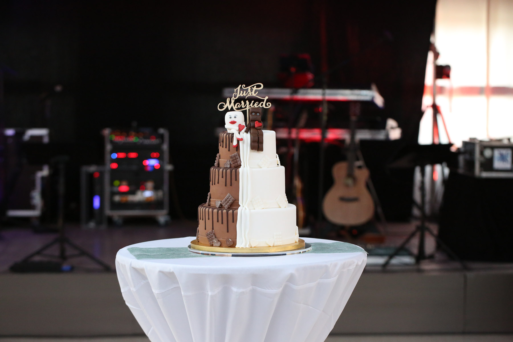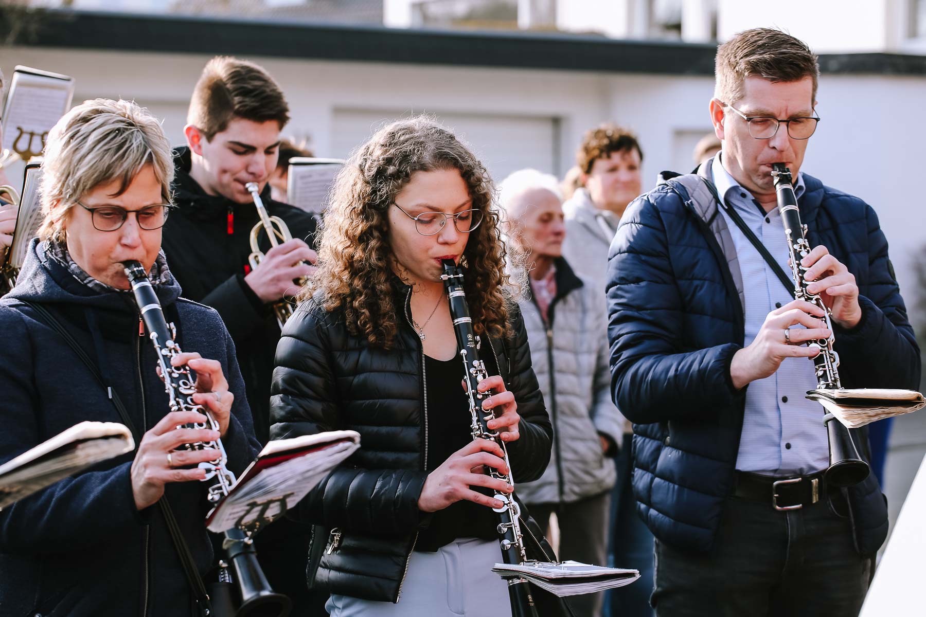 begleitet. Nach einer schönen Trauung, warteten die Gäste draußen schon mit einem selbstgebastelten heißen Draht auf das Brautpaar, das diese erste Aufgabe gemeinsam meistern musste. Anschließend wurde laut musiziert und beglückwünscht. Da die Kirche direkt neben der Schützenhalle lag, in der die Feier stattfand, konnten wir direkt nach nebenan gehen. Dort wartete ein leckeres Kuchenbuffet und die Hochzeitstorte auf das Brautpaar und die Gäste. Später machten wir dann noch ein paar Gruppenfotos.