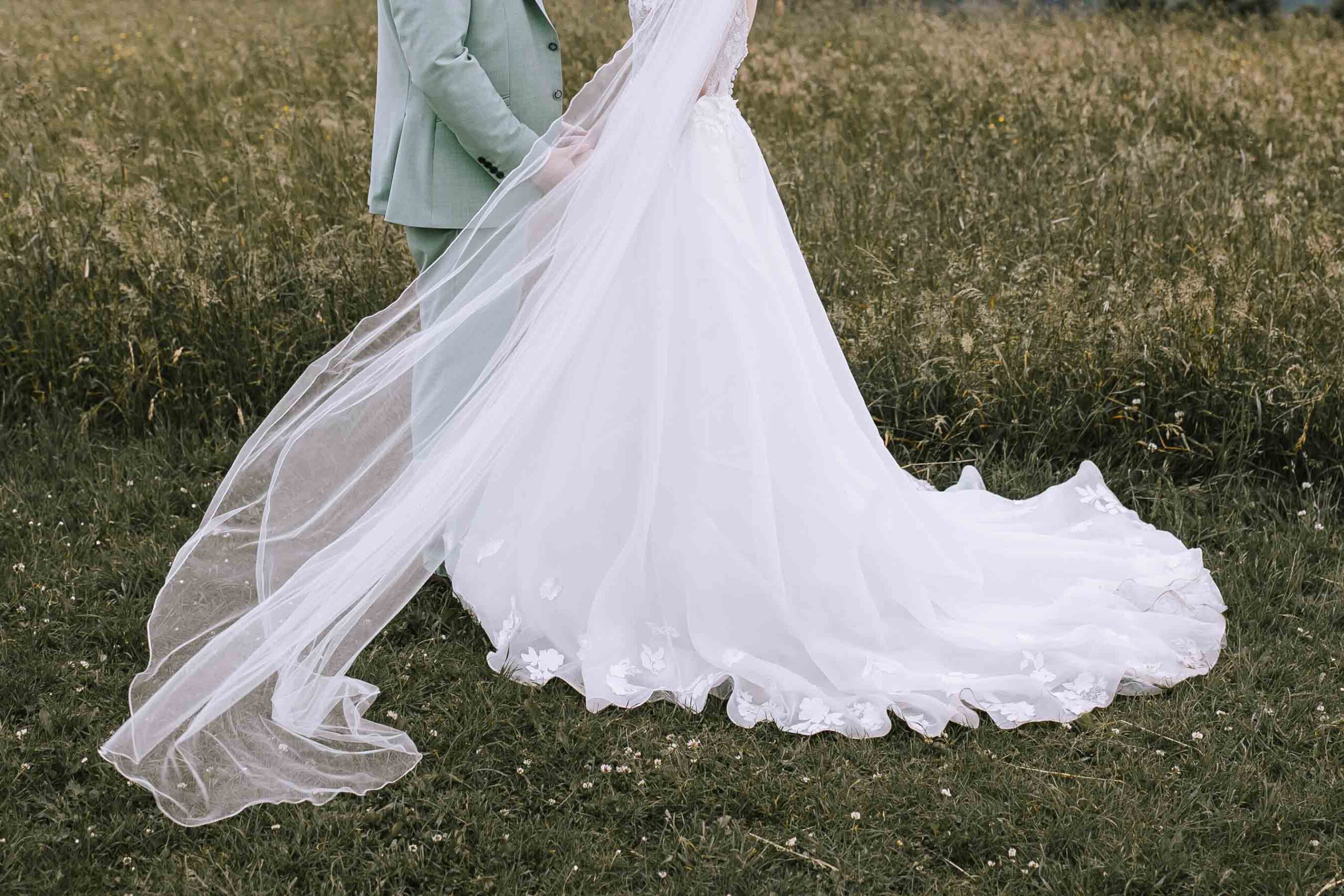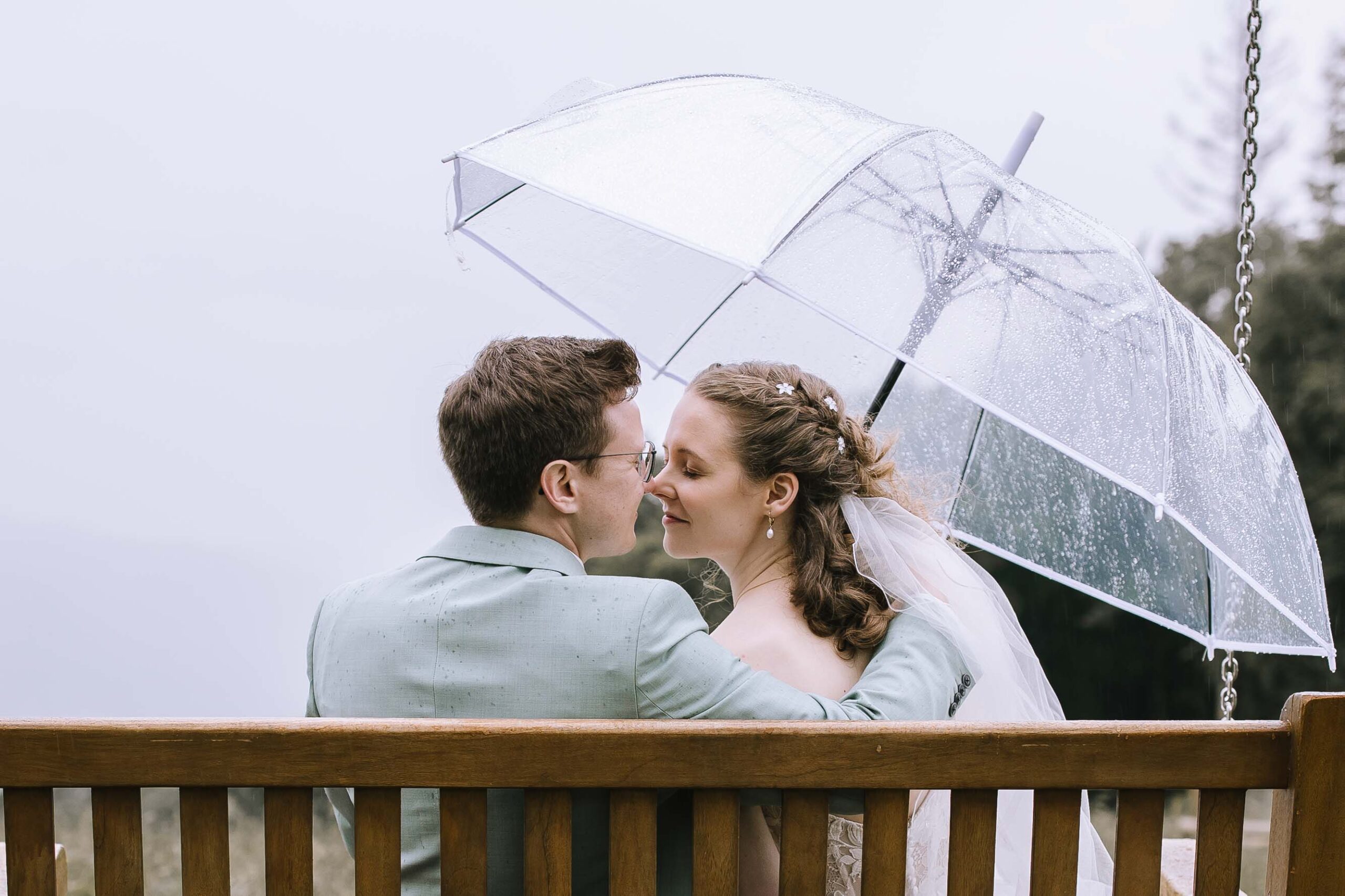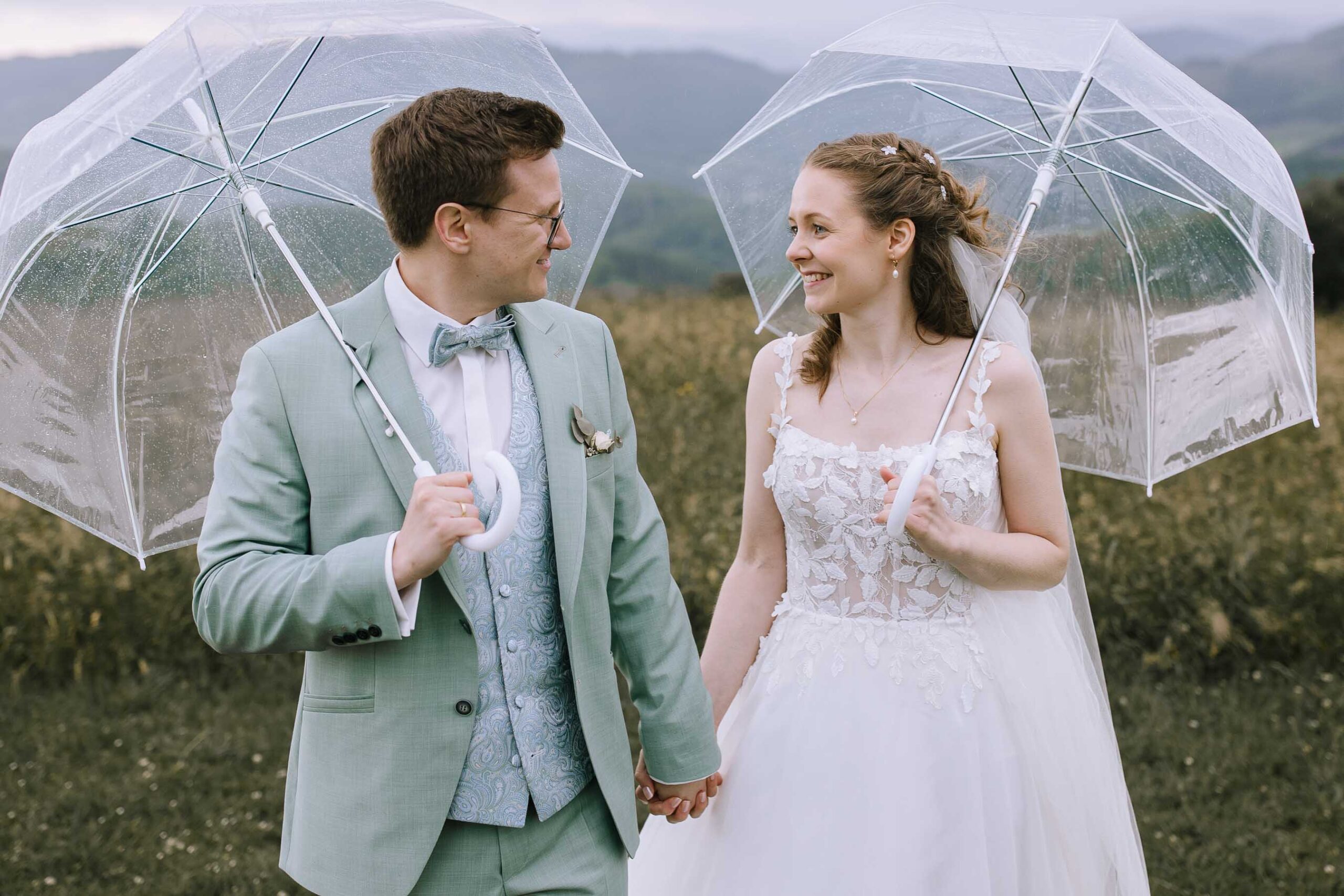 Natürlich wollte ich den Tag auch mit einem Brautpaarshooting auf der großen Wiese neben der Steinbergs Alm ausklingen lassen. Der Ausblick war einfach der Wahnsinn! Leider ließ der Regen nicht lange auf sich warten, aber anstatt uns davon ärgern zu lassen, machten wir das Beste draus! Wir nahmen die Schirme, die wir immer dabei hatten, und bauten sie einfach in die Bilder ein. Das brachte eine ganz besondere Stimmung in die Fotos und ich finde, dass der Regen die Bilder mit einer gewissen Romantik und Authentizität bereichert hat. Es war ein tolles Shooting. Nach dem Brautpaarshooting ging es zurück in die Location, wo das Team von Steinbergs Alm ein köstliches Buffet mit einer großen Auswahl an Speisen – auch veganen Speisen – für die Gäste zubereitet hatte. Die Hochzeit von Lara und Chris war ein Fest der Liebe, der Musik und der guten Laune. Es war ein wunderschöner Tag, den ich als Hochzeitsfotografin in vollen Zügen genossen habe. Ich freue mich jetzt schon auf die nächste Hochzeit auf Steinbergs Alm. Vielleicht dann mit etwas mehr Sonne auf der Wiese und einer freien Trauung – wer weiß. 🙂
