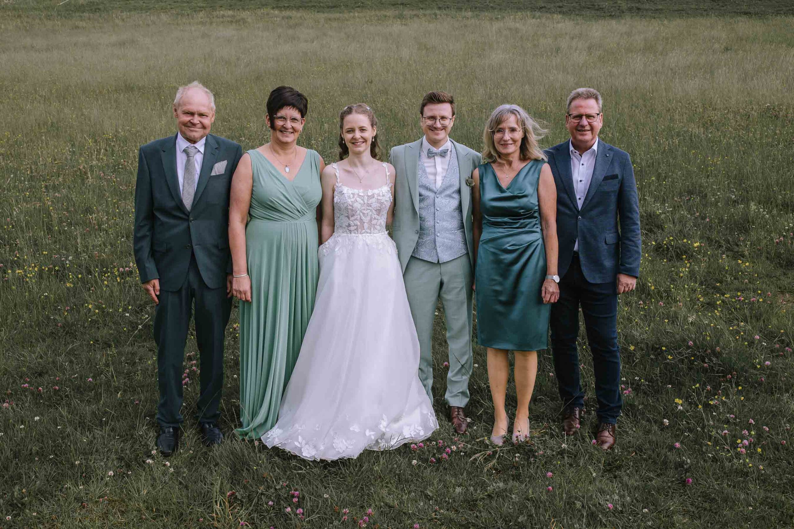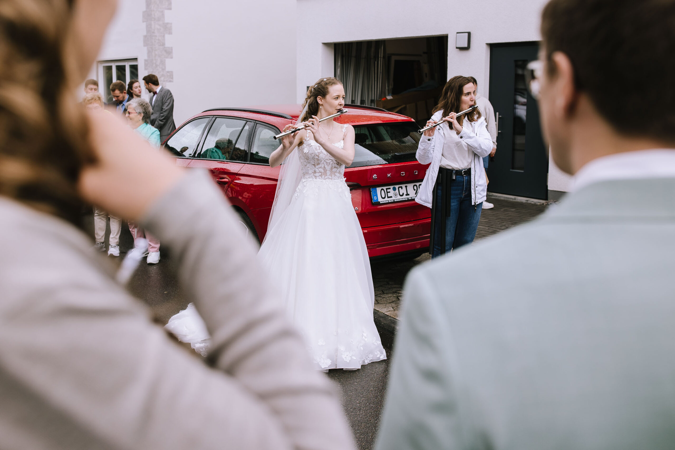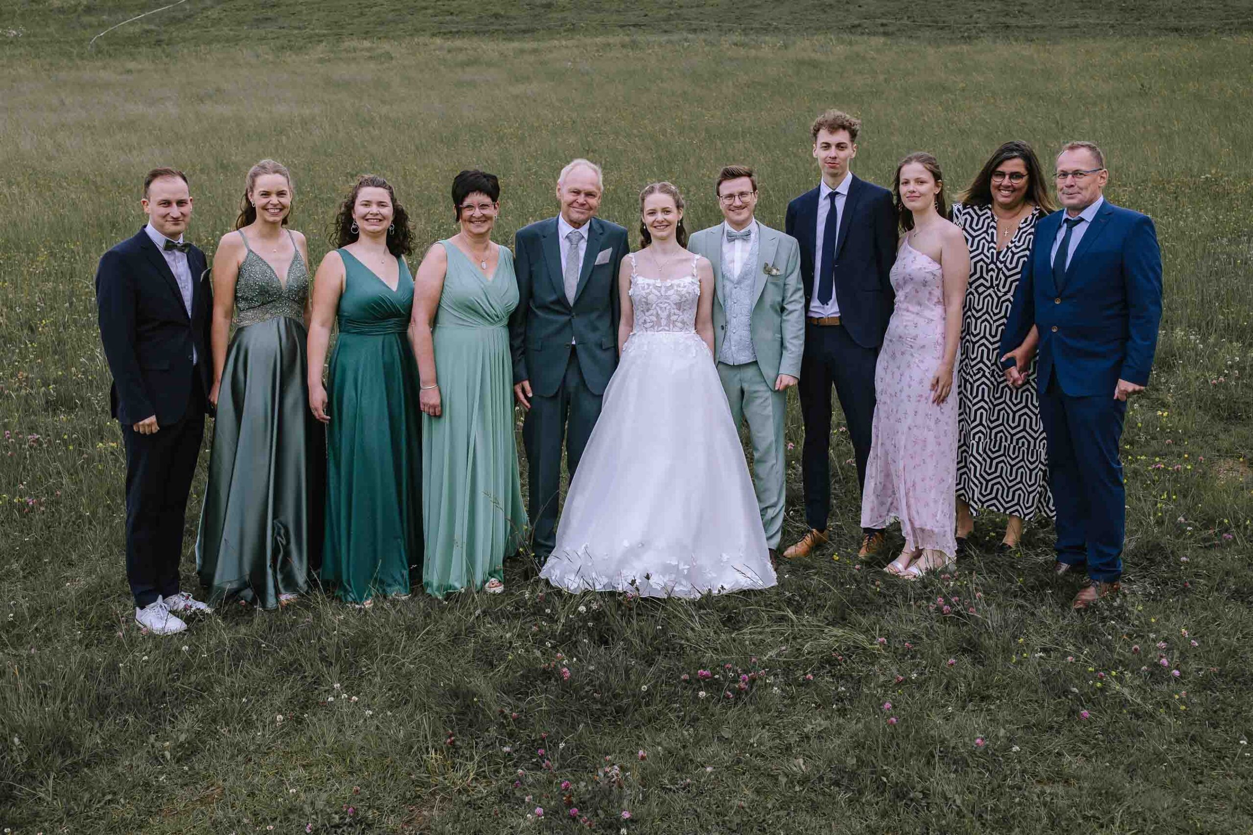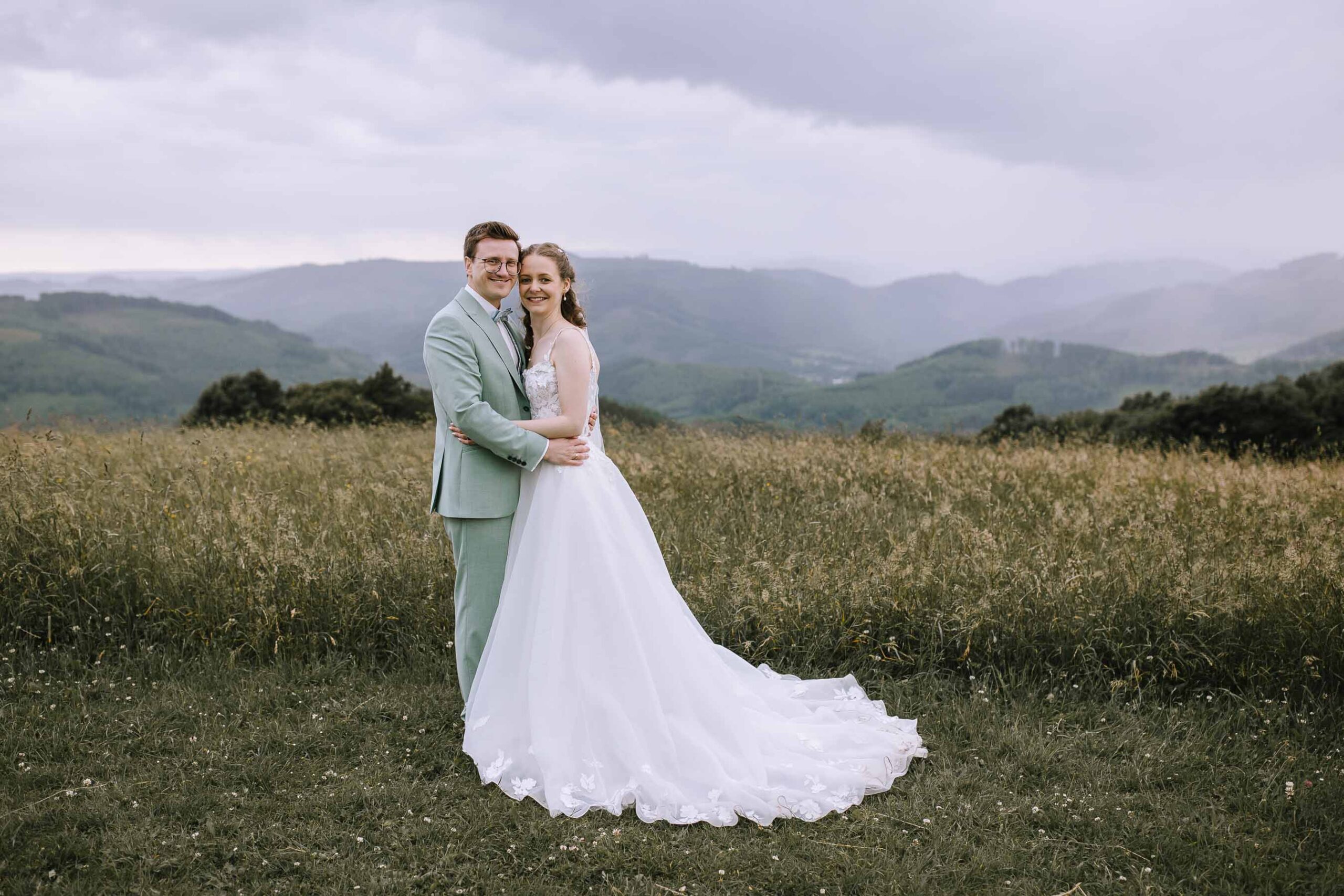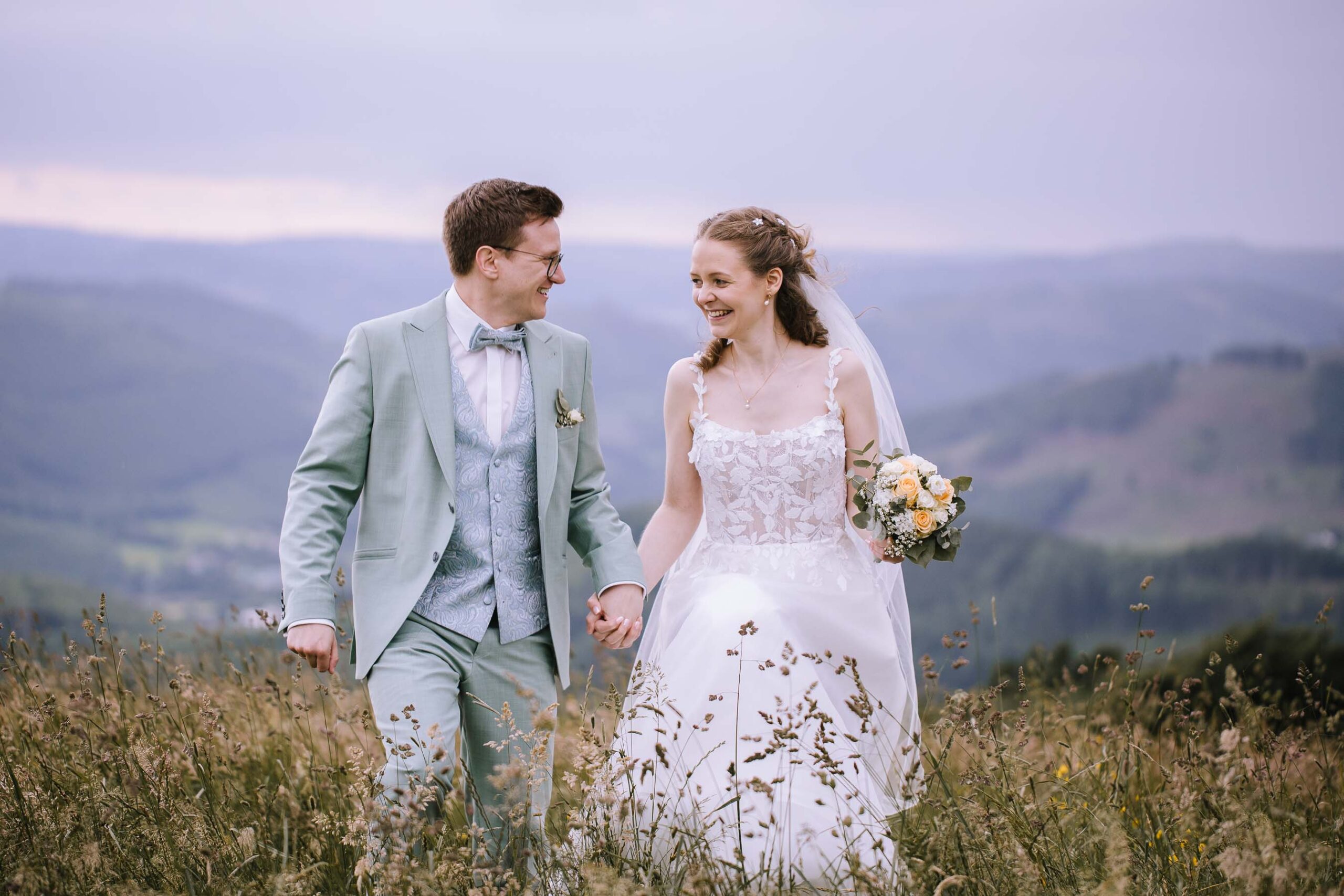 Es gibt Hochzeiten, bei denen die Chemie zwischen Brautpaar und Fotografin sofort stimmt – und die Hochzeit von Lara und Chris war definitiv eine davon. Bei unserem ersten Gespräch, das bei lecker Pizza & Pasta stattfand, hatte ich sofort das Gefühl, dass die beiden die perfekten Kunden für mich sind. Besonders Chris‘ flacher Humor sorgte bereits beim Vorgespräch für zahlreiche Lacher. Lara und Chris entschieden sich dafür, ihren First Look ganz intim im Garten von Laras Eltern stattfinden zu lassen. Der Plan war, sich im Garten zu treffen und diesen besonderen Moment zu genießen, doch der Himmel zog schnell zu, und dunkle Wolken deuteten bereits auf einen Regenschauer hin. Natürlich ließen wir uns davon nicht die Stimmung verderben. Die Trauzeugen und Freunde hatten bereits Schirme parat, und so war der First Look trotzdem wunderschön. Der Regen setzte genau nach diesem Moment ein – mal wieder das perfekte Timing. Die Trauung fand in der Pfarrkirche St. Antonius in Hofolpe statt. Trotz des Wetters war der Moment einfach magisch, vor allem als Lara und Chris nach der Trauung von einem Musikverein, in dem Lara selbst spielte, mit lauter Musik empfangen wurden. Das war ein absolutes Highlight und als Lara sich sogar noch einmal ein Instrument schnappte, um mitzuspielen, war das für alle ein unvergesslicher Moment. Nach der Kirche ging es weiter zur Hochzeitslocation Steinbergs Alm in Wildewiese. Bei einem Sektempfang mit Canapés genossen alle die festliche Stimmung. Einige Gruppenfotos und Portraits durften natürlich nicht fehlen. Das Wetter zeigte sich immer noch unentschlossen, doch bei all den tollen Momenten war der Regen fast nebensächlich. Die Location war einmal mehr ein Traum – mit einer grandiosen Aussicht auf das „Land der 1000 Berge“ und einer Atmosphäre, die nicht zu übertreffen war.