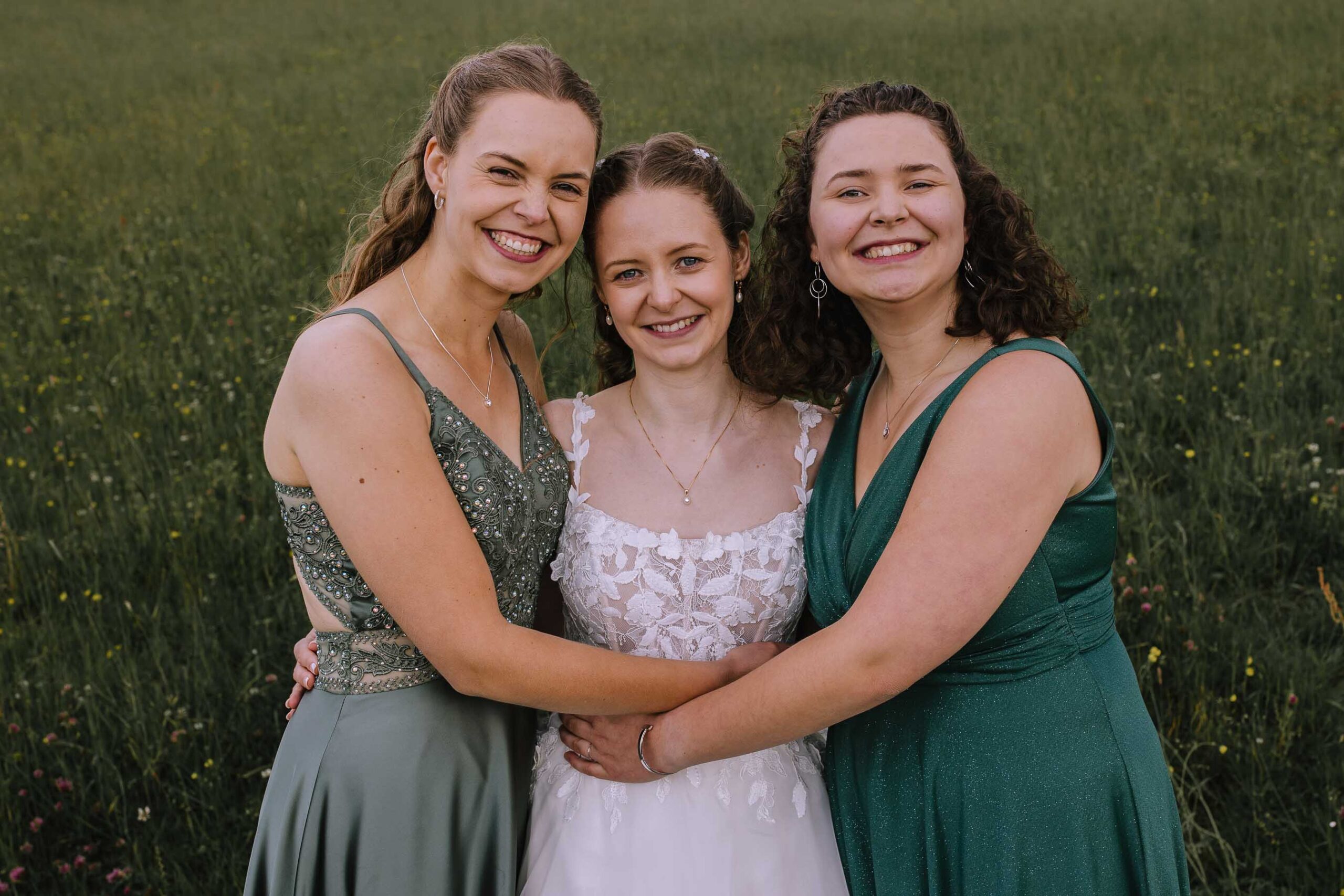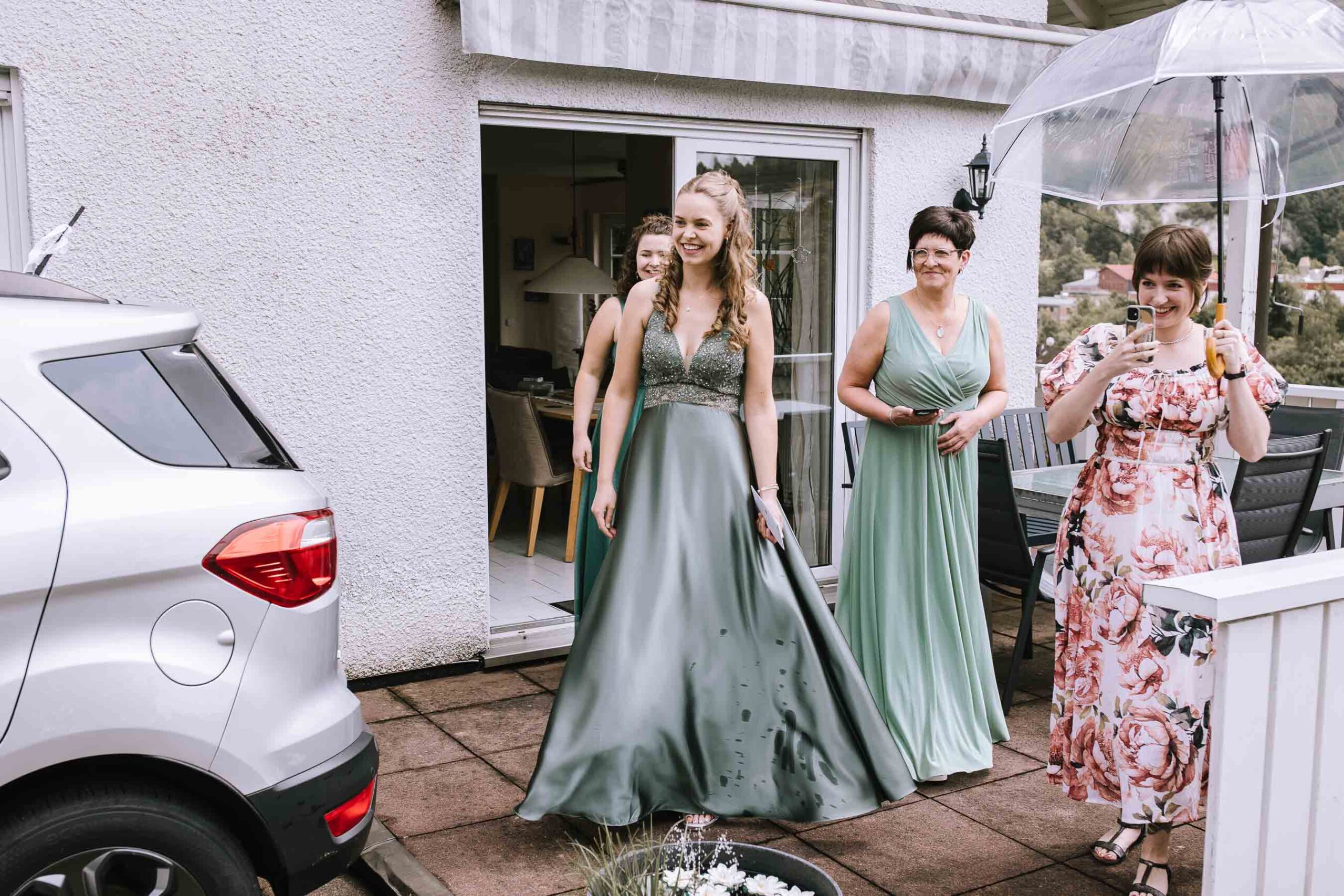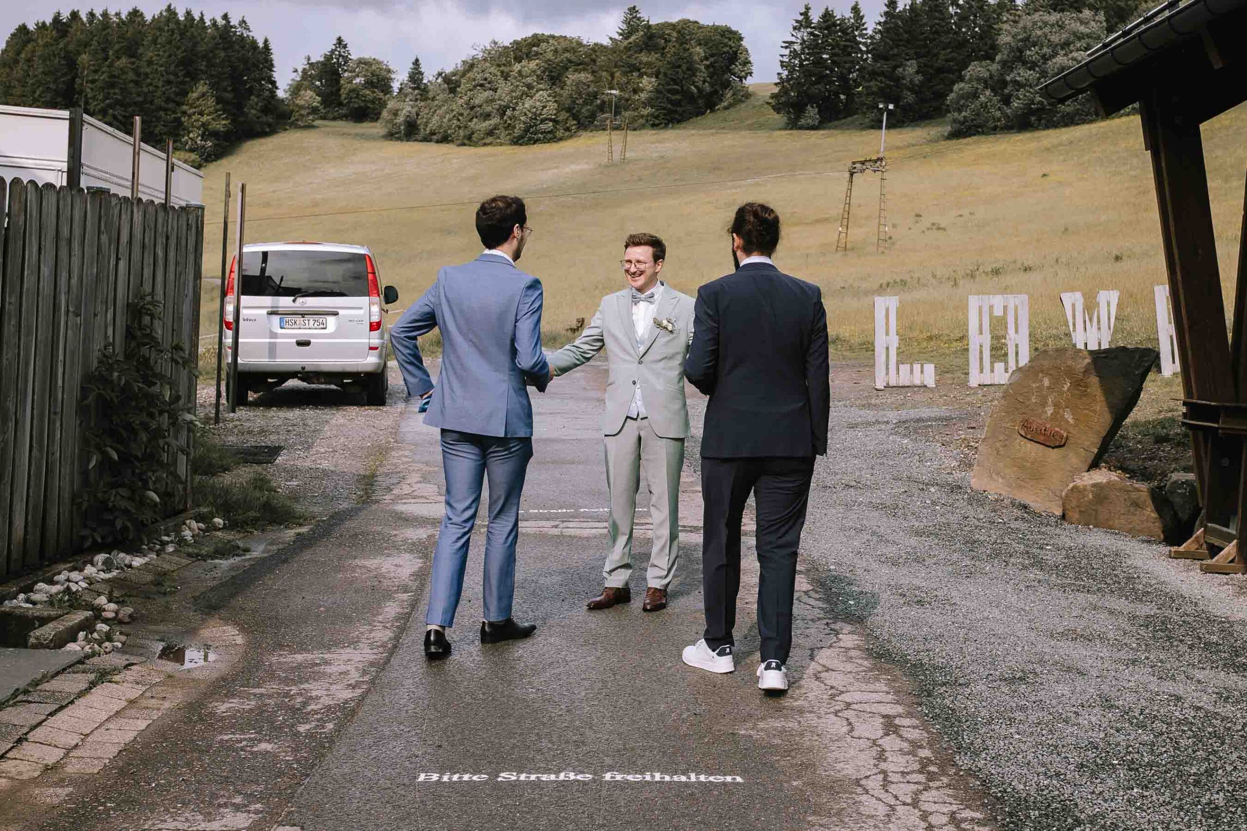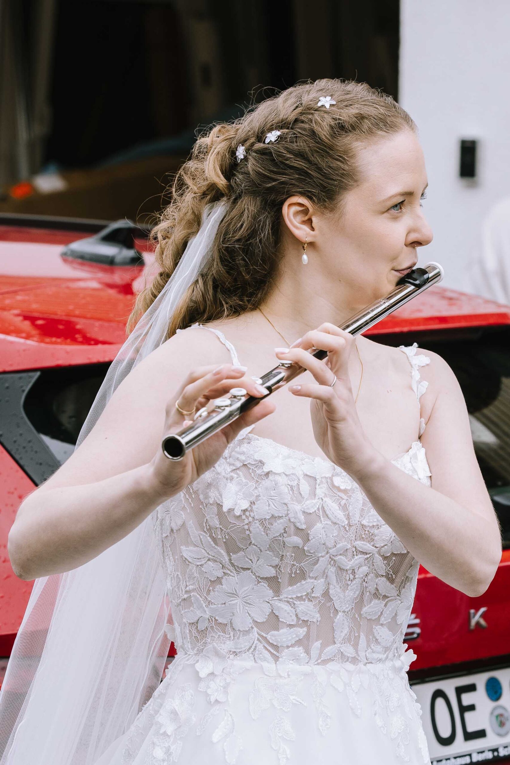 Es gibt Hochzeiten, bei denen die Chemie zwischen Brautpaar und Fotografin sofort stimmt – und die Hochzeit von Lara und Chris war definitiv eine davon. Bei unserem ersten Gespräch, das bei lecker Pizza & Pasta stattfand, hatte ich sofort das Gefühl, dass die beiden die perfekten Kunden für mich sind. Besonders Chris‘ flacher Humor sorgte bereits beim Vorgespräch für zahlreiche Lacher. Lara und Chris entschieden sich dafür, ihren First Look ganz intim im Garten von Laras Eltern stattfinden zu lassen. Der Plan war, sich im Garten zu treffen und diesen besonderen Moment zu genießen, doch der Himmel zog schnell zu, und dunkle Wolken deuteten bereits auf einen Regenschauer hin. Natürlich ließen wir uns davon nicht die Stimmung verderben. Die Trauzeugen und Freunde hatten bereits Schirme parat, und so war der First Look trotzdem wunderschön. Der Regen setzte genau nach diesem Moment ein – mal wieder das perfekte Timing. Die Trauung fand in der Pfarrkirche St. Antonius in Hofolpe statt. Trotz des Wetters war der Moment einfach magisch, vor allem als Lara und Chris nach der Trauung von einem Musikverein, in dem Lara selbst spielte, mit lauter Musik empfangen wurden. Das war ein absolutes Highlight und als Lara sich sogar noch einmal ein Instrument schnappte, um mitzuspielen, war das für alle ein unvergesslicher Moment. Nach der Kirche ging es weiter zur Hochzeitslocation Steinbergs Alm in Wildewiese. Bei einem Sektempfang mit Canapés genossen alle die festliche Stimmung. Einige Gruppenfotos und Portraits durften natürlich nicht fehlen. Das Wetter zeigte sich immer noch unentschlossen, doch bei all den tollen Momenten war der Regen fast nebensächlich. Die Location war einmal mehr ein Traum – mit einer grandiosen Aussicht auf das „Land der 1000 Berge“ und einer Atmosphäre, die nicht zu übertreffen war.