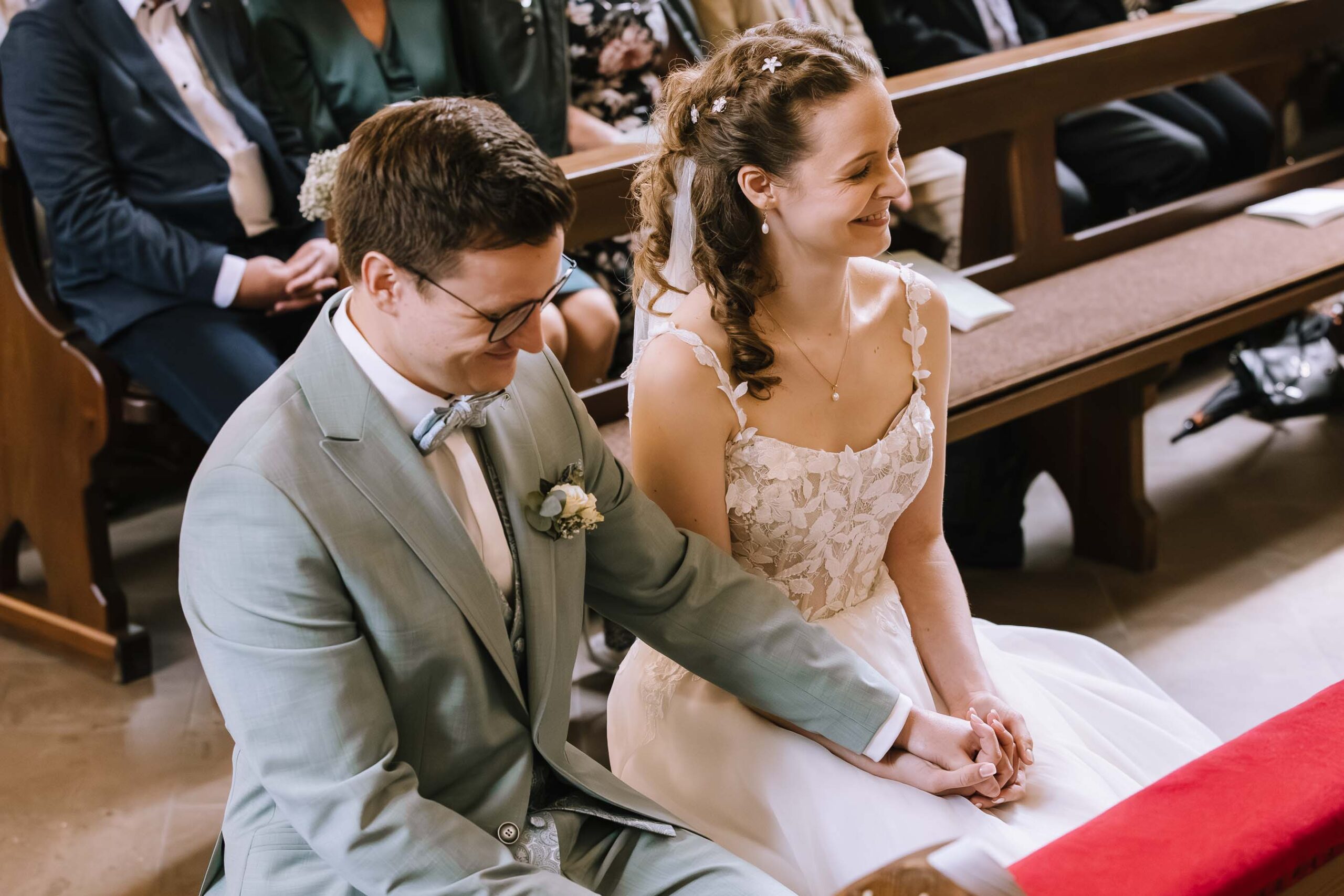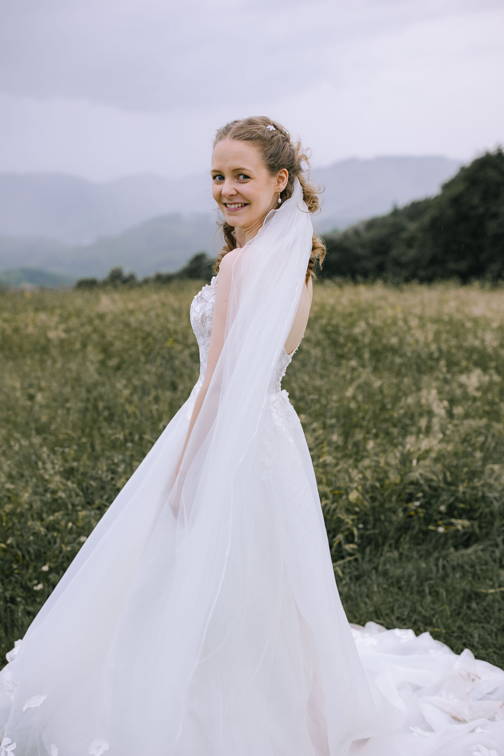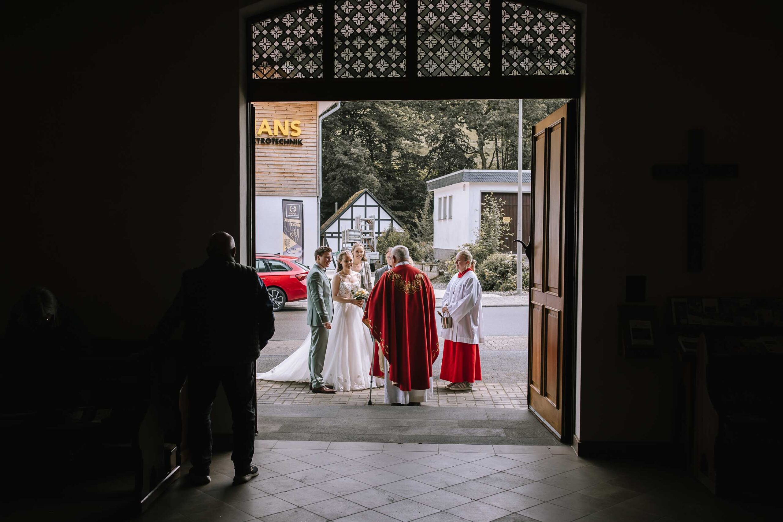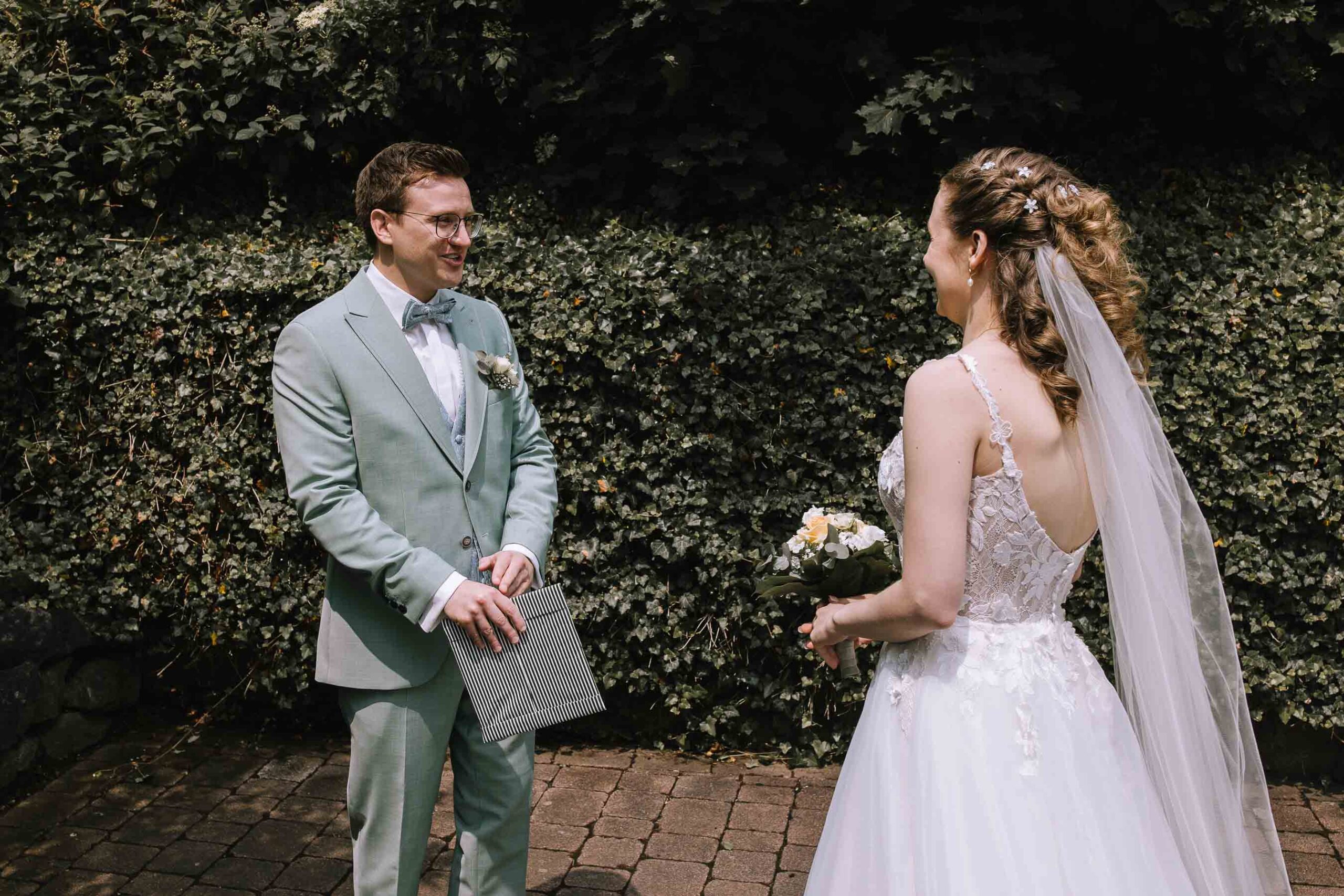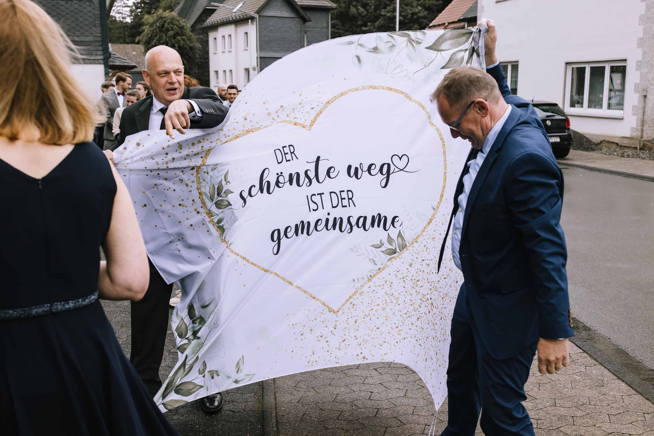 Es gibt Hochzeiten, bei denen die Chemie zwischen Brautpaar und Fotografin sofort stimmt – und die Hochzeit von Lara und Chris war definitiv eine davon. Bei unserem ersten Gespräch, das bei lecker Pizza & Pasta stattfand, hatte ich sofort das Gefühl, dass die beiden die perfekten Kunden für mich sind. Besonders Chris‘ flacher Humor sorgte bereits beim Vorgespräch für zahlreiche Lacher. Lara und Chris entschieden sich dafür, ihren First Look ganz intim im Garten von Laras Eltern stattfinden zu lassen. Der Plan war, sich im Garten zu treffen und diesen besonderen Moment zu genießen, doch der Himmel zog schnell zu, und dunkle Wolken deuteten bereits auf einen Regenschauer hin. Natürlich ließen wir uns davon nicht die Stimmung verderben. Die Trauzeugen und Freunde hatten bereits Schirme parat, und so war der First Look trotzdem wunderschön. Der Regen setzte genau nach diesem Moment ein – mal wieder das perfekte Timing. Die Trauung fand in der Pfarrkirche St. Antonius in Hofolpe statt. Trotz des Wetters war der Moment einfach magisch, vor allem als Lara und Chris nach der Trauung von einem Musikverein, in dem Lara selbst spielte, mit lauter Musik empfangen wurden. Das war ein absolutes Highlight und als Lara sich sogar noch einmal ein Instrument schnappte, um mitzuspielen, war das für alle ein unvergesslicher Moment. Nach der Kirche ging es weiter zur Hochzeitslocation Steinbergs Alm in Wildewiese. Bei einem Sektempfang mit Canapés genossen alle die festliche Stimmung. Einige Gruppenfotos und Portraits durften natürlich nicht fehlen. Das Wetter zeigte sich immer noch unentschlossen, doch bei all den tollen Momenten war der Regen fast nebensächlich. Die Location war einmal mehr ein Traum – mit einer grandiosen Aussicht auf das „Land der 1000 Berge“ und einer Atmosphäre, die nicht zu übertreffen war.