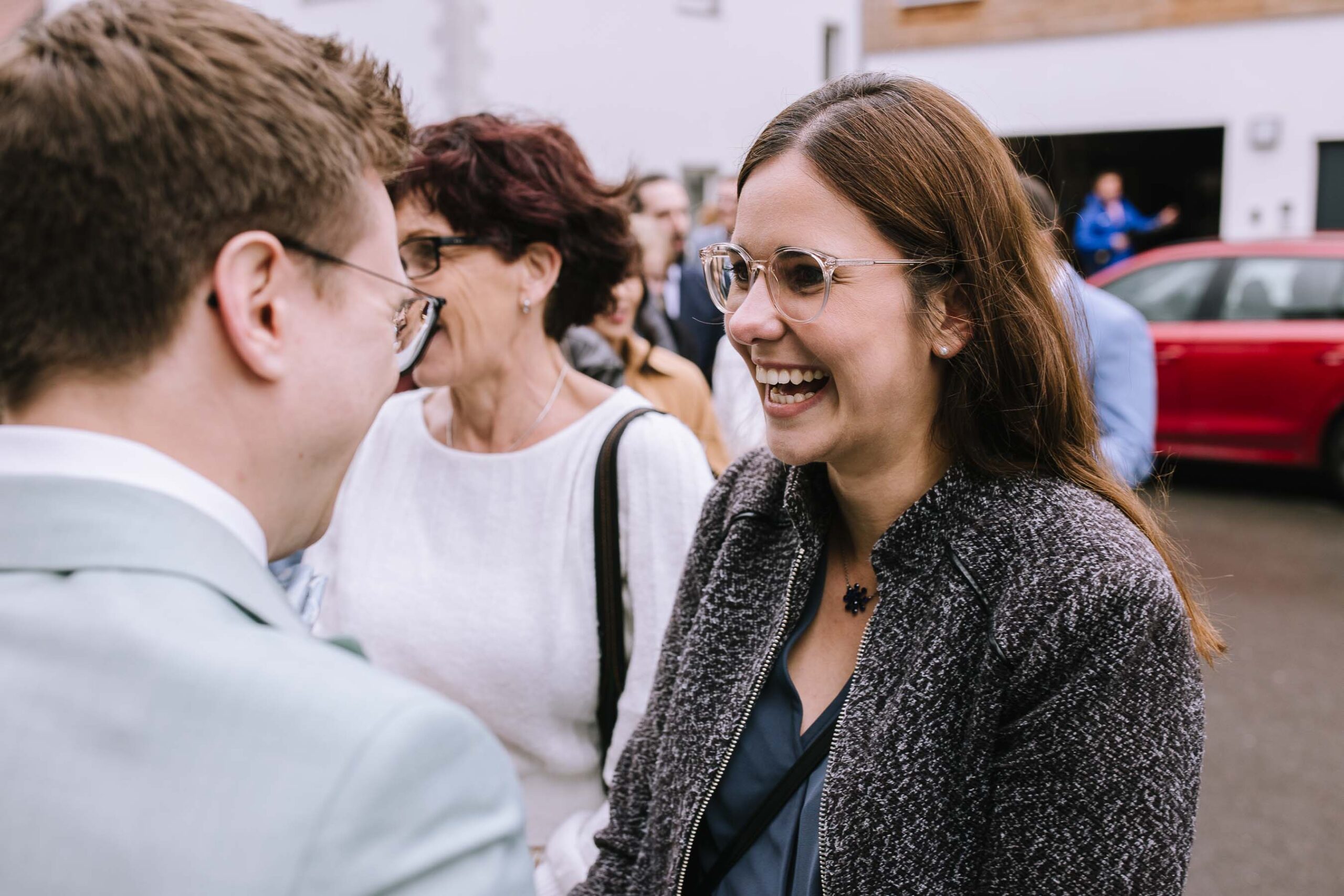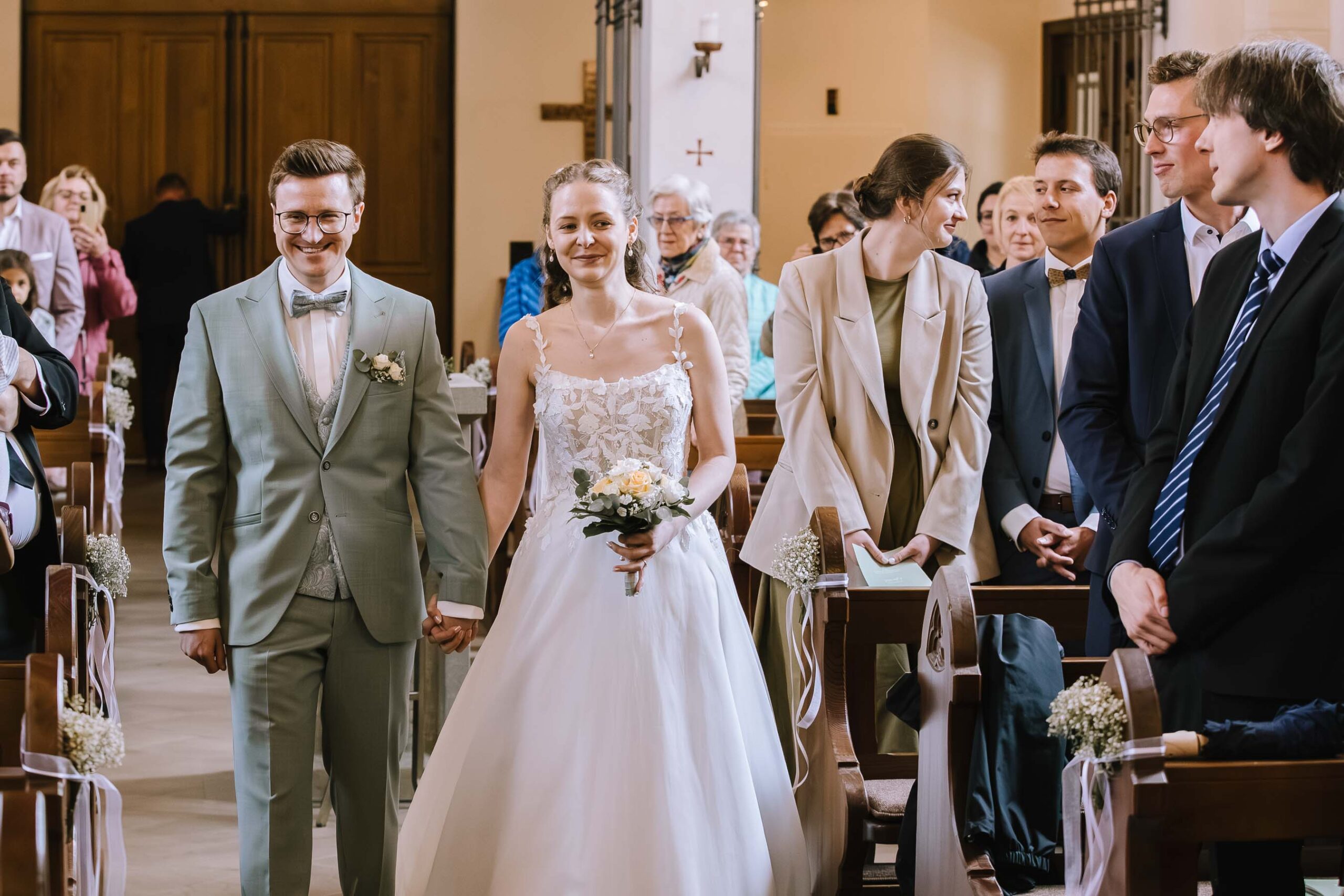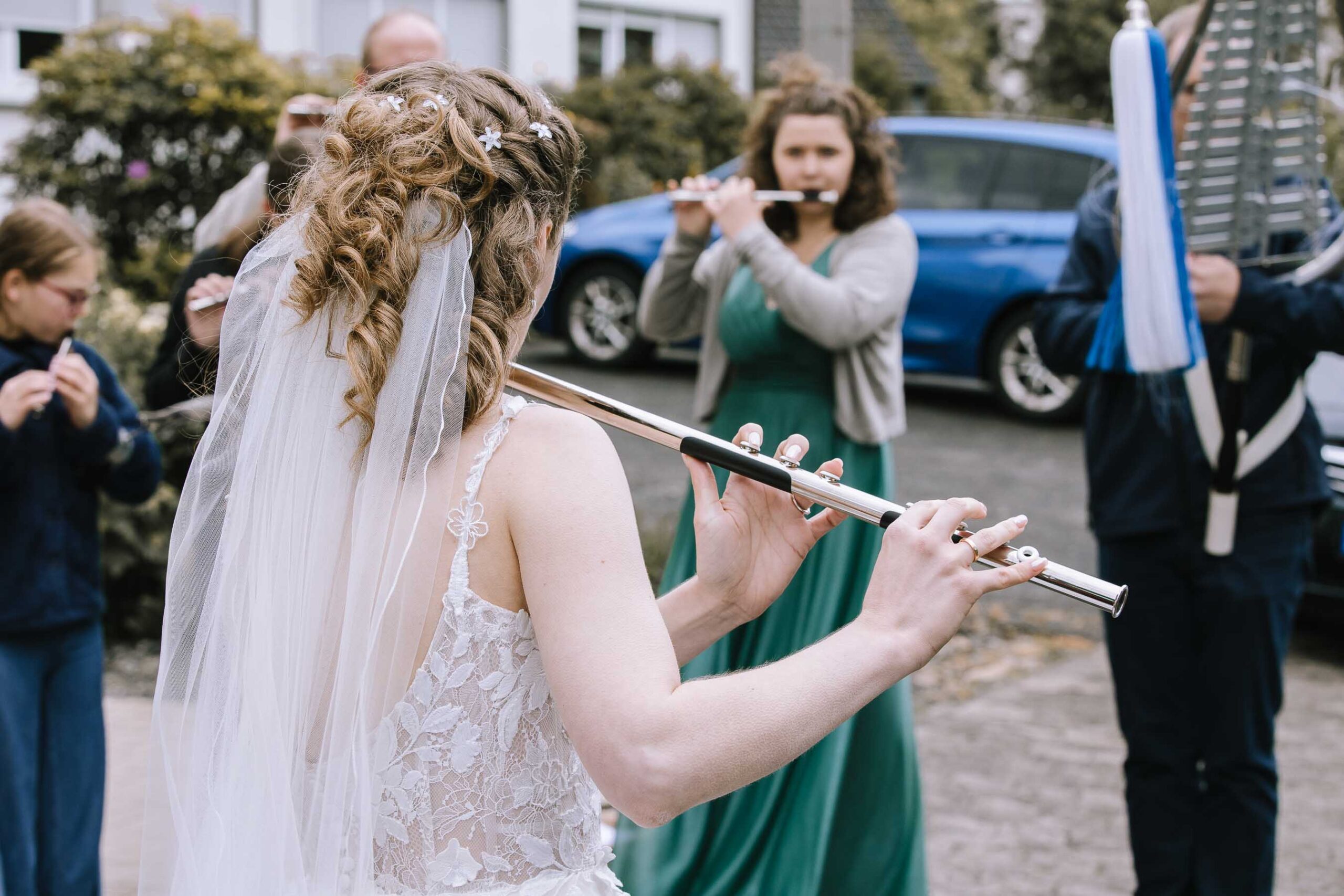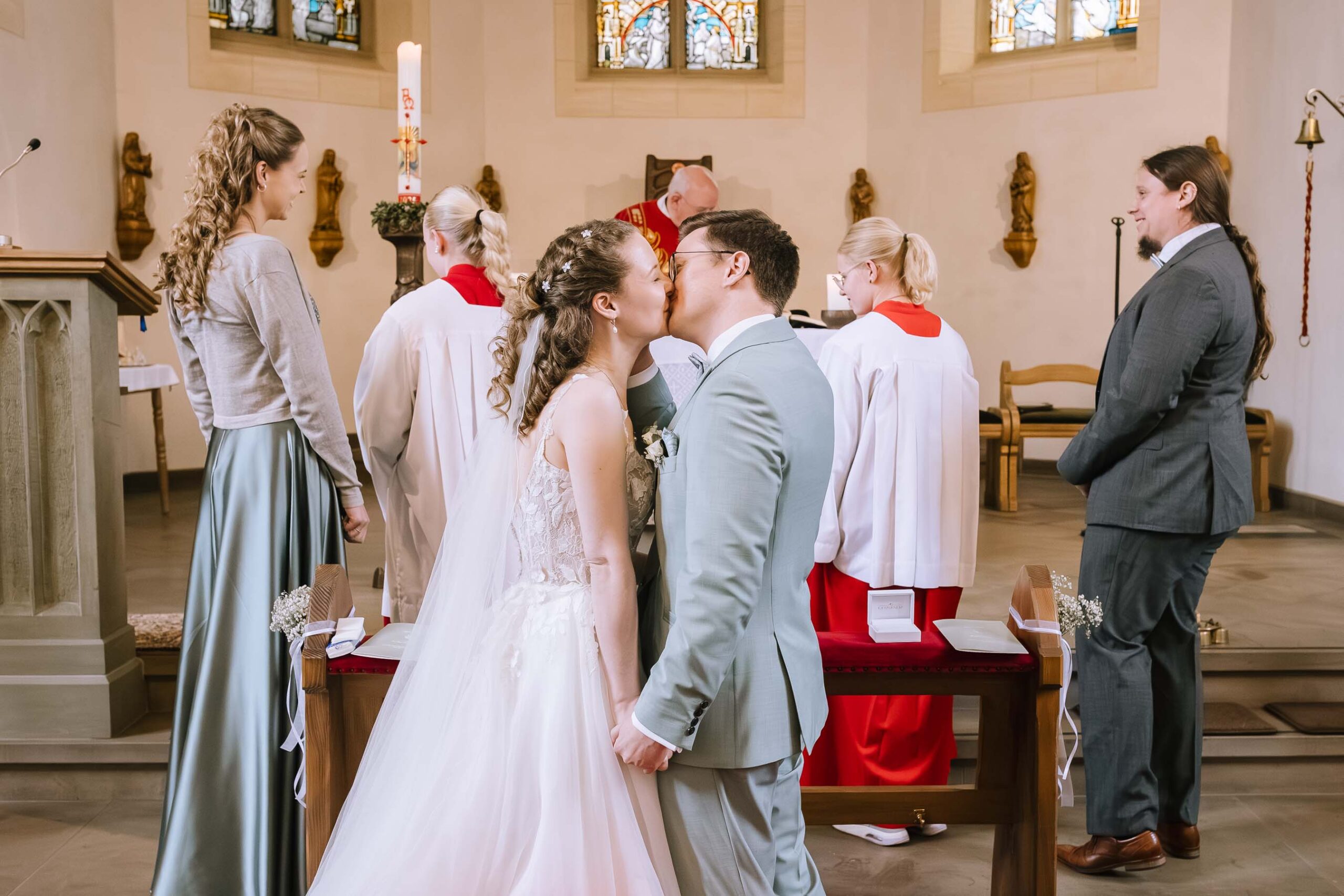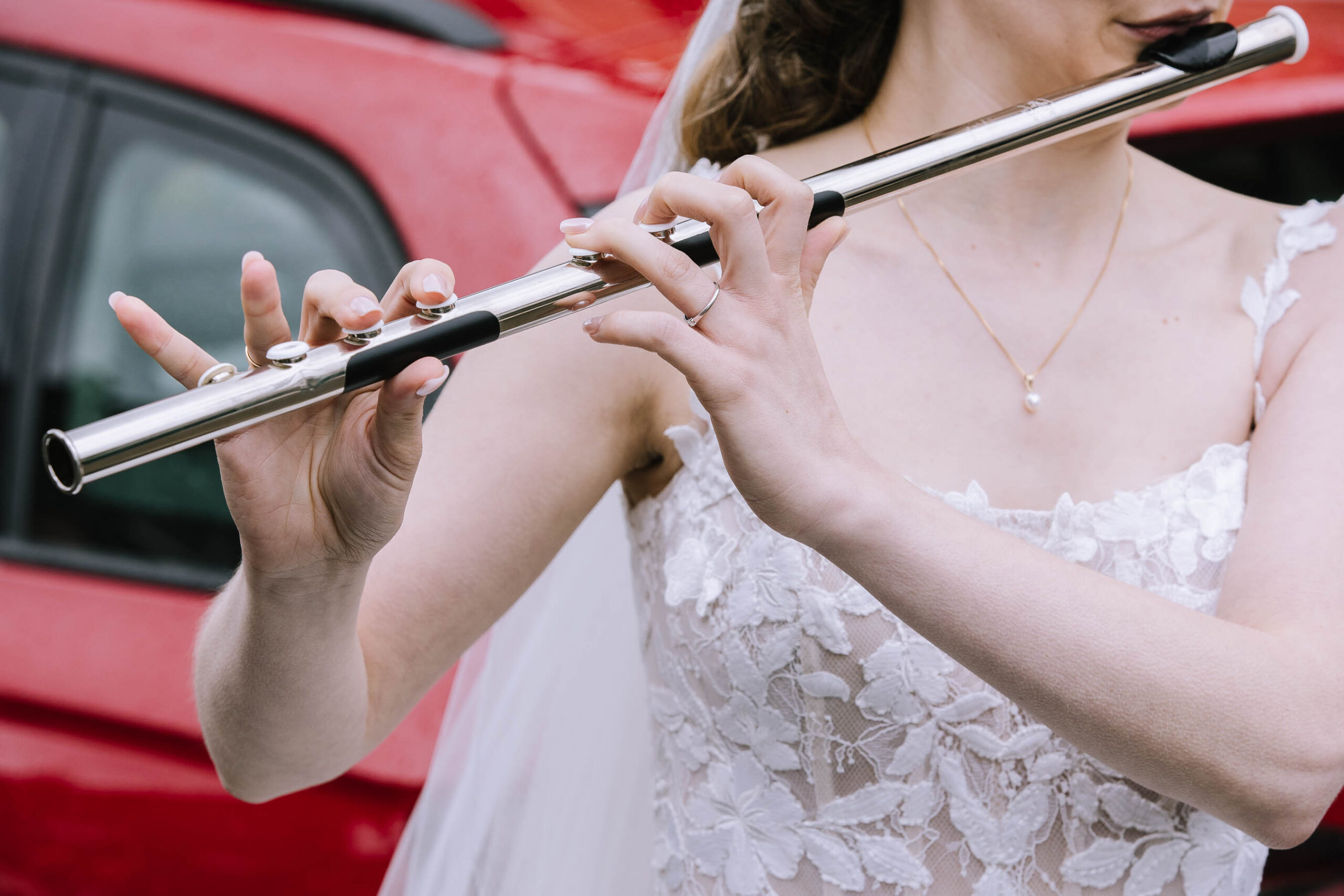 Es gibt Hochzeiten, bei denen die Chemie zwischen Brautpaar und Fotografin sofort stimmt – und die Hochzeit von Lara und Chris war definitiv eine davon. Bei unserem ersten Gespräch, das bei lecker Pizza & Pasta stattfand, hatte ich sofort das Gefühl, dass die beiden die perfekten Kunden für mich sind. Besonders Chris‘ flacher Humor sorgte bereits beim Vorgespräch für zahlreiche Lacher. Lara und Chris entschieden sich dafür, ihren First Look ganz intim im Garten von Laras Eltern stattfinden zu lassen. Der Plan war, sich im Garten zu treffen und diesen besonderen Moment zu genießen, doch der Himmel zog schnell zu, und dunkle Wolken deuteten bereits auf einen Regenschauer hin. Natürlich ließen wir uns davon nicht die Stimmung verderben. Die Trauzeugen und Freunde hatten bereits Schirme parat, und so war der First Look trotzdem wunderschön. Der Regen setzte genau nach diesem Moment ein – mal wieder das perfekte Timing. Die Trauung fand in der Pfarrkirche St. Antonius in Hofolpe statt. Trotz des Wetters war der Moment einfach magisch, vor allem als Lara und Chris nach der Trauung von einem Musikverein, in dem Lara selbst spielte, mit lauter Musik empfangen wurden. Das war ein absolutes Highlight und als Lara sich sogar noch einmal ein Instrument schnappte, um mitzuspielen, war das für alle ein unvergesslicher Moment. Nach der Kirche ging es weiter zur Hochzeitslocation Steinbergs Alm in Wildewiese. Bei einem Sektempfang mit Canapés genossen alle die festliche Stimmung. Einige Gruppenfotos und Portraits durften natürlich nicht fehlen. Das Wetter zeigte sich immer noch unentschlossen, doch bei all den tollen Momenten war der Regen fast nebensächlich. Die Location war einmal mehr ein Traum – mit einer grandiosen Aussicht auf das „Land der 1000 Berge“ und einer Atmosphäre, die nicht zu übertreffen war.
