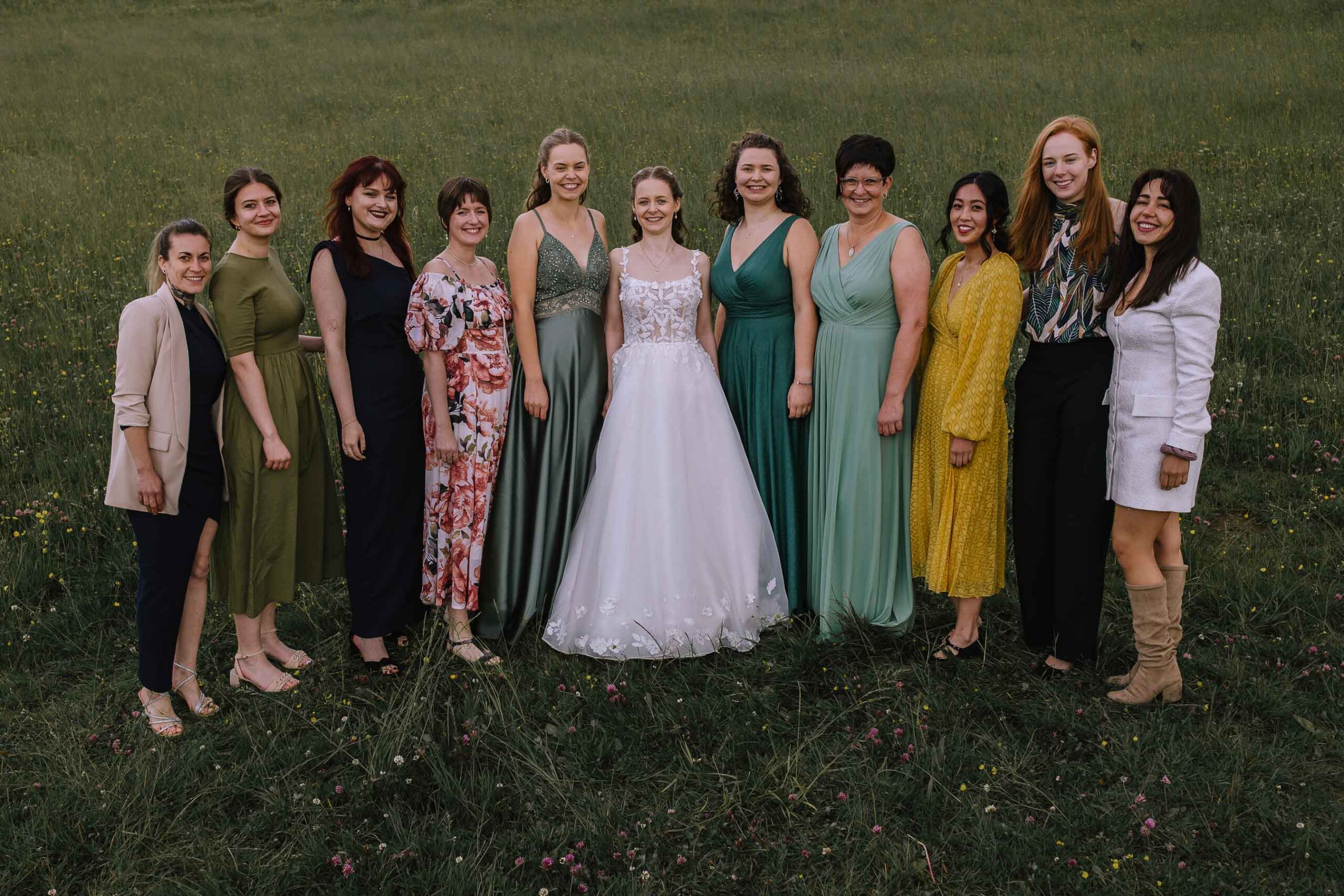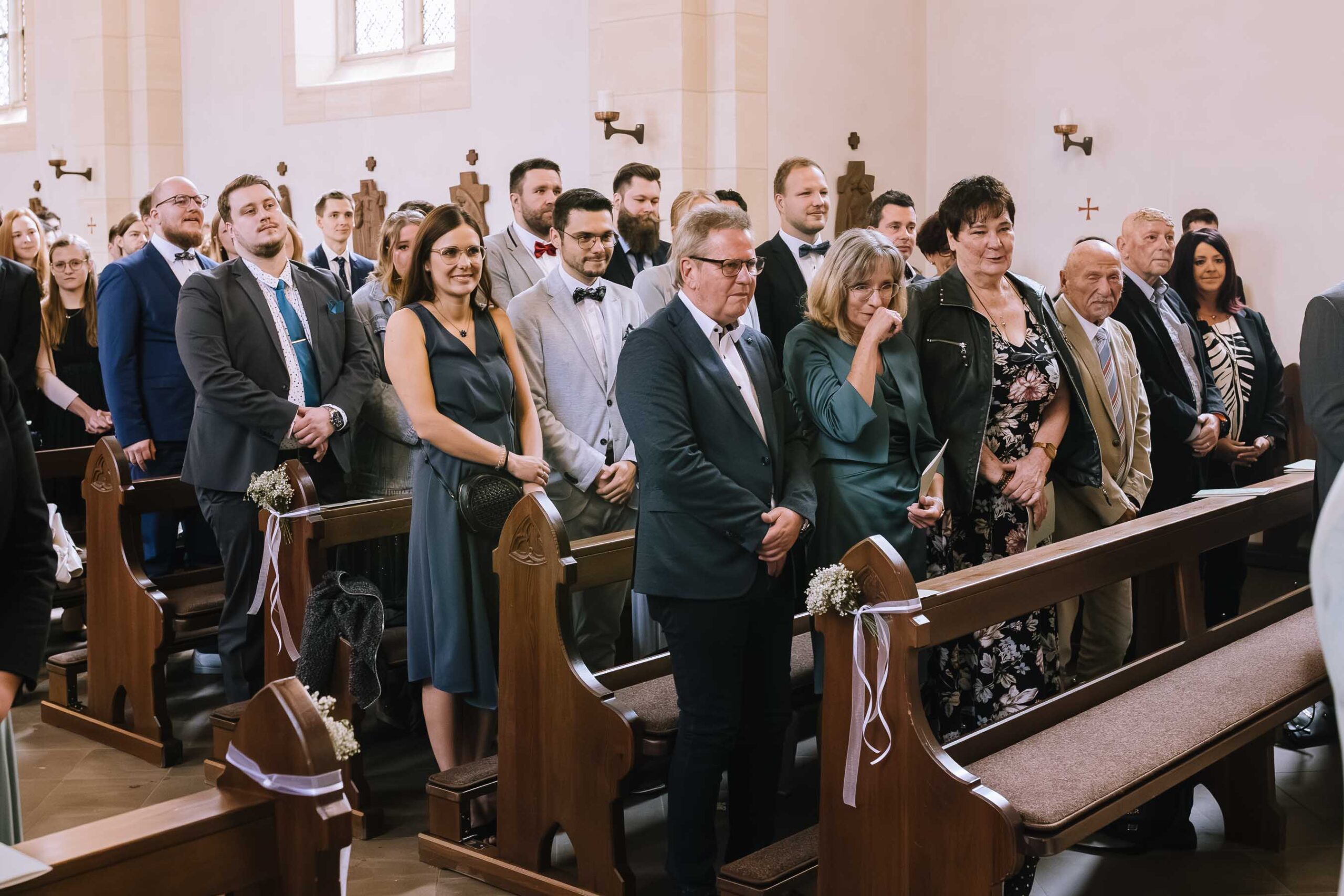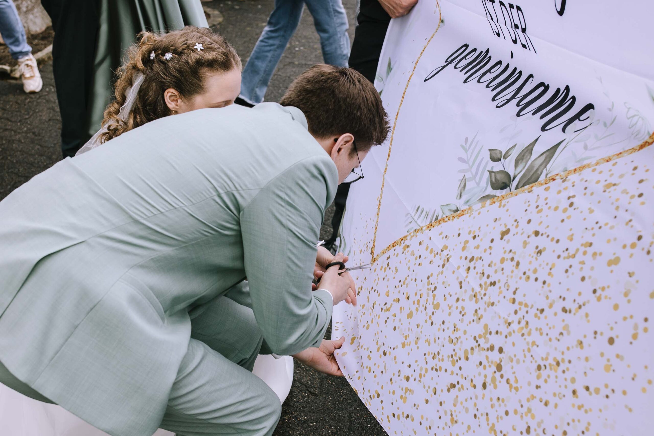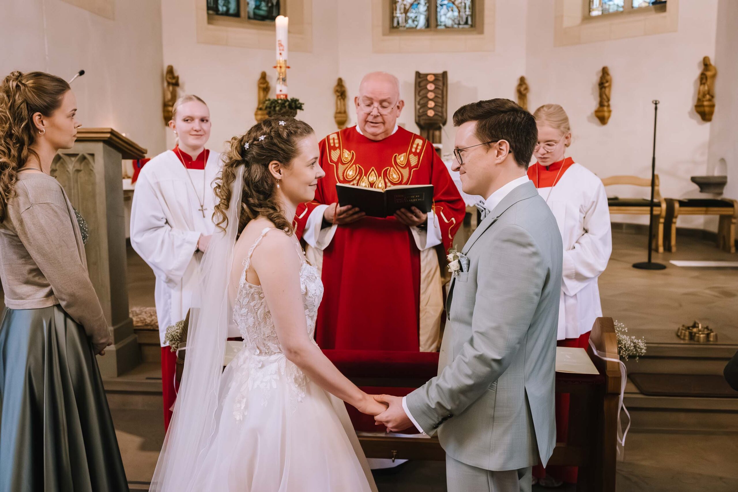 Es gibt Hochzeiten, bei denen die Chemie zwischen Brautpaar und Fotografin sofort stimmt – und die Hochzeit von Lara und Chris war definitiv eine davon. Bei unserem ersten Gespräch, das bei lecker Pizza & Pasta stattfand, hatte ich sofort das Gefühl, dass die beiden die perfekten Kunden für mich sind. Besonders Chris‘ flacher Humor sorgte bereits beim Vorgespräch für zahlreiche Lacher. Lara und Chris entschieden sich dafür, ihren First Look ganz intim im Garten von Laras Eltern stattfinden zu lassen. Der Plan war, sich im Garten zu treffen und diesen besonderen Moment zu genießen, doch der Himmel zog schnell zu, und dunkle Wolken deuteten bereits auf einen Regenschauer hin. Natürlich ließen wir uns davon nicht die Stimmung verderben. Die Trauzeugen und Freunde hatten bereits Schirme parat, und so war der First Look trotzdem wunderschön. Der Regen setzte genau nach diesem Moment ein – mal wieder das perfekte Timing. Die Trauung fand in der Pfarrkirche St. Antonius in Hofolpe statt. Trotz des Wetters war der Moment einfach magisch, vor allem als Lara und Chris nach der Trauung von einem Musikverein, in dem Lara selbst spielte, mit lauter Musik empfangen wurden. Das war ein absolutes Highlight und als Lara sich sogar noch einmal ein Instrument schnappte, um mitzuspielen, war das für alle ein unvergesslicher Moment. Nach der Kirche ging es weiter zur Hochzeitslocation Steinbergs Alm in Wildewiese. Bei einem Sektempfang mit Canapés genossen alle die festliche Stimmung. Einige Gruppenfotos und Portraits durften natürlich nicht fehlen. Das Wetter zeigte sich immer noch unentschlossen, doch bei all den tollen Momenten war der Regen fast nebensächlich. Die Location war einmal mehr ein Traum – mit einer grandiosen Aussicht auf das „Land der 1000 Berge“ und einer Atmosphäre, die nicht zu übertreffen war.