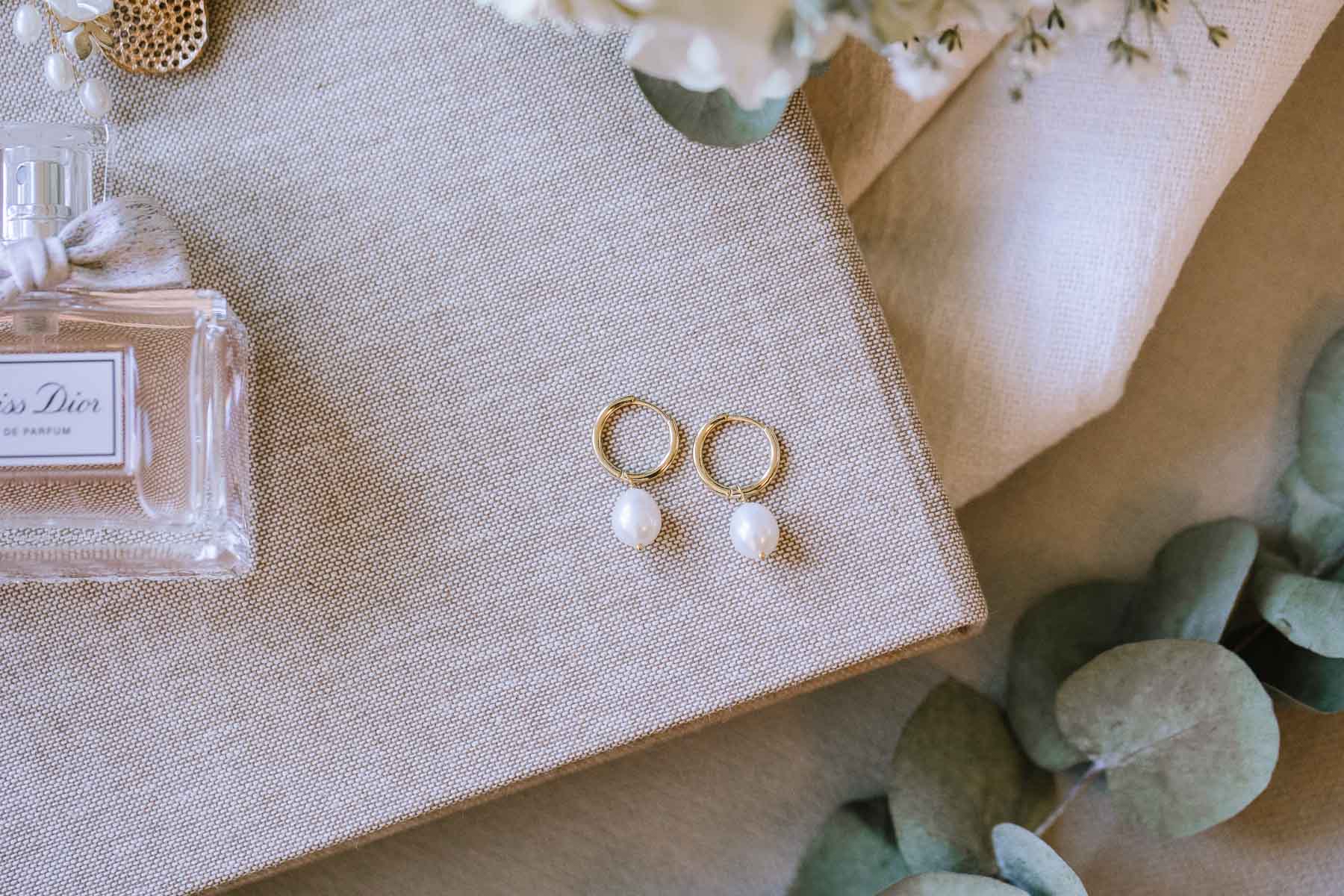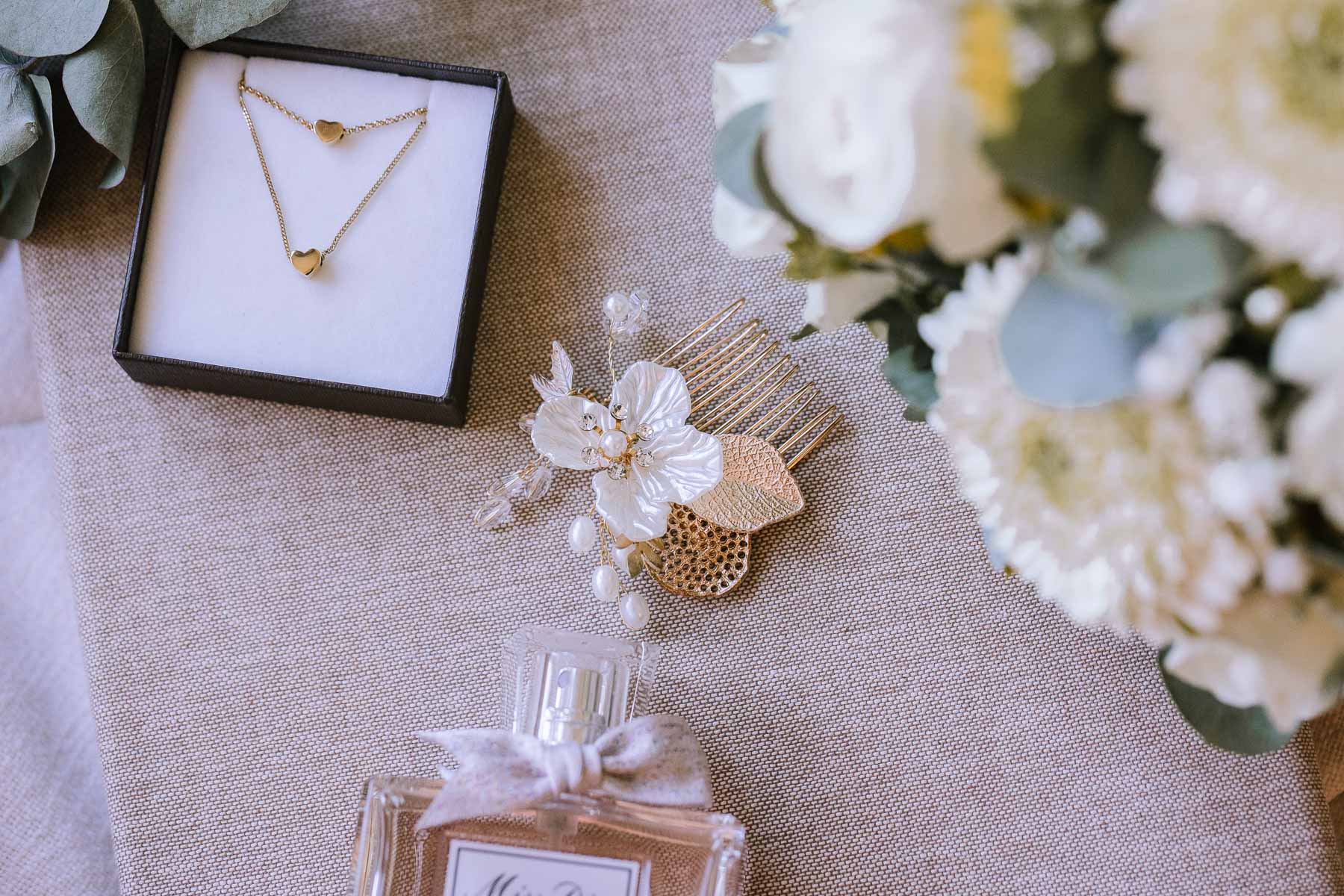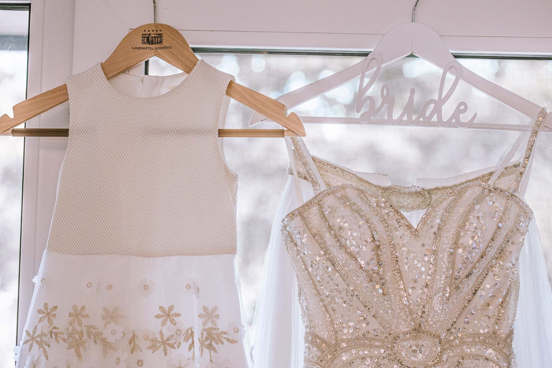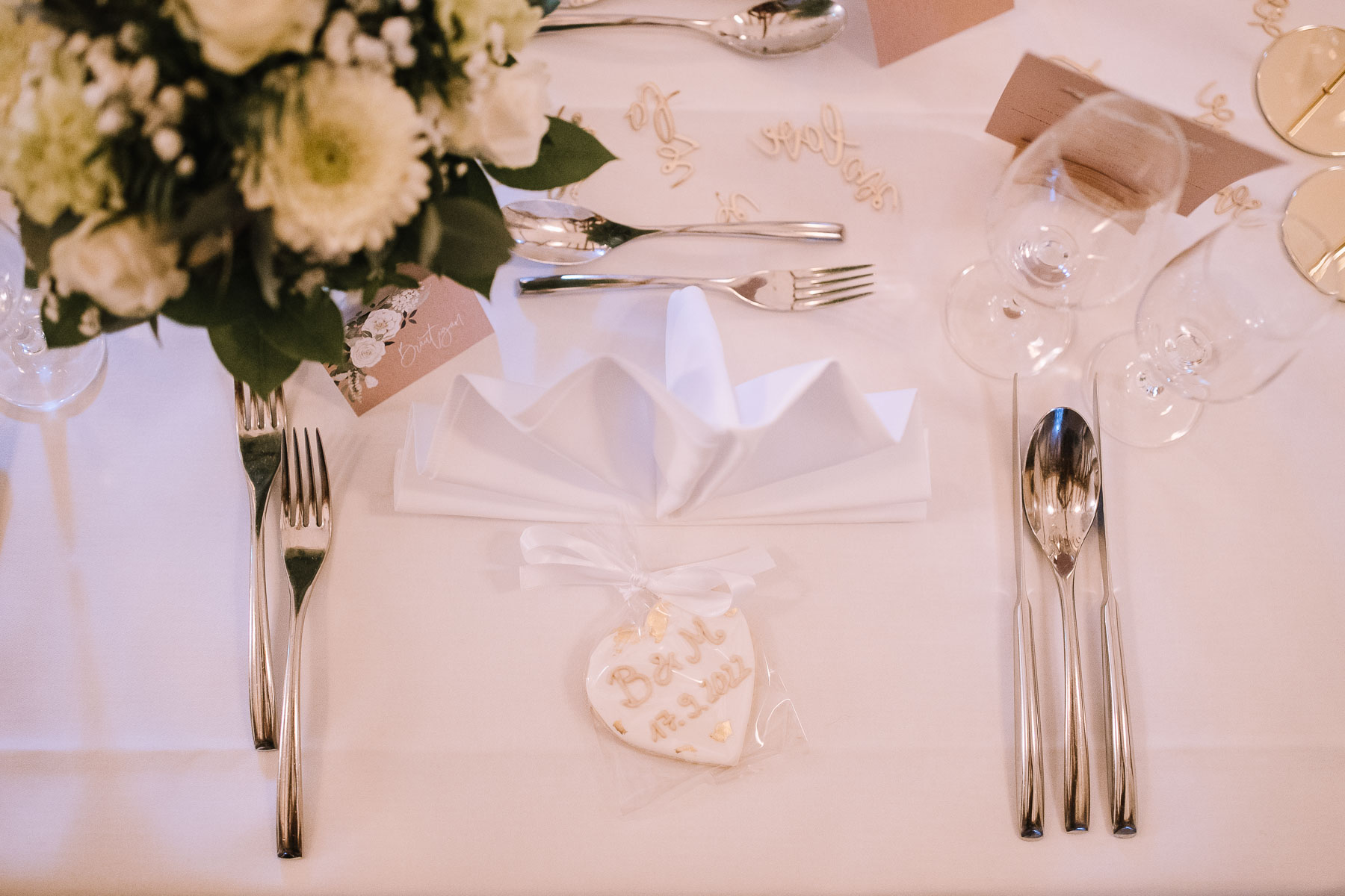 Im Frühjahr hatte ich eine Mail aus der Schweiz im Postfach – sie war von Mirjam und Ben, die sich dazu entschlossen hatten, mit ihren Lieblingsmenschen eine Destination Wedding in Deutschland zu feiern. Als Location hatten sie sich dazu das Landhotel Voshövel in Schermbeck am Niederrhein ausgesucht. Mirjam erzählte mir, dass es ihnen wichtig gewesen sei, eine Location zu haben, wo ihre Gäste sich wohlfühlten und wo sie sich vor allem auch direkt vor Ort trauen lassen können. Hierfür ist das Landhotel Voshövel mit dem Confideum, den tollen Suiten und Spabereich einfach perfekt. Neben der Champagner-Suite, die standardmäßig von Brautpaaren reserviert wird, gibt es auch noch die Füchschensuite, die Persiensuite, die Kristallsuite und die Tiffany- und Fuchsteufelswild-Suite. Hier könnt ihr euch die anderen Suites anschauen. Mirjams Getting Ready fand -wie bei meinen letzten Hochzeiten auch- in der Champagnersuite statt. Der gemütlich eingerichtete Raum mit Holz- und Goldtönen passt perfekt zu einer Herbst- und Winterhochzeit. Nachdem ich alle Details fotografiert hatte, ging ich direkt nach nebenan, wo sich Ben fertigmachte. Nach wenigen Minuten waren wir schon fertig, sodass ich mich ganz auf die Braut und die anderen anwesenden konzentrieren konnte. Mirjam hatte für alle Gäste leckere Herzkekse aus der Schweiz mitgebracht
