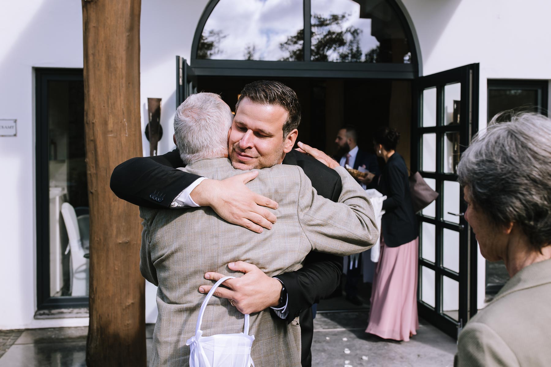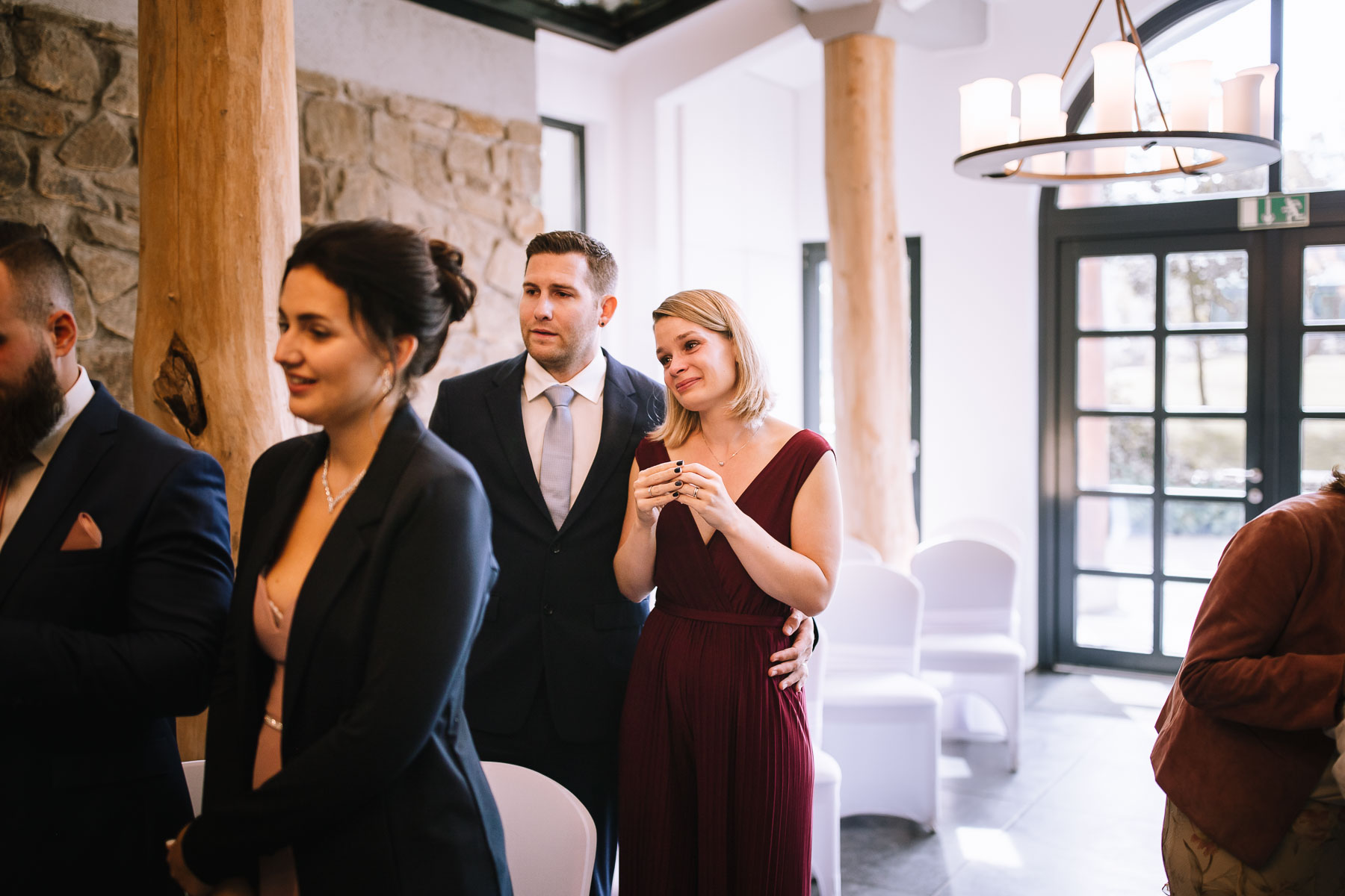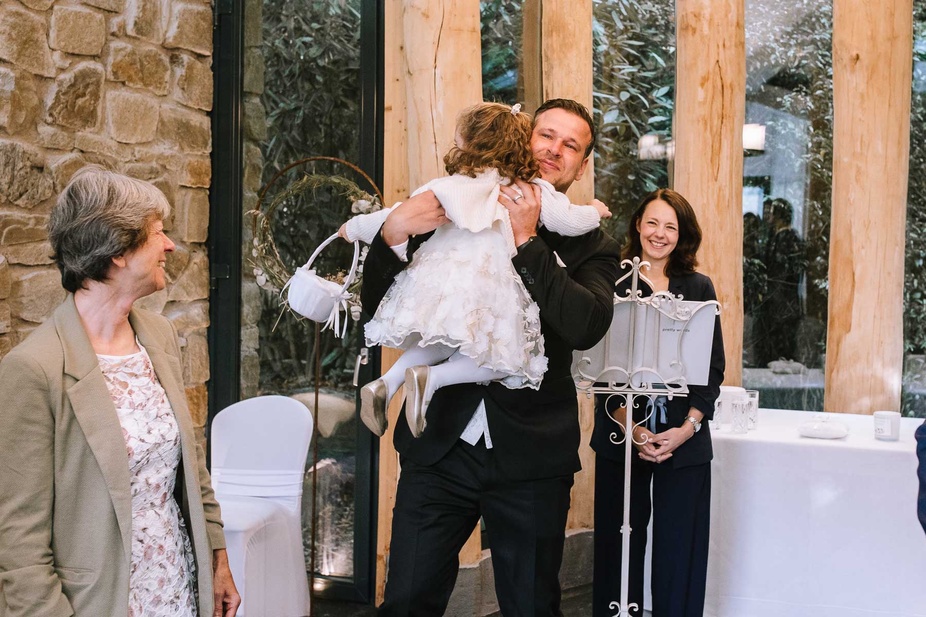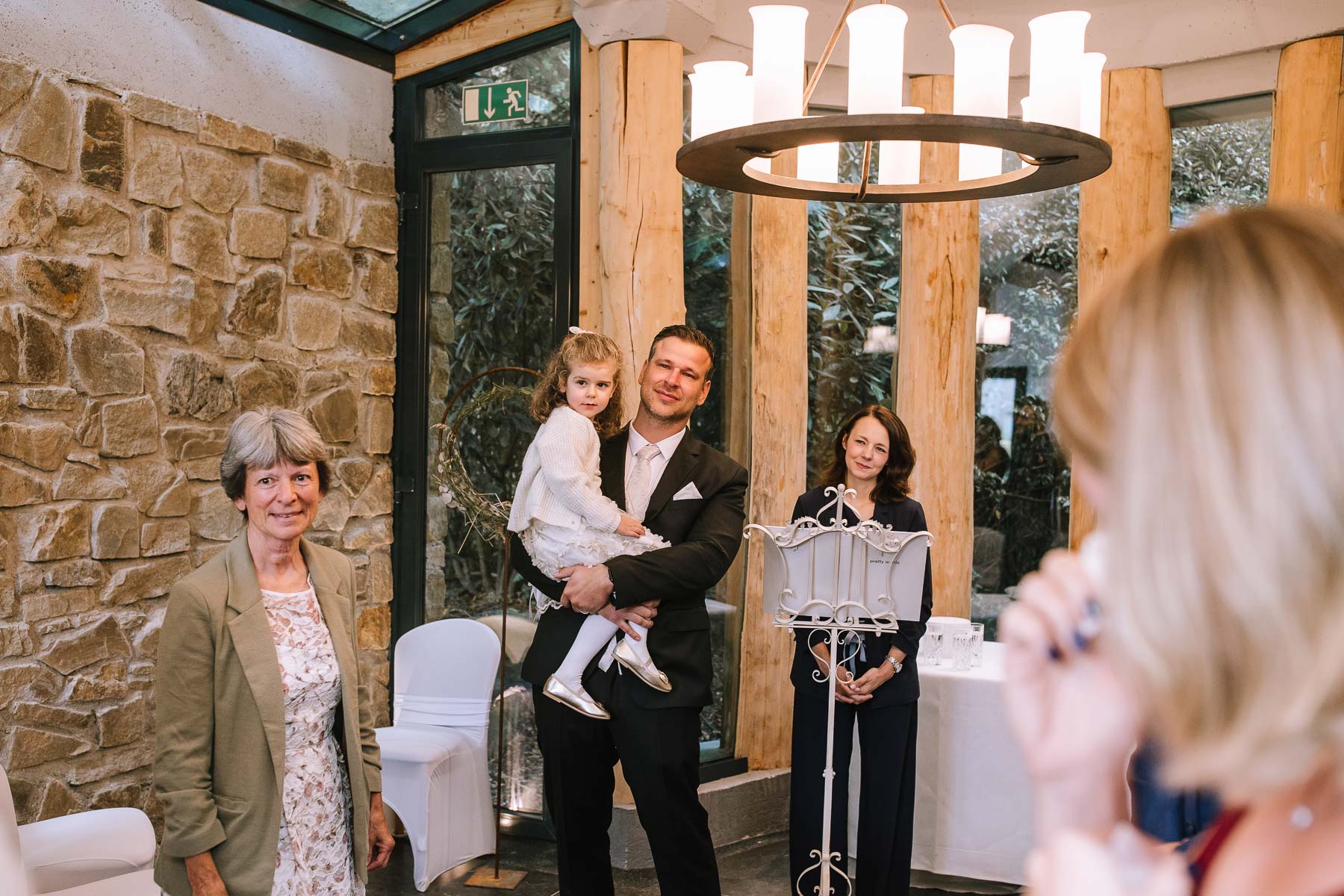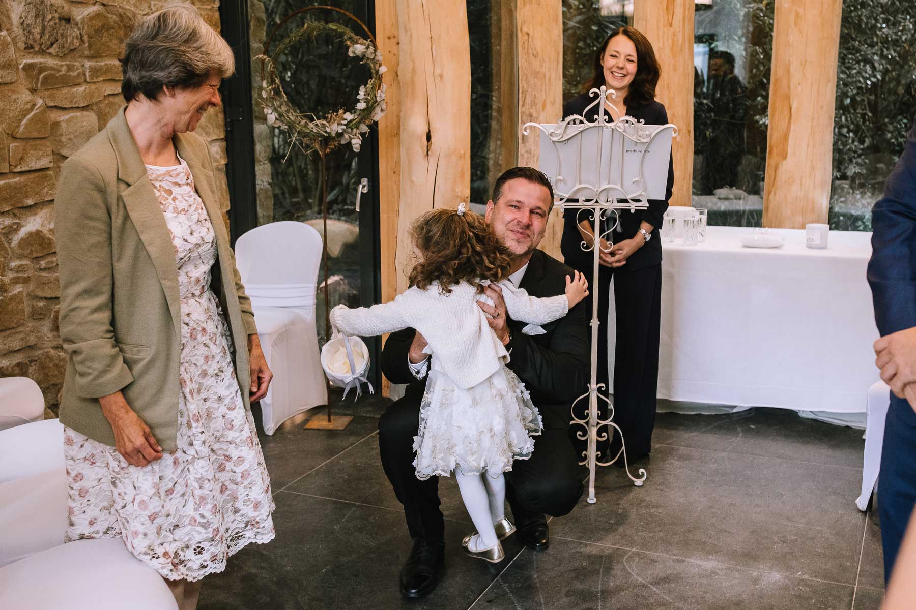 und dabei auch an die Stylistinnen und mich gedacht (mit Süßkram kann man mich ja immer locken, hehe). Nachdem auch die süße Tochter der Beiden angezogen war, machte ich mich auf den Weg zum Confideum, wo die standesamtliche Trauung stattfinden sollte. Die Traurednerin und die Gäste warteten schon und auch Mirjams Papa stand vor dem Confideum, um sie dort zu empfangen und gemeinsam mit ihr nach in die Kapelle zu gehen. Die Traurednerin berührte alle mit ihrer Rede, sodass das eine oder andere Tränchen verdrückt wurde. Für Unterhaltung sorgte aber auch die kleine Tochter, die herzlich lachte, fröhlich herumtobte und unheimlich viel Spaß dabei hatte, Papas Schuhe aufzumachen. Nach der Trauung gab es in der Lounge die Hochzeitstorte mit leckeren Macarrons, die traditionsgemäß angeschnitten wurde. Anschließend machten wir uns auf den Weg nach draußen, um dort ein kleines Brautpaarshooting zu machen. Als wir wieder zurück im Hotel waren, machten wir in der Lobby und an der Bar noch ein paar Fotos mit den Gästen. Für mich war es mal wieder ein wunderschöner angenehmer Tag im Landhotel mit super lieben Herzmenschen. Danke, dass ich euch begleiten durfte!