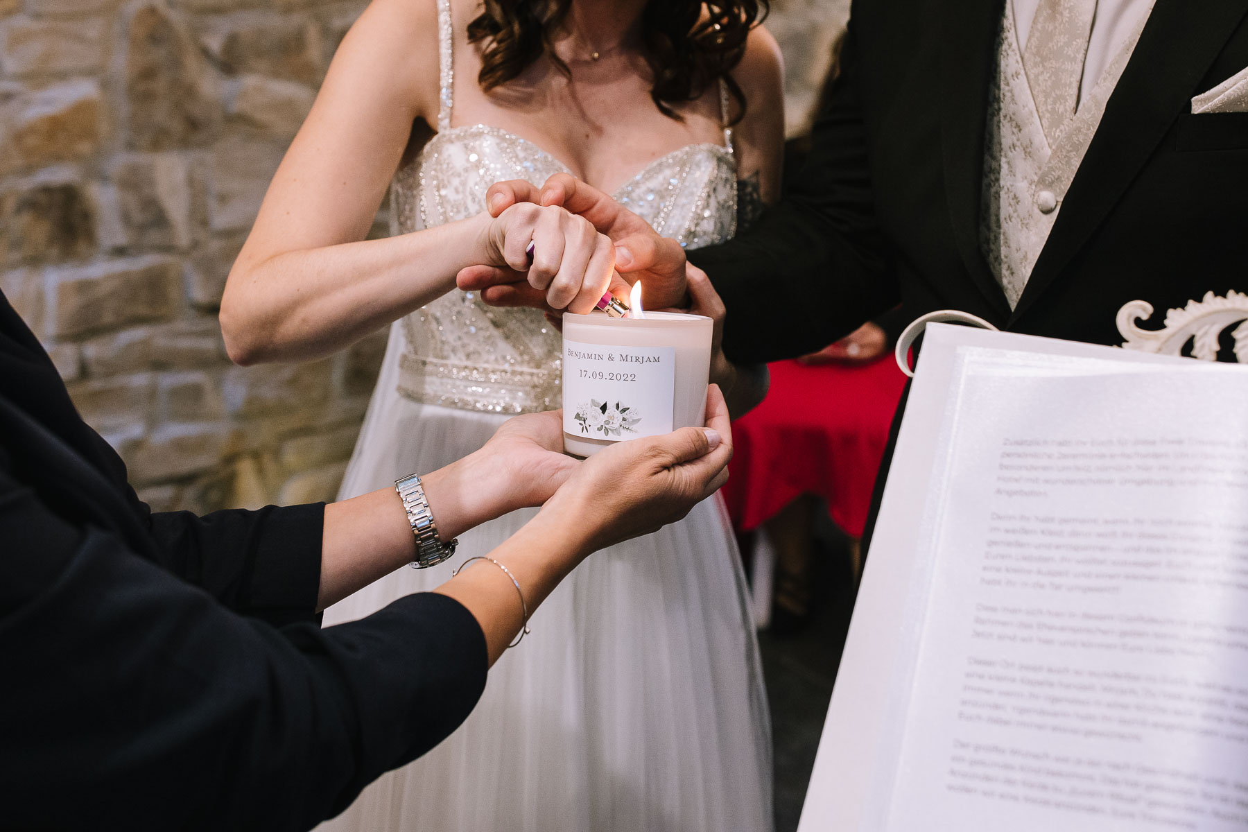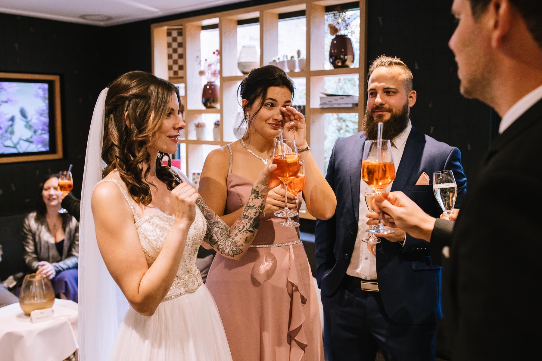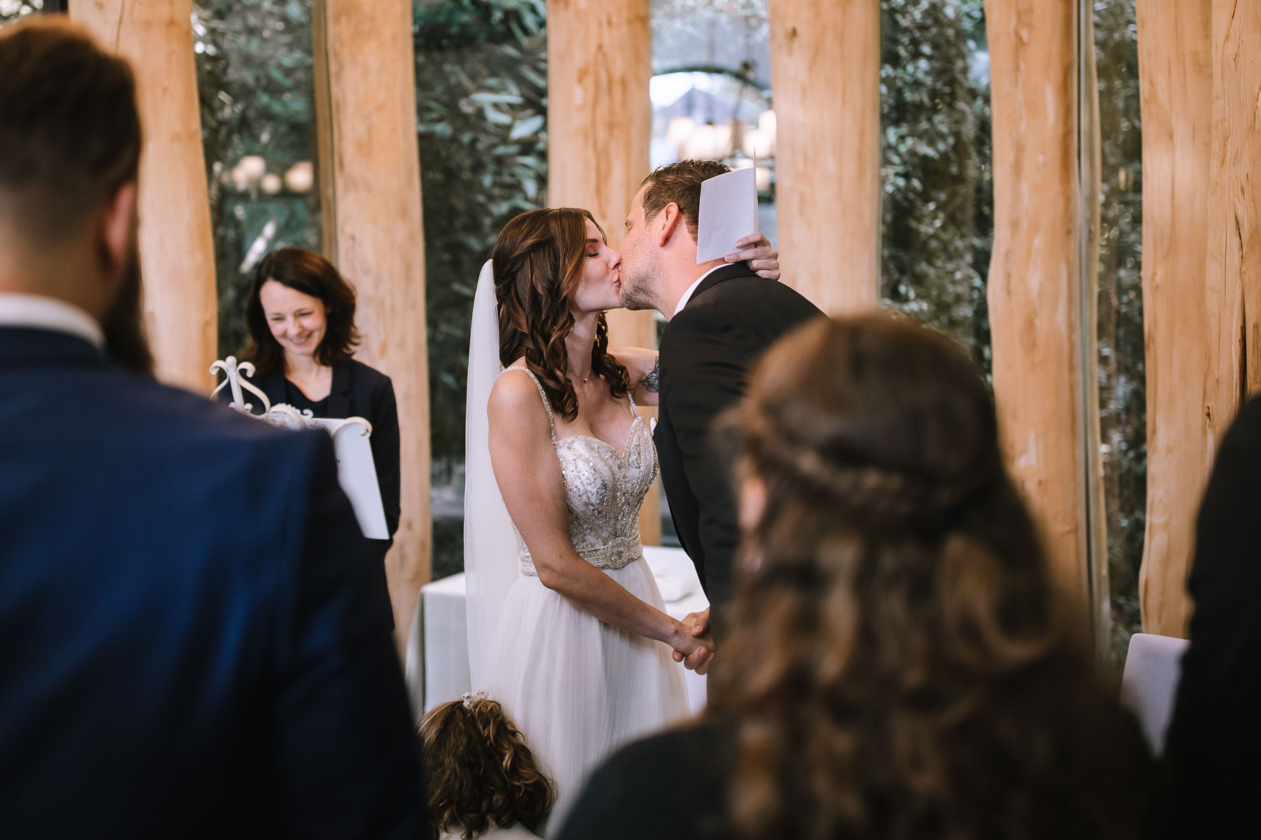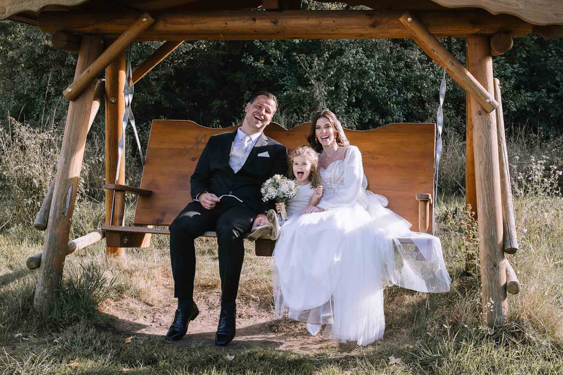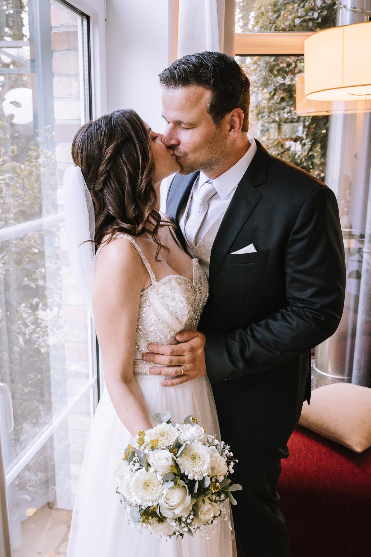und dabei auch an die Stylistinnen und mich gedacht (mit Süßkram kann man mich ja immer locken, hehe). Nachdem auch die süße Tochter der Beiden angezogen war, machte ich mich auf den Weg zum Confideum, wo die standesamtliche Trauung stattfinden sollte. Die Traurednerin und die Gäste warteten schon und auch Mirjams Papa stand vor dem Confideum, um sie dort zu empfangen und gemeinsam mit ihr nach in die Kapelle zu gehen. Die Traurednerin berührte alle mit ihrer Rede, sodass das eine oder andere Tränchen verdrückt wurde. Für Unterhaltung sorgte aber auch die kleine Tochter, die herzlich lachte, fröhlich herumtobte und unheimlich viel Spaß dabei hatte, Papas Schuhe aufzumachen. Nach der Trauung gab es in der Lounge die Hochzeitstorte mit leckeren Macarrons, die traditionsgemäß angeschnitten wurde. Anschließend machten wir uns auf den Weg nach draußen, um dort ein kleines Brautpaarshooting zu machen. Als wir wieder zurück im Hotel waren, machten wir in der Lobby und an der Bar noch ein paar Fotos mit den Gästen. Für mich war es mal wieder ein wunderschöner angenehmer Tag im Landhotel mit super lieben Herzmenschen. Danke, dass ich euch begleiten durfte!