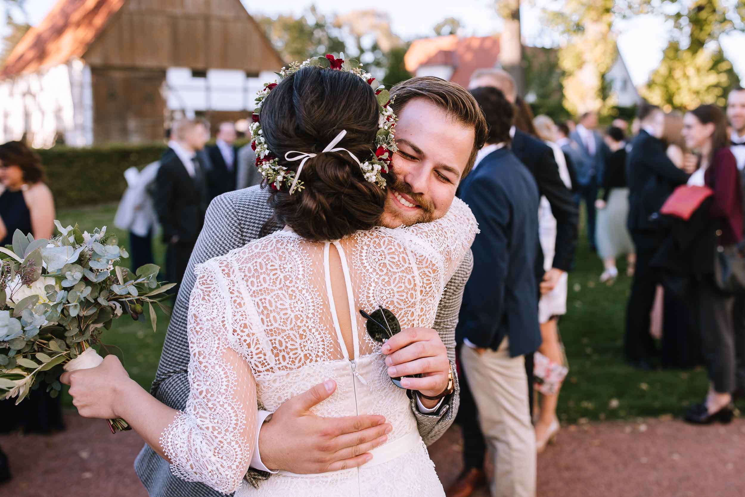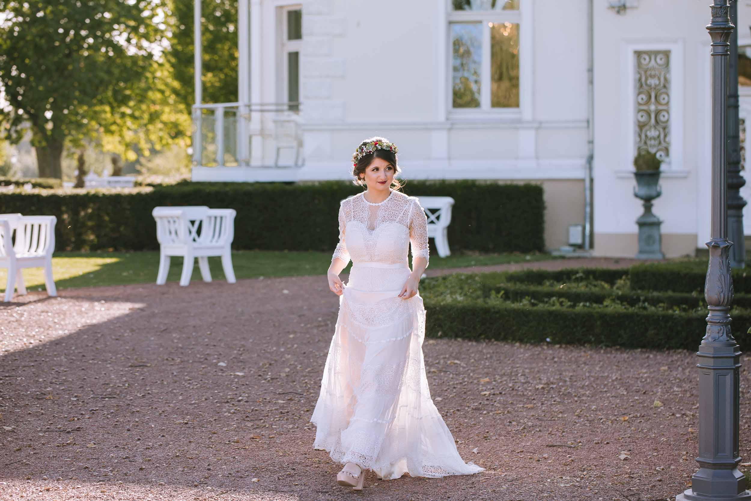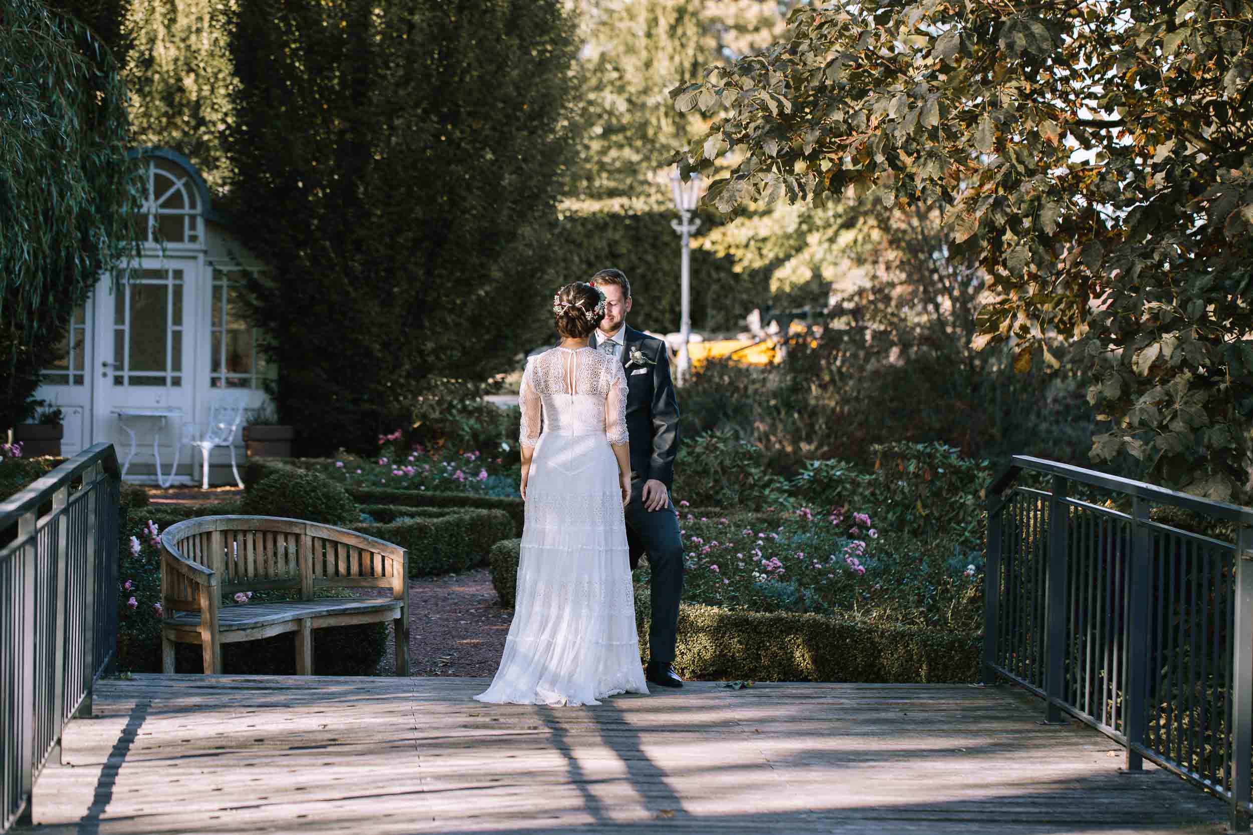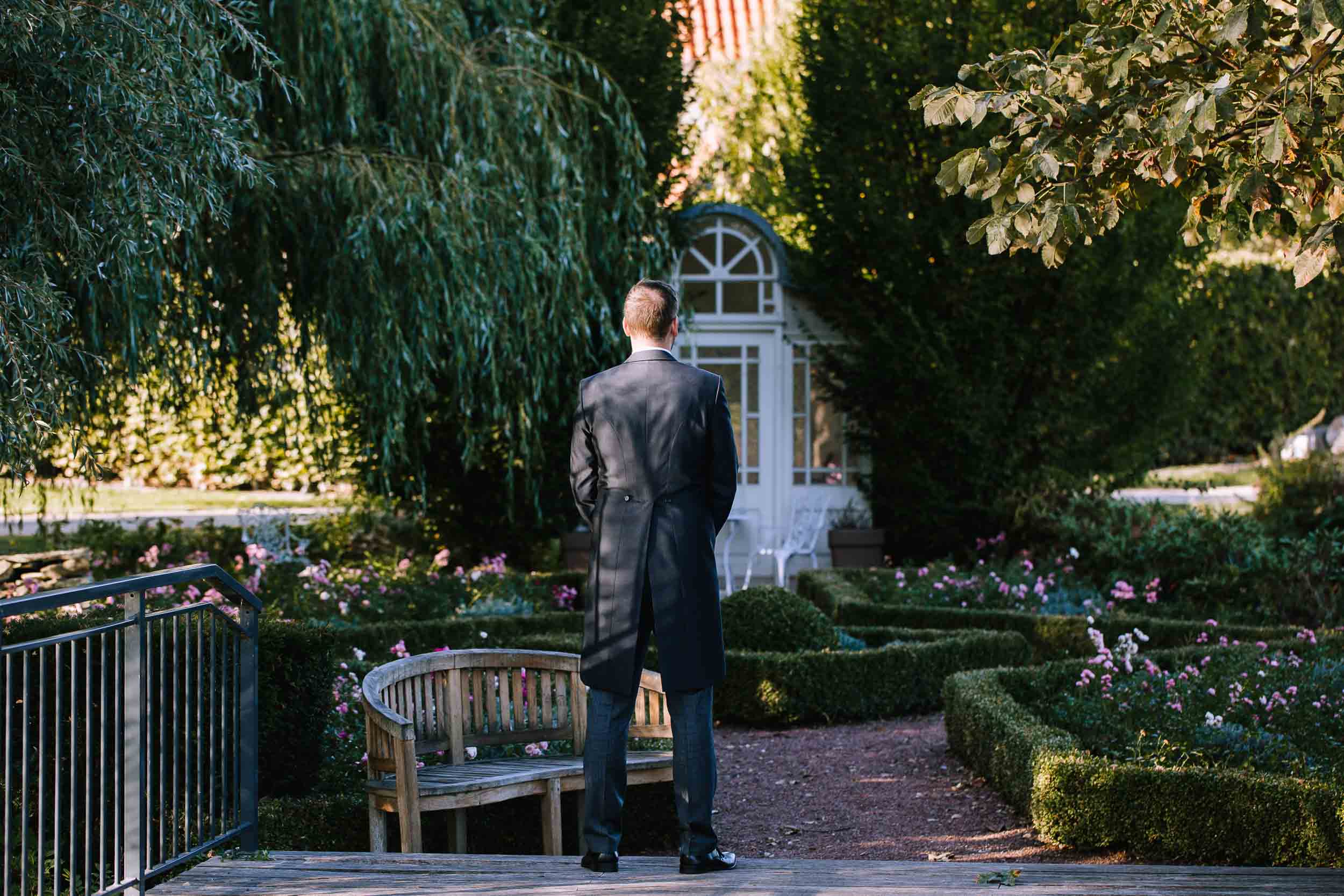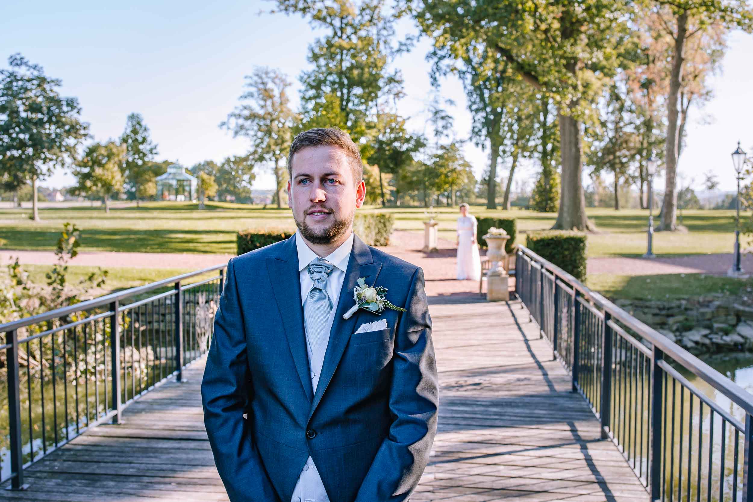 Schon beim Vorgespräch wirkte die Location wirklich beeindruckend auf mich. Das schöne Hotel, die riesige Festscheune, das wunderschöne Gelände mit vielen Ecken, die sich perfekt fĂĽr das Brautpaarshooting anbieten wĂĽrden. Am Tag der Hochzeit konnte ich das alte Herrenhaus von Gut Kump dann endlich auch von innen sehen und war hin und weg. Ein luxuriös, aber trotzdem schlicht eingerichtetes Zimmer mit einer riesigen Altbau-FlĂĽgeltĂĽr. Nachdem Lars fertig angekleidet war und wir alles im Kasten hatten, zog er sich in einen anderen Bereich des Hotels zurĂĽck, damit auch Sonja sich mit ihren zauberhaften Brautjungfern hier ankleiden konnte. Nachdem auch Sonja fertig war, kamen zum Schluss noch ihre Eltern vorbei und waren ganz hin und weg von ihrer schönen Tochter – genau wie ich und alle anderen auch! Doch bevor es zur freien Trauung ging, stand uns noch ein ganz wesentliches Highlight bevor: das First-Look-Shooting. Als Sonja aus dem Haus kam, stand Lars schon am Ende einer kleinen BrĂĽcke direkt vor einem kleinen Blumengarten. Was fĂĽr eine perfekte Shootinglocation!Â