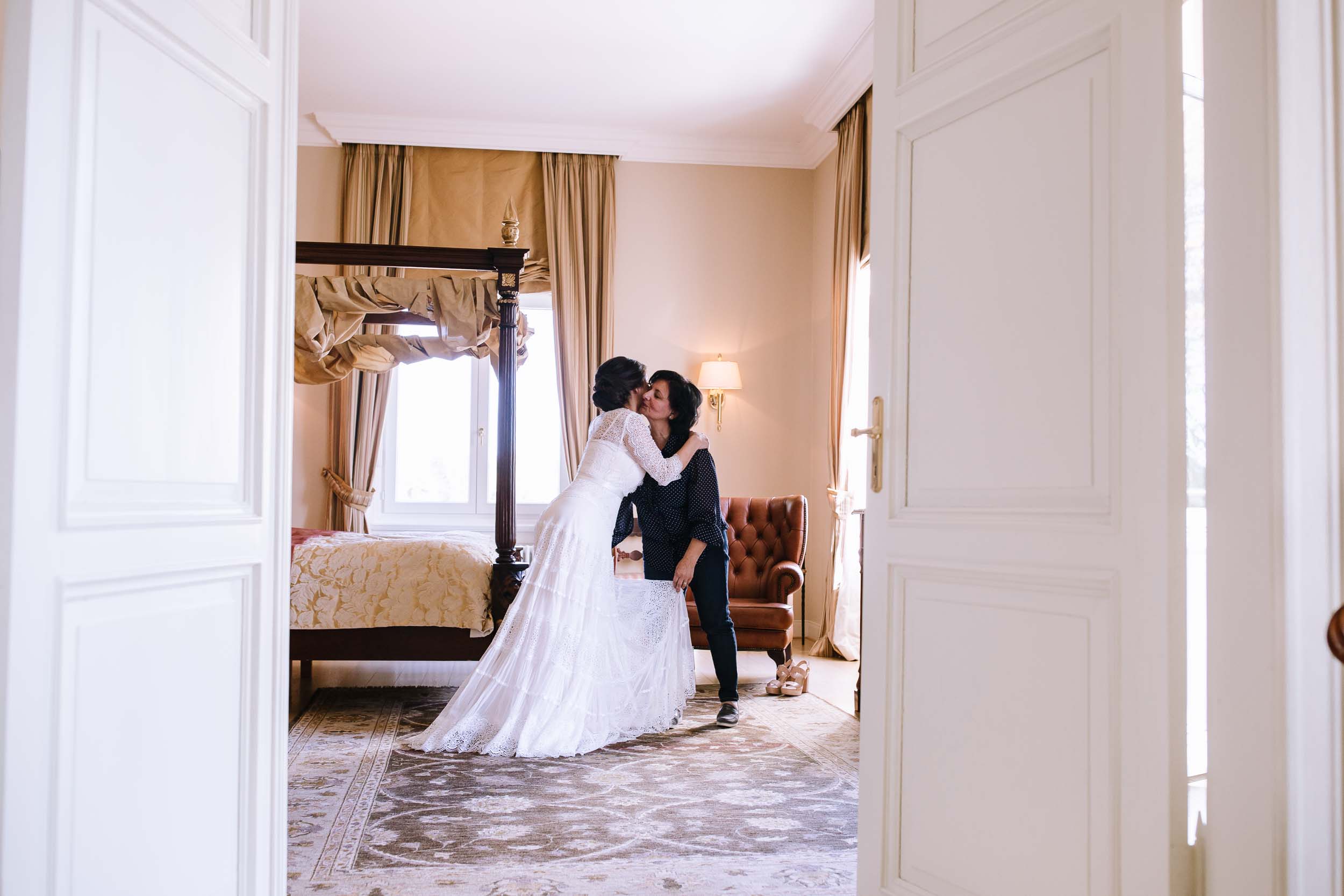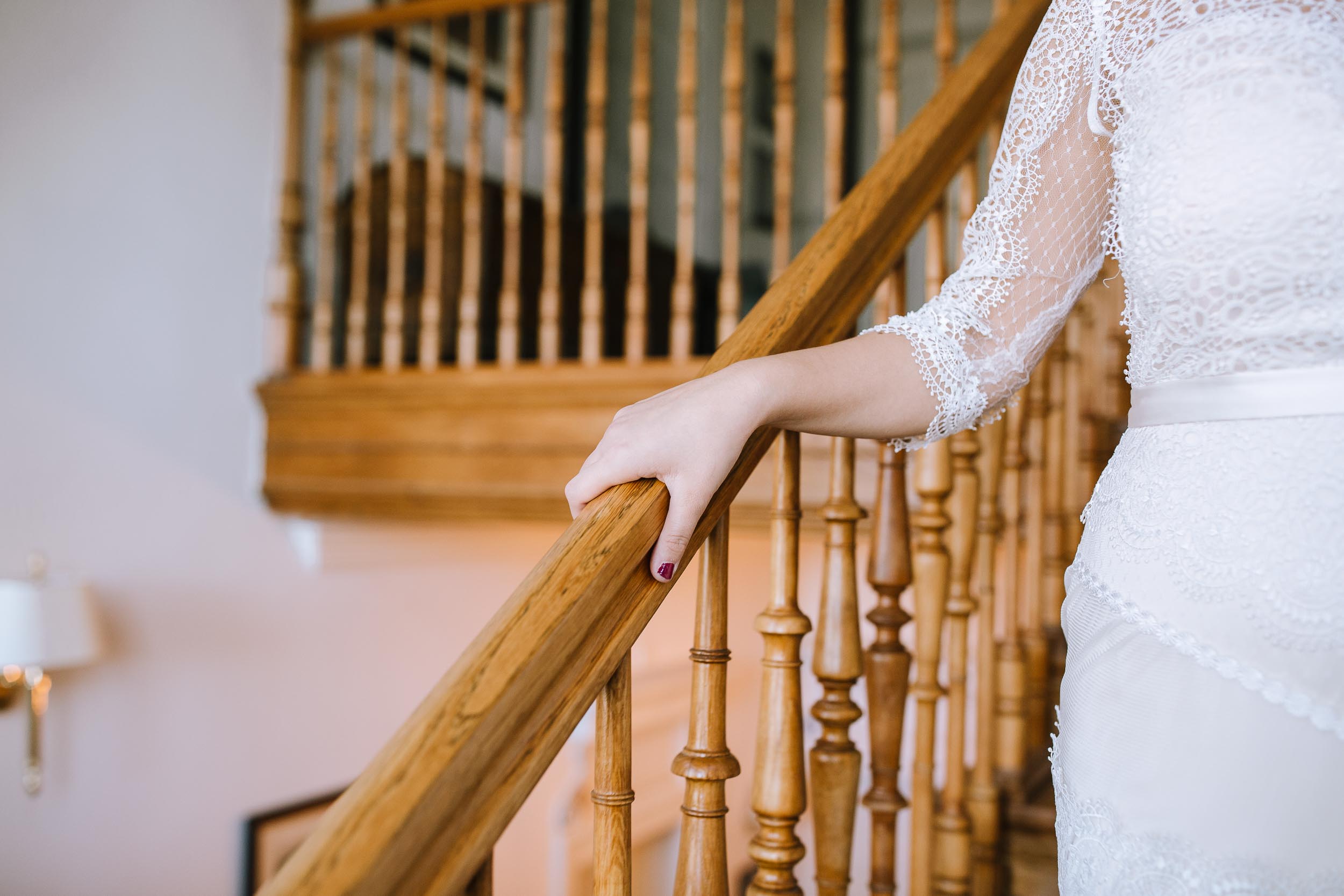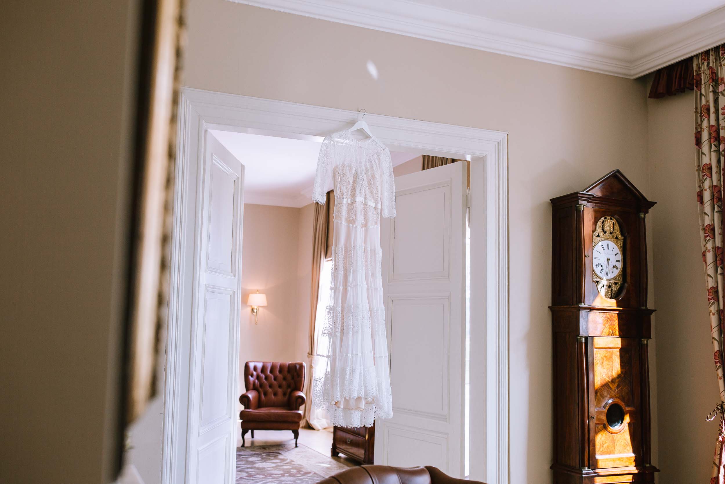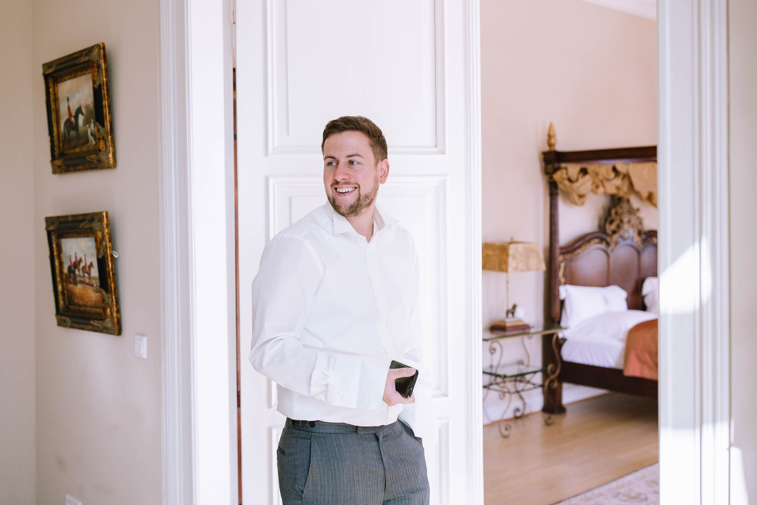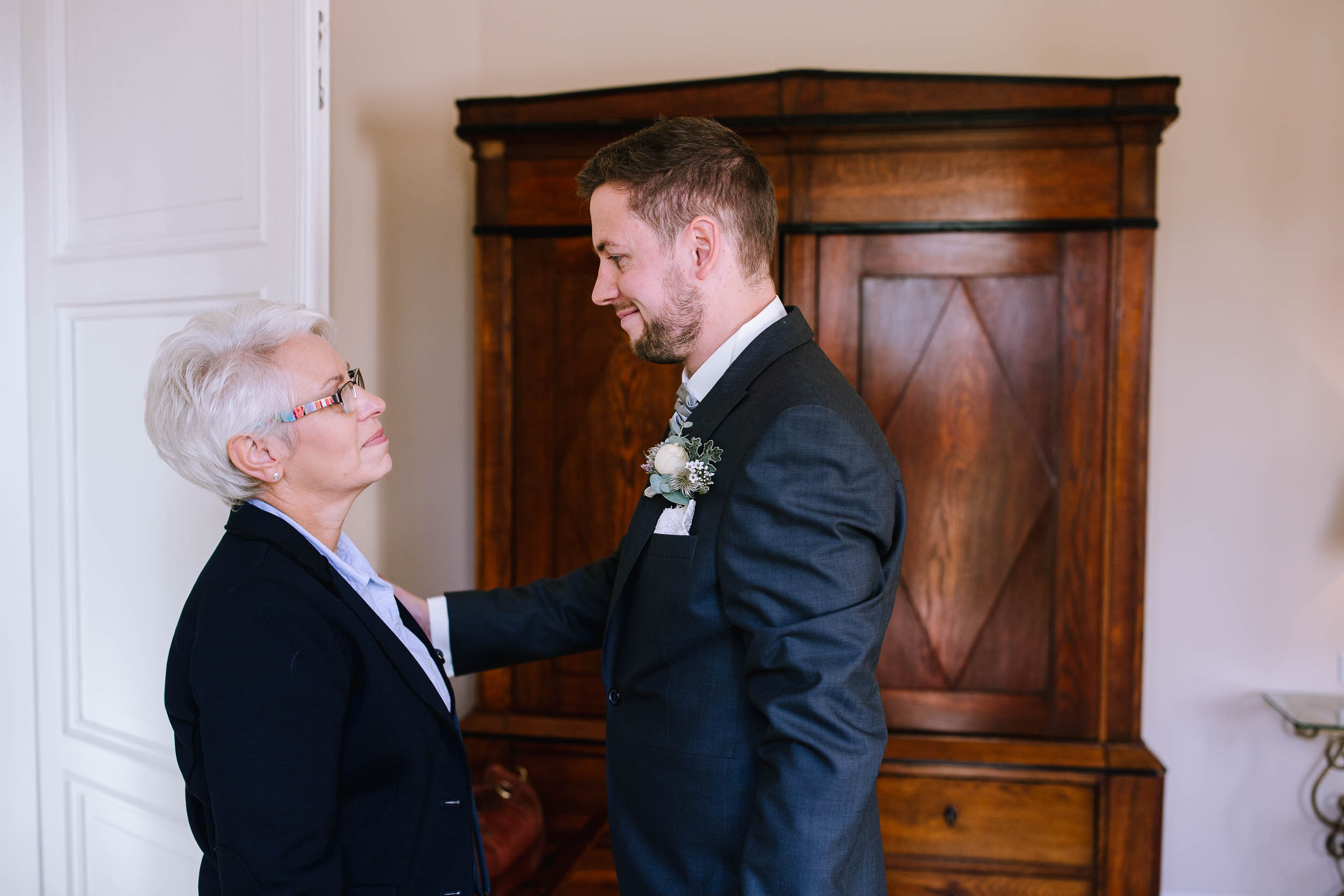 Schon beim Vorgespräch wirkte die Location wirklich beeindruckend auf mich. Das schöne Hotel, die riesige Festscheune, das wunderschöne Gelände mit vielen Ecken, die sich perfekt fĂĽr das Brautpaarshooting anbieten wĂĽrden. Am Tag der Hochzeit konnte ich das alte Herrenhaus von Gut Kump dann endlich auch von innen sehen und war hin und weg. Ein luxuriös, aber trotzdem schlicht eingerichtetes Zimmer mit einer riesigen Altbau-FlĂĽgeltĂĽr. Nachdem Lars fertig angekleidet war und wir alles im Kasten hatten, zog er sich in einen anderen Bereich des Hotels zurĂĽck, damit auch Sonja sich mit ihren zauberhaften Brautjungfern hier ankleiden konnte. Nachdem auch Sonja fertig war, kamen zum Schluss noch ihre Eltern vorbei und waren ganz hin und weg von ihrer schönen Tochter – genau wie ich und alle anderen auch! Doch bevor es zur freien Trauung ging, stand uns noch ein ganz wesentliches Highlight bevor: das First-Look-Shooting. Als Sonja aus dem Haus kam, stand Lars schon am Ende einer kleinen BrĂĽcke direkt vor einem kleinen Blumengarten. Was fĂĽr eine perfekte Shootinglocation!Â