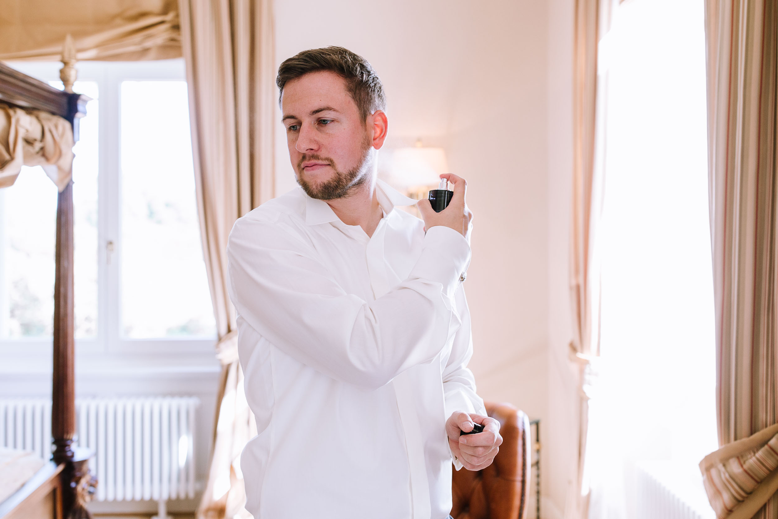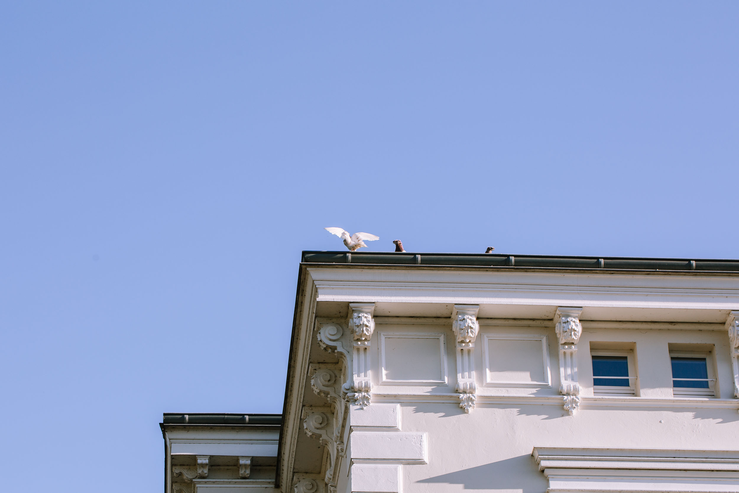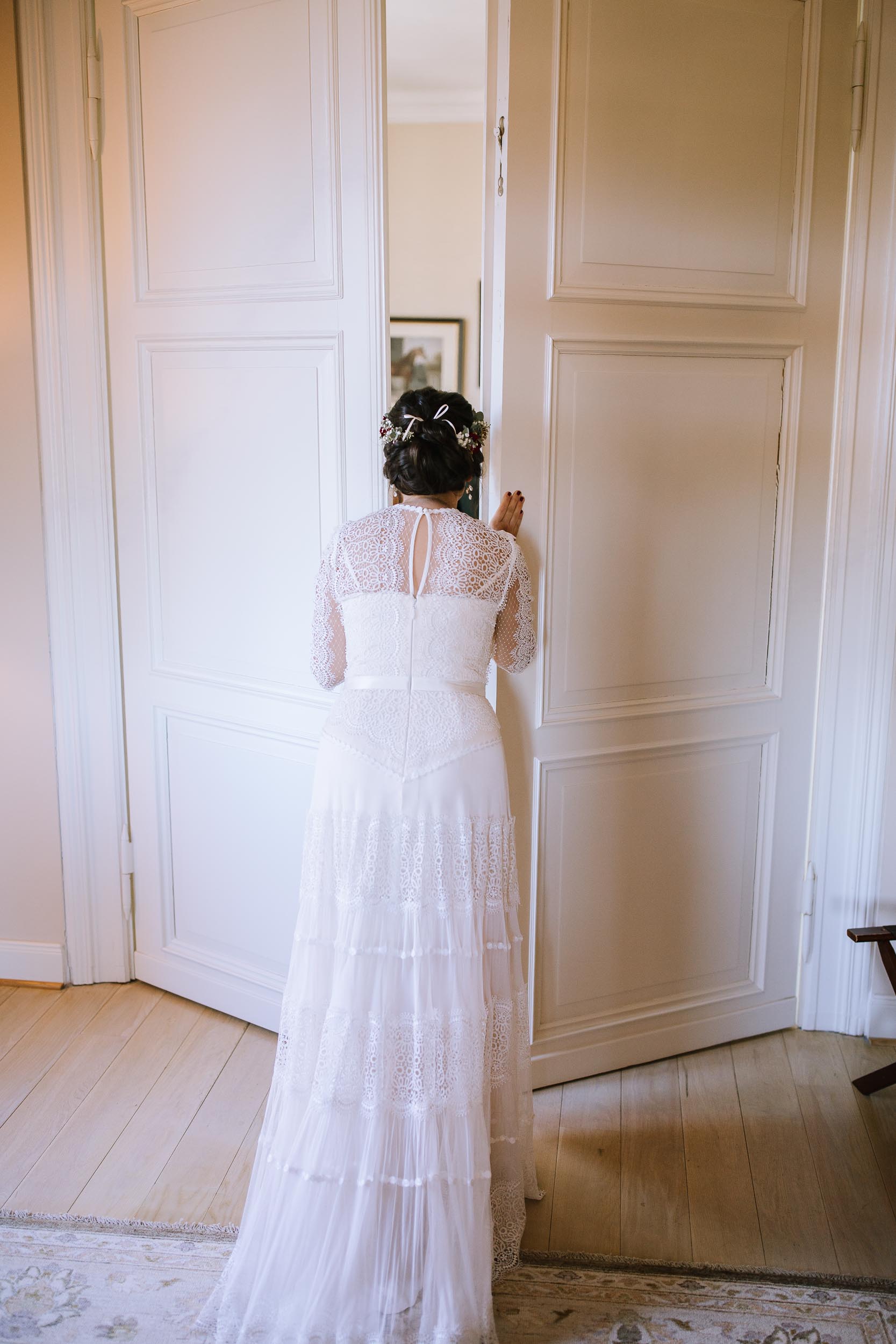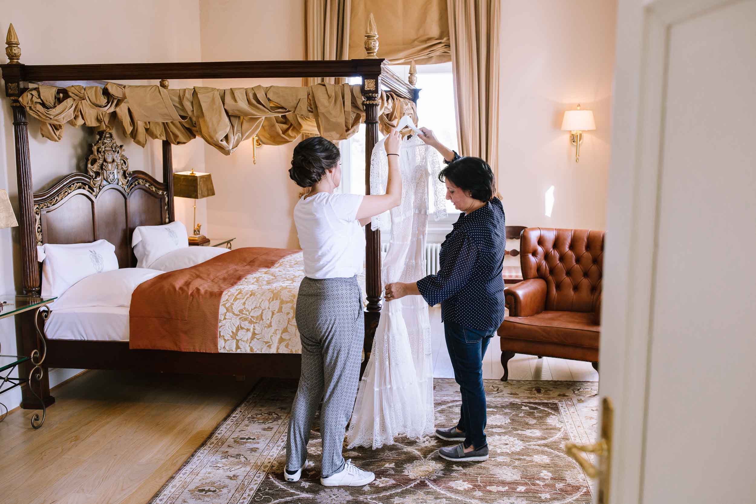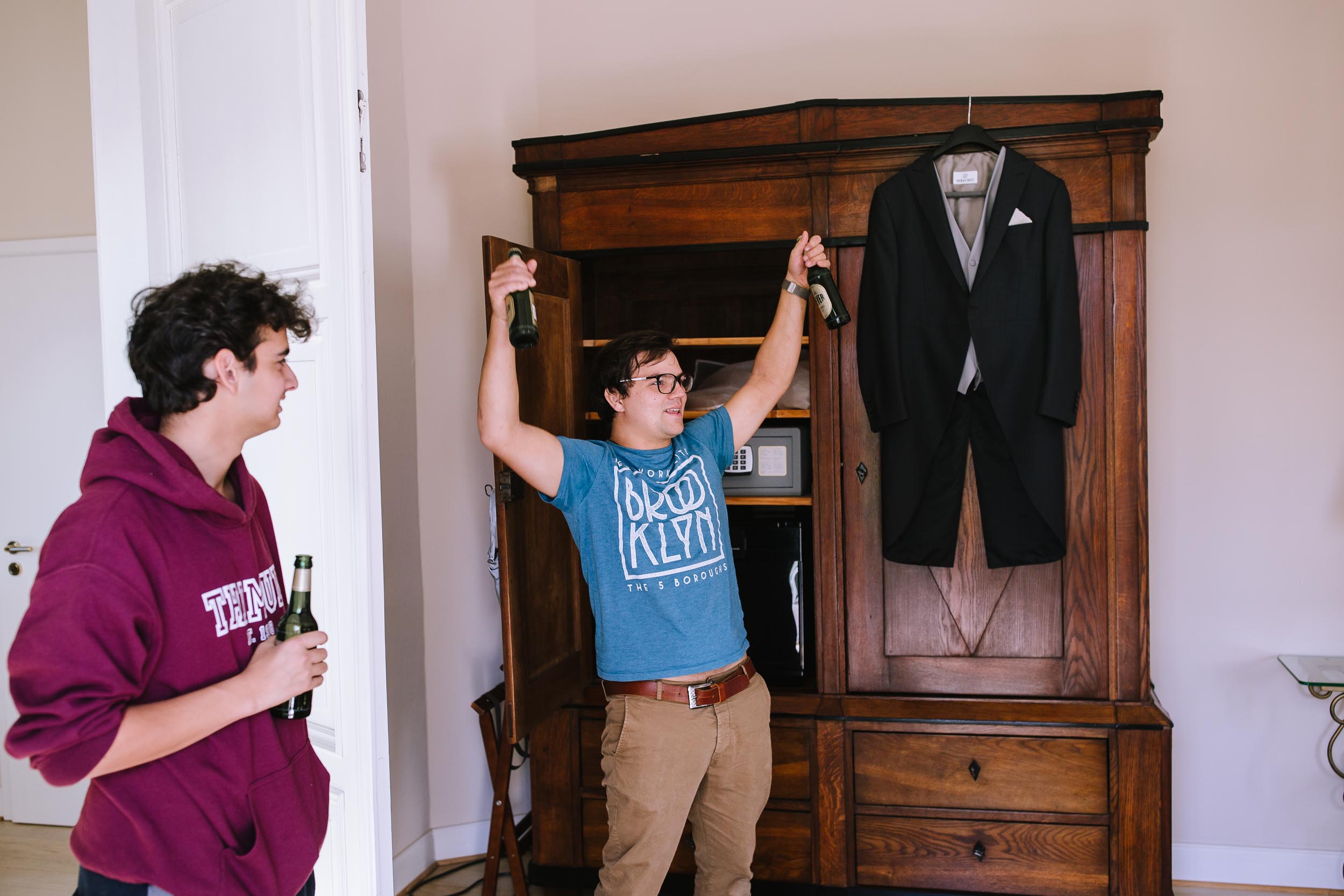 Schon beim Vorgespräch wirkte die Location wirklich beeindruckend auf mich. Das schöne Hotel, die riesige Festscheune, das wunderschöne Gelände mit vielen Ecken, die sich perfekt fĂĽr das Brautpaarshooting anbieten wĂĽrden. Am Tag der Hochzeit konnte ich das alte Herrenhaus von Gut Kump dann endlich auch von innen sehen und war hin und weg. Ein luxuriös, aber trotzdem schlicht eingerichtetes Zimmer mit einer riesigen Altbau-FlĂĽgeltĂĽr. Nachdem Lars fertig angekleidet war und wir alles im Kasten hatten, zog er sich in einen anderen Bereich des Hotels zurĂĽck, damit auch Sonja sich mit ihren zauberhaften Brautjungfern hier ankleiden konnte. Nachdem auch Sonja fertig war, kamen zum Schluss noch ihre Eltern vorbei und waren ganz hin und weg von ihrer schönen Tochter – genau wie ich und alle anderen auch! Doch bevor es zur freien Trauung ging, stand uns noch ein ganz wesentliches Highlight bevor: das First-Look-Shooting. Als Sonja aus dem Haus kam, stand Lars schon am Ende einer kleinen BrĂĽcke direkt vor einem kleinen Blumengarten. Was fĂĽr eine perfekte Shootinglocation!Â