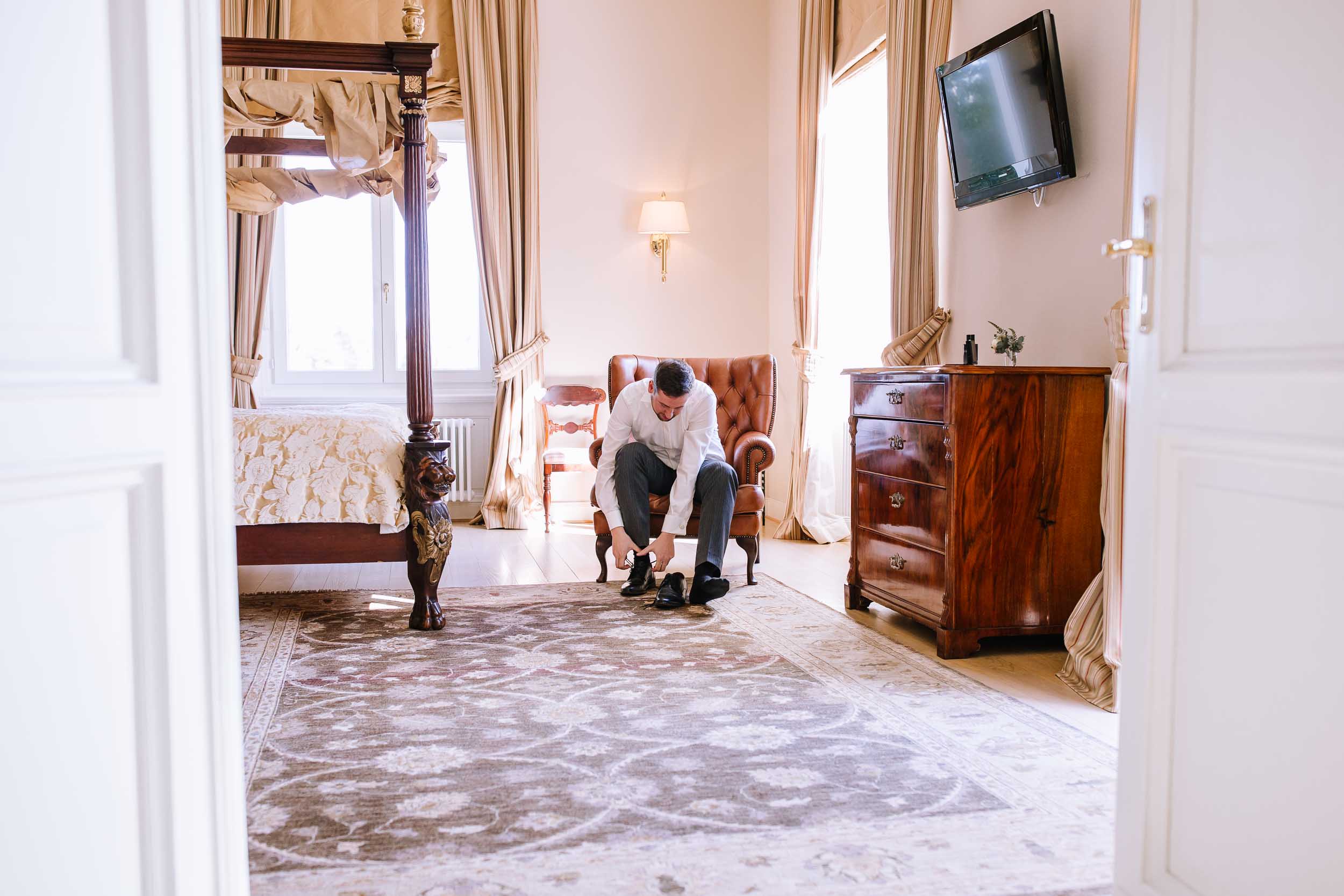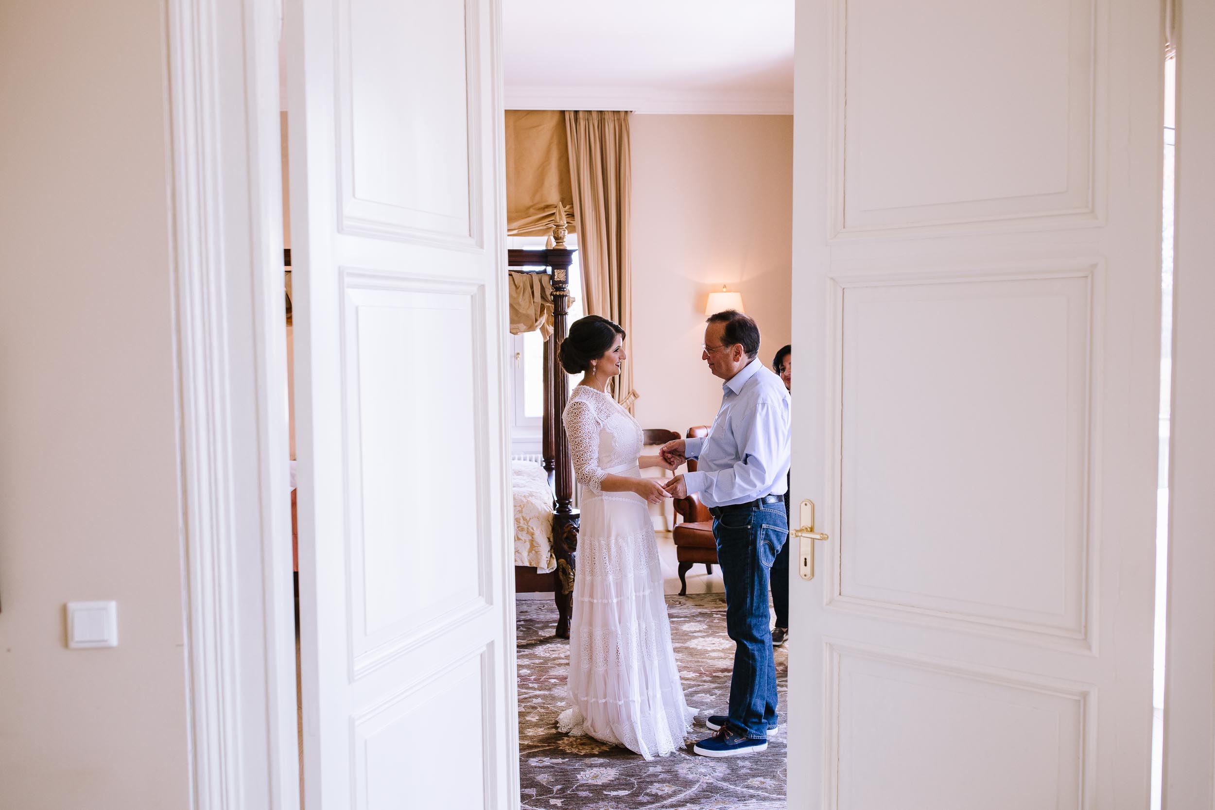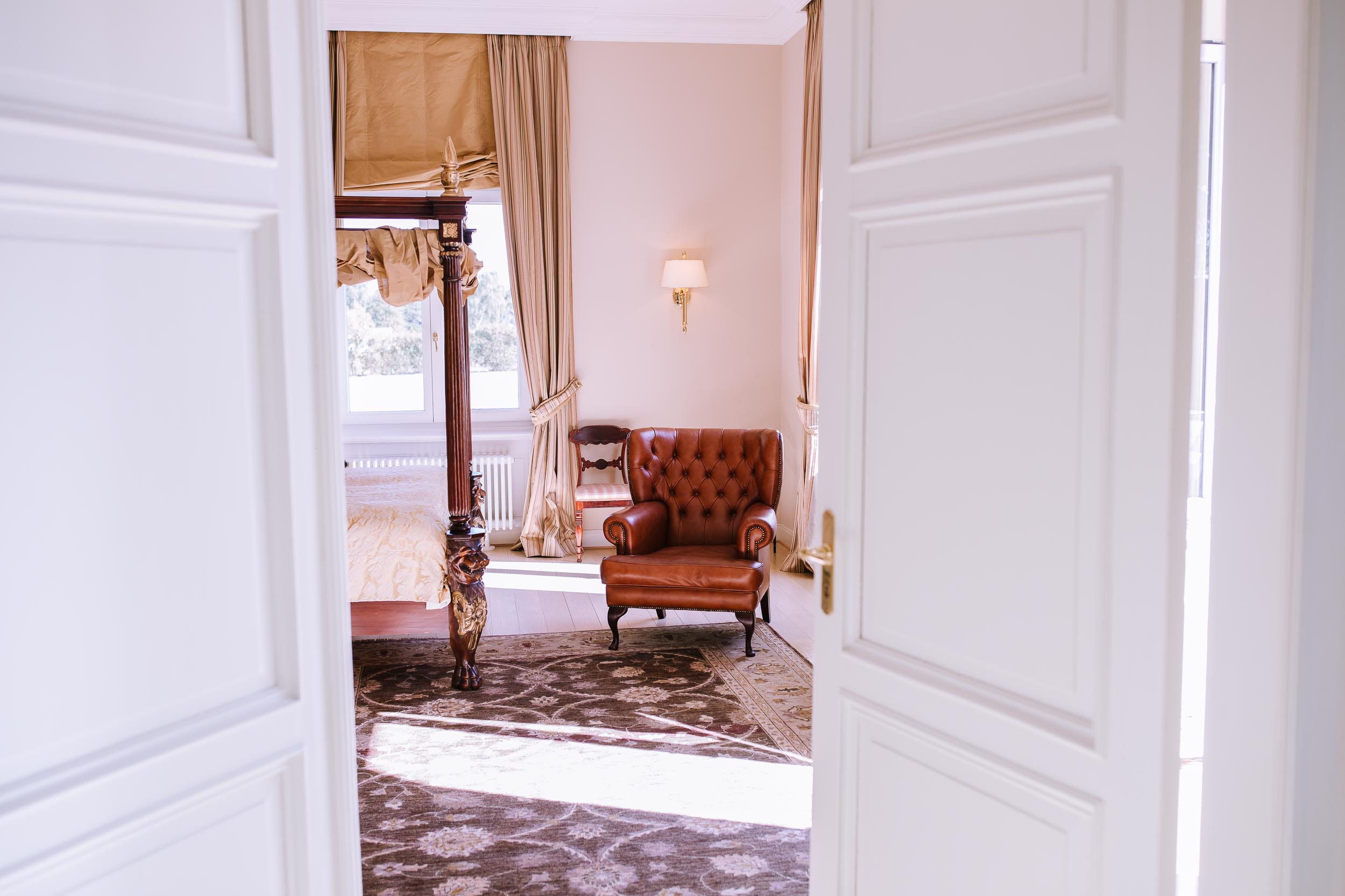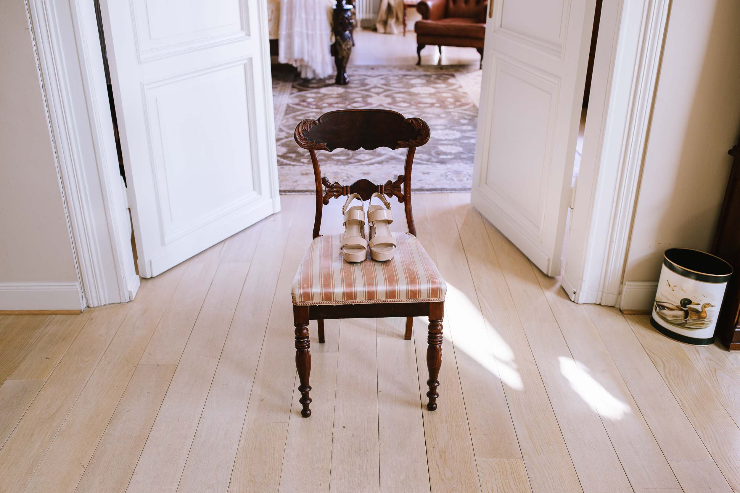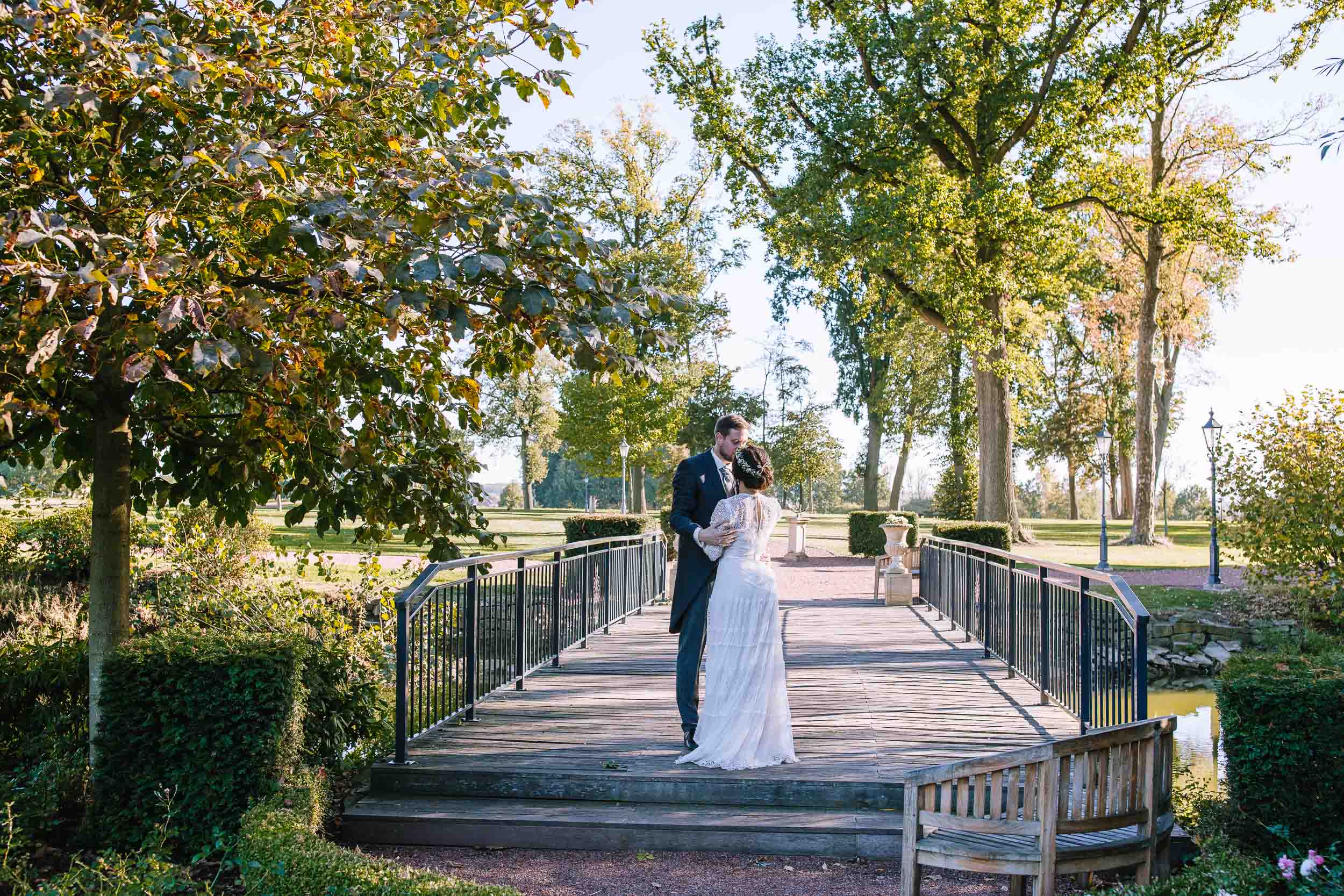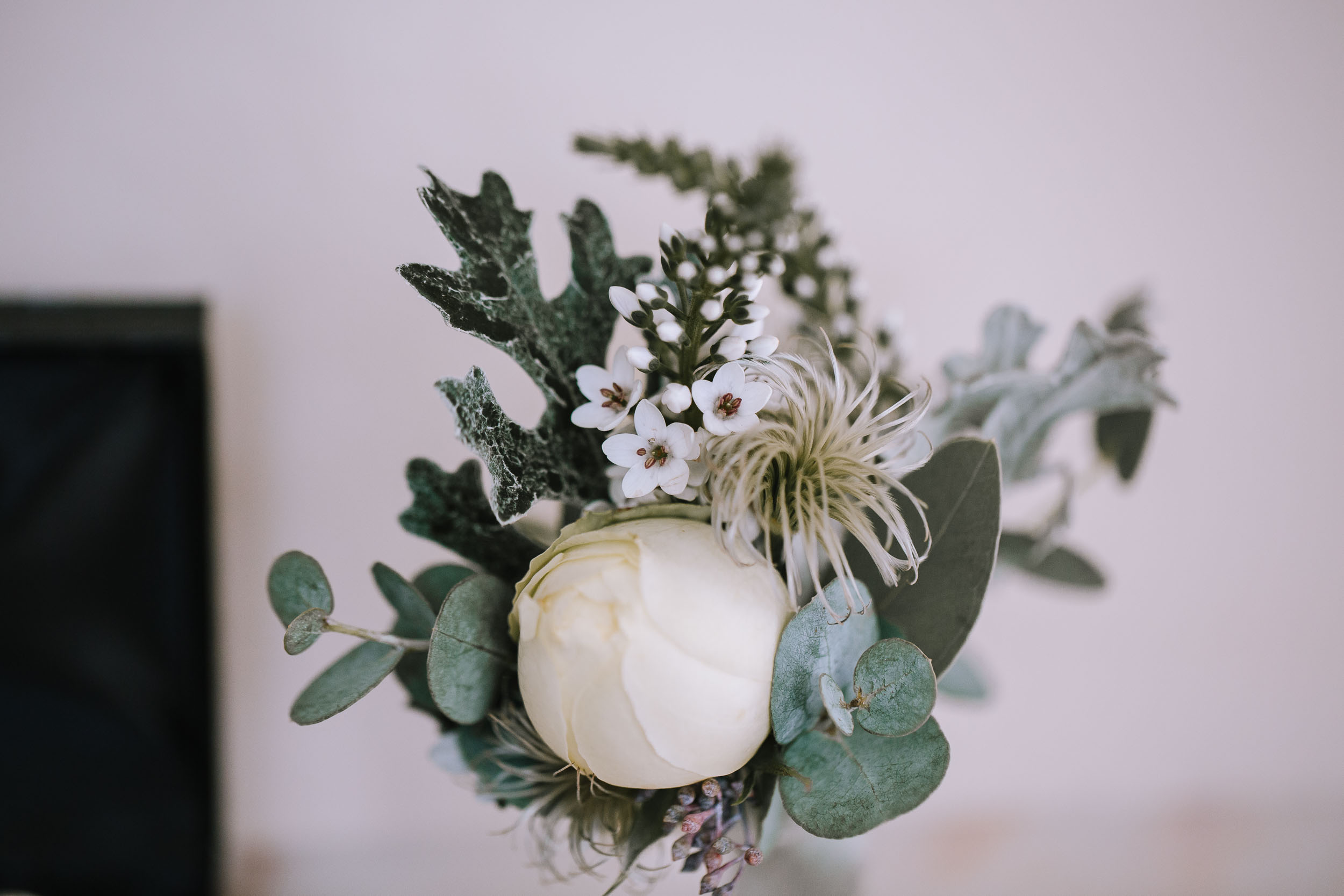 Schon beim Vorgespräch wirkte die Location wirklich beeindruckend auf mich. Das schöne Hotel, die riesige Festscheune, das wunderschöne Gelände mit vielen Ecken, die sich perfekt fĂĽr das Brautpaarshooting anbieten wĂĽrden. Am Tag der Hochzeit konnte ich das alte Herrenhaus von Gut Kump dann endlich auch von innen sehen und war hin und weg. Ein luxuriös, aber trotzdem schlicht eingerichtetes Zimmer mit einer riesigen Altbau-FlĂĽgeltĂĽr. Nachdem Lars fertig angekleidet war und wir alles im Kasten hatten, zog er sich in einen anderen Bereich des Hotels zurĂĽck, damit auch Sonja sich mit ihren zauberhaften Brautjungfern hier ankleiden konnte. Nachdem auch Sonja fertig war, kamen zum Schluss noch ihre Eltern vorbei und waren ganz hin und weg von ihrer schönen Tochter – genau wie ich und alle anderen auch! Doch bevor es zur freien Trauung ging, stand uns noch ein ganz wesentliches Highlight bevor: das First-Look-Shooting. Als Sonja aus dem Haus kam, stand Lars schon am Ende einer kleinen BrĂĽcke direkt vor einem kleinen Blumengarten. Was fĂĽr eine perfekte Shootinglocation!Â