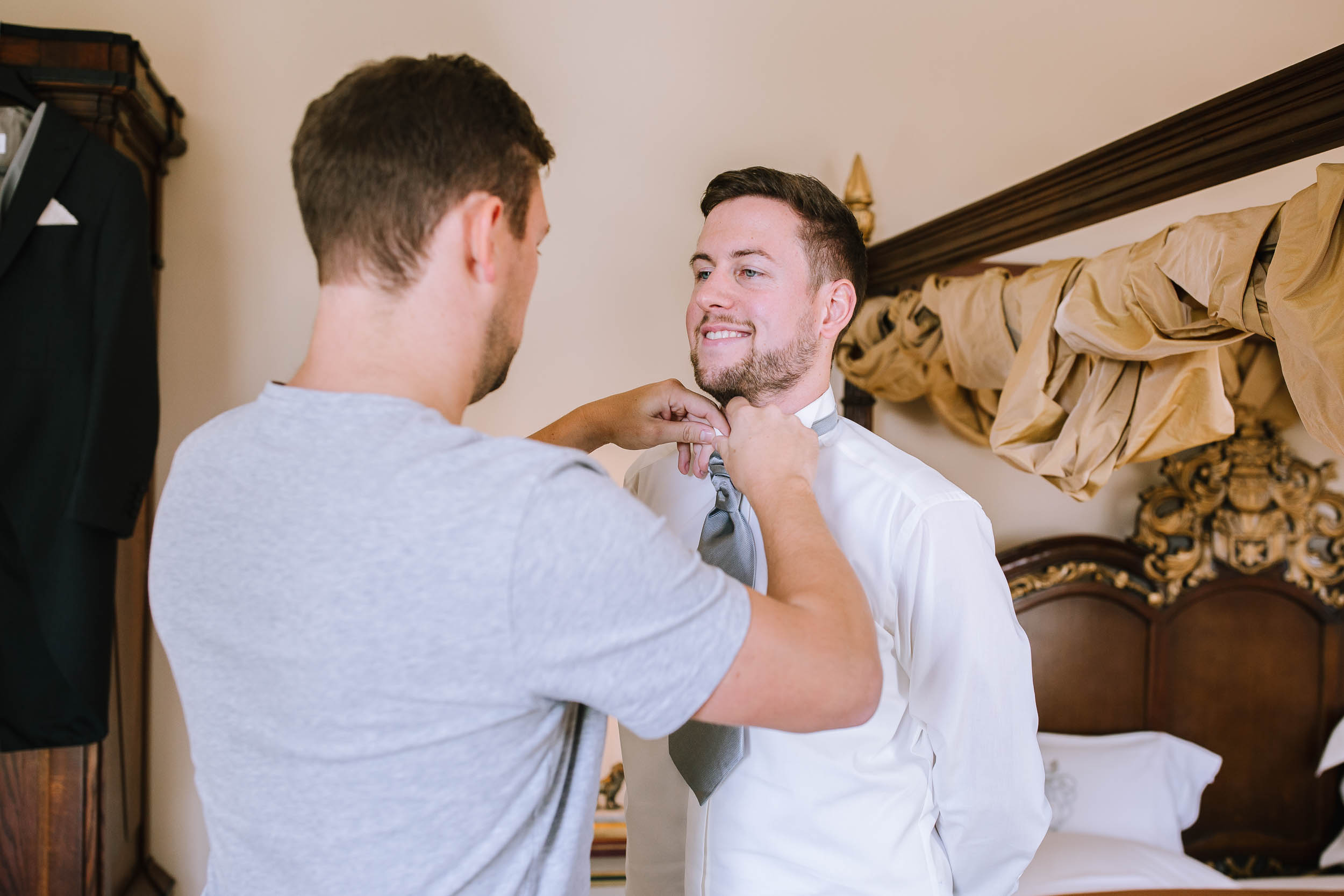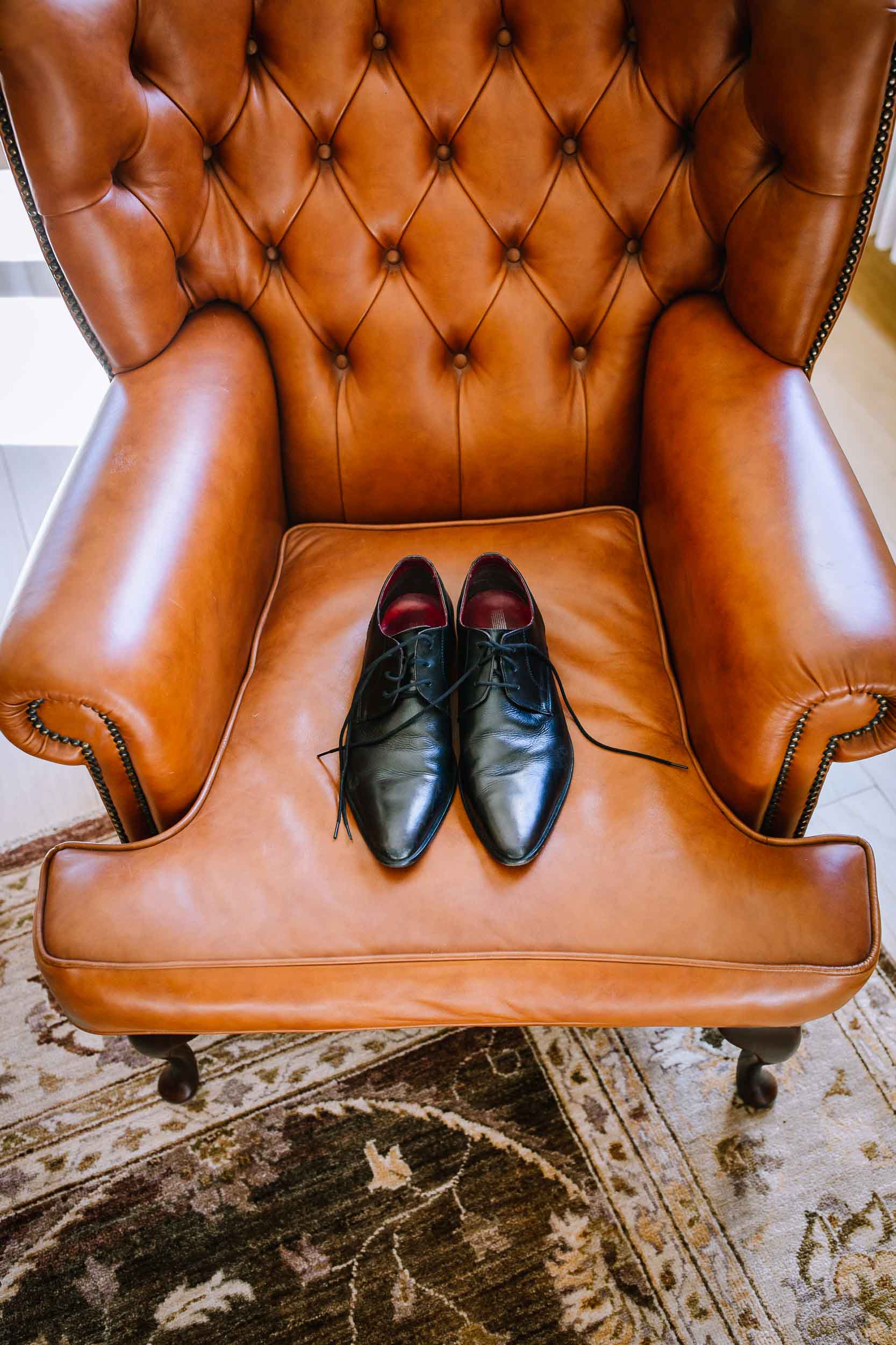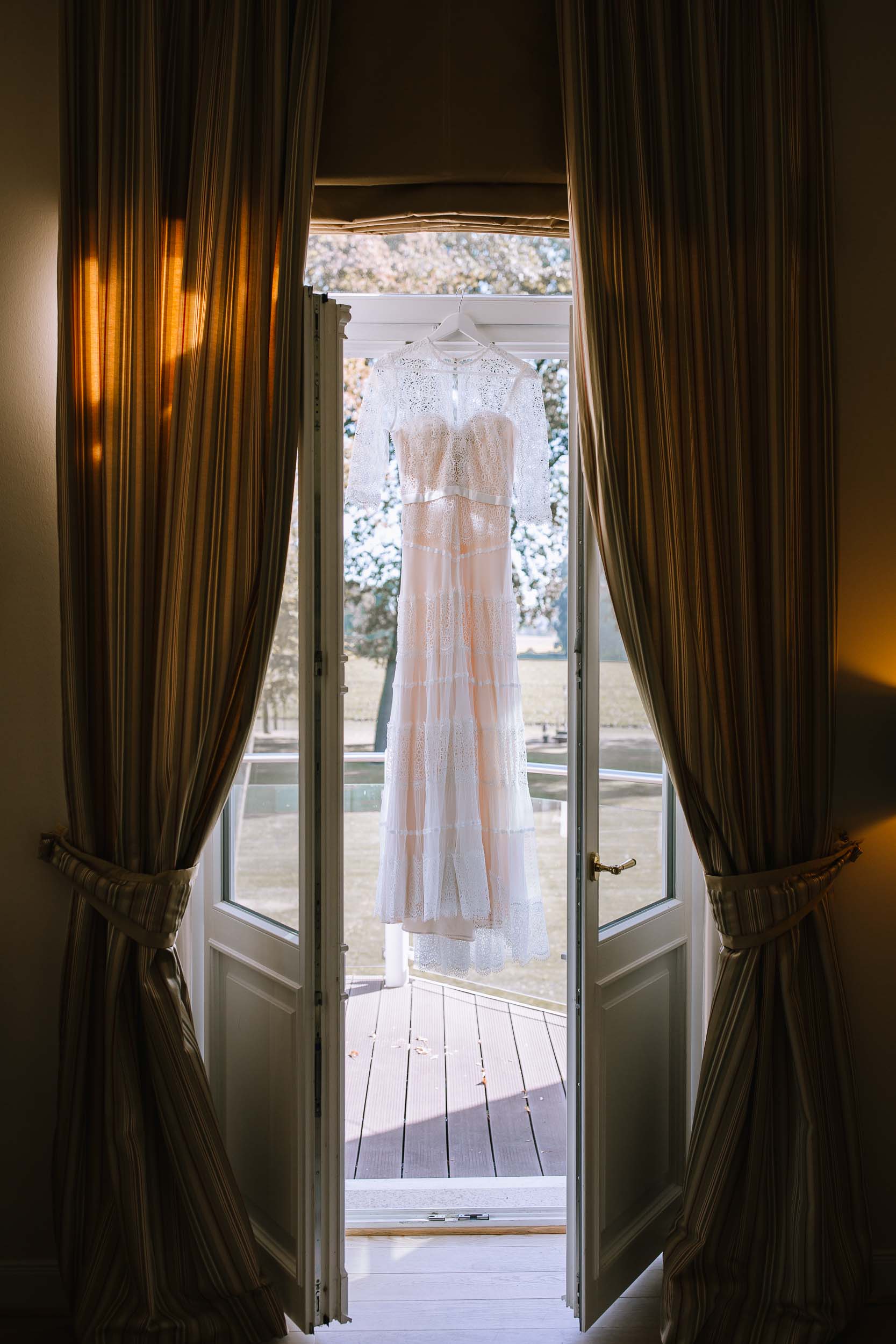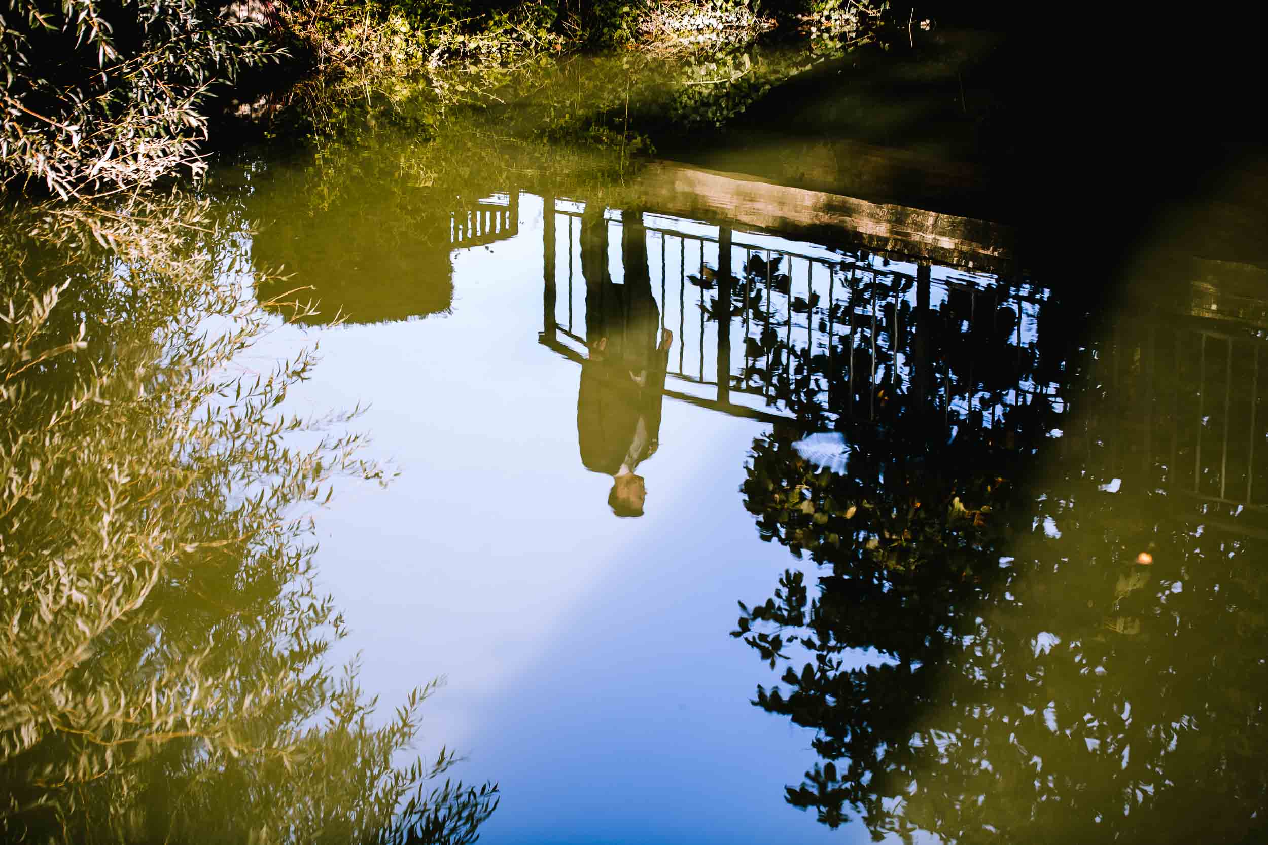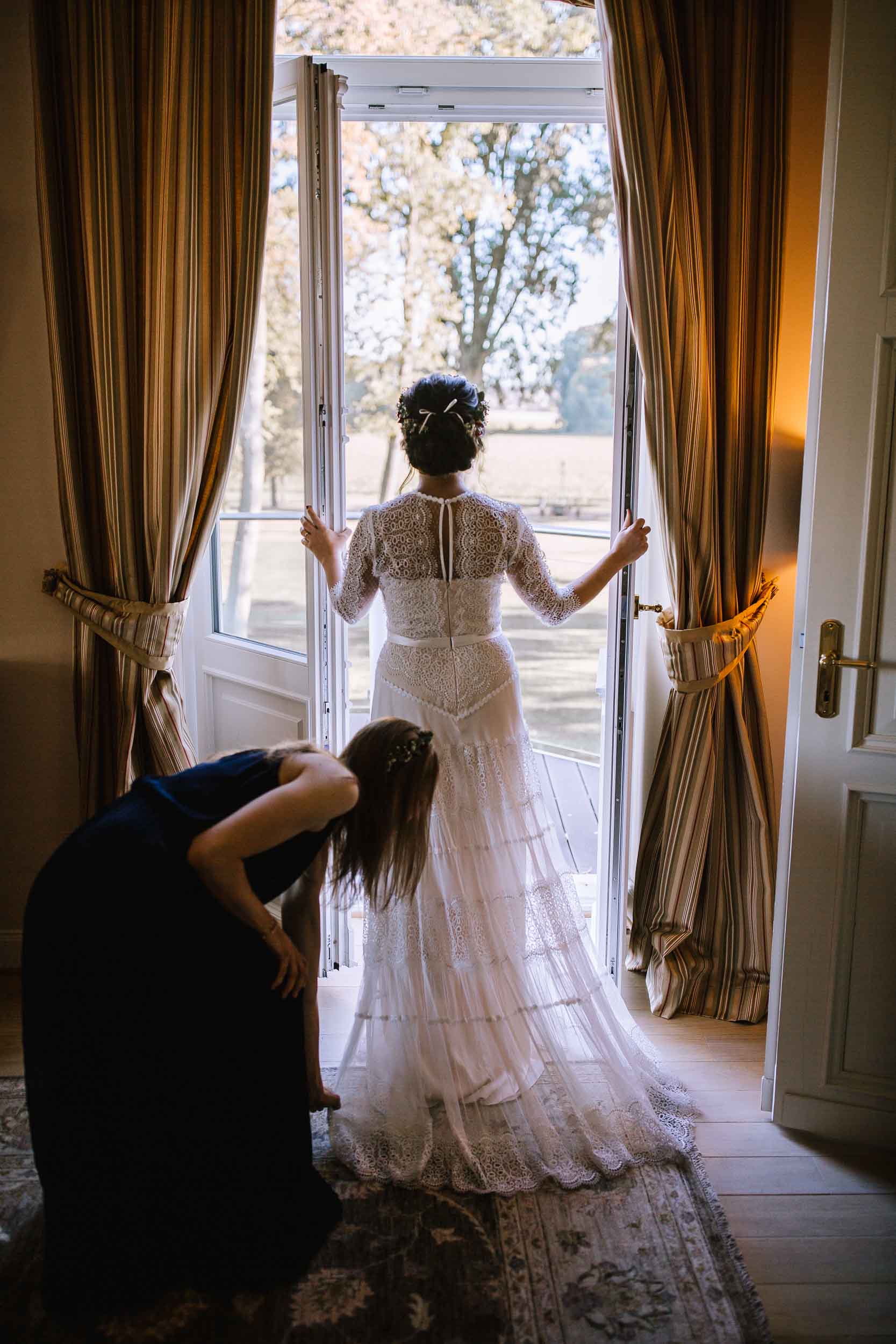 Schon beim Vorgespräch wirkte die Location wirklich beeindruckend auf mich. Das schöne Hotel, die riesige Festscheune, das wunderschöne Gelände mit vielen Ecken, die sich perfekt fĂĽr das Brautpaarshooting anbieten wĂĽrden. Am Tag der Hochzeit konnte ich das alte Herrenhaus von Gut Kump dann endlich auch von innen sehen und war hin und weg. Ein luxuriös, aber trotzdem schlicht eingerichtetes Zimmer mit einer riesigen Altbau-FlĂĽgeltĂĽr. Nachdem Lars fertig angekleidet war und wir alles im Kasten hatten, zog er sich in einen anderen Bereich des Hotels zurĂĽck, damit auch Sonja sich mit ihren zauberhaften Brautjungfern hier ankleiden konnte. Nachdem auch Sonja fertig war, kamen zum Schluss noch ihre Eltern vorbei und waren ganz hin und weg von ihrer schönen Tochter – genau wie ich und alle anderen auch! Doch bevor es zur freien Trauung ging, stand uns noch ein ganz wesentliches Highlight bevor: das First-Look-Shooting. Als Sonja aus dem Haus kam, stand Lars schon am Ende einer kleinen BrĂĽcke direkt vor einem kleinen Blumengarten. Was fĂĽr eine perfekte Shootinglocation!Â