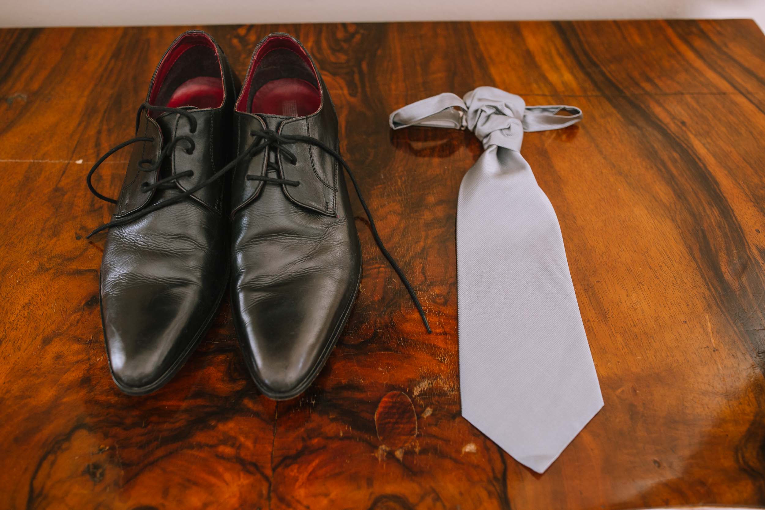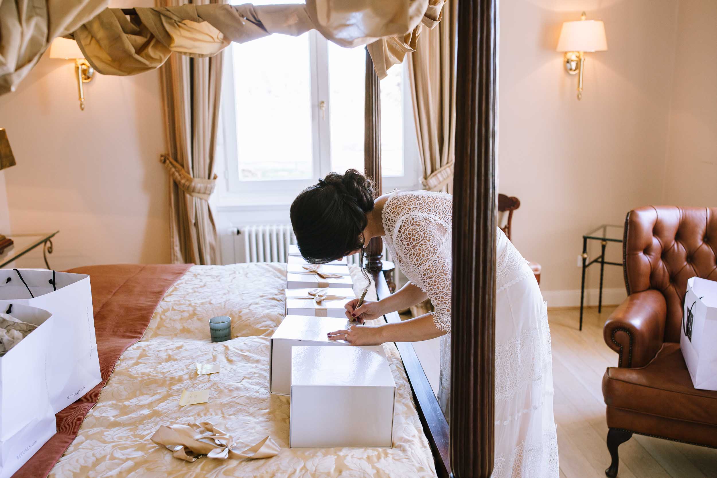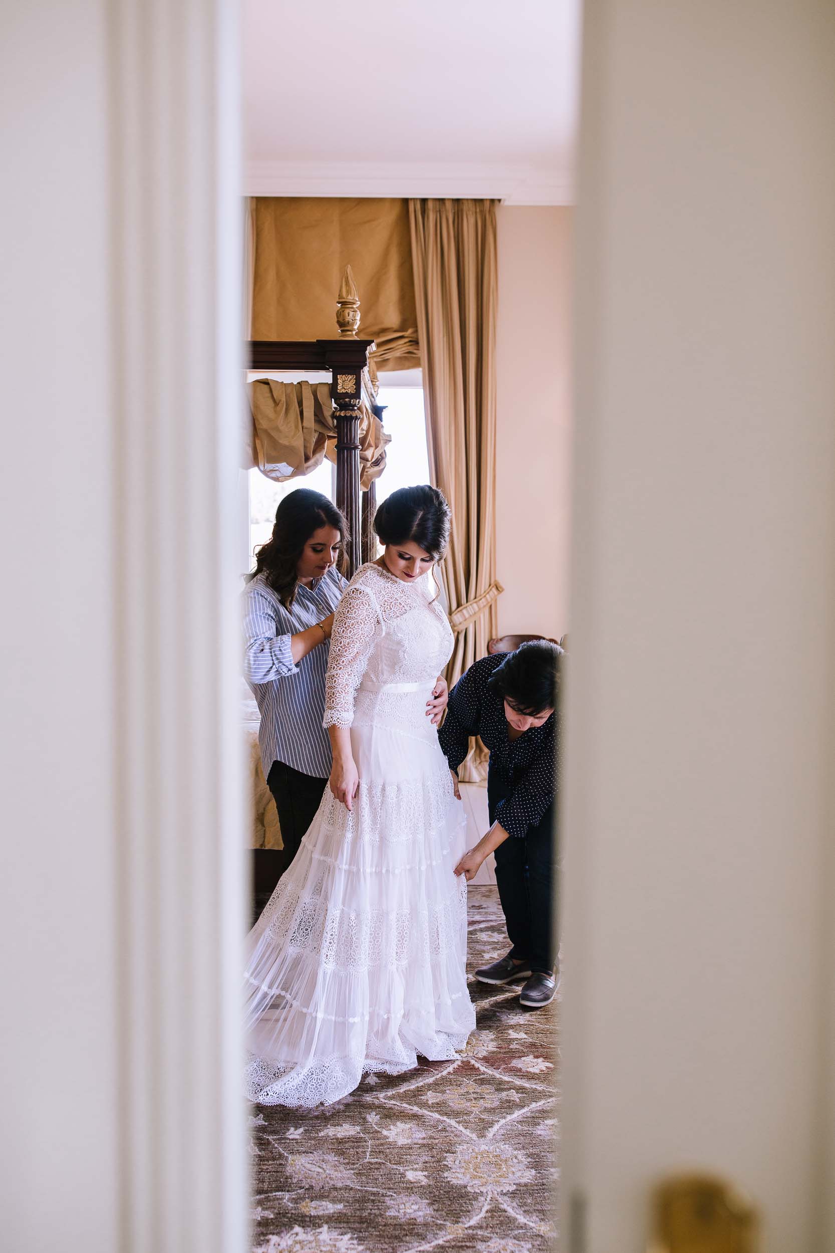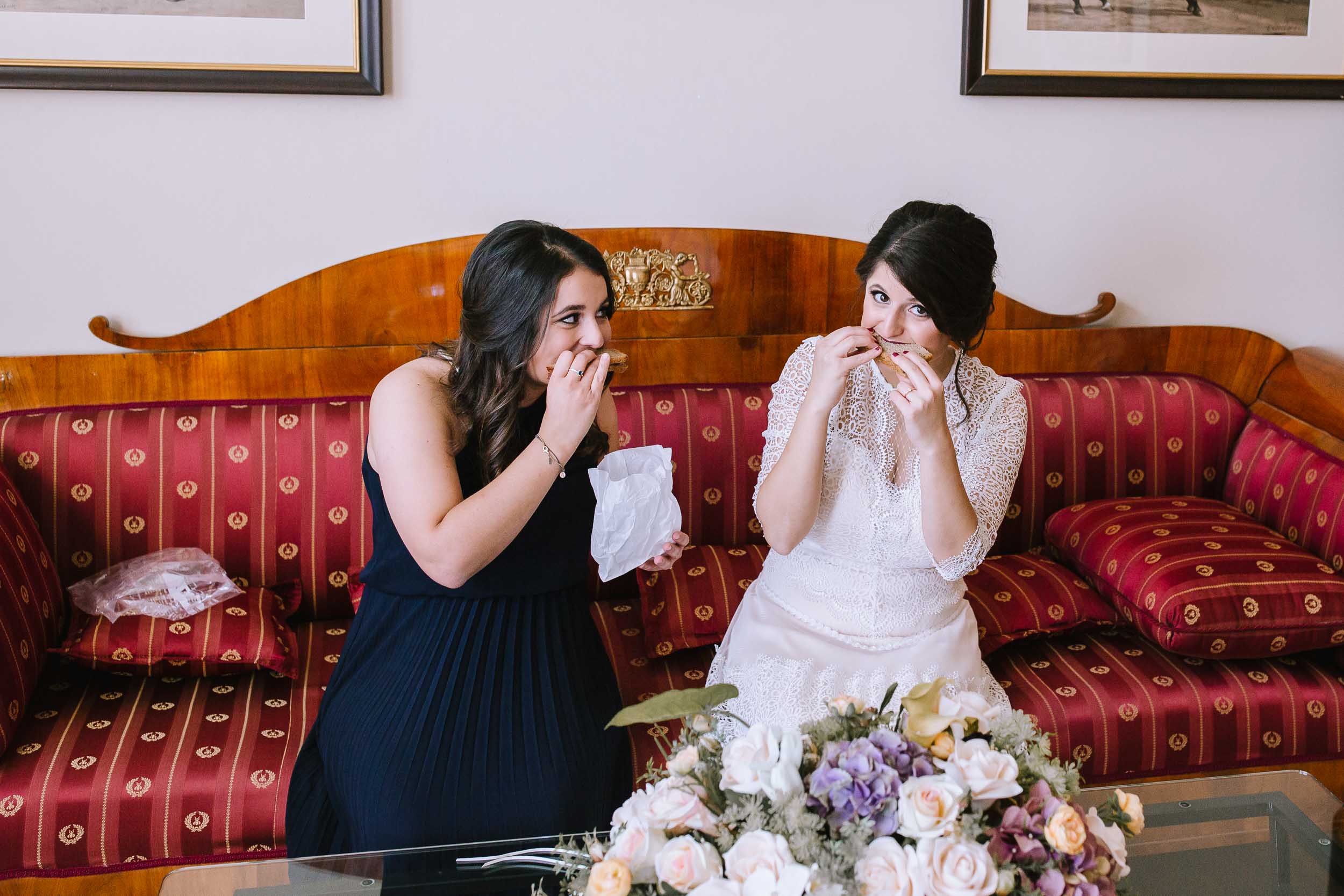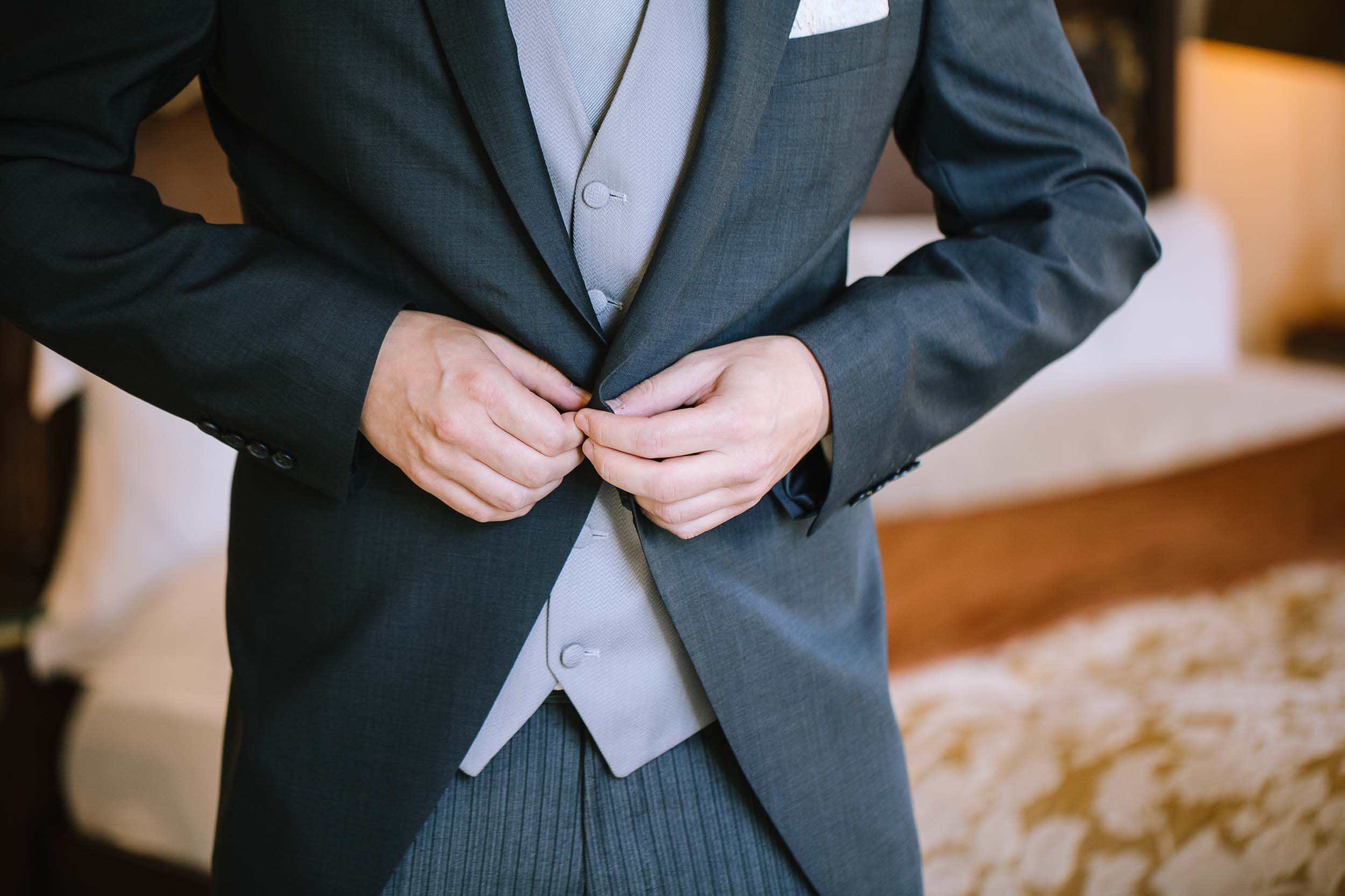 Schon beim Vorgespräch wirkte die Location wirklich beeindruckend auf mich. Das schöne Hotel, die riesige Festscheune, das wunderschöne Gelände mit vielen Ecken, die sich perfekt fĂĽr das Brautpaarshooting anbieten wĂĽrden. Am Tag der Hochzeit konnte ich das alte Herrenhaus von Gut Kump dann endlich auch von innen sehen und war hin und weg. Ein luxuriös, aber trotzdem schlicht eingerichtetes Zimmer mit einer riesigen Altbau-FlĂĽgeltĂĽr. Nachdem Lars fertig angekleidet war und wir alles im Kasten hatten, zog er sich in einen anderen Bereich des Hotels zurĂĽck, damit auch Sonja sich mit ihren zauberhaften Brautjungfern hier ankleiden konnte. Nachdem auch Sonja fertig war, kamen zum Schluss noch ihre Eltern vorbei und waren ganz hin und weg von ihrer schönen Tochter – genau wie ich und alle anderen auch! Doch bevor es zur freien Trauung ging, stand uns noch ein ganz wesentliches Highlight bevor: das First-Look-Shooting. Als Sonja aus dem Haus kam, stand Lars schon am Ende einer kleinen BrĂĽcke direkt vor einem kleinen Blumengarten. Was fĂĽr eine perfekte Shootinglocation!Â