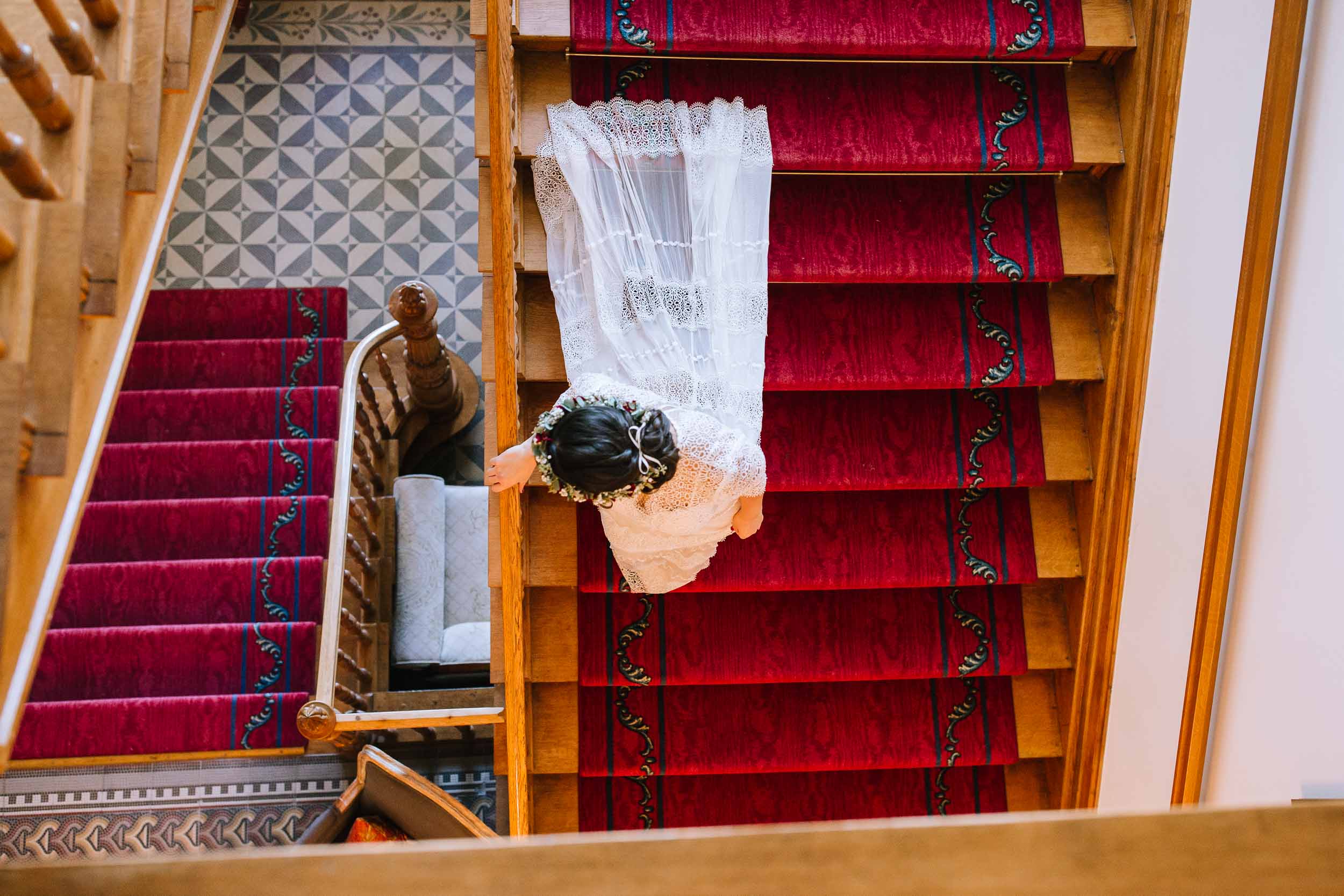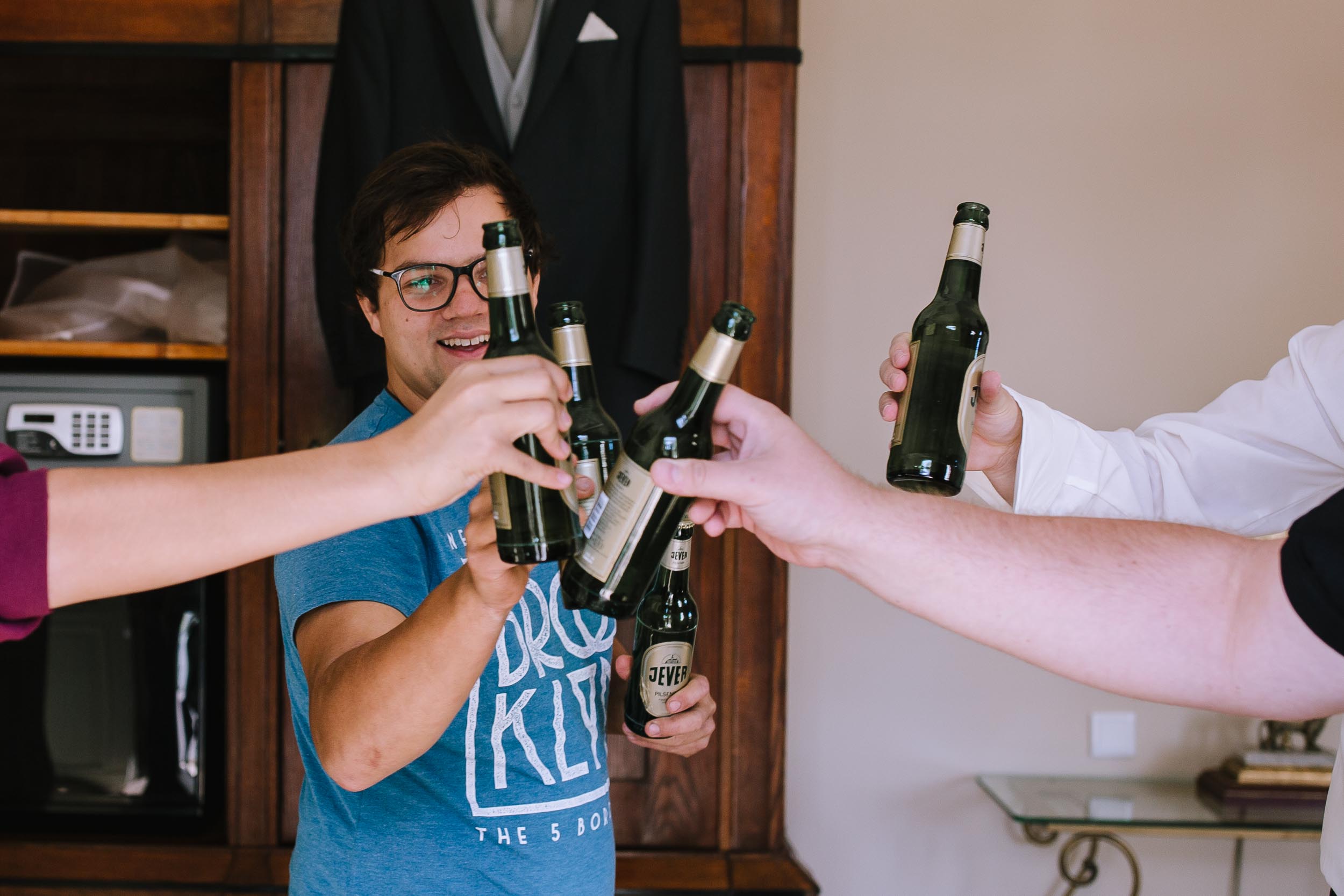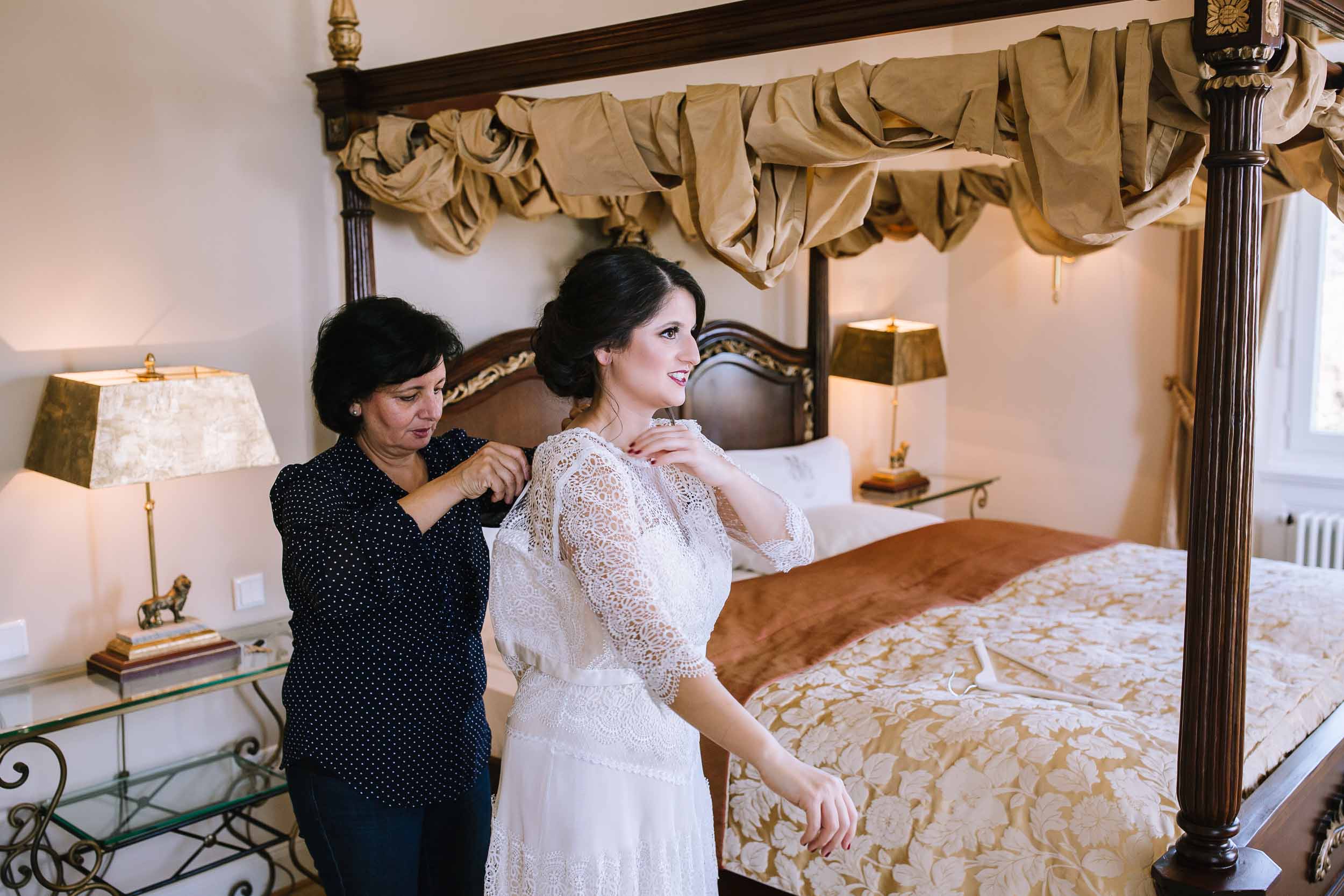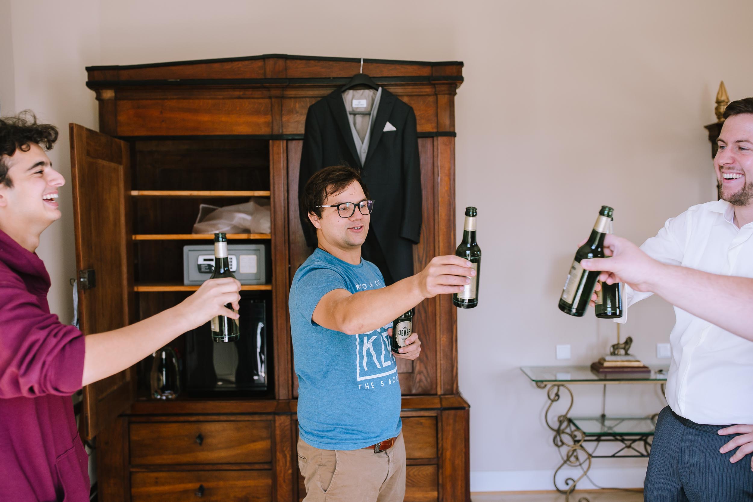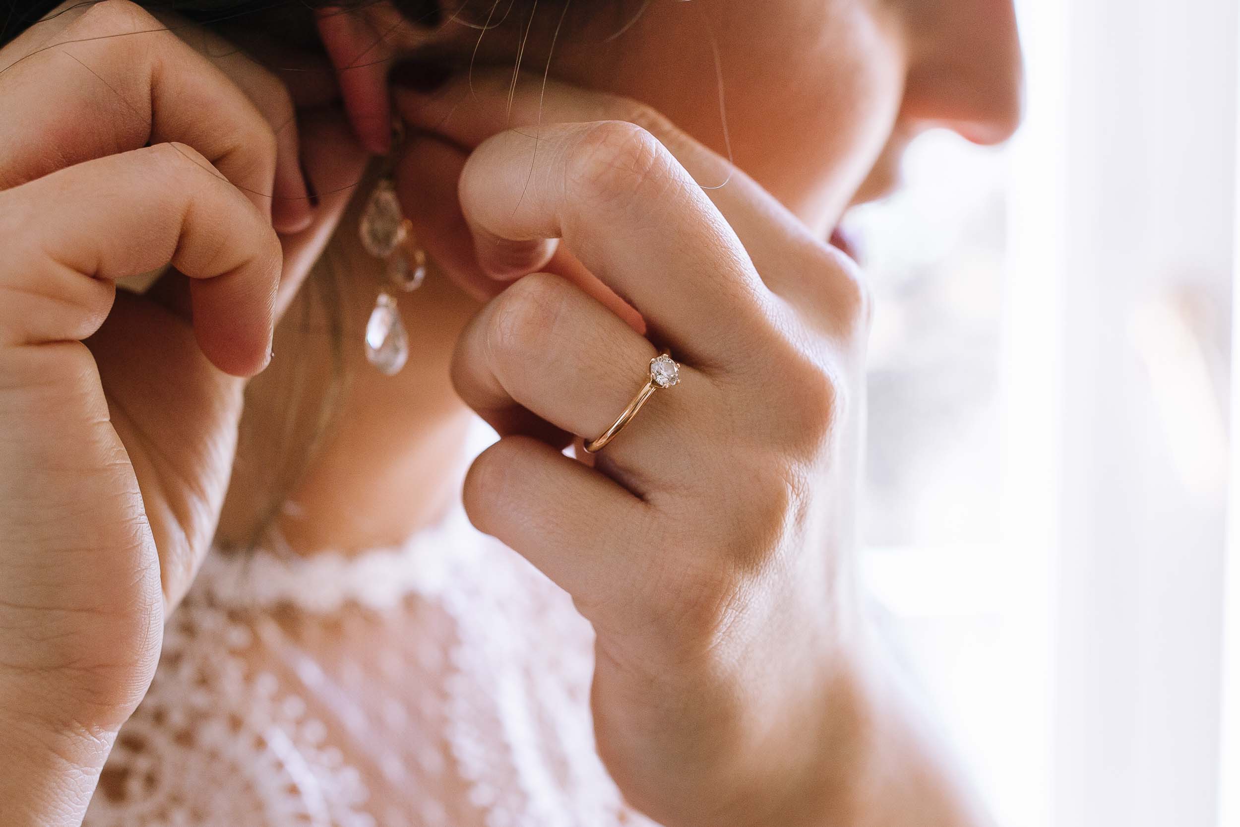 Schon beim Vorgespräch wirkte die Location wirklich beeindruckend auf mich. Das schöne Hotel, die riesige Festscheune, das wunderschöne Gelände mit vielen Ecken, die sich perfekt fĂĽr das Brautpaarshooting anbieten wĂĽrden. Am Tag der Hochzeit konnte ich das alte Herrenhaus von Gut Kump dann endlich auch von innen sehen und war hin und weg. Ein luxuriös, aber trotzdem schlicht eingerichtetes Zimmer mit einer riesigen Altbau-FlĂĽgeltĂĽr. Nachdem Lars fertig angekleidet war und wir alles im Kasten hatten, zog er sich in einen anderen Bereich des Hotels zurĂĽck, damit auch Sonja sich mit ihren zauberhaften Brautjungfern hier ankleiden konnte. Nachdem auch Sonja fertig war, kamen zum Schluss noch ihre Eltern vorbei und waren ganz hin und weg von ihrer schönen Tochter – genau wie ich und alle anderen auch! Doch bevor es zur freien Trauung ging, stand uns noch ein ganz wesentliches Highlight bevor: das First-Look-Shooting. Als Sonja aus dem Haus kam, stand Lars schon am Ende einer kleinen BrĂĽcke direkt vor einem kleinen Blumengarten. Was fĂĽr eine perfekte Shootinglocation!Â