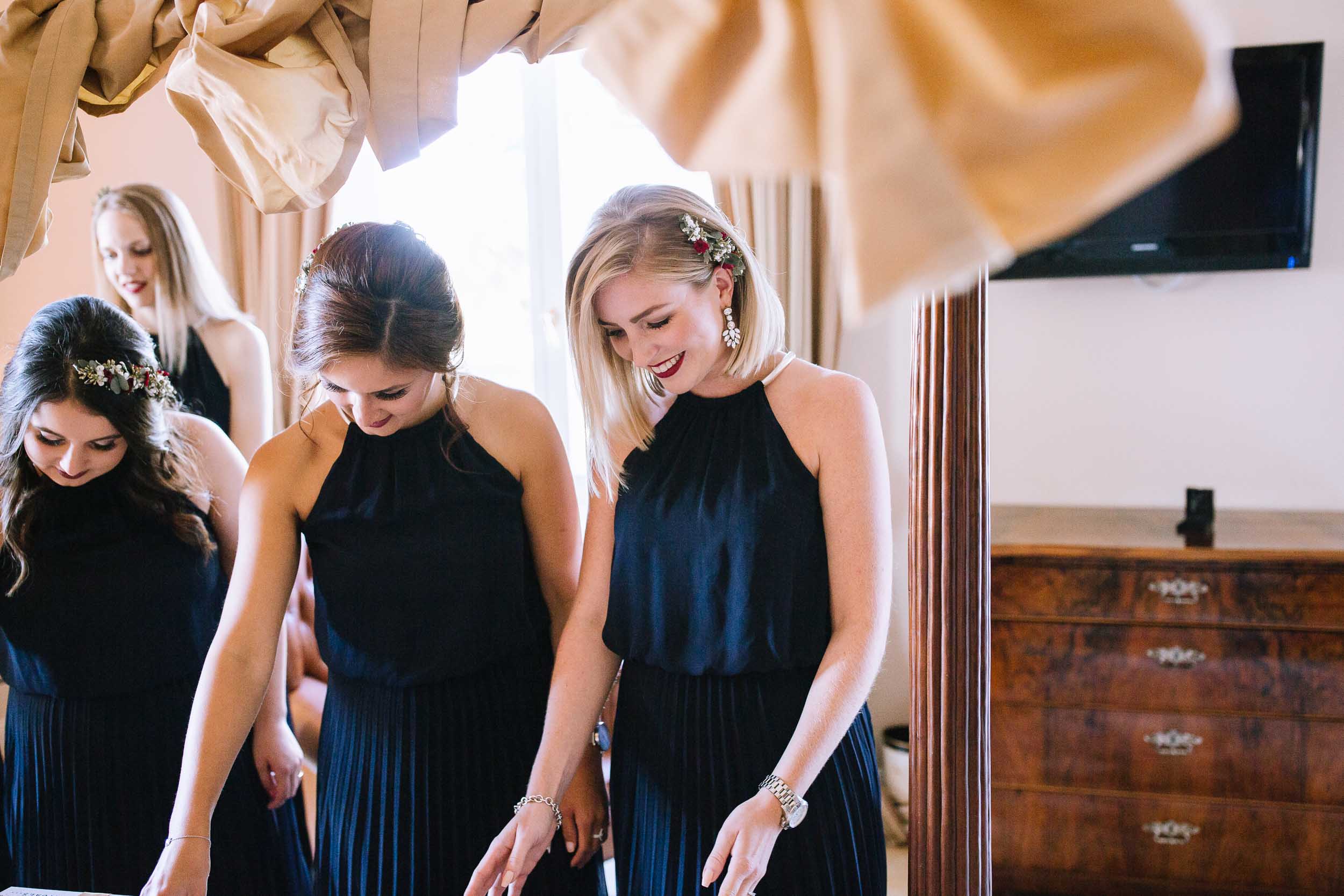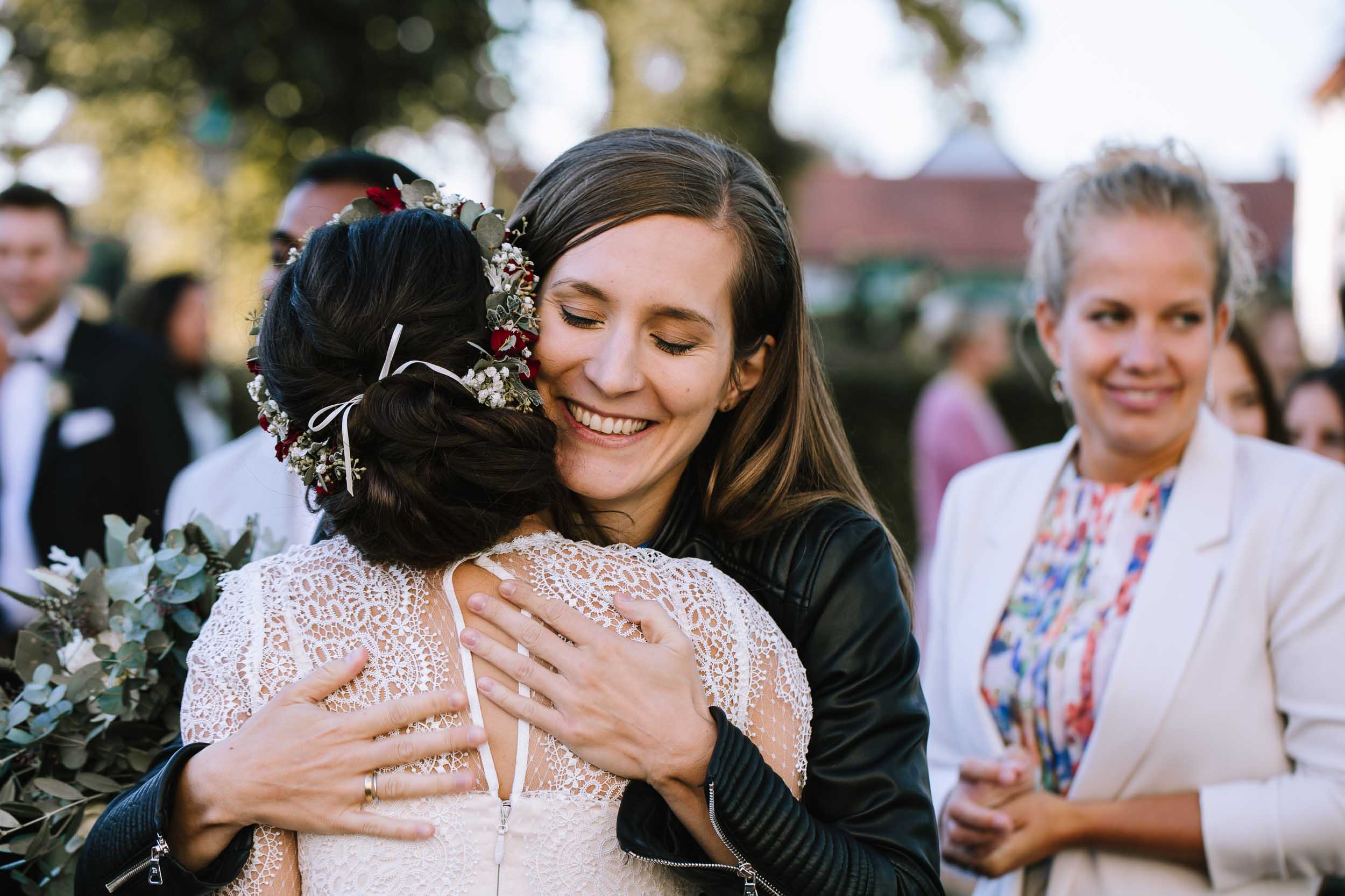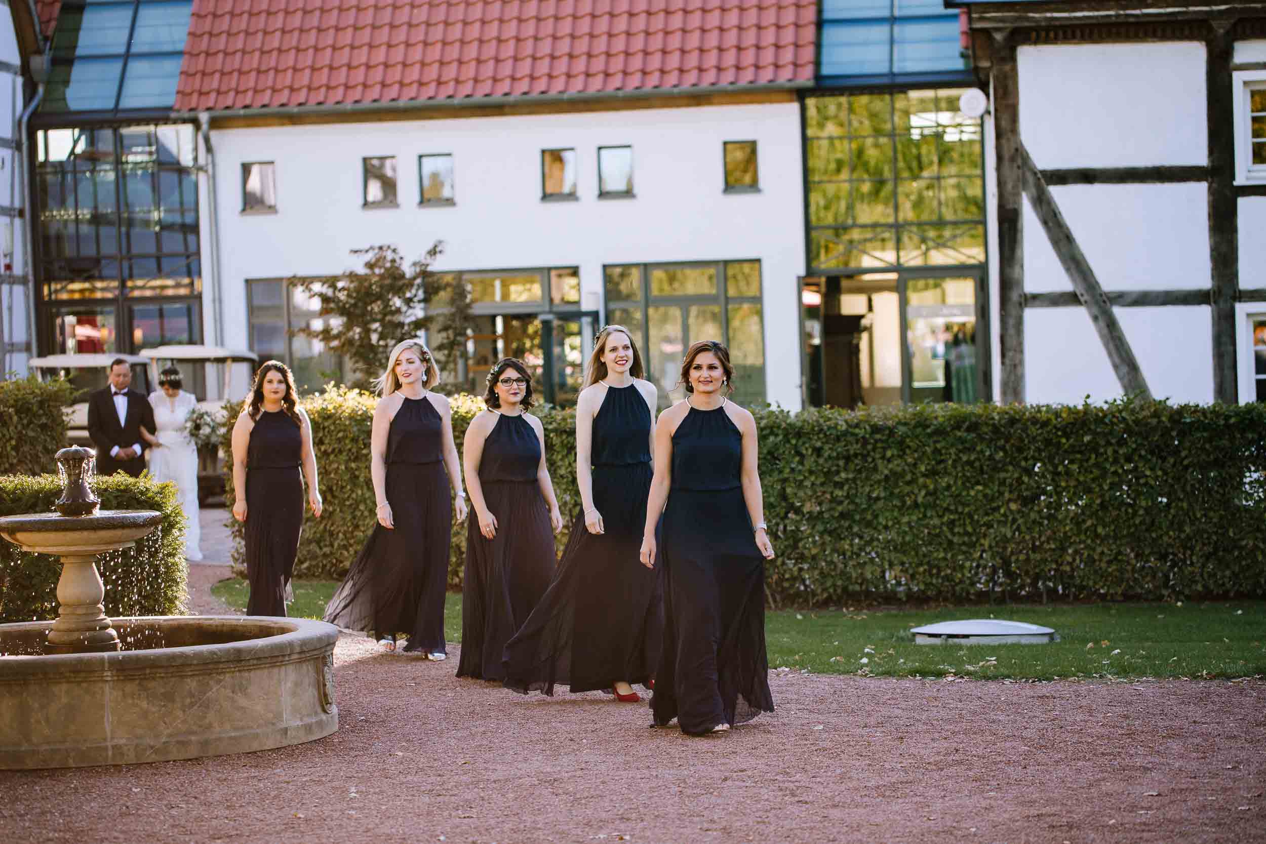 Während alle anderen sich bereits auf den Weg zum Ort der freien Trauung gemacht hatten, ging Sonja nochmal in ihre Suite, um ihren Brautjungfern ihre hĂĽbsch verpackten Geschenke zu ĂĽberreichen. Danach ging es auch schon los. Sonja kam – begleitet von ihrem Vater- und ihren Brautjungfern, die alle in wunderschönen, edlen dunkelblauen Kleidern gekleidet waren, den Weg entlang in Richtung Traubogen, wo ihr Mann Lars schon auf sie wartete. Die Trauung selbst war sehr emotional und wirklich schön! Nach der Gratulation gingen wir dann mit den engsten Verwandten und Freunden hinter das Herrenhaus, um die obligatorischen Gruppenfotos zu machen. Nachdem auch dieser Punkt abgehakt war, haben wir noch ein schönes Sunset-Shooting gemacht und sind anschlieĂźend zu den Gästen in die Festscheune gegangen, in der bis in die Nacht hinein ausgiebig gefeiert, gegessen und getanzt wurde. Diese Hochzeit habe ich ĂĽbrigens fĂĽr die liebe Imke von Pennie + Cam begleitet. Vielen Dank, dass ich dabei sein durfte!