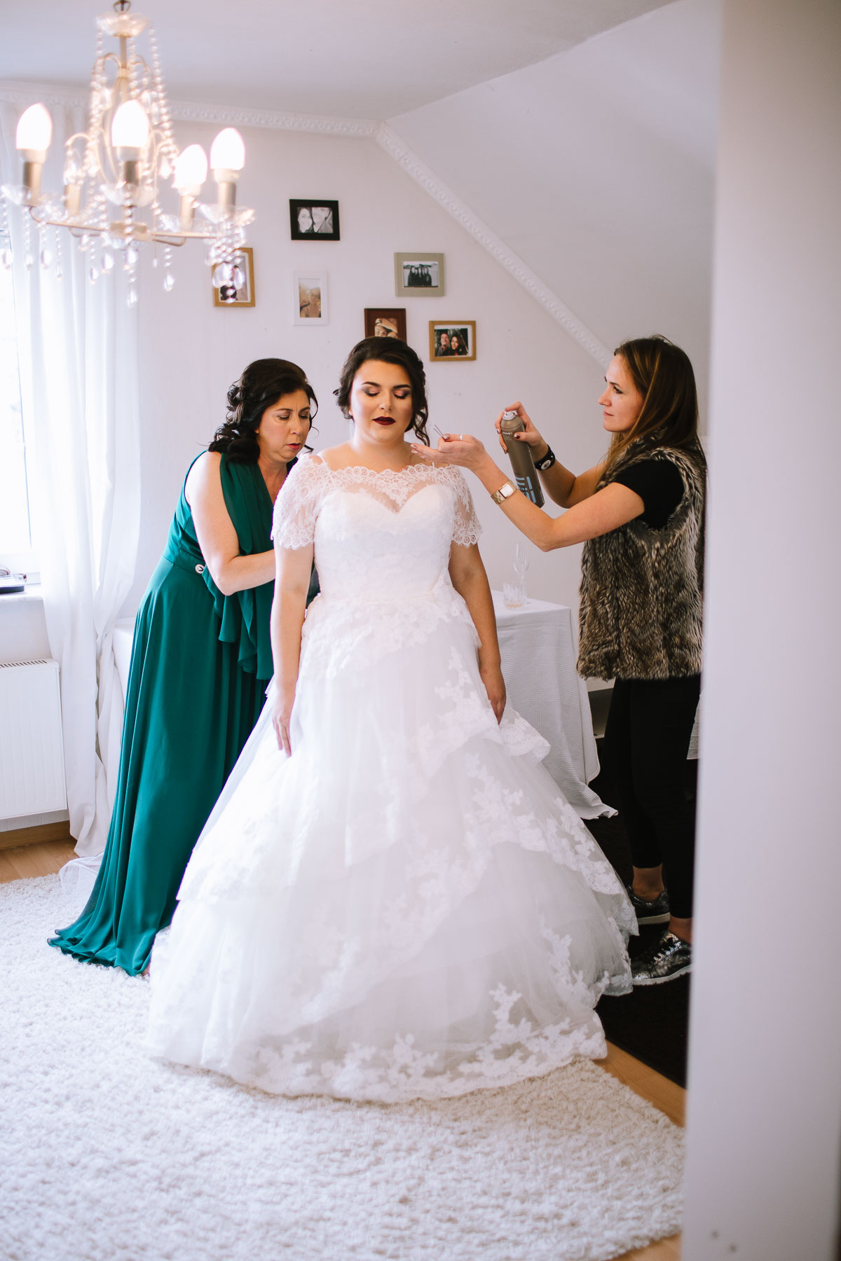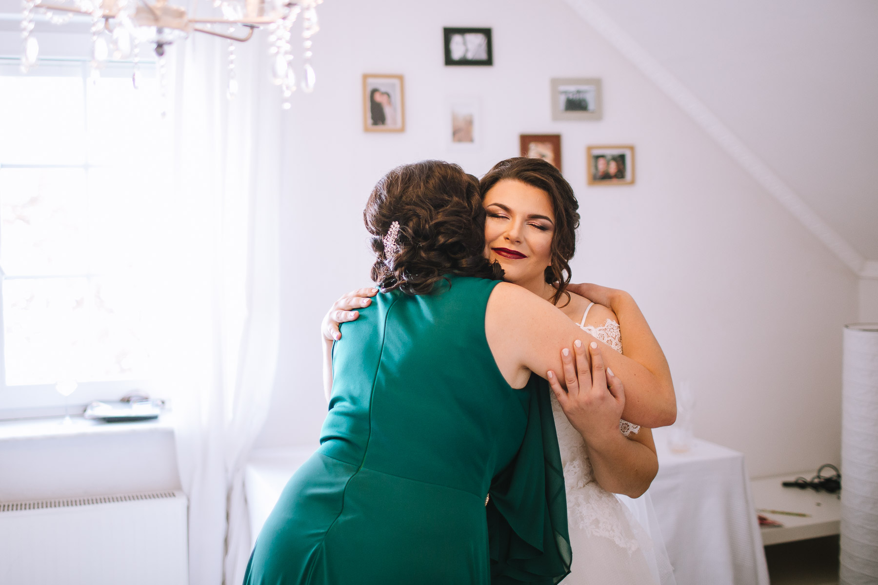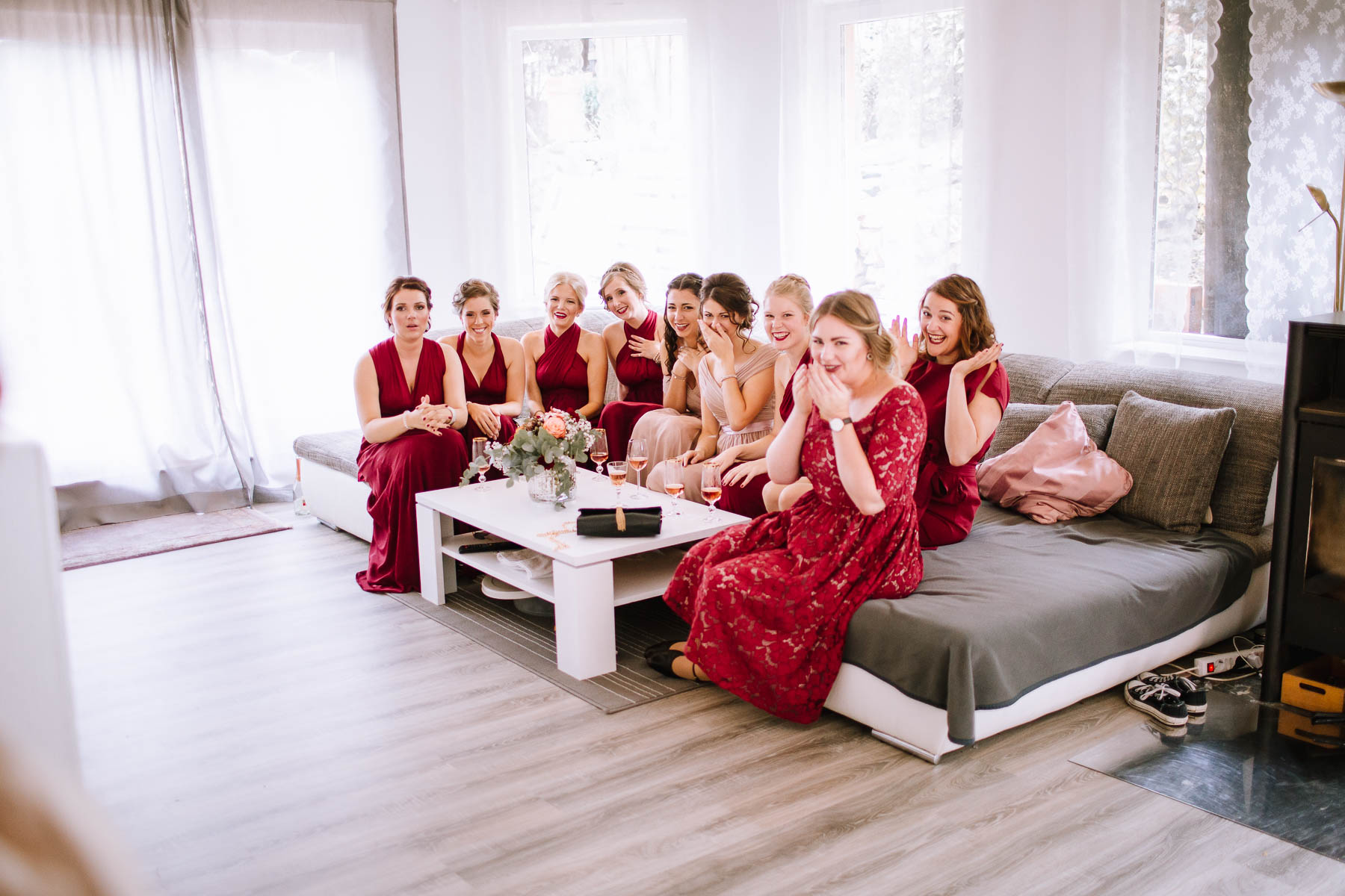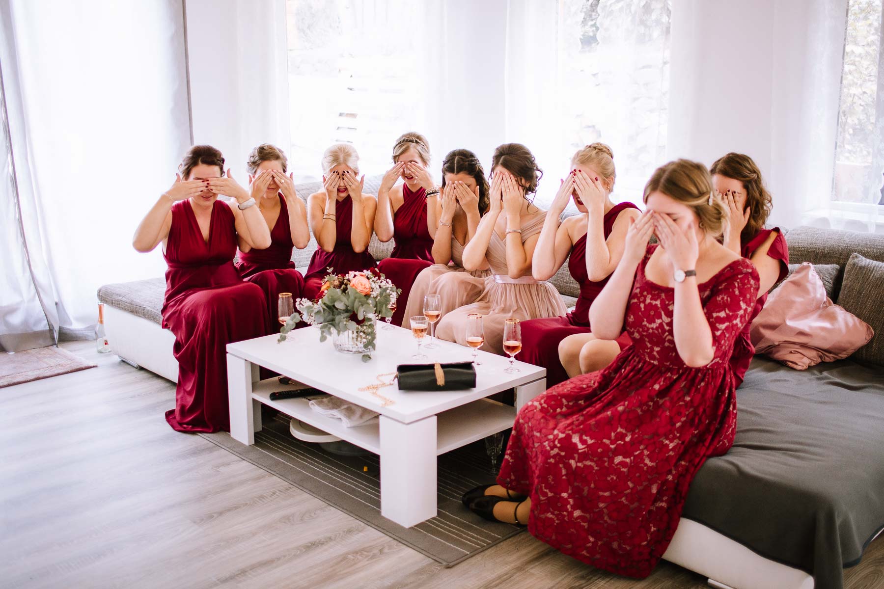 Wie in Annas Freundeskreis üblich – die Mädels kennen sich größten Teils schon seit der Grundschulzeit- trugen auch alle Brautjungfern dieselben Kleiner, was wunderschön aussah. Natürlich ließen sie es sich nicht nehmen, Anna beim Getting Ready in ihrem Elternhaus zur Seite zu stehen. Es war ein ganz schönes Gewusel, aber alle waren gut gelaunt und sorgten dafür, dass eine herzliche und emotionale Stimmung herrschte.