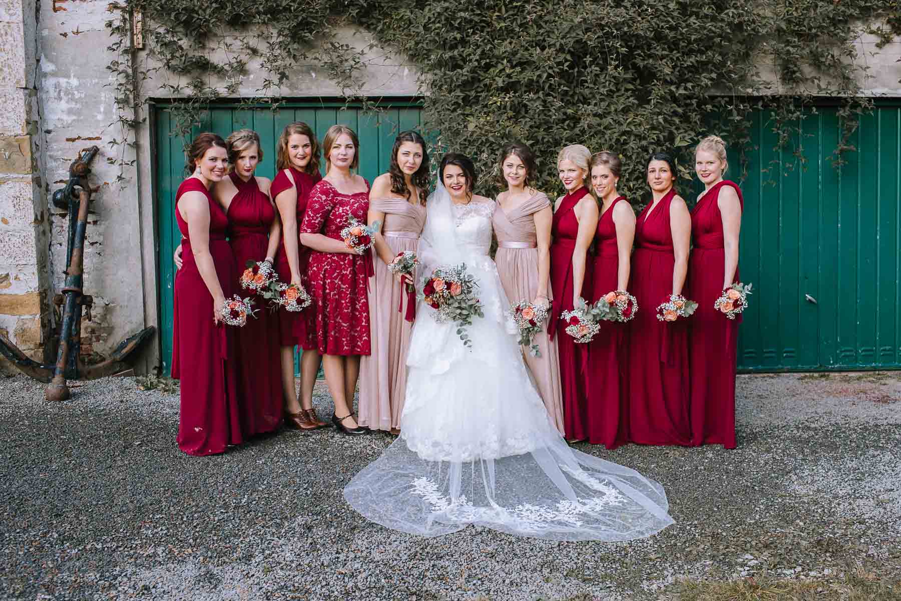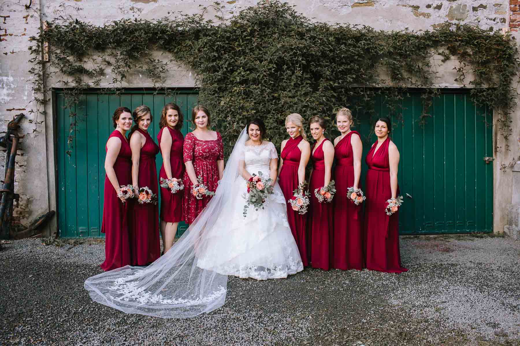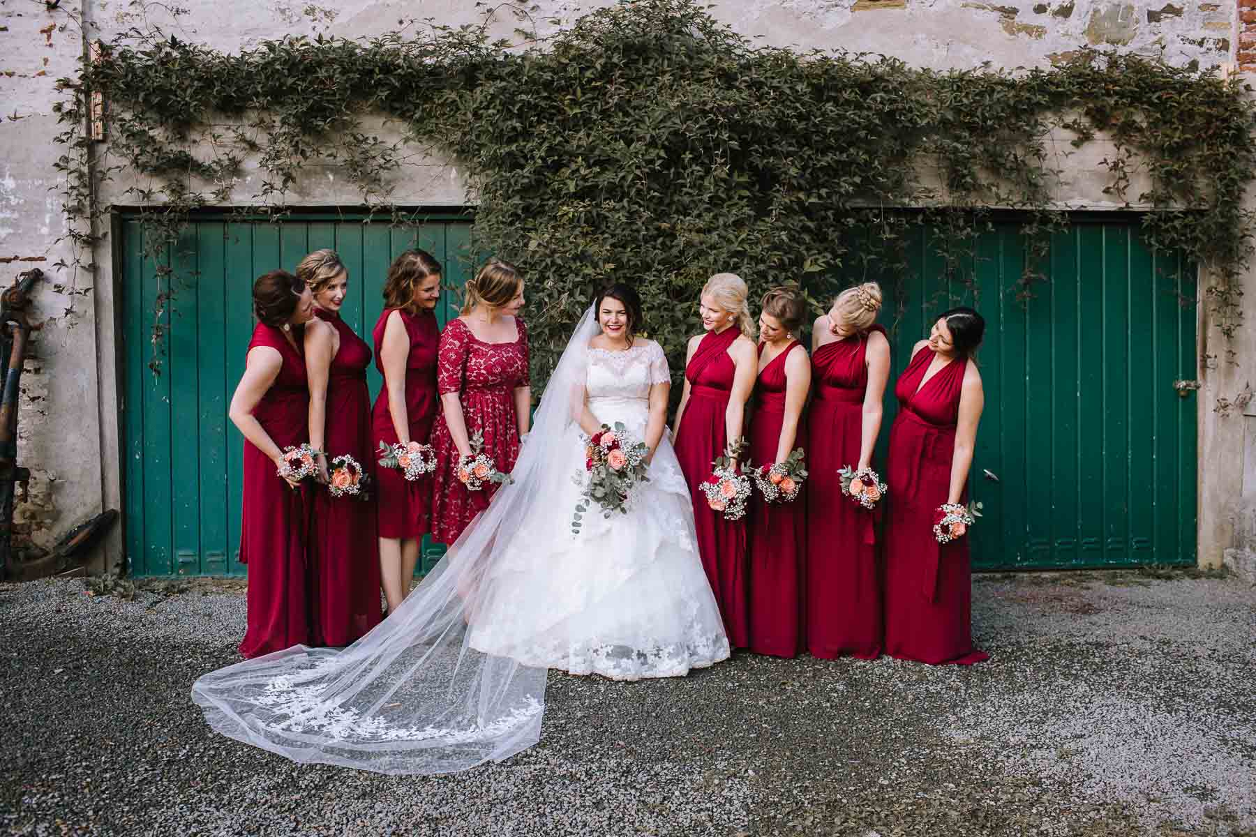 Wie in Annas Freundeskreis üblich – die Mädels kennen sich größten Teils schon seit der Grundschulzeit- trugen auch alle Brautjungfern dieselben Kleiner, was wunderschön aussah. Natürlich ließen sie es sich nicht nehmen, Anna beim Getting Ready in ihrem Elternhaus zur Seite zu stehen. Es war ein ganz schönes Gewusel, aber alle waren gut gelaunt und sorgten dafür, dass eine herzliche und emotionale Stimmung herrschte.