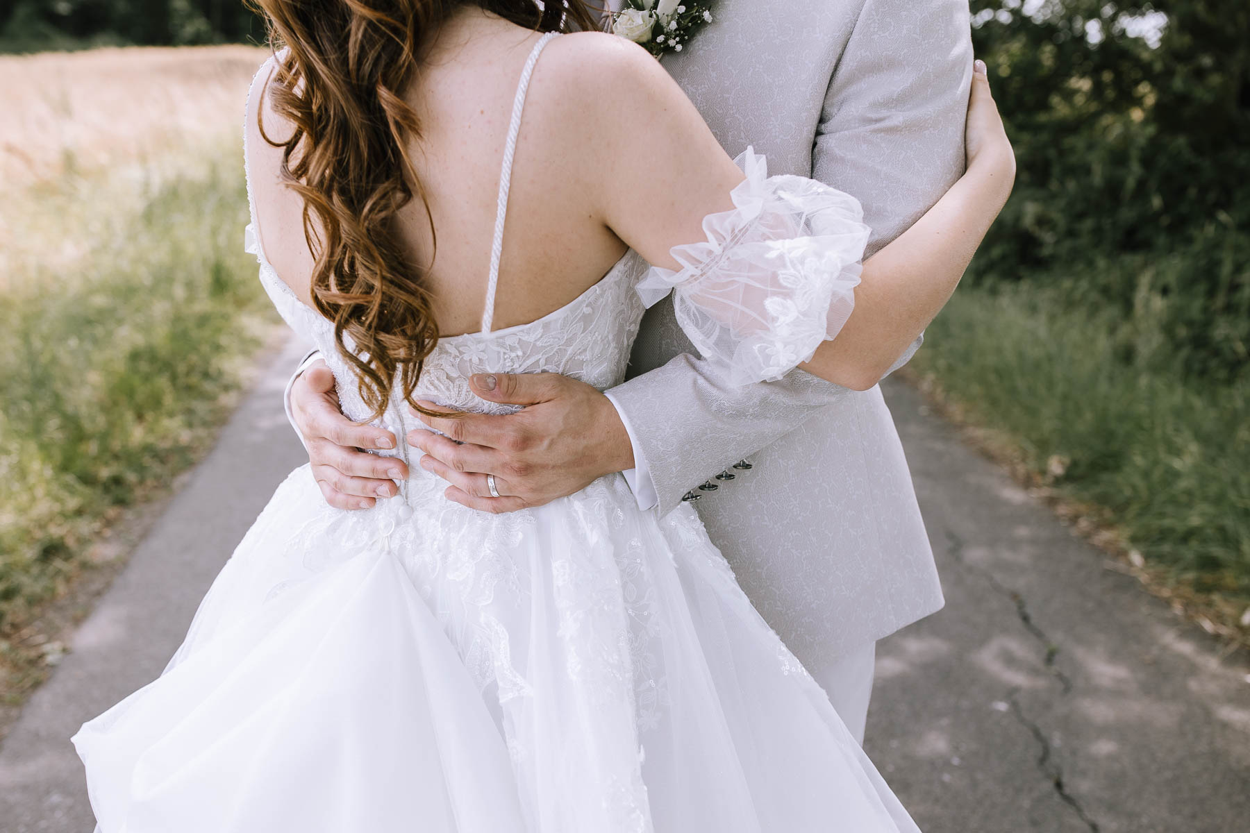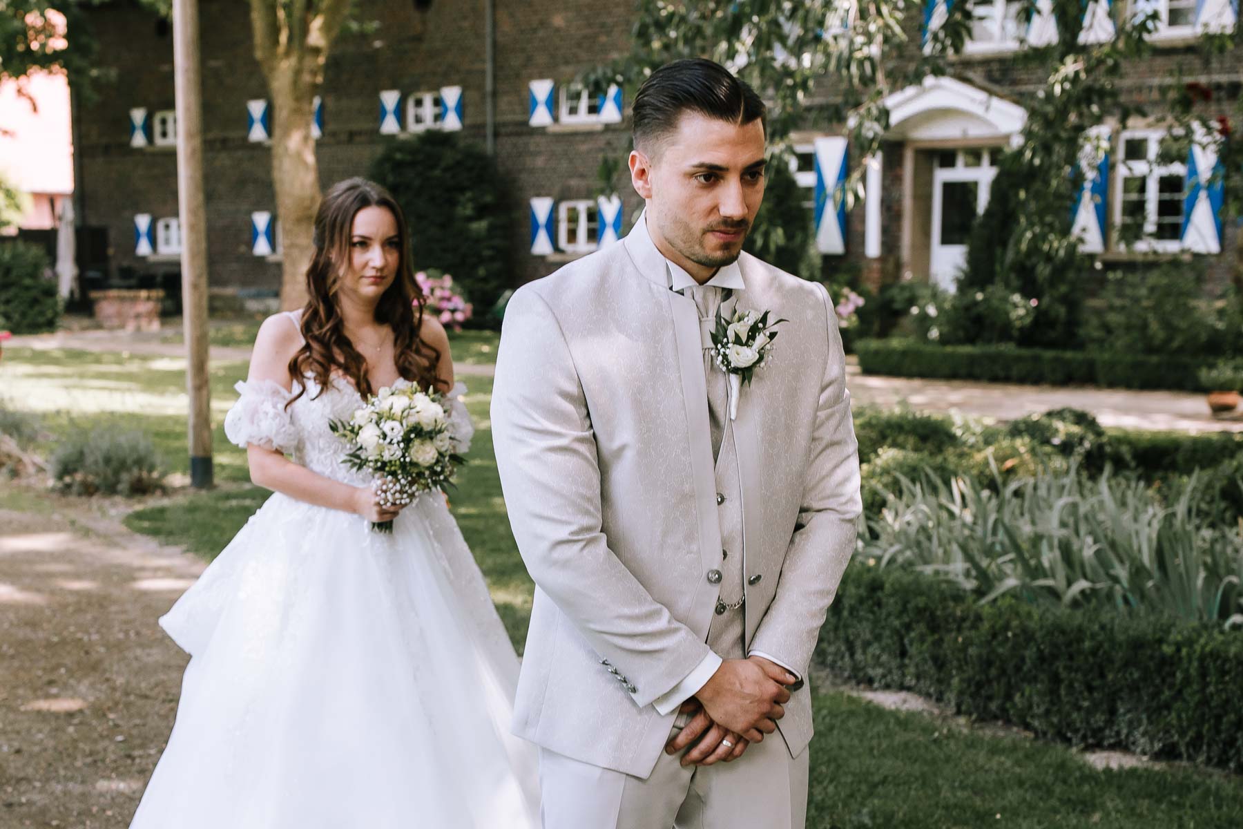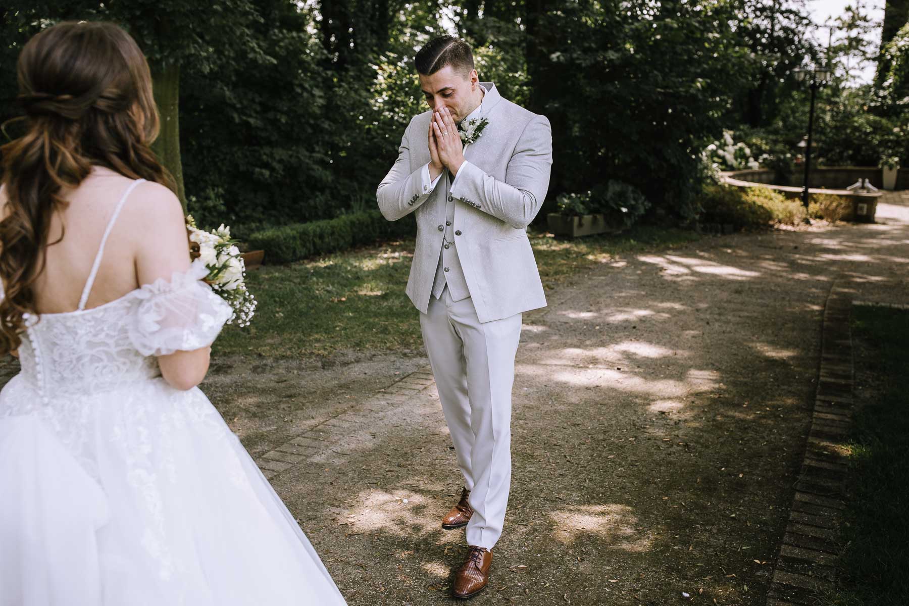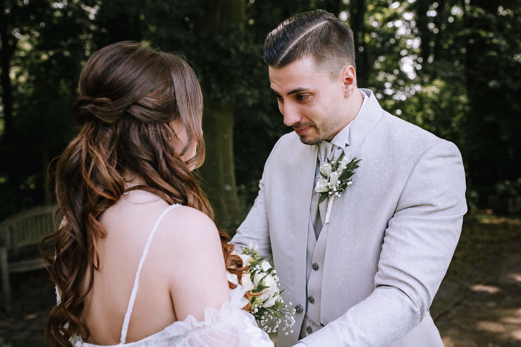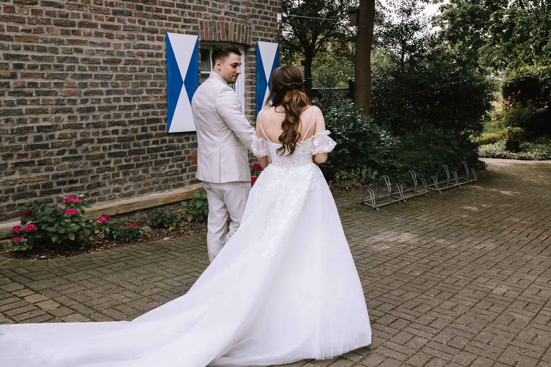Es gibt Hochzeiten, die einfach besonders sind – und die von Julia und Henning gehört definitiv dazu. Ich hatte das große Vergnügen, die beiden an ihrem großen Tag zu begleiten, und ich kann euch gar nicht sagen, wie viel Liebe, Emotionen und persönliche Details in diesem Tag steckten. Wenn ich an die Freie Trauung auf dem Hof Middendorf in Bergkamen zurückdenke, wird mir immer noch ganz warm ums Herz. Was mich immer wieder begeistert, ist der First-Look-Moment. Dieser Augenblick, wenn sich das Brautpaar das erste Mal sieht – ganz privat, ohne Zuschauer, nur sie zwei. Normalerweise ist der Bräutigam eher der entspannte Part, aber bei Henning war es etwas anderes. Ich hatte ihn vorher als richtig gelassenen Typen kennengelernt, der total entspannt wirkte. Doch als Julia die Ecke betrat, konnte er seine Emotionen nicht mehr zurückhalten. Es war so ein schöner Moment, weil man gesehen hat, wie tief die beiden miteinander verbunden sind. Julia, die in ihrem atemberaubenden Kleid auf ihn zukam, und Henning, der plötzlich ganz der gefühlvolle Mann war, der hinter der „coolen“ Fassade steckt.