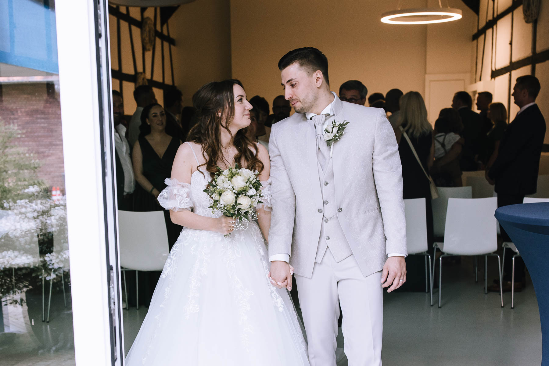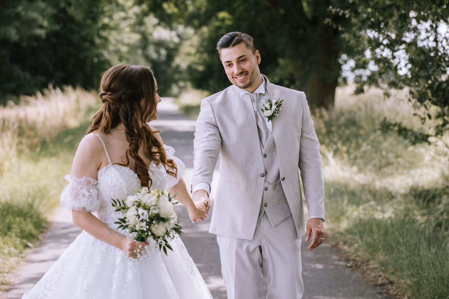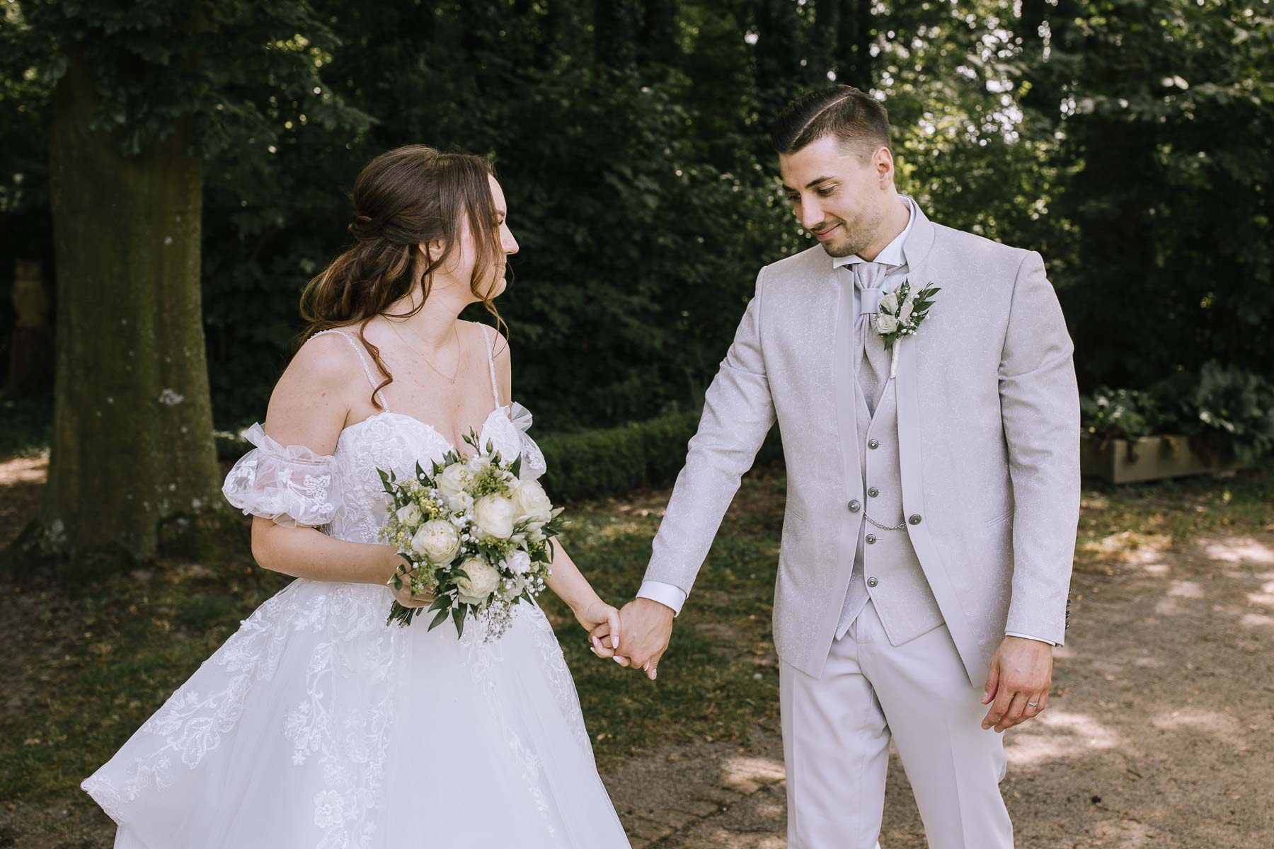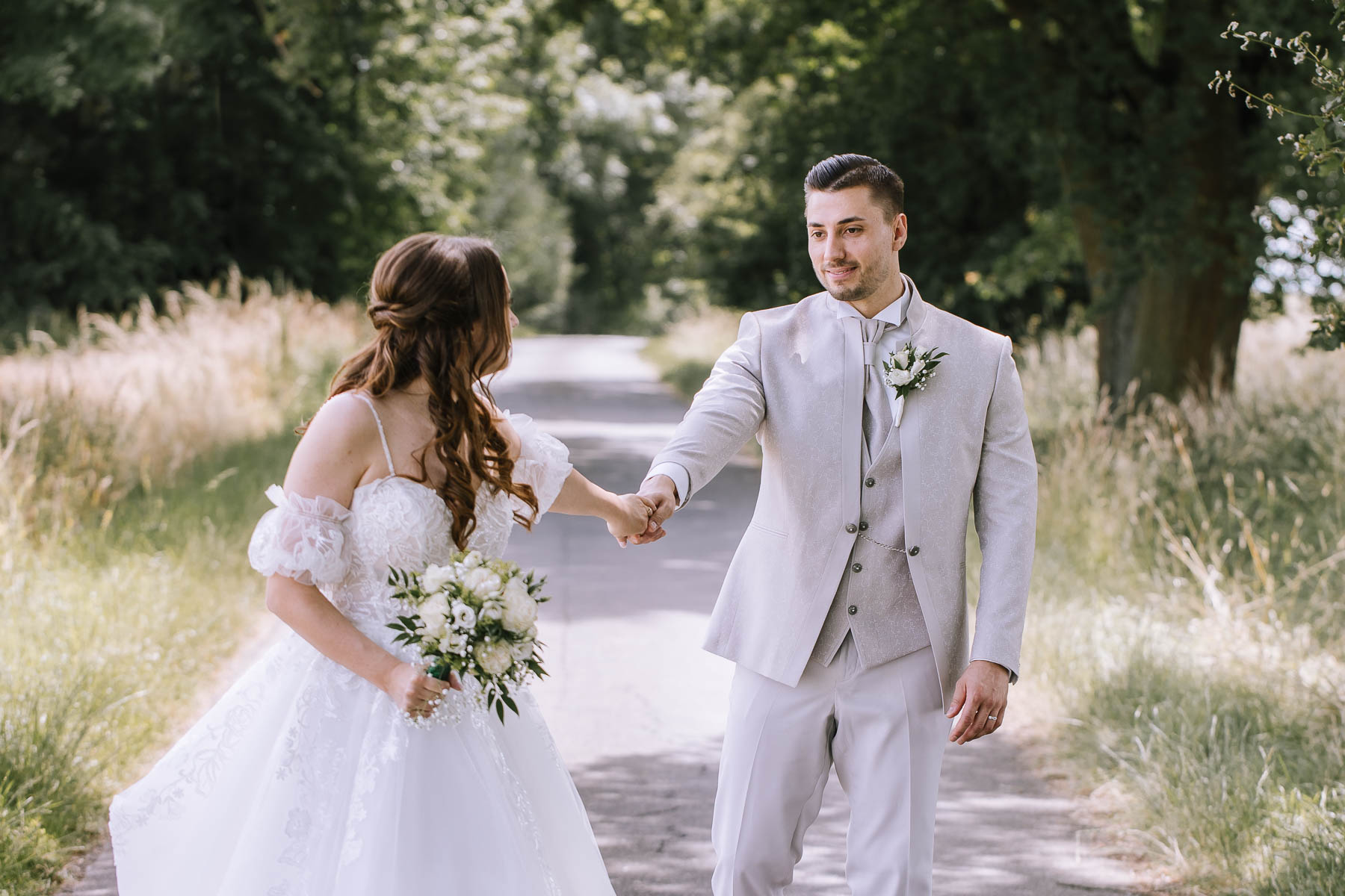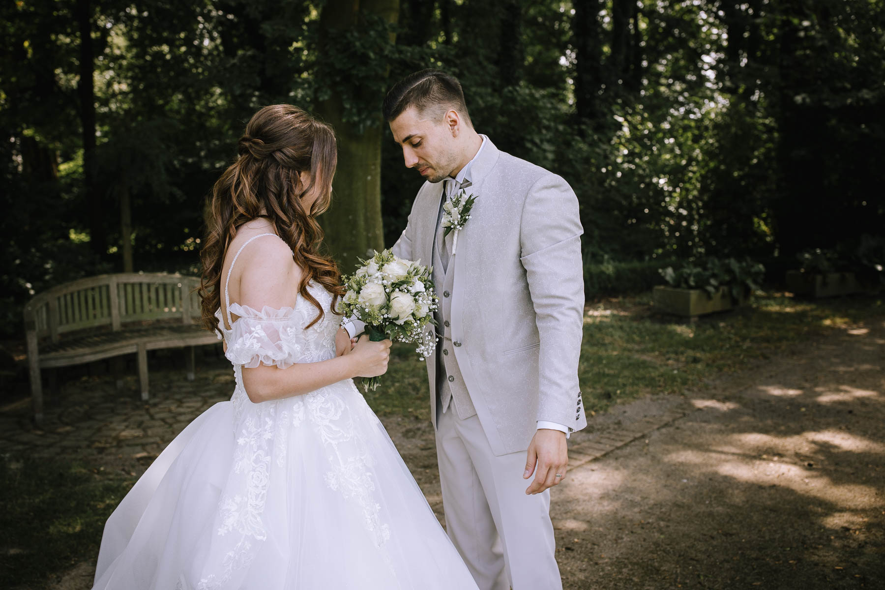 Es gibt Hochzeiten, die einfach besonders sind – und die von Julia und Henning gehört definitiv dazu. Ich hatte das große Vergnügen, die beiden an ihrem großen Tag zu begleiten, und ich kann euch gar nicht sagen, wie viel Liebe, Emotionen und persönliche Details in diesem Tag steckten. Wenn ich an die Freie Trauung auf dem Hof Middendorf in Bergkamen zurückdenke, wird mir immer noch ganz warm ums Herz. Was mich immer wieder begeistert, ist der First-Look-Moment. Dieser Augenblick, wenn sich das Brautpaar das erste Mal sieht – ganz privat, ohne Zuschauer, nur sie zwei. Normalerweise ist der Bräutigam eher der entspannte Part, aber bei Henning war es etwas anderes. Ich hatte ihn vorher als richtig gelassenen Typen kennengelernt, der total entspannt wirkte. Doch als Julia die Ecke betrat, konnte er seine Emotionen nicht mehr zurückhalten. Es war so ein schöner Moment, weil man gesehen hat, wie tief die beiden miteinander verbunden sind. Julia, die in ihrem atemberaubenden Kleid auf ihn zukam, und Henning, der plötzlich ganz der gefühlvolle Mann war, der hinter der „coolen“ Fassade steckt.