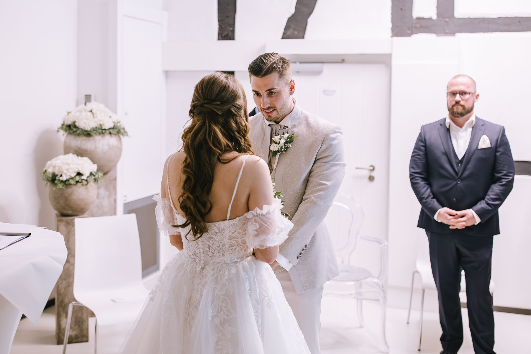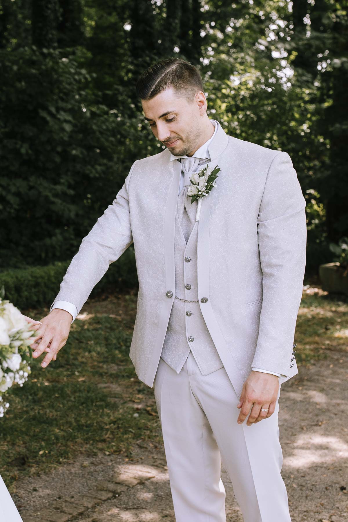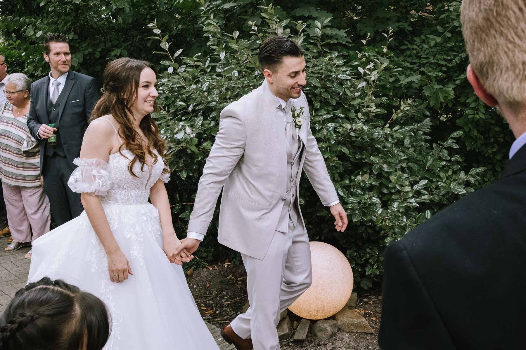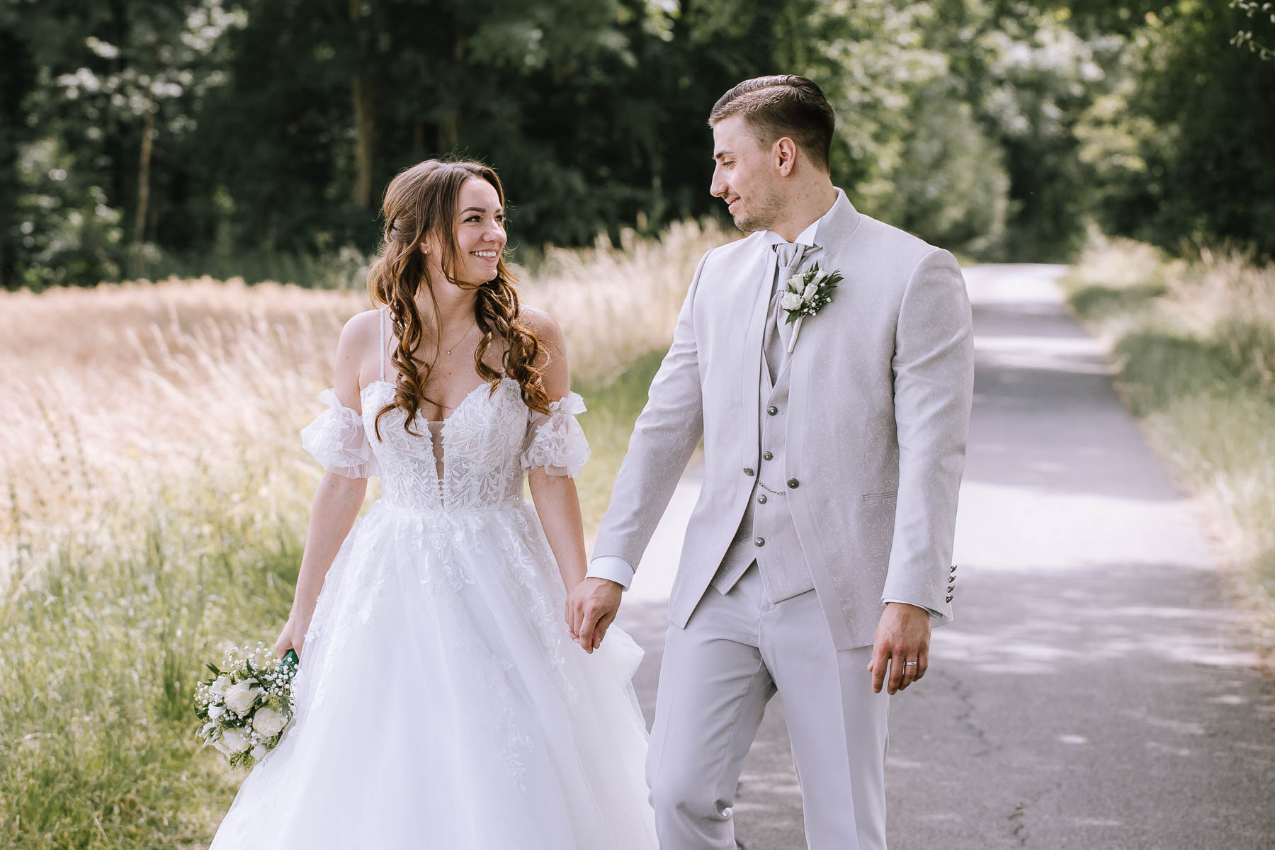 Es gibt Hochzeiten, die einfach besonders sind – und die von Julia und Henning gehört definitiv dazu. Ich hatte das große Vergnügen, die beiden an ihrem großen Tag zu begleiten, und ich kann euch gar nicht sagen, wie viel Liebe, Emotionen und persönliche Details in diesem Tag steckten. Wenn ich an die Freie Trauung auf dem Hof Middendorf in Bergkamen zurückdenke, wird mir immer noch ganz warm ums Herz. Was mich immer wieder begeistert, ist der First-Look-Moment. Dieser Augenblick, wenn sich das Brautpaar das erste Mal sieht – ganz privat, ohne Zuschauer, nur sie zwei. Normalerweise ist der Bräutigam eher der entspannte Part, aber bei Henning war es etwas anderes. Ich hatte ihn vorher als richtig gelassenen Typen kennengelernt, der total entspannt wirkte. Doch als Julia die Ecke betrat, konnte er seine Emotionen nicht mehr zurückhalten. Es war so ein schöner Moment, weil man gesehen hat, wie tief die beiden miteinander verbunden sind. Julia, die in ihrem atemberaubenden Kleid auf ihn zukam, und Henning, der plötzlich ganz der gefühlvolle Mann war, der hinter der „coolen“ Fassade steckt.