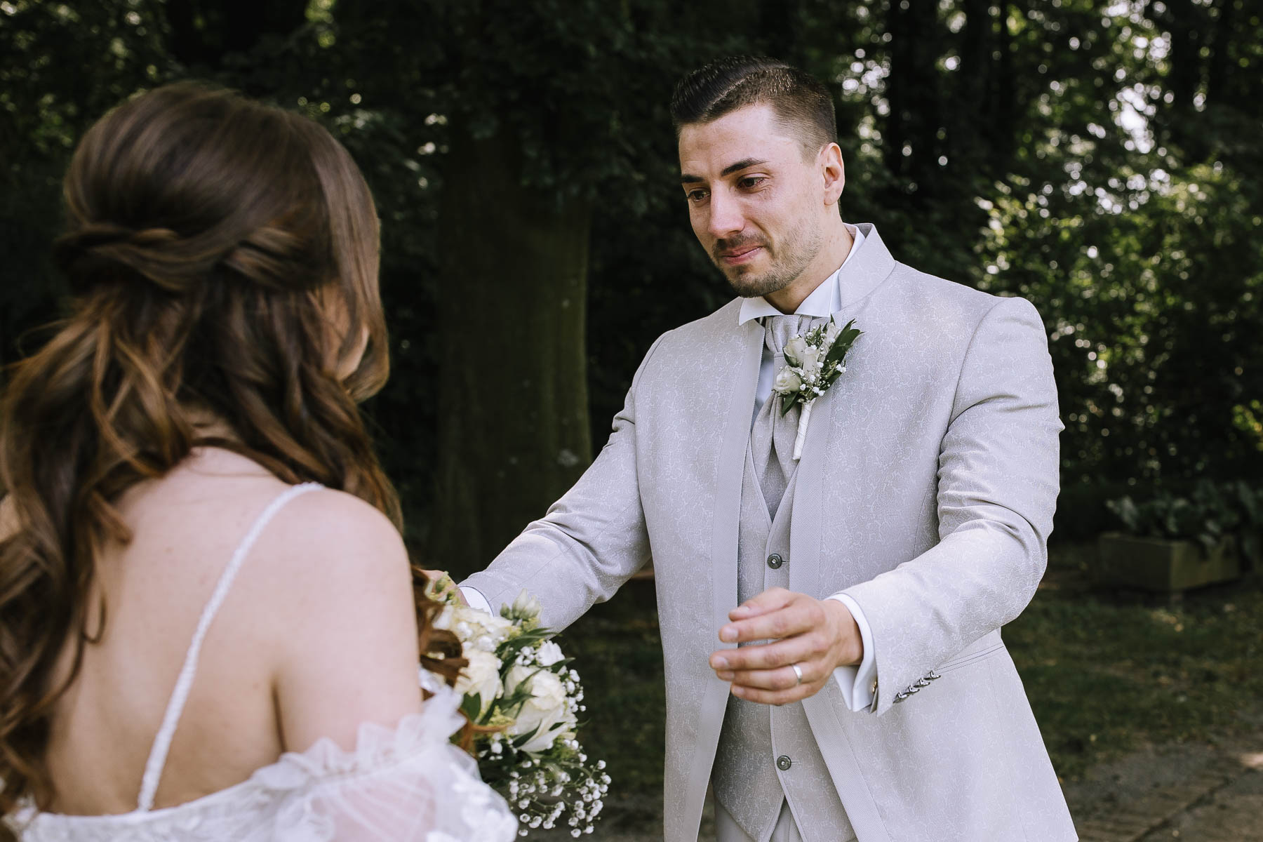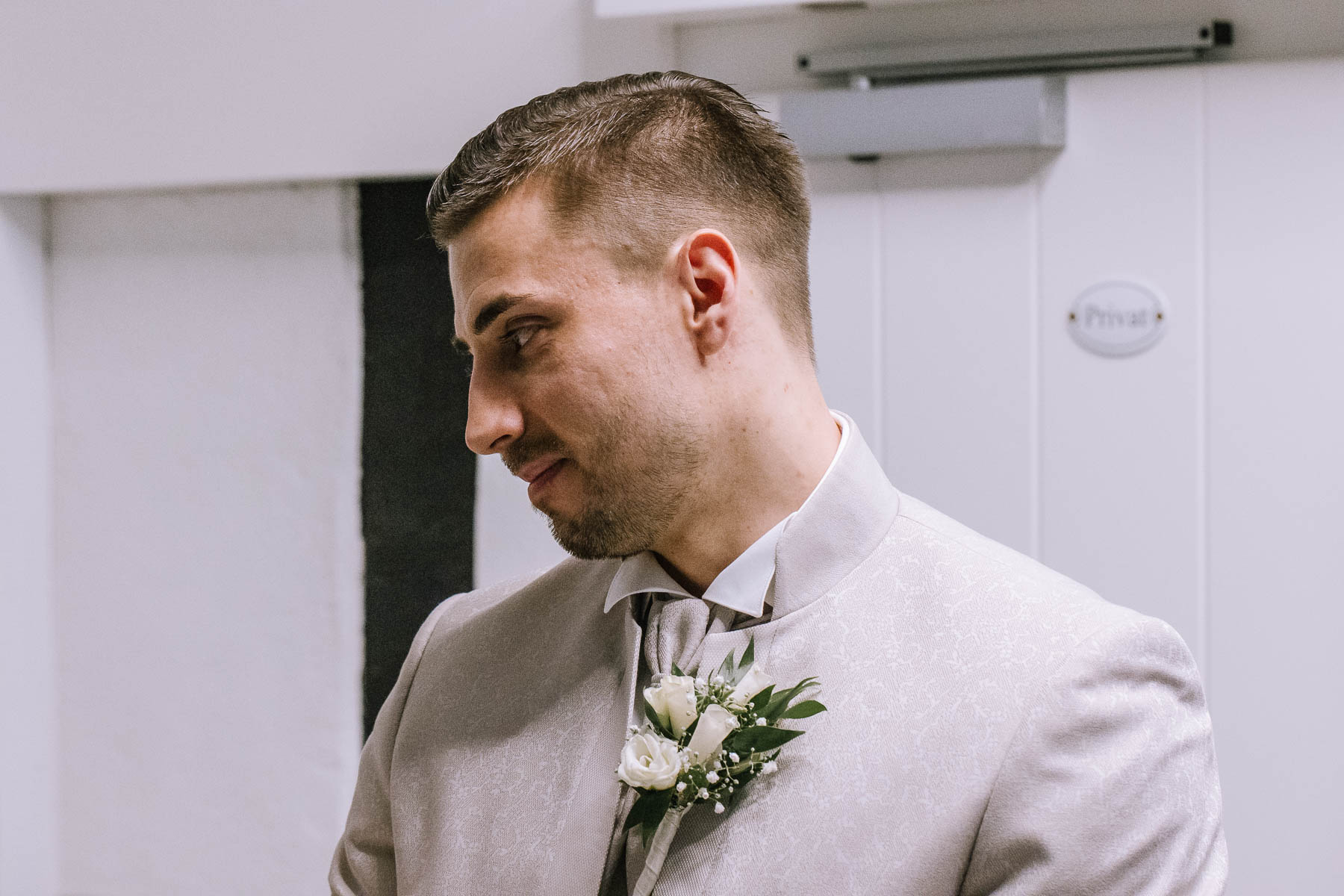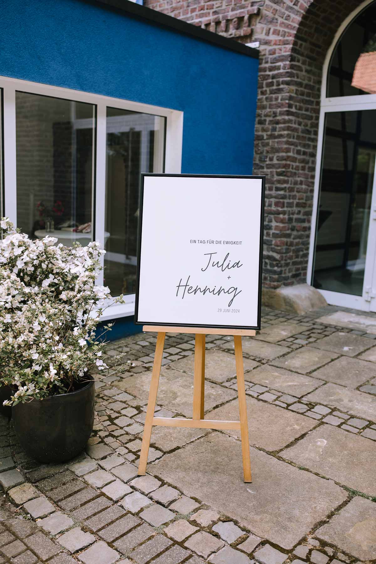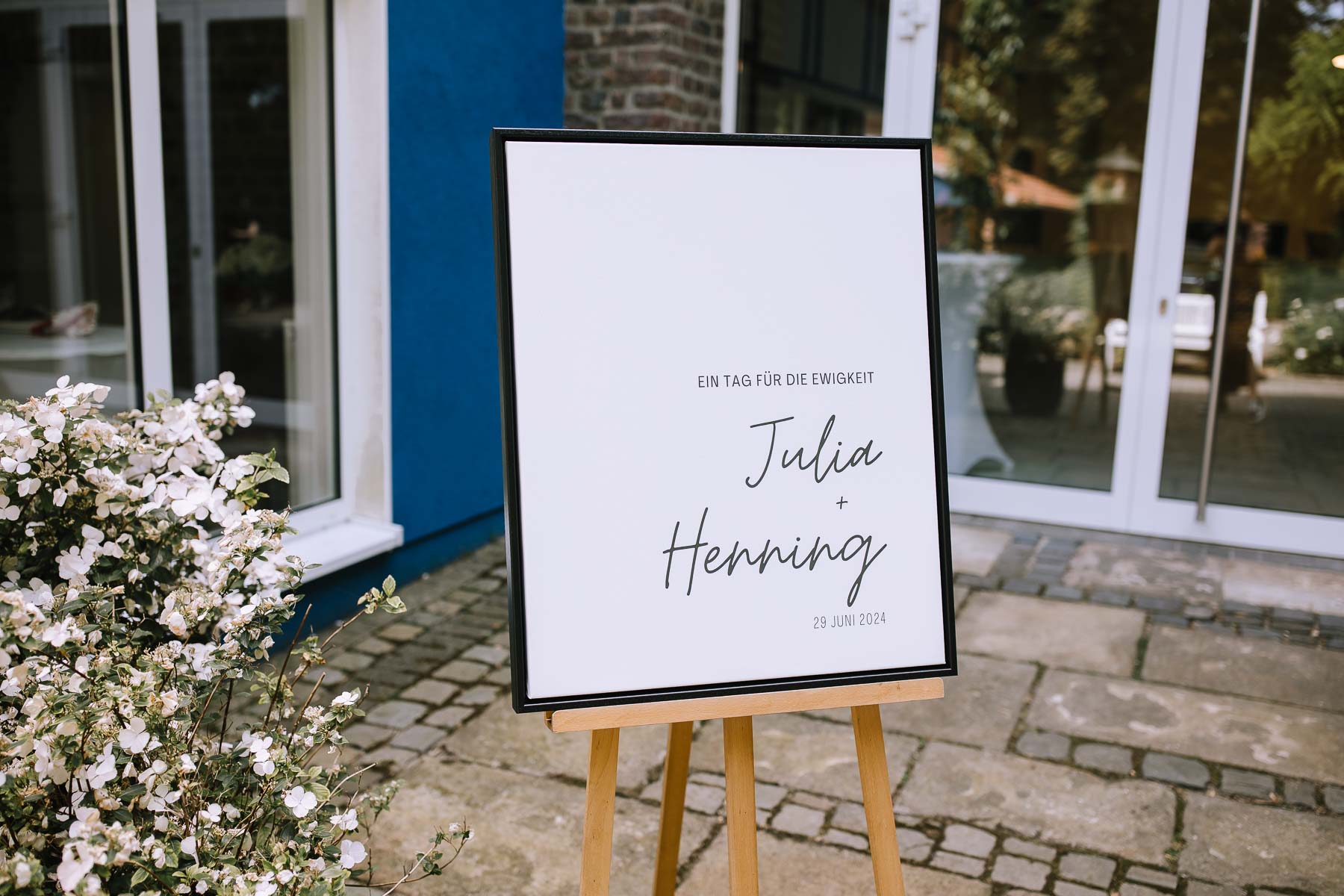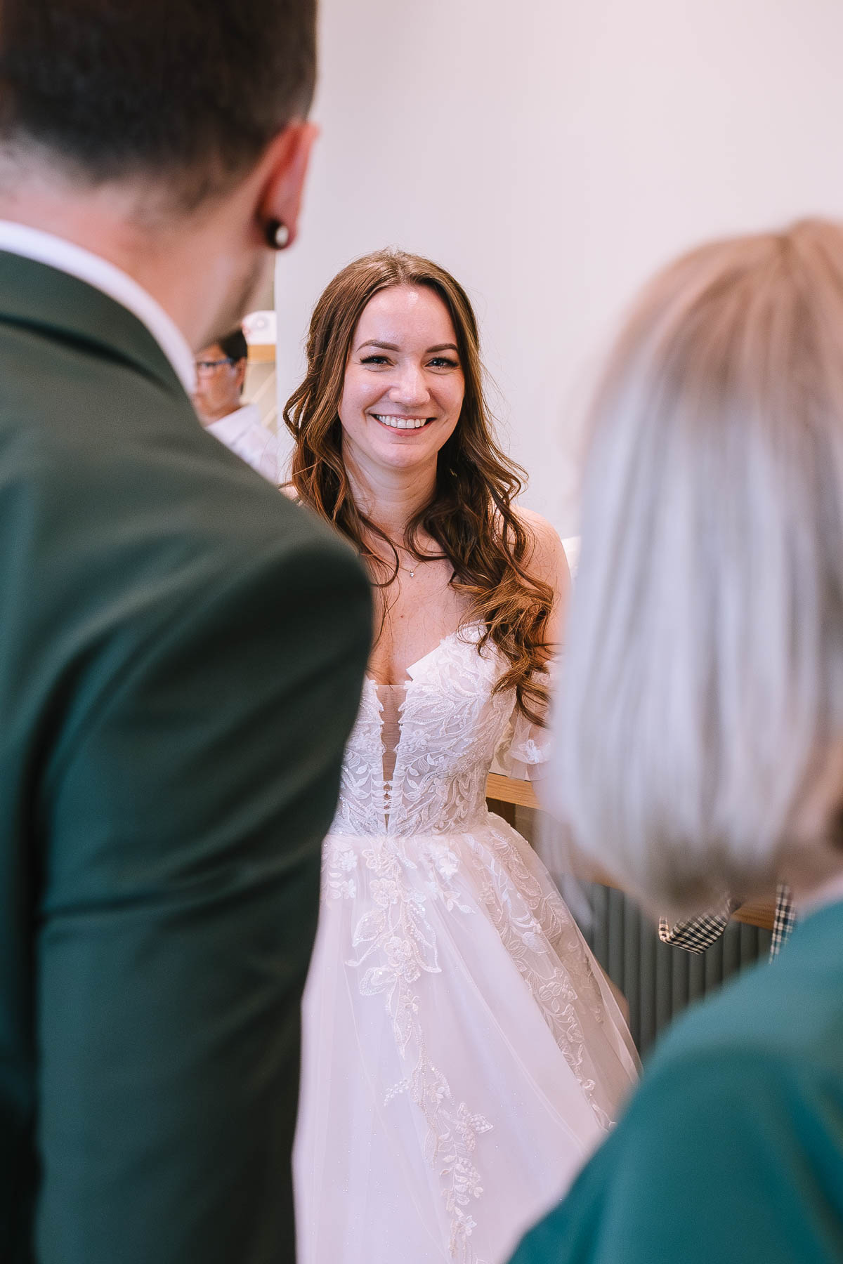 Es gibt Hochzeiten, die einfach besonders sind – und die von Julia und Henning gehört definitiv dazu. Ich hatte das große Vergnügen, die beiden an ihrem großen Tag zu begleiten, und ich kann euch gar nicht sagen, wie viel Liebe, Emotionen und persönliche Details in diesem Tag steckten. Wenn ich an die Freie Trauung auf dem Hof Middendorf in Bergkamen zurückdenke, wird mir immer noch ganz warm ums Herz. Was mich immer wieder begeistert, ist der First-Look-Moment. Dieser Augenblick, wenn sich das Brautpaar das erste Mal sieht – ganz privat, ohne Zuschauer, nur sie zwei. Normalerweise ist der Bräutigam eher der entspannte Part, aber bei Henning war es etwas anderes. Ich hatte ihn vorher als richtig gelassenen Typen kennengelernt, der total entspannt wirkte. Doch als Julia die Ecke betrat, konnte er seine Emotionen nicht mehr zurückhalten. Es war so ein schöner Moment, weil man gesehen hat, wie tief die beiden miteinander verbunden sind. Julia, die in ihrem atemberaubenden Kleid auf ihn zukam, und Henning, der plötzlich ganz der gefühlvolle Mann war, der hinter der „coolen“ Fassade steckt.