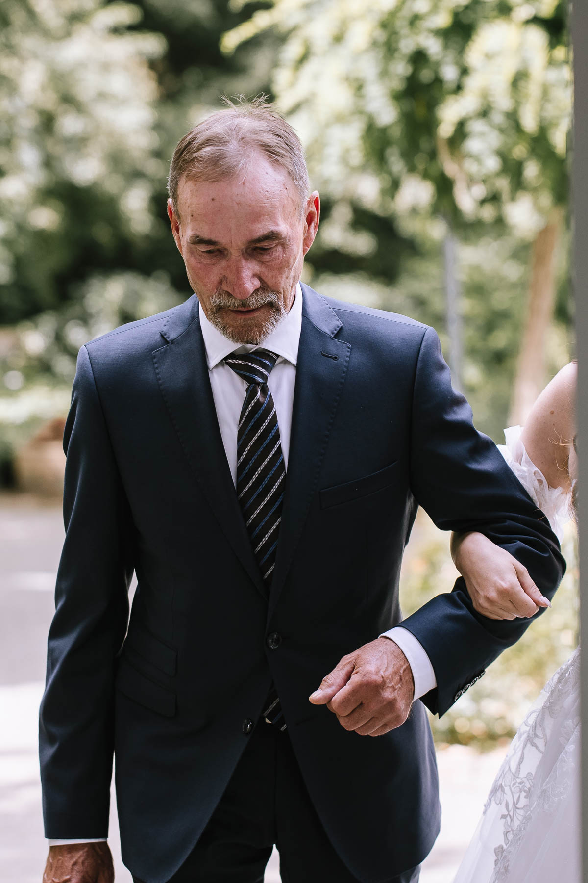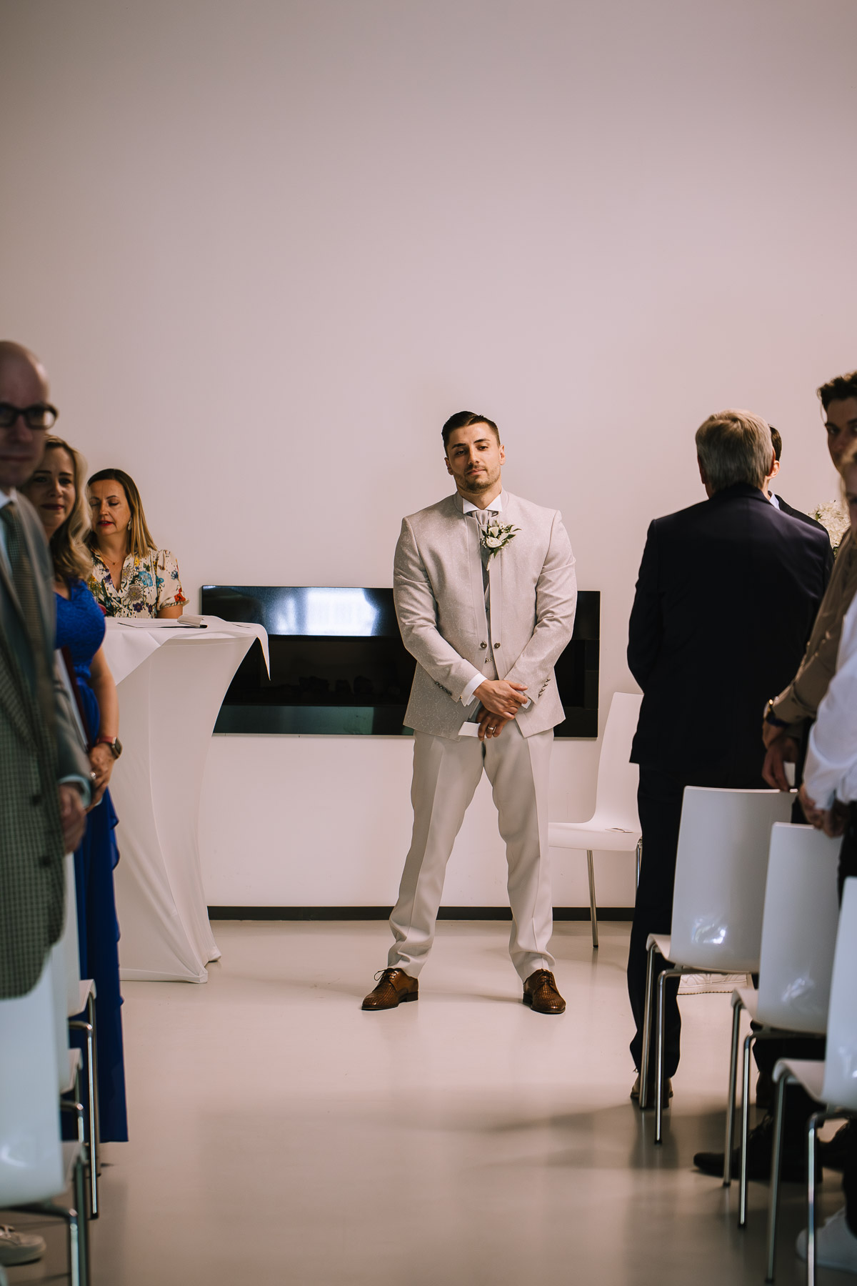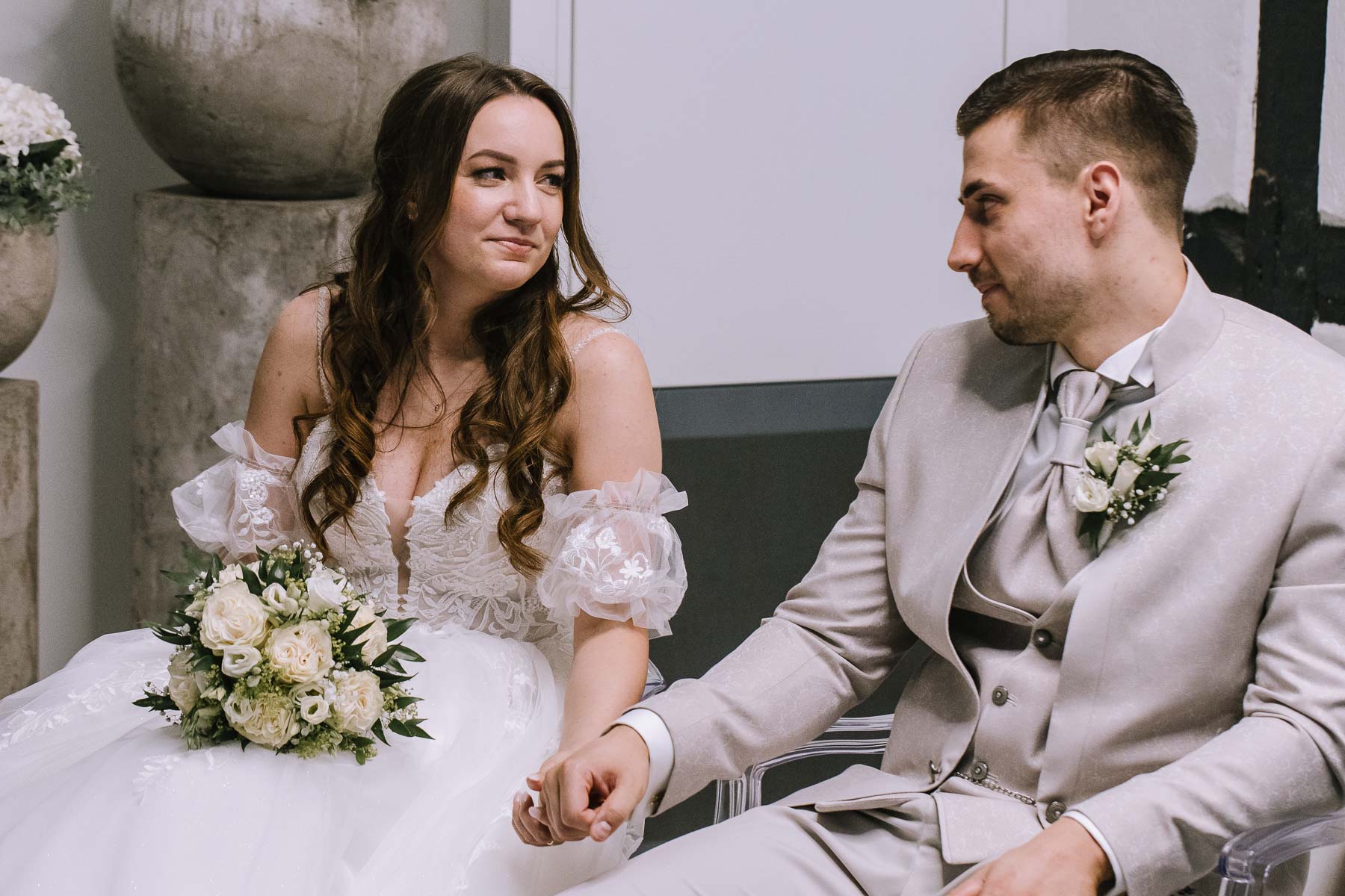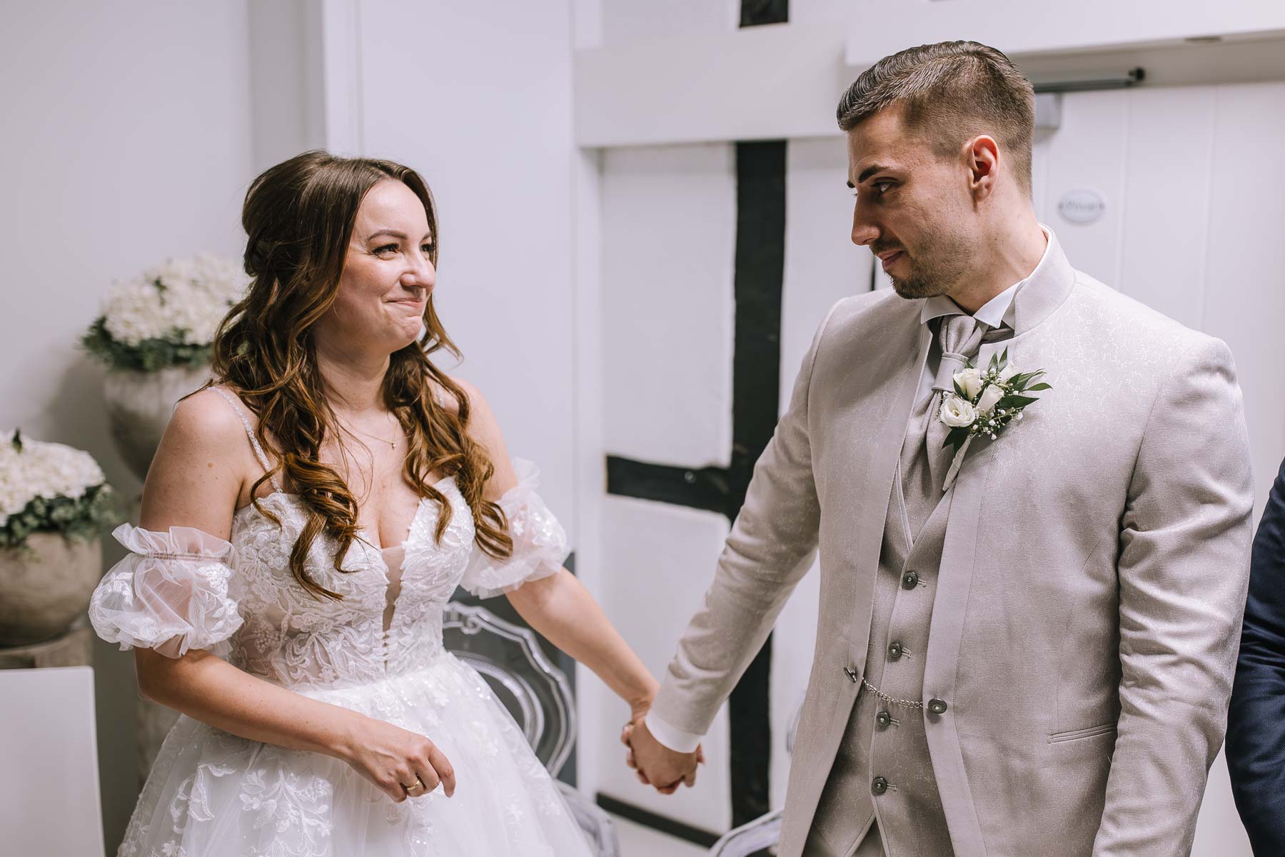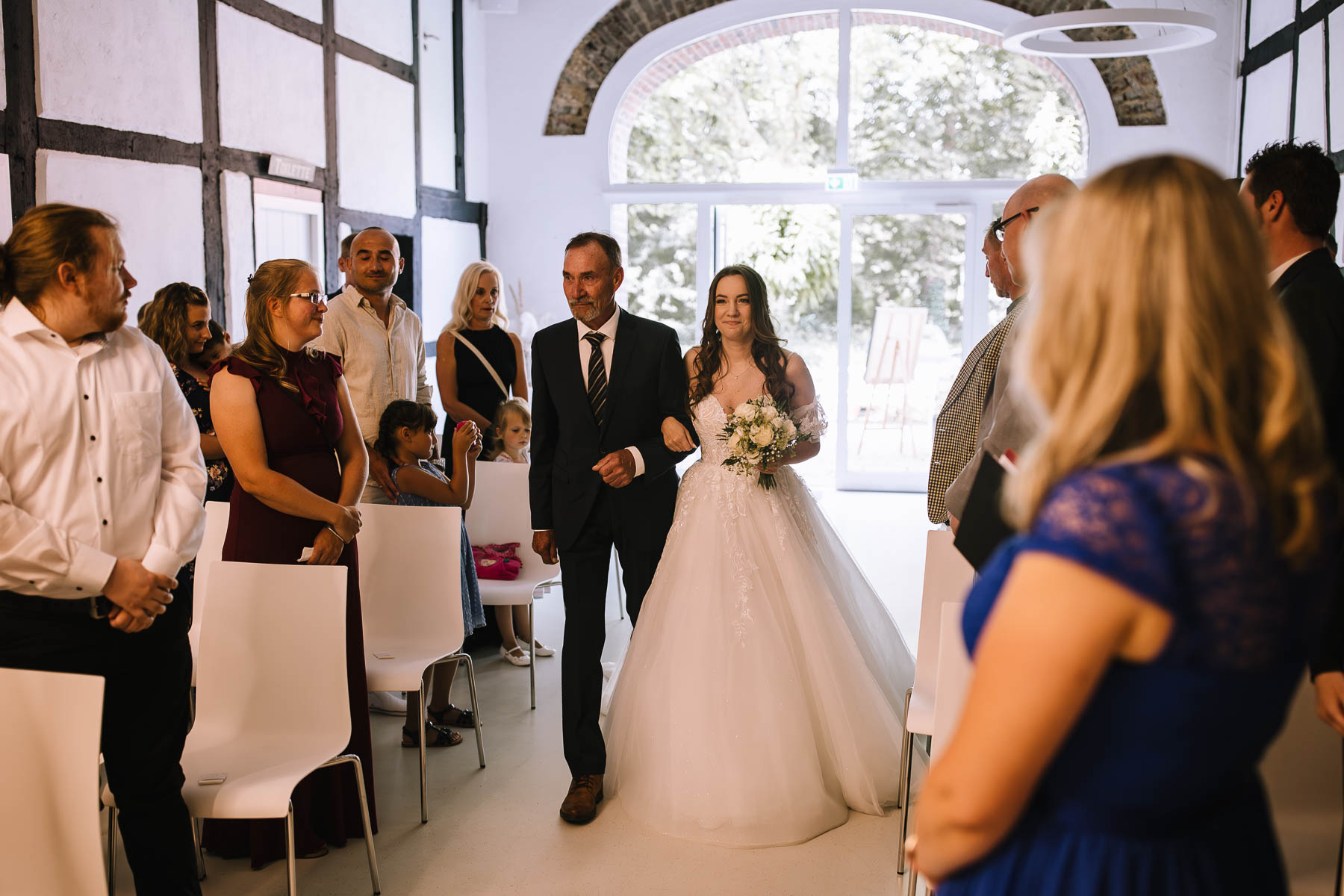 Es gibt Hochzeiten, die einfach besonders sind – und die von Julia und Henning gehört definitiv dazu. Ich hatte das große Vergnügen, die beiden an ihrem großen Tag zu begleiten, und ich kann euch gar nicht sagen, wie viel Liebe, Emotionen und persönliche Details in diesem Tag steckten. Wenn ich an die Freie Trauung auf dem Hof Middendorf in Bergkamen zurückdenke, wird mir immer noch ganz warm ums Herz. Was mich immer wieder begeistert, ist der First-Look-Moment. Dieser Augenblick, wenn sich das Brautpaar das erste Mal sieht – ganz privat, ohne Zuschauer, nur sie zwei. Normalerweise ist der Bräutigam eher der entspannte Part, aber bei Henning war es etwas anderes. Ich hatte ihn vorher als richtig gelassenen Typen kennengelernt, der total entspannt wirkte. Doch als Julia die Ecke betrat, konnte er seine Emotionen nicht mehr zurückhalten. Es war so ein schöner Moment, weil man gesehen hat, wie tief die beiden miteinander verbunden sind. Julia, die in ihrem atemberaubenden Kleid auf ihn zukam, und Henning, der plötzlich ganz der gefühlvolle Mann war, der hinter der „coolen“ Fassade steckt.