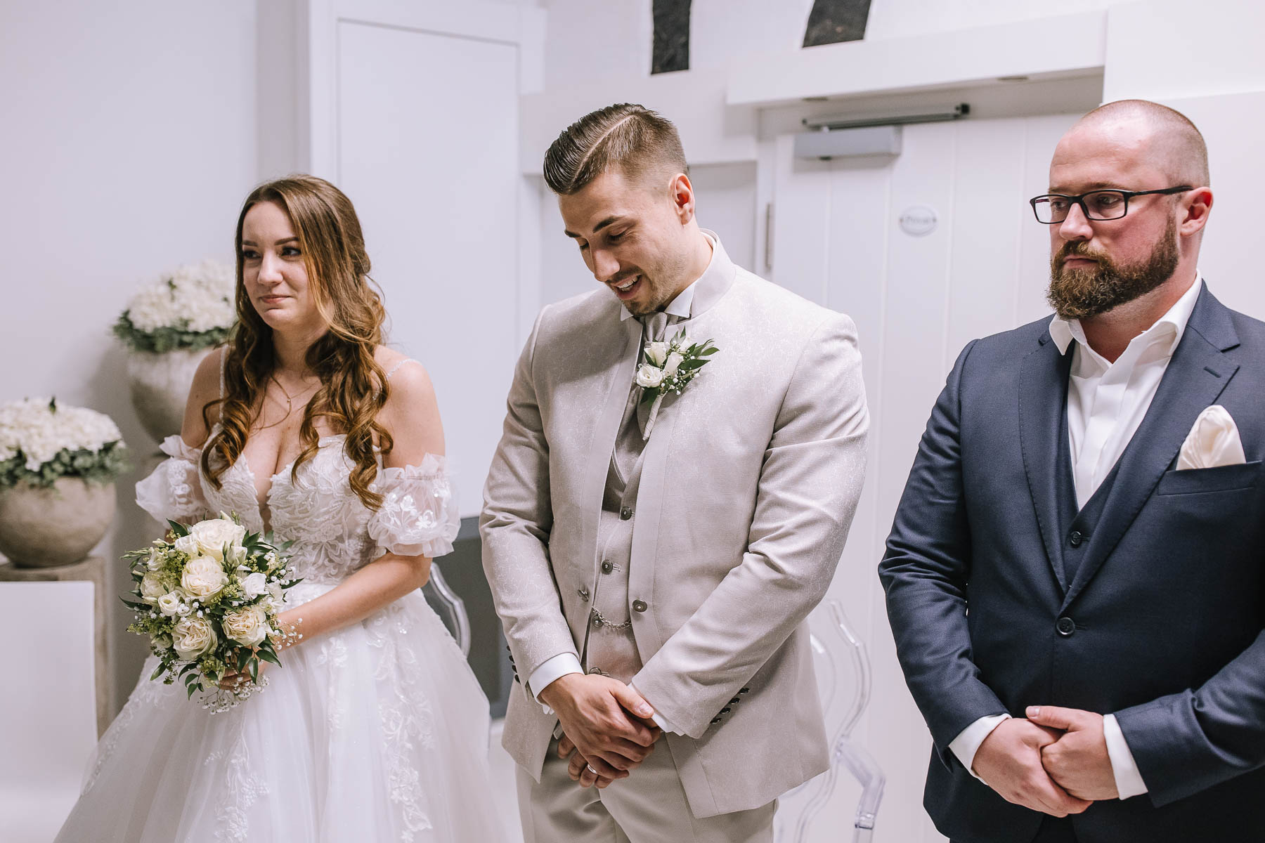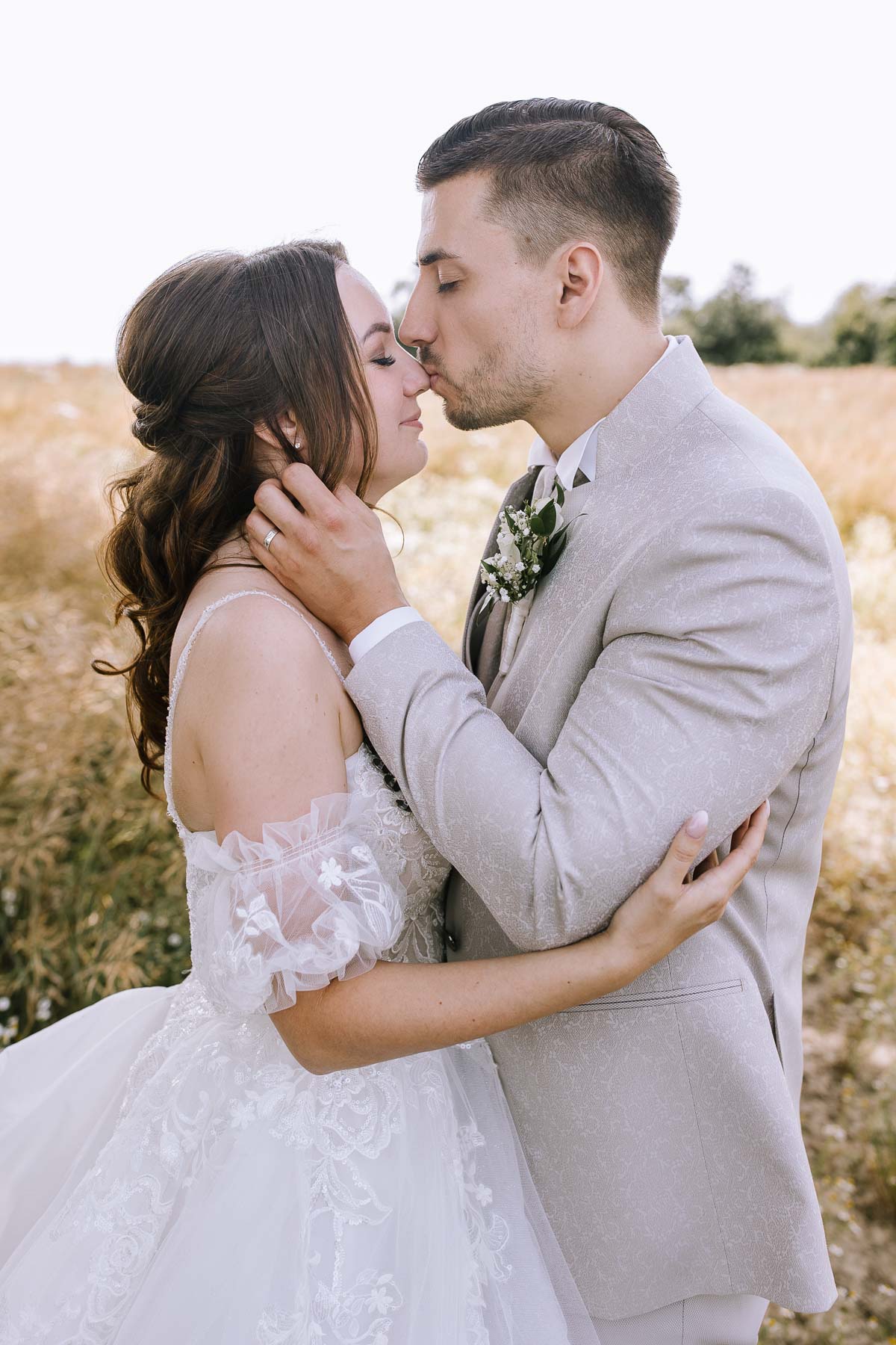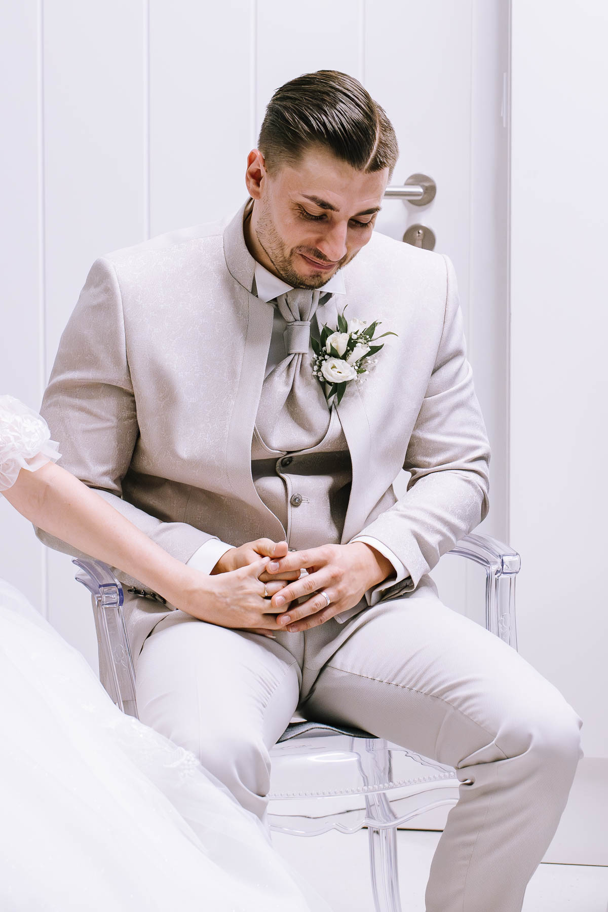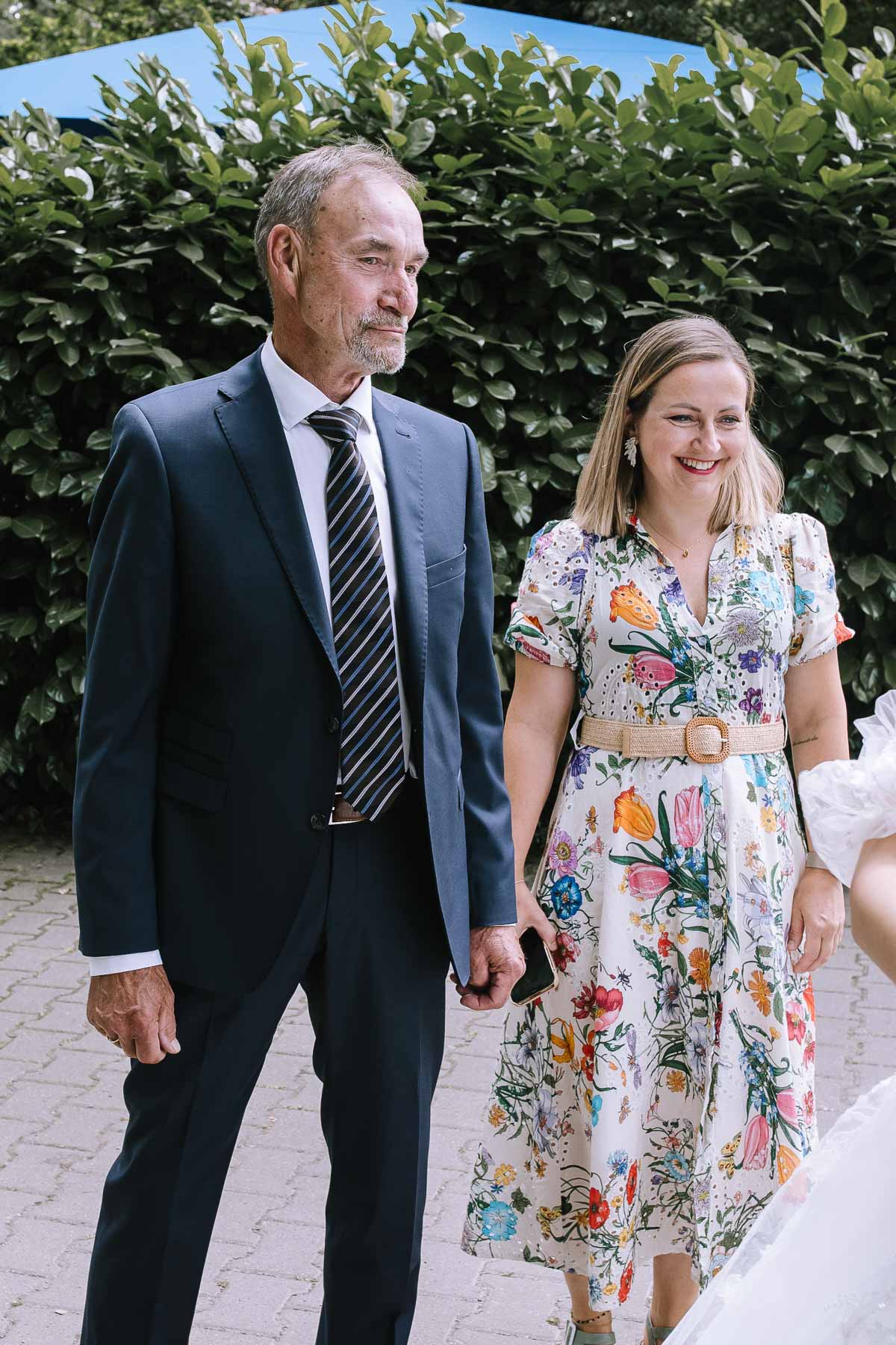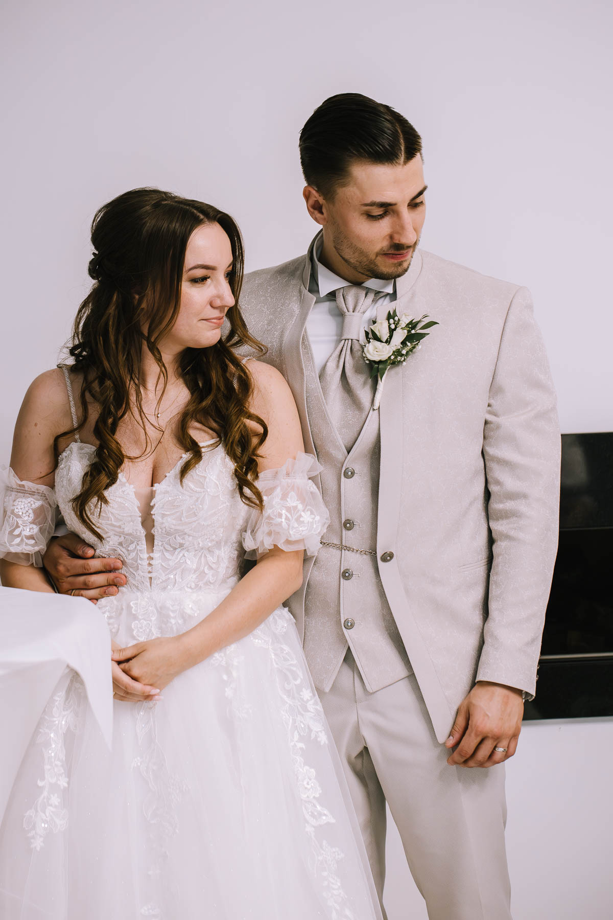 Es gibt Hochzeiten, die einfach besonders sind – und die von Julia und Henning gehört definitiv dazu. Ich hatte das große Vergnügen, die beiden an ihrem großen Tag zu begleiten, und ich kann euch gar nicht sagen, wie viel Liebe, Emotionen und persönliche Details in diesem Tag steckten. Wenn ich an die Freie Trauung auf dem Hof Middendorf in Bergkamen zurückdenke, wird mir immer noch ganz warm ums Herz. Was mich immer wieder begeistert, ist der First-Look-Moment. Dieser Augenblick, wenn sich das Brautpaar das erste Mal sieht – ganz privat, ohne Zuschauer, nur sie zwei. Normalerweise ist der Bräutigam eher der entspannte Part, aber bei Henning war es etwas anderes. Ich hatte ihn vorher als richtig gelassenen Typen kennengelernt, der total entspannt wirkte. Doch als Julia die Ecke betrat, konnte er seine Emotionen nicht mehr zurückhalten. Es war so ein schöner Moment, weil man gesehen hat, wie tief die beiden miteinander verbunden sind. Julia, die in ihrem atemberaubenden Kleid auf ihn zukam, und Henning, der plötzlich ganz der gefühlvolle Mann war, der hinter der „coolen“ Fassade steckt.