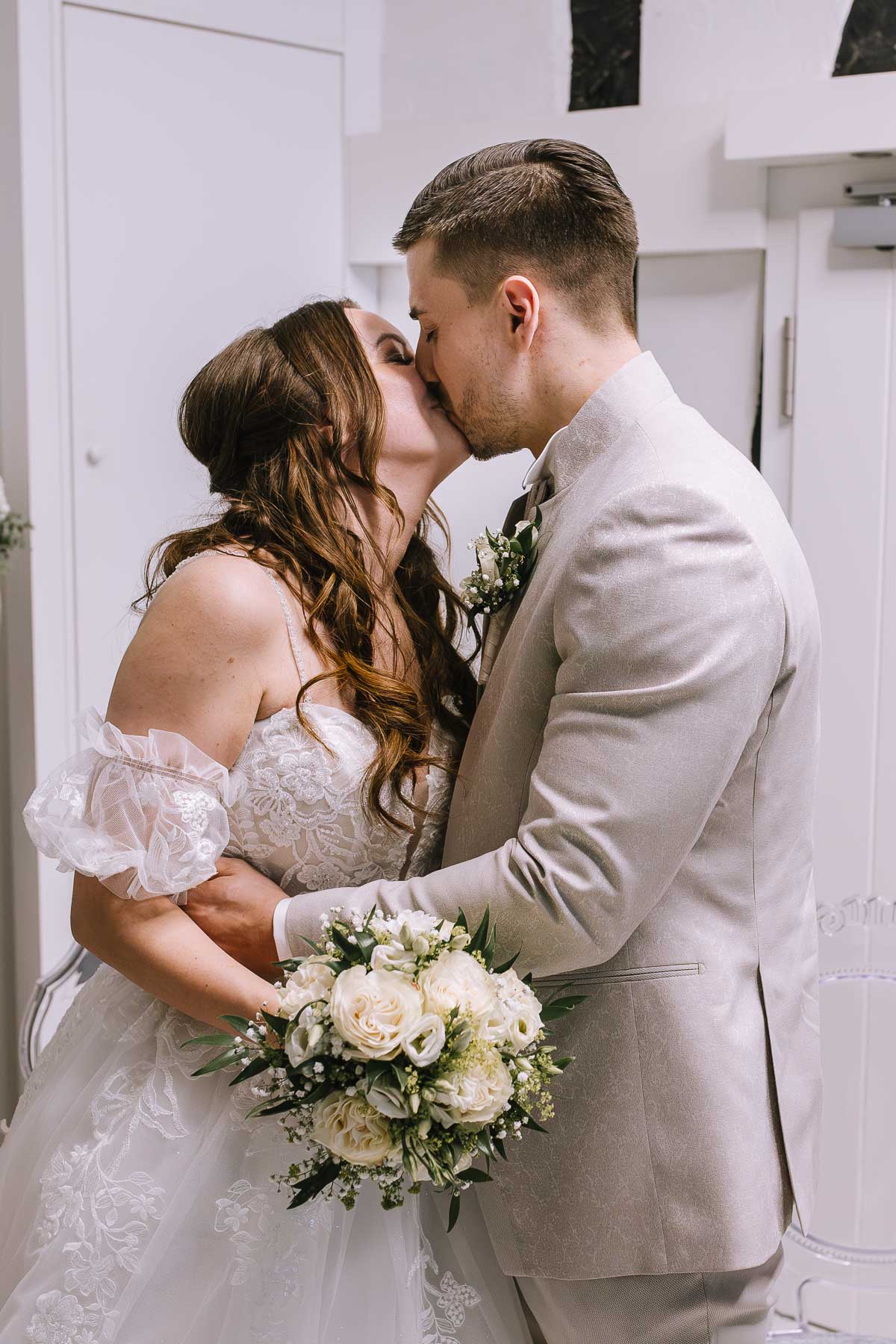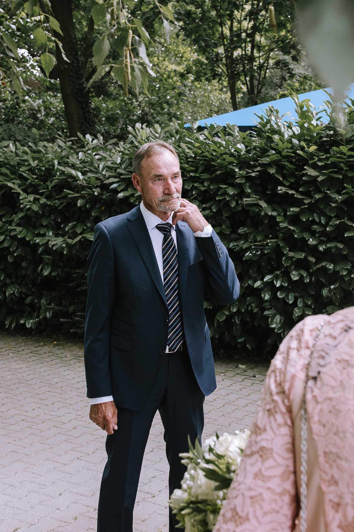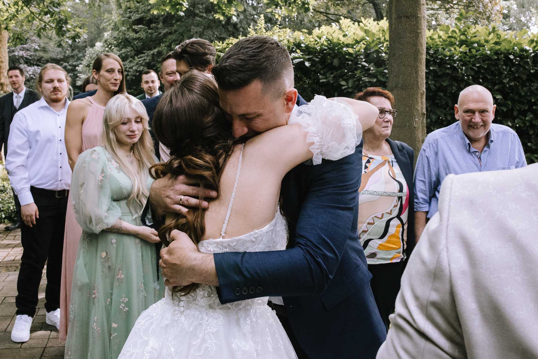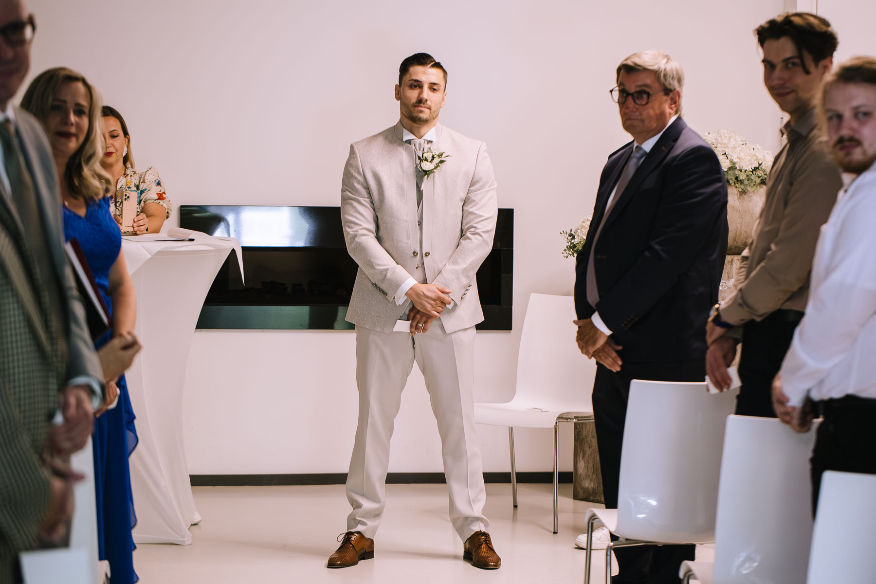 Es gibt Hochzeiten, die einfach besonders sind – und die von Julia und Henning gehört definitiv dazu. Ich hatte das große Vergnügen, die beiden an ihrem großen Tag zu begleiten, und ich kann euch gar nicht sagen, wie viel Liebe, Emotionen und persönliche Details in diesem Tag steckten. Wenn ich an die Freie Trauung auf dem Hof Middendorf in Bergkamen zurückdenke, wird mir immer noch ganz warm ums Herz. Was mich immer wieder begeistert, ist der First-Look-Moment. Dieser Augenblick, wenn sich das Brautpaar das erste Mal sieht – ganz privat, ohne Zuschauer, nur sie zwei. Normalerweise ist der Bräutigam eher der entspannte Part, aber bei Henning war es etwas anderes. Ich hatte ihn vorher als richtig gelassenen Typen kennengelernt, der total entspannt wirkte. Doch als Julia die Ecke betrat, konnte er seine Emotionen nicht mehr zurückhalten. Es war so ein schöner Moment, weil man gesehen hat, wie tief die beiden miteinander verbunden sind. Julia, die in ihrem atemberaubenden Kleid auf ihn zukam, und Henning, der plötzlich ganz der gefühlvolle Mann war, der hinter der „coolen“ Fassade steckt.