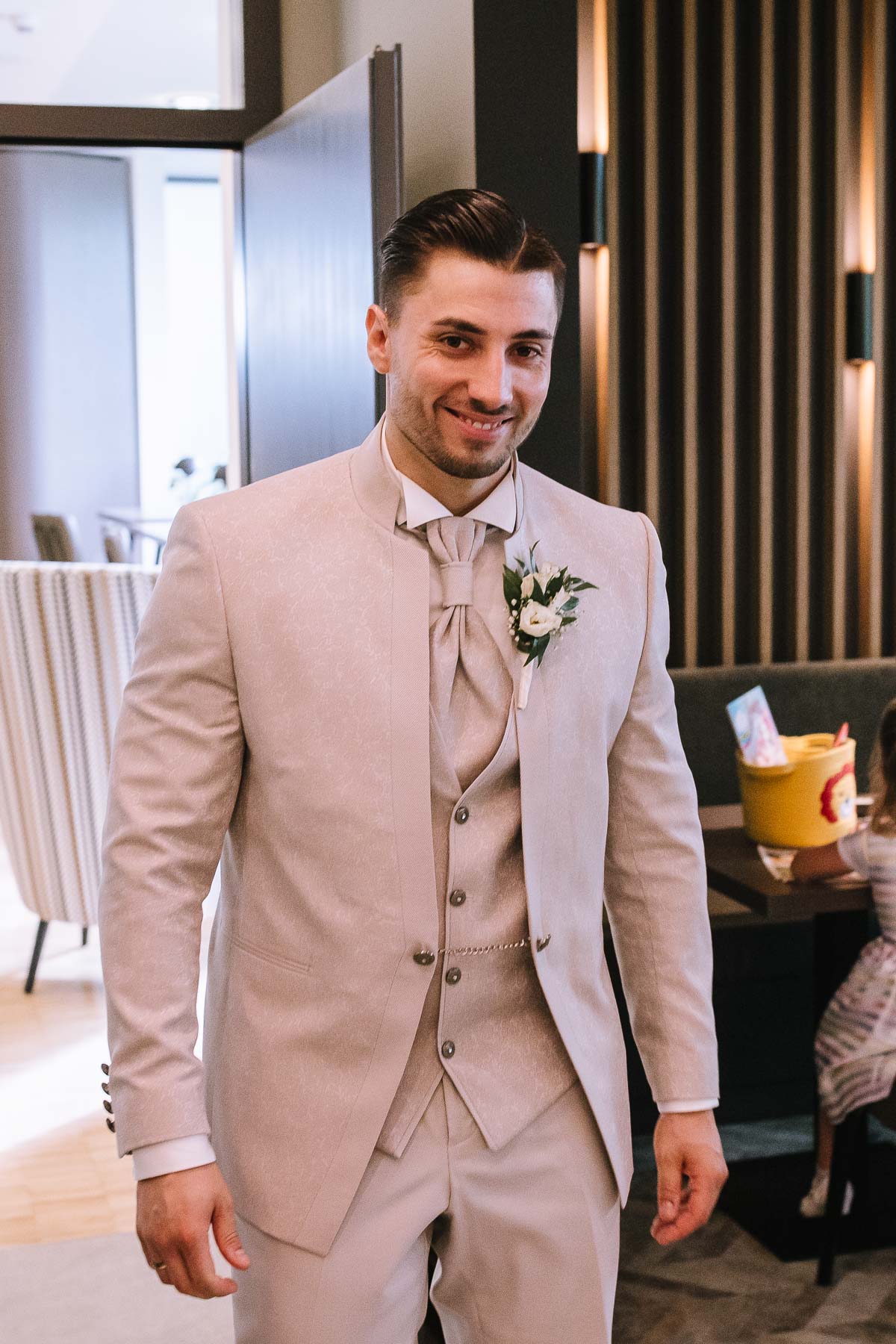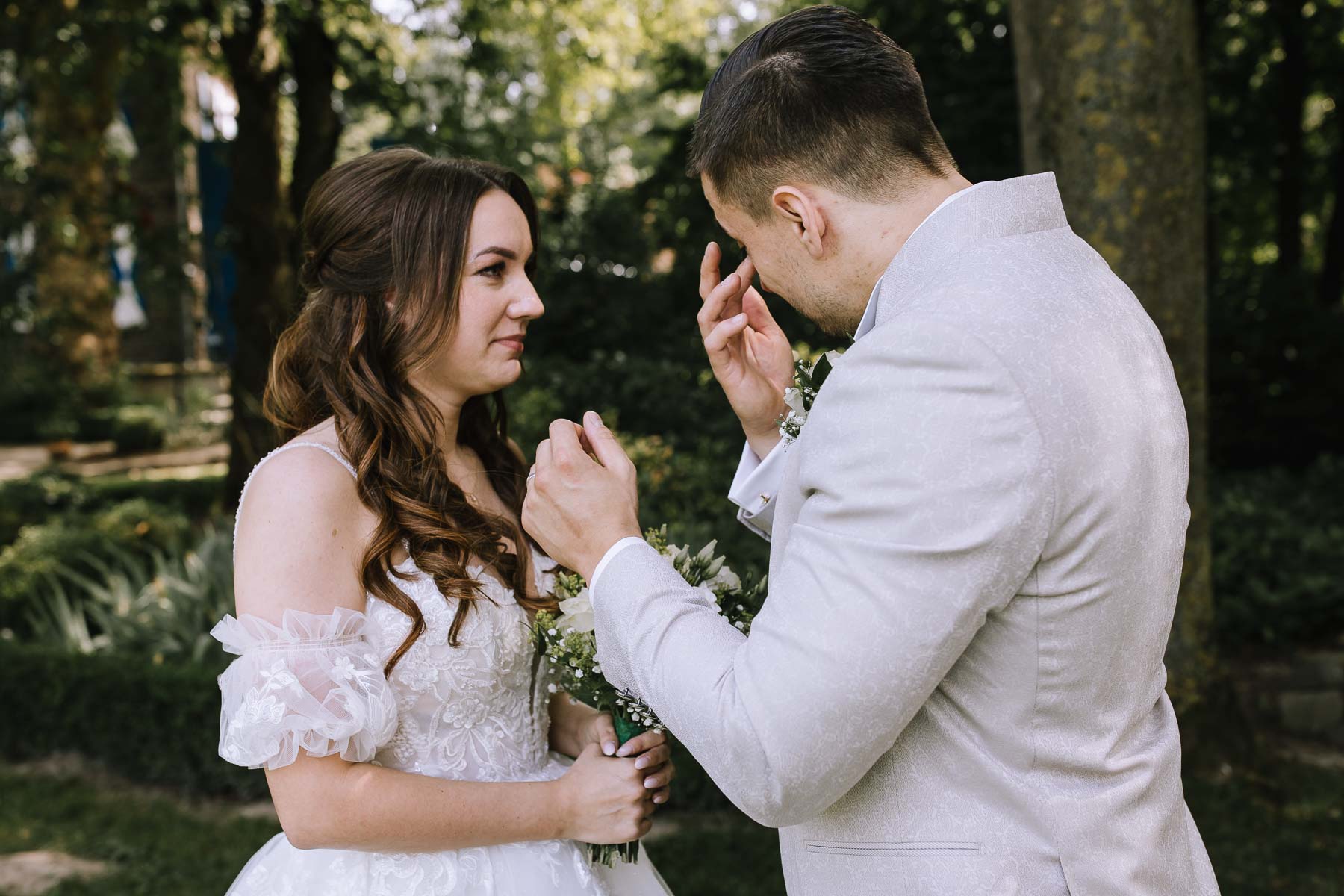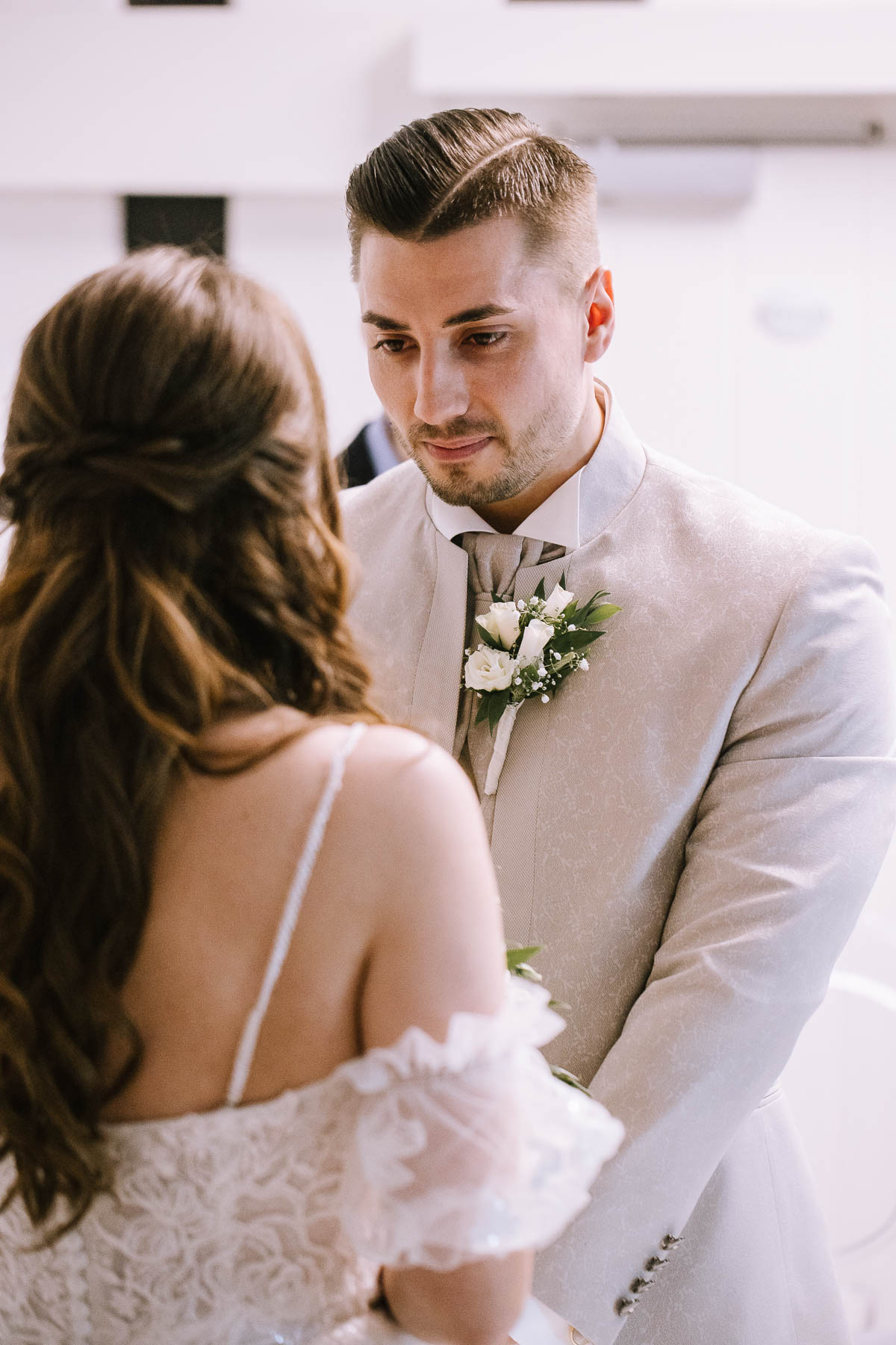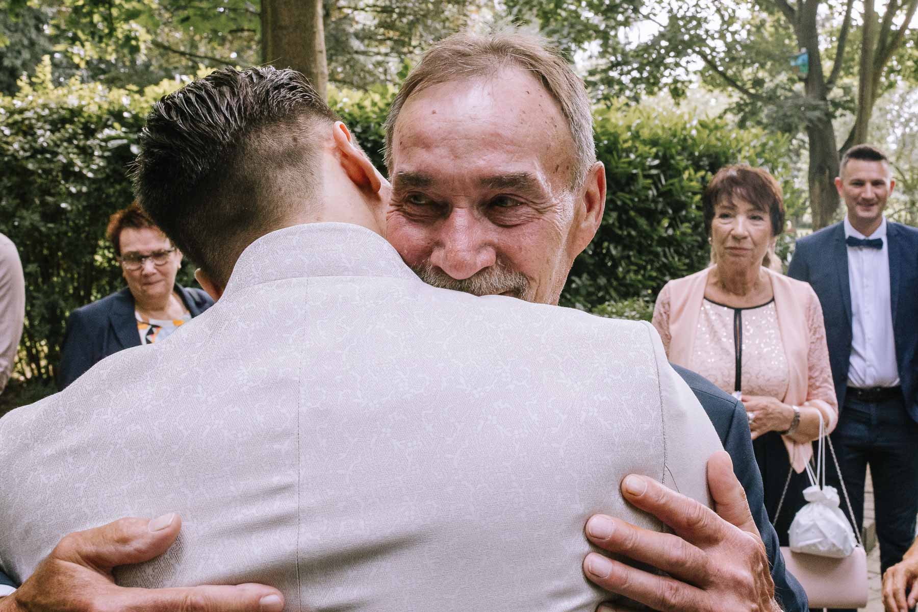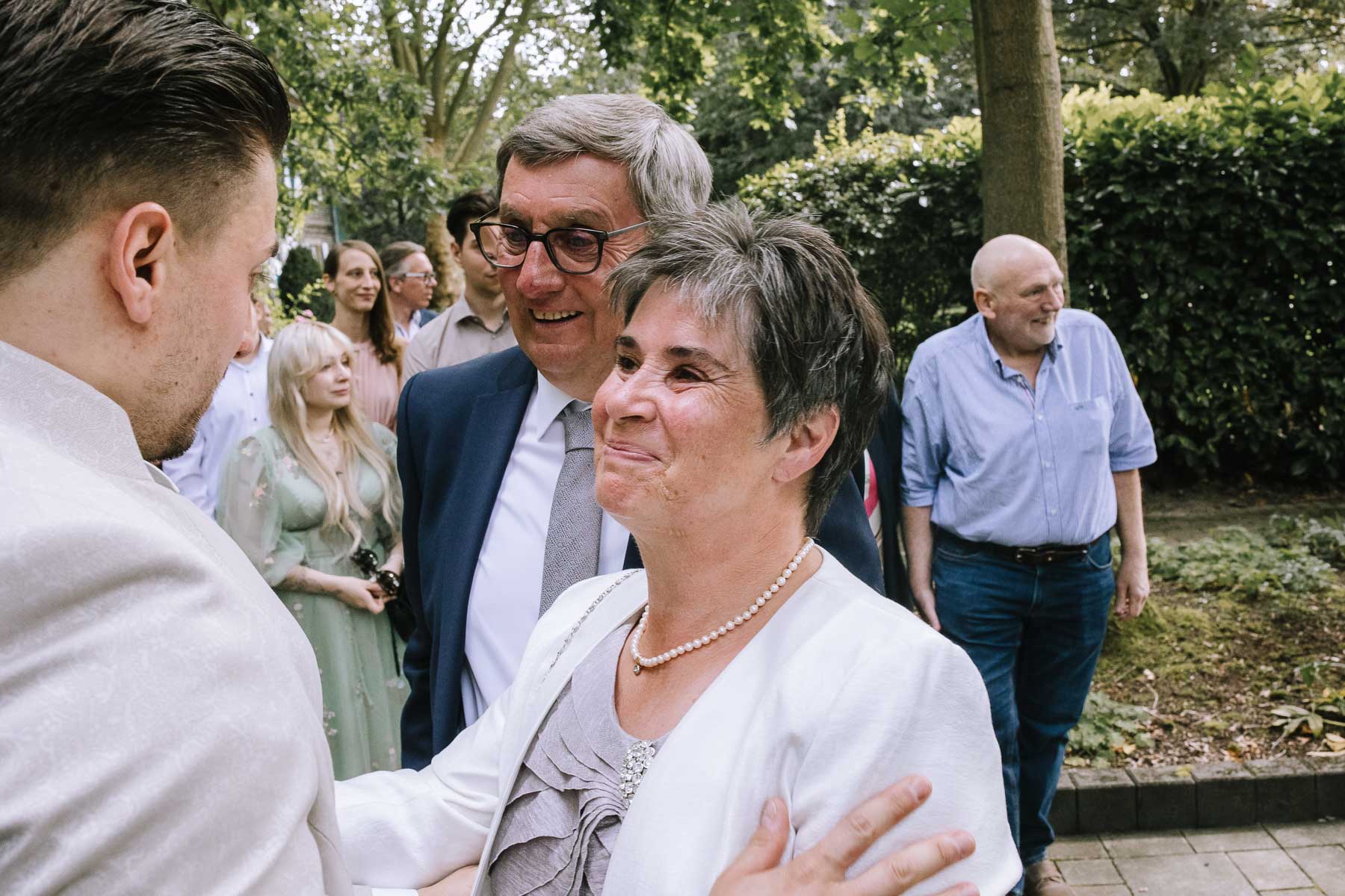 Es gibt Hochzeiten, die einfach besonders sind – und die von Julia und Henning gehört definitiv dazu. Ich hatte das große Vergnügen, die beiden an ihrem großen Tag zu begleiten, und ich kann euch gar nicht sagen, wie viel Liebe, Emotionen und persönliche Details in diesem Tag steckten. Wenn ich an die Freie Trauung auf dem Hof Middendorf in Bergkamen zurückdenke, wird mir immer noch ganz warm ums Herz. Was mich immer wieder begeistert, ist der First-Look-Moment. Dieser Augenblick, wenn sich das Brautpaar das erste Mal sieht – ganz privat, ohne Zuschauer, nur sie zwei. Normalerweise ist der Bräutigam eher der entspannte Part, aber bei Henning war es etwas anderes. Ich hatte ihn vorher als richtig gelassenen Typen kennengelernt, der total entspannt wirkte. Doch als Julia die Ecke betrat, konnte er seine Emotionen nicht mehr zurückhalten. Es war so ein schöner Moment, weil man gesehen hat, wie tief die beiden miteinander verbunden sind. Julia, die in ihrem atemberaubenden Kleid auf ihn zukam, und Henning, der plötzlich ganz der gefühlvolle Mann war, der hinter der „coolen“ Fassade steckt.