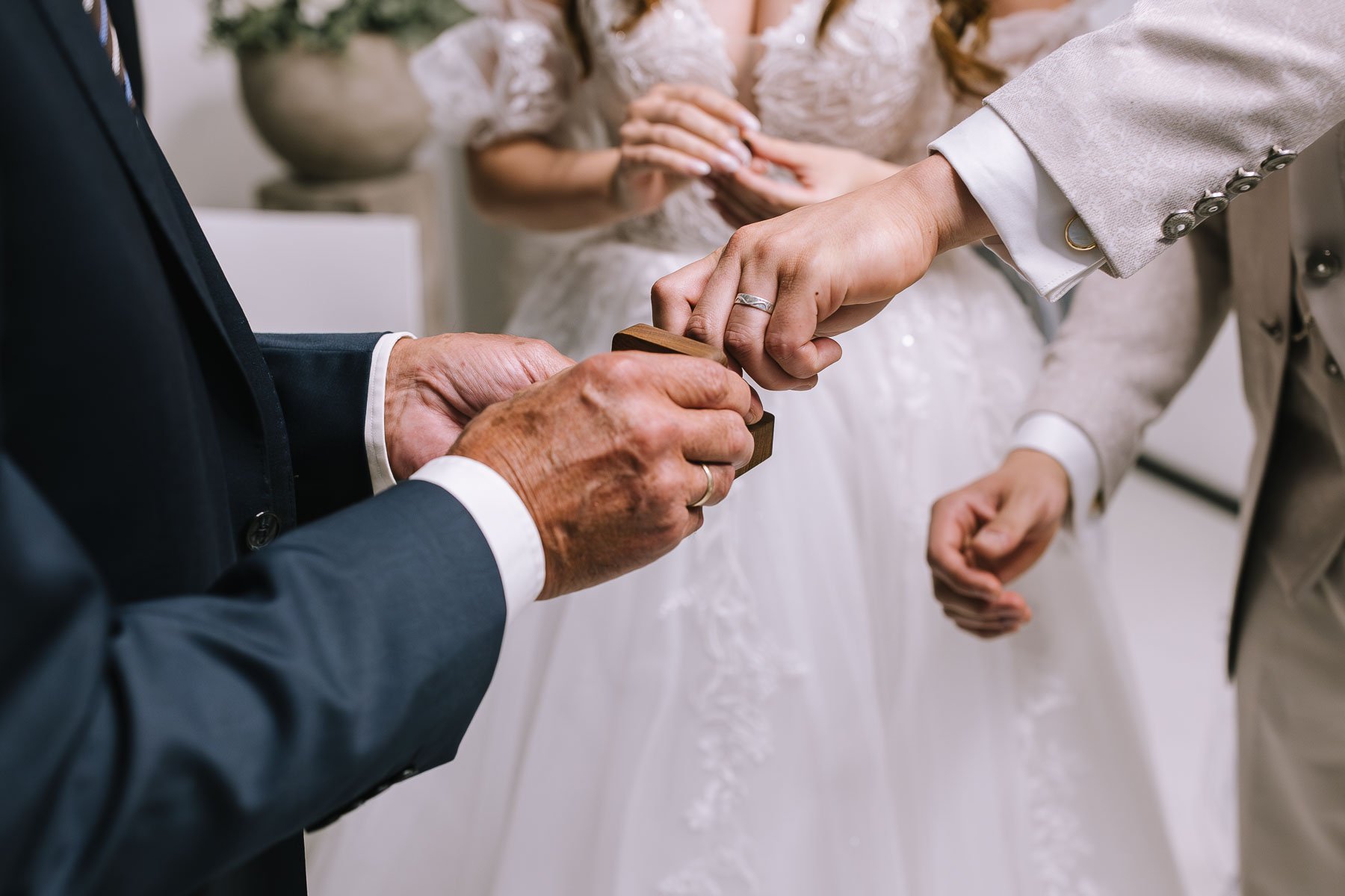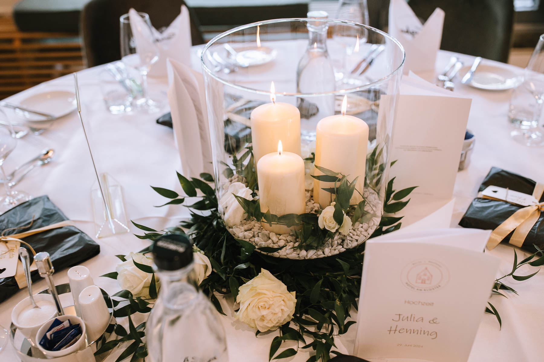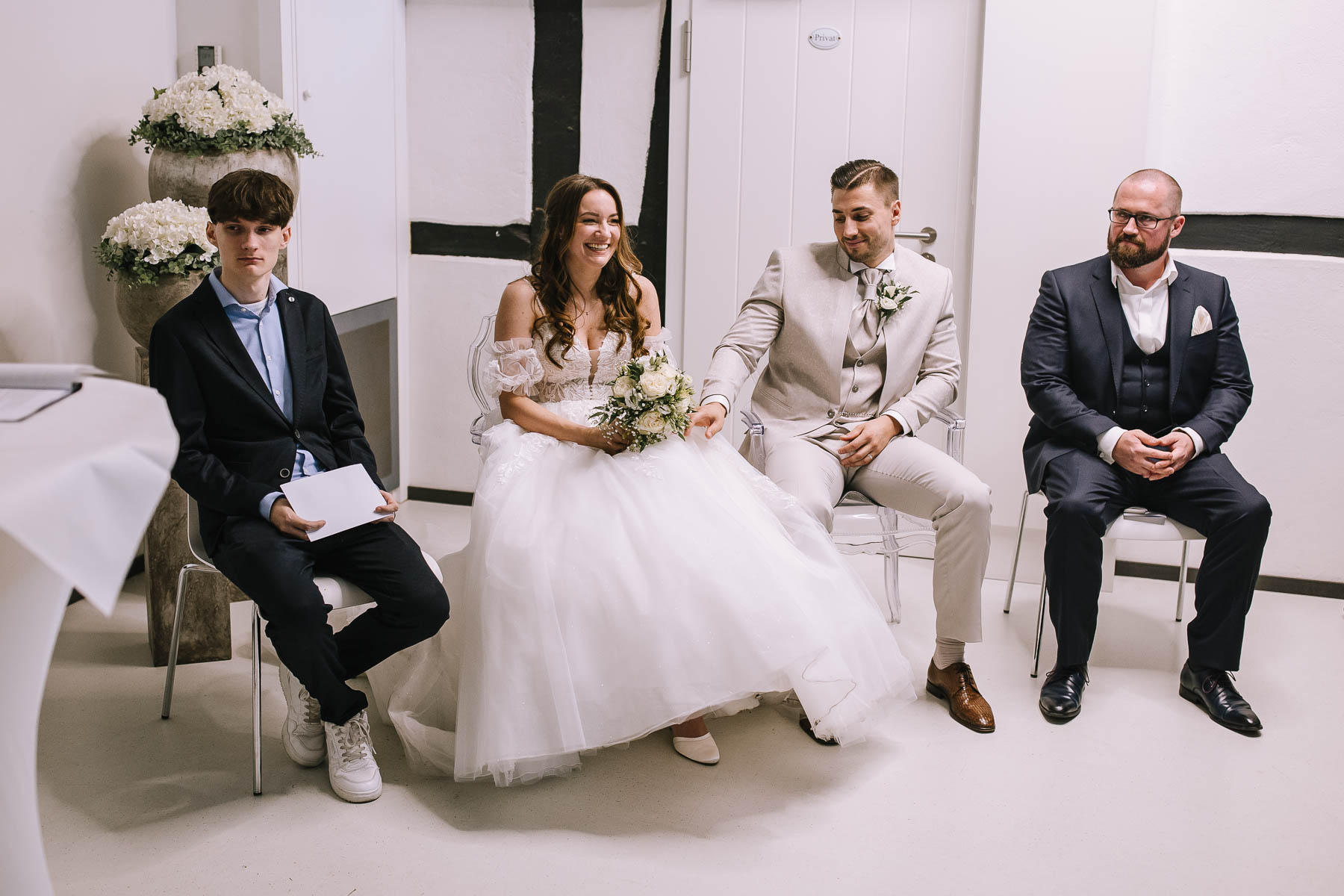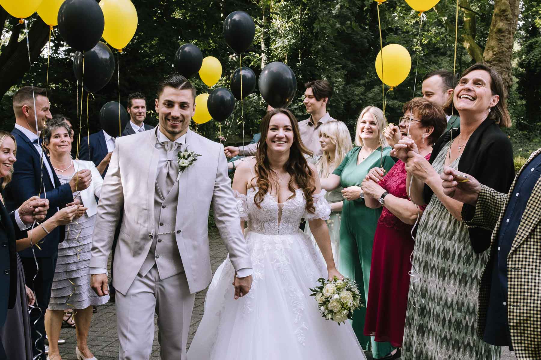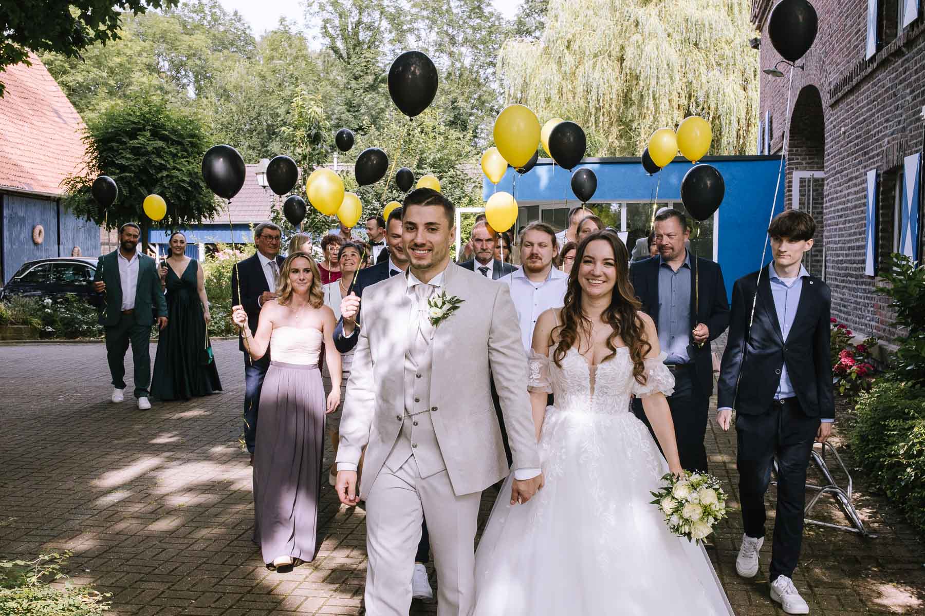 Gänsehaut pur! Nach dieser emotionalen Begegnung ging es weiter zur Freien Trauung. Der Hof Middendorf war der perfekte Ort für eine solche Zeremonie – idyllisch, ruhig, und dennoch voller Leben. Es war eine ganz persönliche, intime Atmosphäre, in der Julia und Henning sich das Ja-Wort gaben. Direkt im Anschluss an die Trauung warteten die Gäste auf das frisch vermählte Paar, und was für ein Empfang! Ein Schwarz-Gelbes Spalier! Henning ist ein riesiger BVB-Fan, und das war natürlich ein absoluter Highlight-Moment. Die Begeisterung war spürbar, als Henning voller Stolz durch das Spalier ging – und ganz nebenbei, der Clou: Im Ring von Henning ist der Signal-Iduna-Park eingraviert. Eine wahre Hommage an sein Herz für Borussia Dortmund! Nach dieser emotionalen Zeremonie fuhren wir weiter ins Hotel am Kloster in Werne. Der moderne Saal im Dachgeschoss war wirklich ein Traum. Riesige Fensterfronten, die den Raum in ein wunderschönes, warmes Licht tauchten, und der Rooftop-Balkon, von dem man einen atemberaubenden Ausblick hatte – ein ganz besonderer Ort für eine Feier, die genauso einzigartig war wie das Brautpaar selbst. Als die Gäste nach und nach eintrafen, spielte der DJ schon moderne Bachata-Musik – eine so entspannte Stimmung, die sofort alle in Feierlaune versetzte. Ich habe die Freude und das Lachen der Gäste förmlich gespürt. Man konnte die Liebe und die Freude von Julia und Henning und ihrer Familie und Freunden in jedem Moment sehen. Aber nicht nur die Stimmung war besonders, sondern auch die Reden der Väter. Beide Väter hielten Worte, die das Herz berührten. Es waren nicht nur Geschichten über die Kindheit der beiden, sondern auch tiefgründige und sehr emotionale Gedanken über die Bedeutung von Familie, Liebe und Zusammenhalt. Ich habe wirklich nicht nur mit den Augen, sondern auch mit dem Herzen fotografiert – solche Momente darf man nicht verpassen. Wenn ich an Julia und Henning denke, dann sehe ich eine Hochzeit voller Emotionen, persönlicher Details und einer unglaublichen Stimmung. Jeder Moment war einzigartig, und ich bin so dankbar, dass ich Teil dieses besonderen Tages sein durfte. Für mich als Hochzeitsfotografin gibt es kaum etwas Schöneres, als die Liebe zwischen zwei Menschen auf solche Weise festzuhalten – die zarten, emotionalen Momente genauso wie die ausgelassenen, fröhlichen Augenblicke. Ich wünsche Julia und Henning alles Liebe und freue mich, diese wunderschönen Erinnerungen für sie auf Bildern festgehalten zu haben!