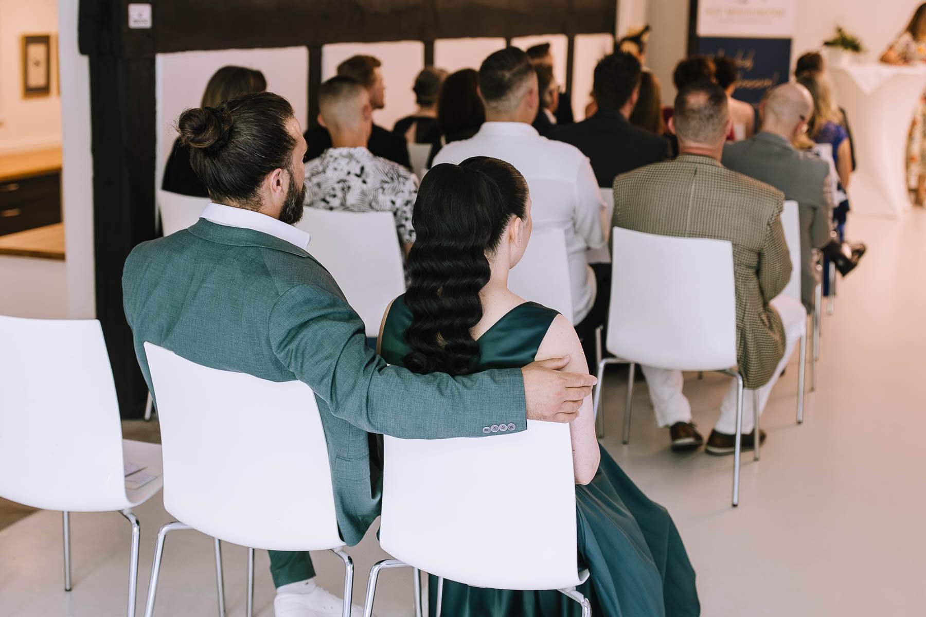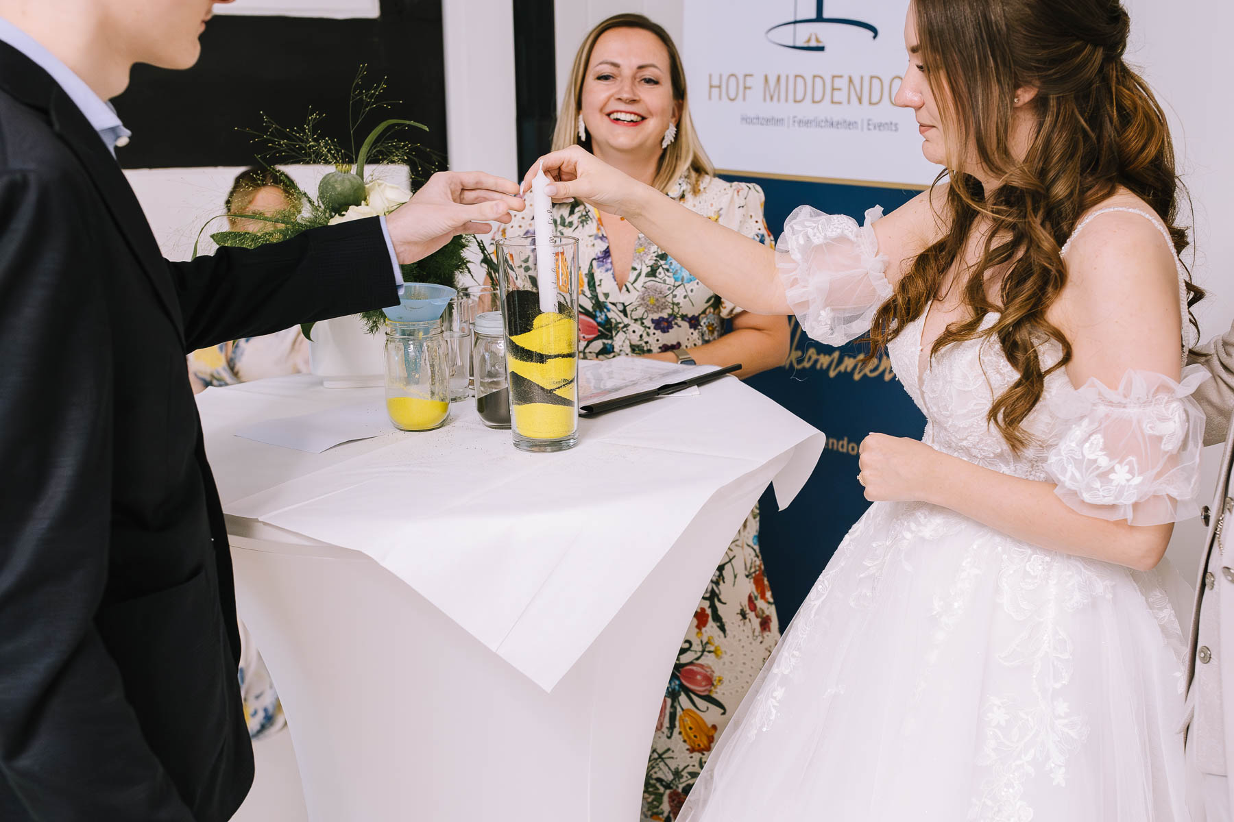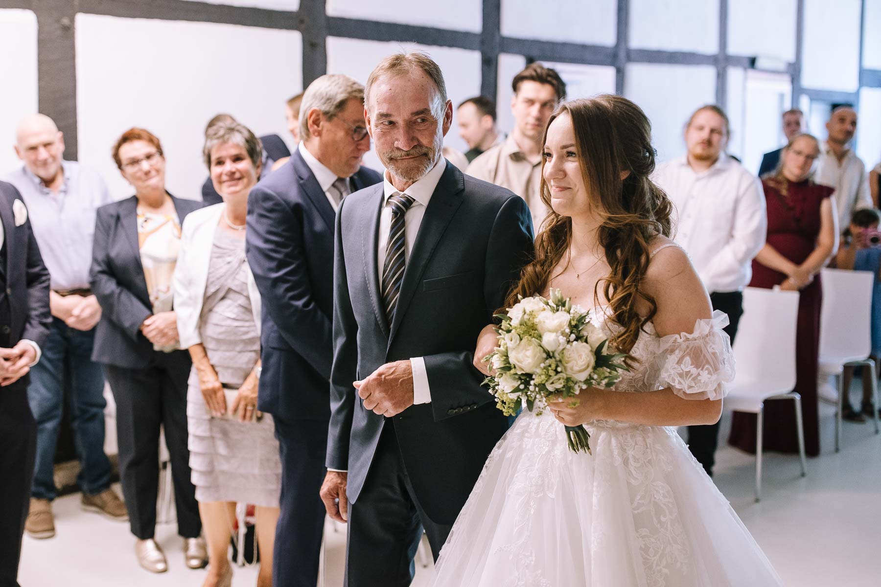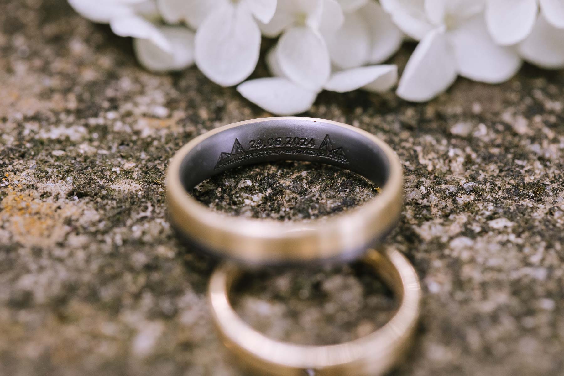 Gänsehaut pur! Nach dieser emotionalen Begegnung ging es weiter zur Freien Trauung. Der Hof Middendorf war der perfekte Ort für eine solche Zeremonie – idyllisch, ruhig, und dennoch voller Leben. Es war eine ganz persönliche, intime Atmosphäre, in der Julia und Henning sich das Ja-Wort gaben. Direkt im Anschluss an die Trauung warteten die Gäste auf das frisch vermählte Paar, und was für ein Empfang! Ein Schwarz-Gelbes Spalier! Henning ist ein riesiger BVB-Fan, und das war natürlich ein absoluter Highlight-Moment. Die Begeisterung war spürbar, als Henning voller Stolz durch das Spalier ging – und ganz nebenbei, der Clou: Im Ring von Henning ist der Signal-Iduna-Park eingraviert. Eine wahre Hommage an sein Herz für Borussia Dortmund! Nach dieser emotionalen Zeremonie fuhren wir weiter ins Hotel am Kloster in Werne. Der moderne Saal im Dachgeschoss war wirklich ein Traum. Riesige Fensterfronten, die den Raum in ein wunderschönes, warmes Licht tauchten, und der Rooftop-Balkon, von dem man einen atemberaubenden Ausblick hatte – ein ganz besonderer Ort für eine Feier, die genauso einzigartig war wie das Brautpaar selbst. Als die Gäste nach und nach eintrafen, spielte der DJ schon moderne Bachata-Musik – eine so entspannte Stimmung, die sofort alle in Feierlaune versetzte. Ich habe die Freude und das Lachen der Gäste förmlich gespürt. Man konnte die Liebe und die Freude von Julia und Henning und ihrer Familie und Freunden in jedem Moment sehen. Aber nicht nur die Stimmung war besonders, sondern auch die Reden der Väter. Beide Väter hielten Worte, die das Herz berührten. Es waren nicht nur Geschichten über die Kindheit der beiden, sondern auch tiefgründige und sehr emotionale Gedanken über die Bedeutung von Familie, Liebe und Zusammenhalt. Ich habe wirklich nicht nur mit den Augen, sondern auch mit dem Herzen fotografiert – solche Momente darf man nicht verpassen. Wenn ich an Julia und Henning denke, dann sehe ich eine Hochzeit voller Emotionen, persönlicher Details und einer unglaublichen Stimmung. Jeder Moment war einzigartig, und ich bin so dankbar, dass ich Teil dieses besonderen Tages sein durfte. Für mich als Hochzeitsfotografin gibt es kaum etwas Schöneres, als die Liebe zwischen zwei Menschen auf solche Weise festzuhalten – die zarten, emotionalen Momente genauso wie die ausgelassenen, fröhlichen Augenblicke. Ich wünsche Julia und Henning alles Liebe und freue mich, diese wunderschönen Erinnerungen für sie auf Bildern festgehalten zu haben!