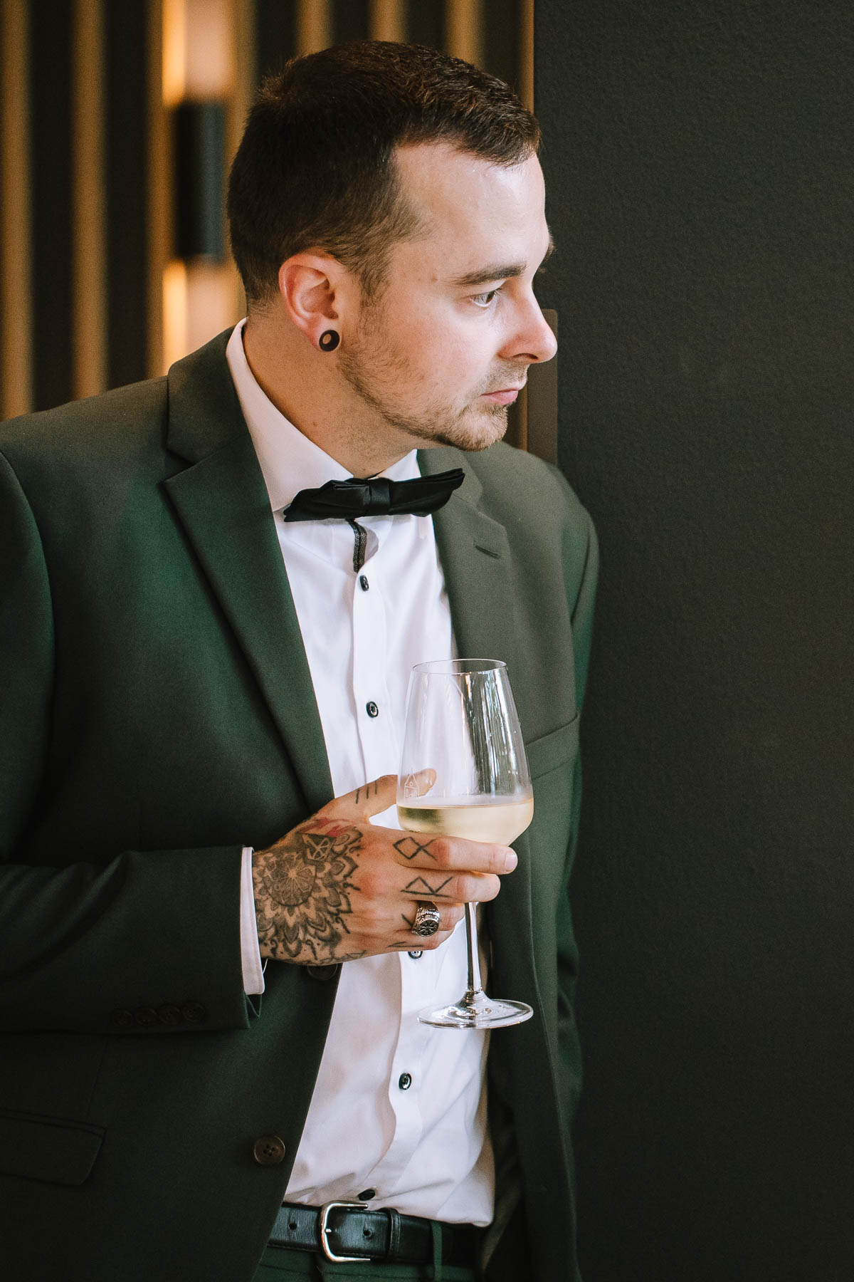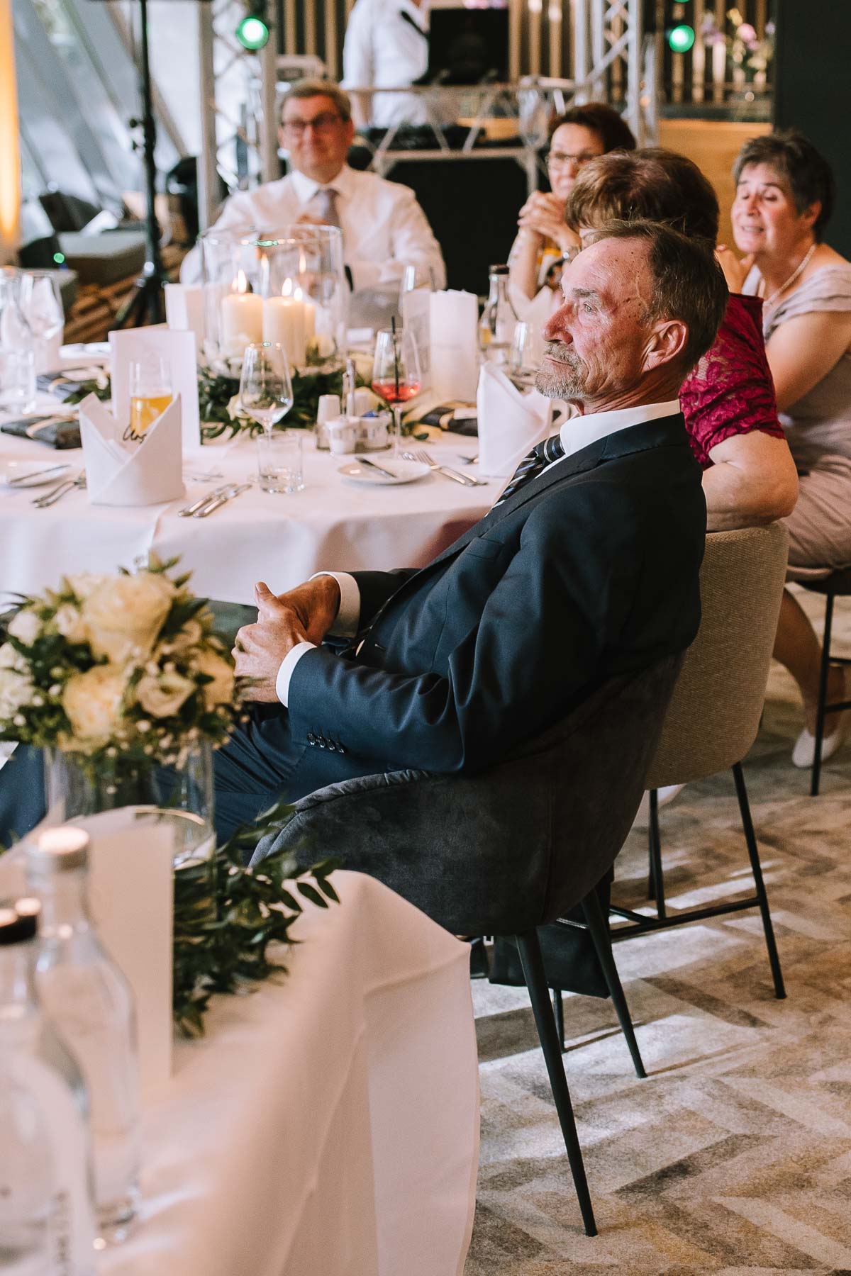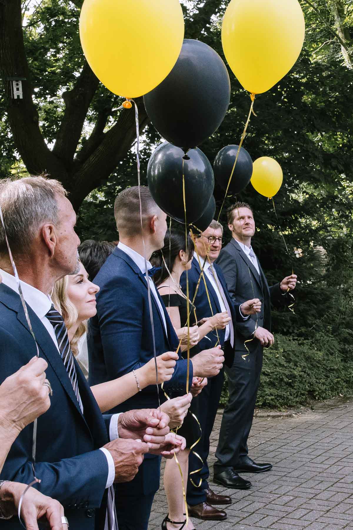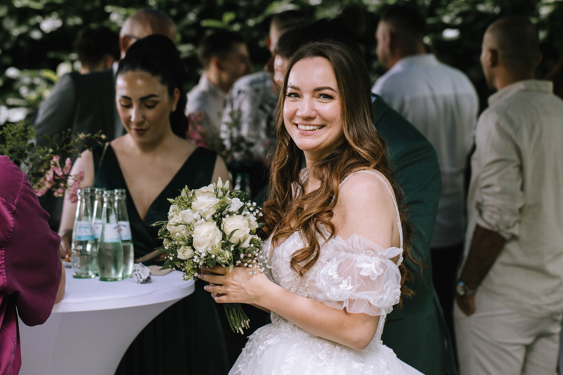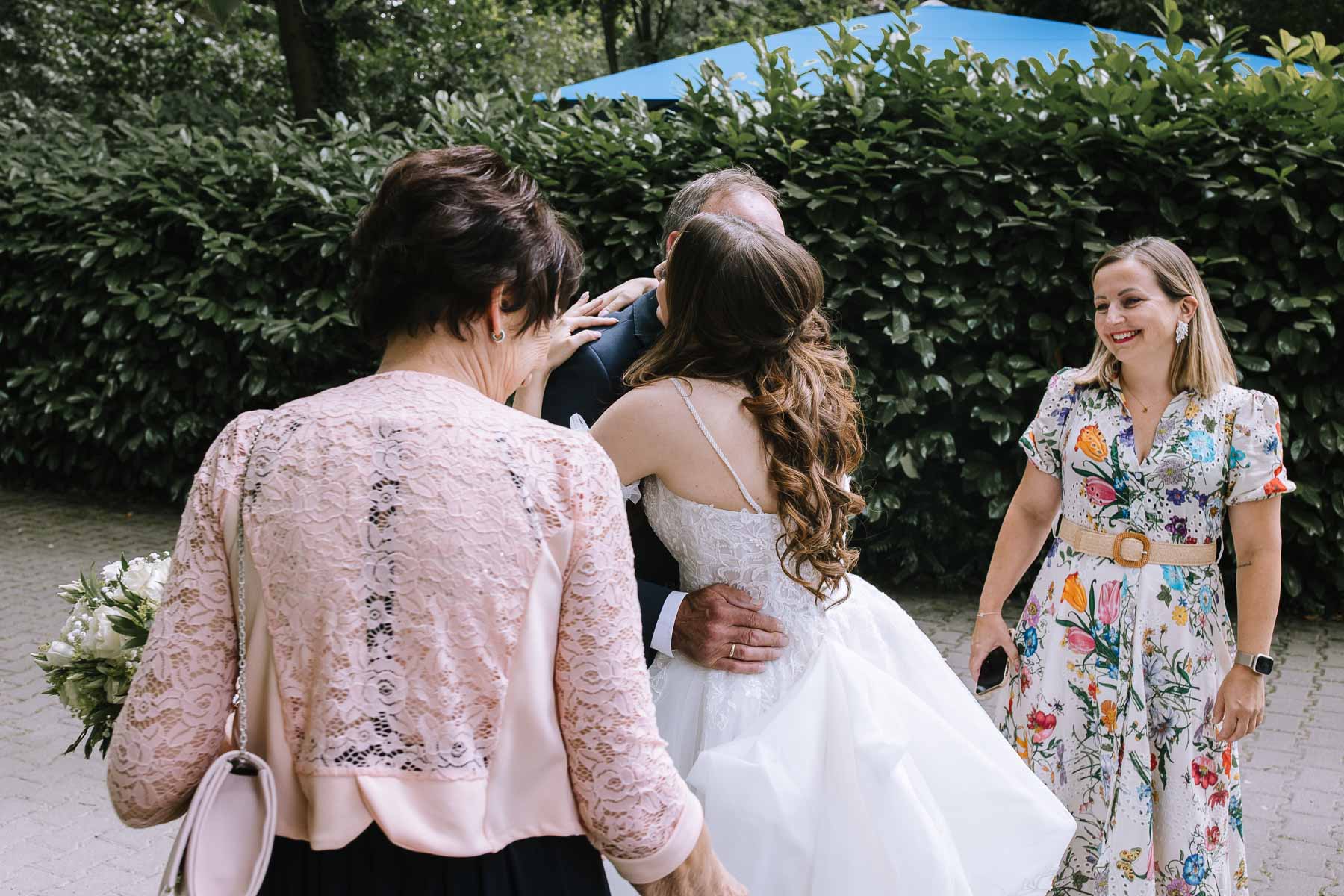 Gänsehaut pur! Nach dieser emotionalen Begegnung ging es weiter zur Freien Trauung. Der Hof Middendorf war der perfekte Ort für eine solche Zeremonie – idyllisch, ruhig, und dennoch voller Leben. Es war eine ganz persönliche, intime Atmosphäre, in der Julia und Henning sich das Ja-Wort gaben. Direkt im Anschluss an die Trauung warteten die Gäste auf das frisch vermählte Paar, und was für ein Empfang! Ein Schwarz-Gelbes Spalier! Henning ist ein riesiger BVB-Fan, und das war natürlich ein absoluter Highlight-Moment. Die Begeisterung war spürbar, als Henning voller Stolz durch das Spalier ging – und ganz nebenbei, der Clou: Im Ring von Henning ist der Signal-Iduna-Park eingraviert. Eine wahre Hommage an sein Herz für Borussia Dortmund! Nach dieser emotionalen Zeremonie fuhren wir weiter ins Hotel am Kloster in Werne. Der moderne Saal im Dachgeschoss war wirklich ein Traum. Riesige Fensterfronten, die den Raum in ein wunderschönes, warmes Licht tauchten, und der Rooftop-Balkon, von dem man einen atemberaubenden Ausblick hatte – ein ganz besonderer Ort für eine Feier, die genauso einzigartig war wie das Brautpaar selbst. Als die Gäste nach und nach eintrafen, spielte der DJ schon moderne Bachata-Musik – eine so entspannte Stimmung, die sofort alle in Feierlaune versetzte. Ich habe die Freude und das Lachen der Gäste förmlich gespürt. Man konnte die Liebe und die Freude von Julia und Henning und ihrer Familie und Freunden in jedem Moment sehen. Aber nicht nur die Stimmung war besonders, sondern auch die Reden der Väter. Beide Väter hielten Worte, die das Herz berührten. Es waren nicht nur Geschichten über die Kindheit der beiden, sondern auch tiefgründige und sehr emotionale Gedanken über die Bedeutung von Familie, Liebe und Zusammenhalt. Ich habe wirklich nicht nur mit den Augen, sondern auch mit dem Herzen fotografiert – solche Momente darf man nicht verpassen. Wenn ich an Julia und Henning denke, dann sehe ich eine Hochzeit voller Emotionen, persönlicher Details und einer unglaublichen Stimmung. Jeder Moment war einzigartig, und ich bin so dankbar, dass ich Teil dieses besonderen Tages sein durfte. Für mich als Hochzeitsfotografin gibt es kaum etwas Schöneres, als die Liebe zwischen zwei Menschen auf solche Weise festzuhalten – die zarten, emotionalen Momente genauso wie die ausgelassenen, fröhlichen Augenblicke. Ich wünsche Julia und Henning alles Liebe und freue mich, diese wunderschönen Erinnerungen für sie auf Bildern festgehalten zu haben!
