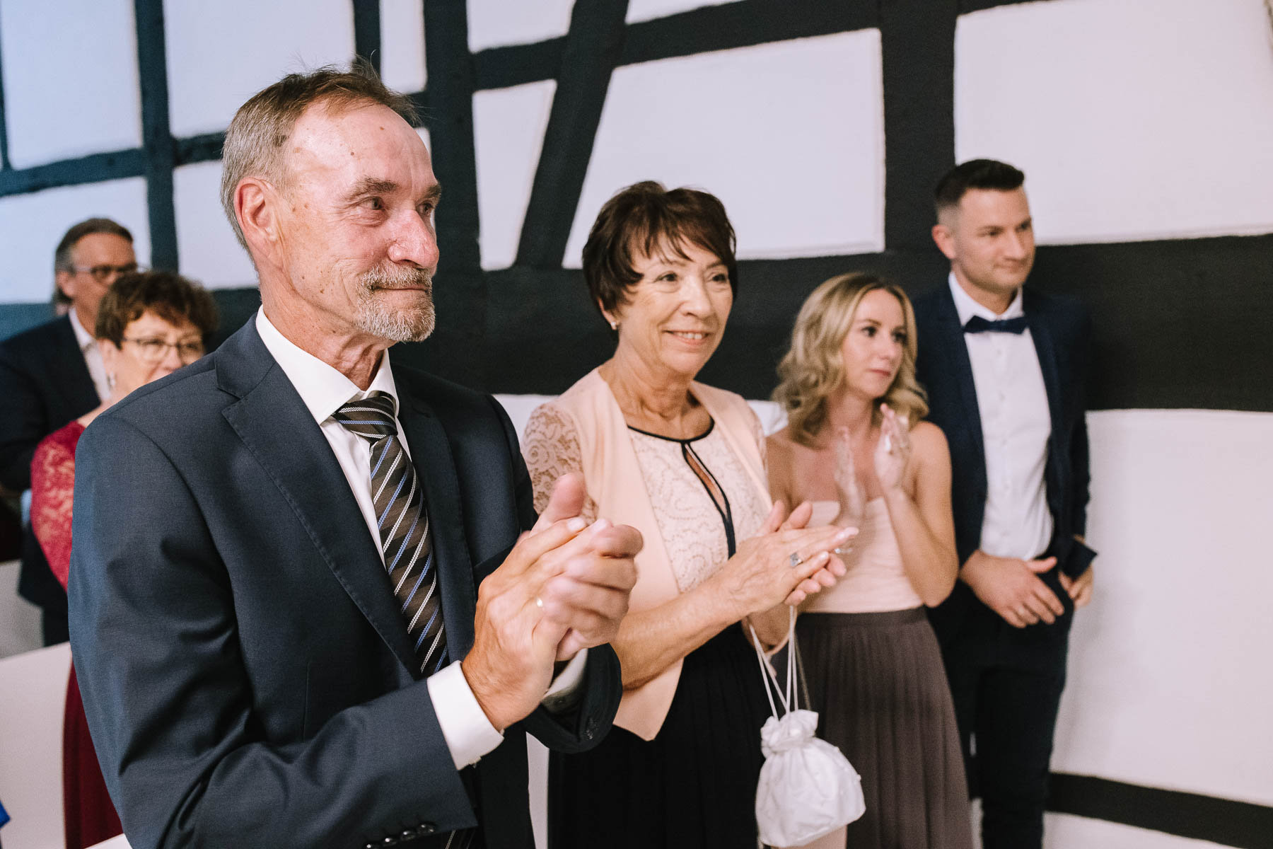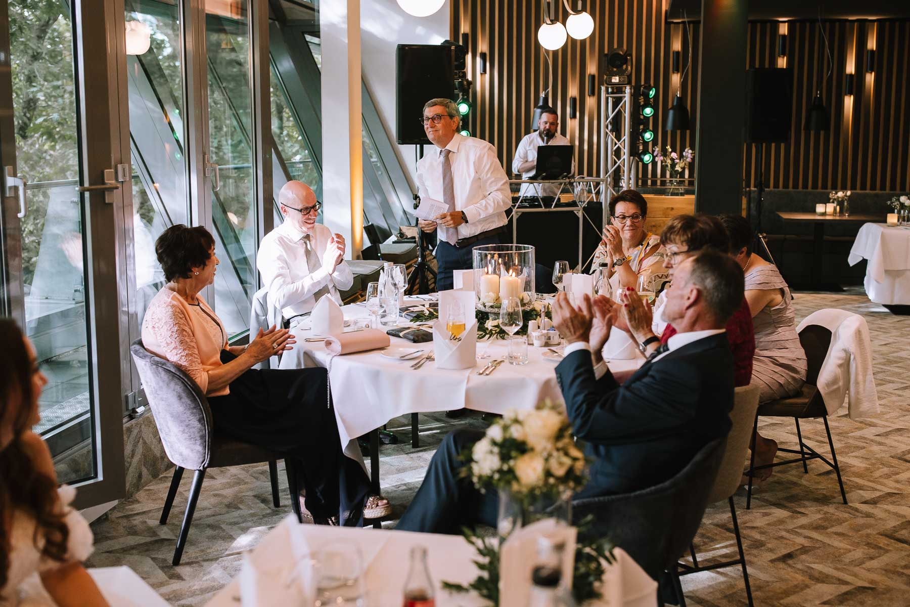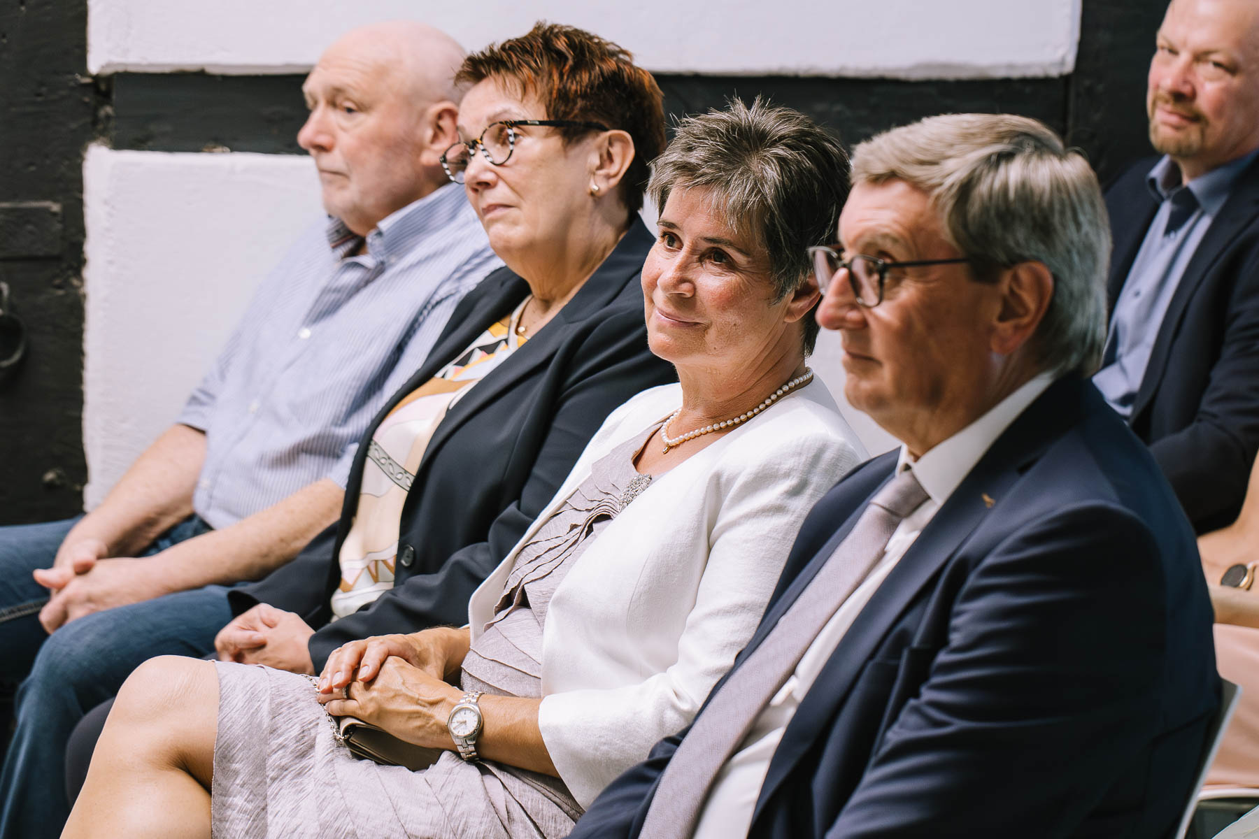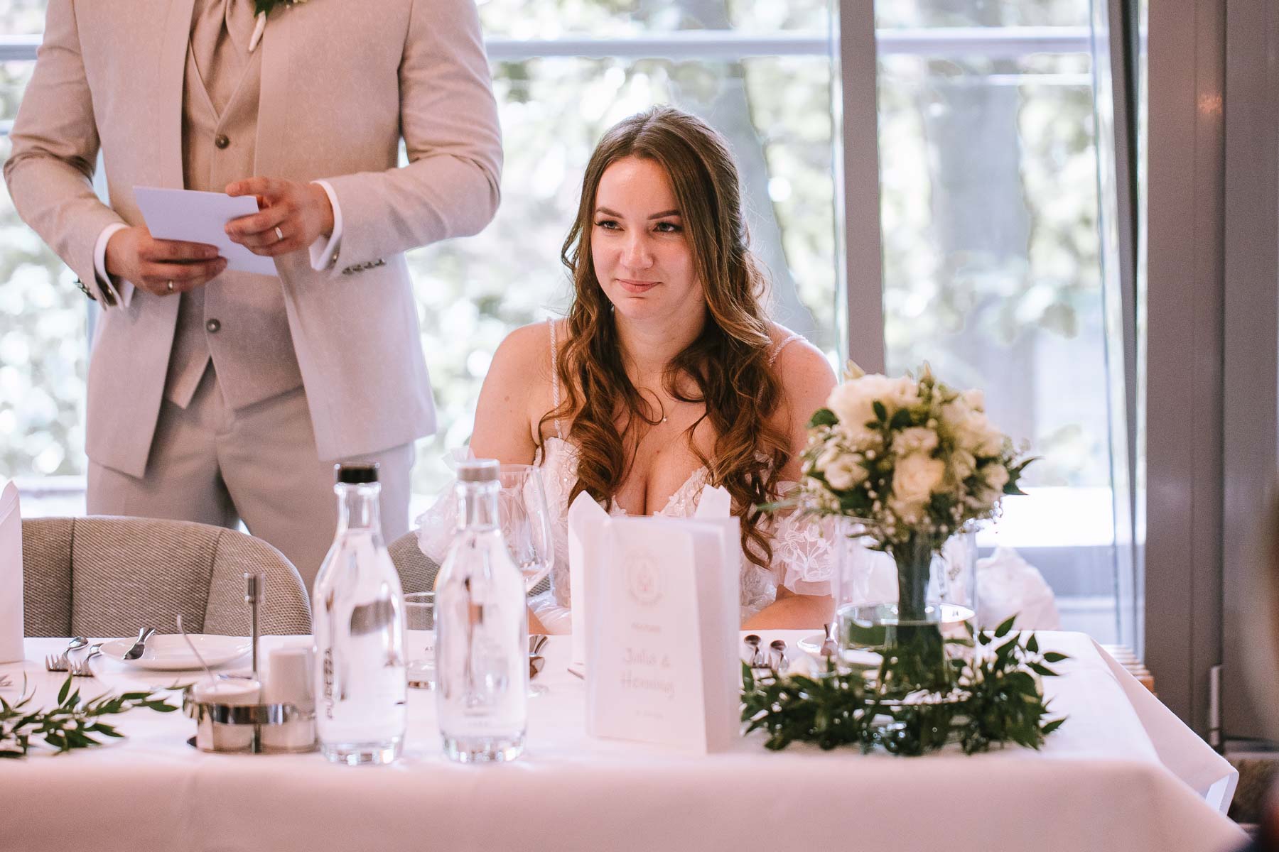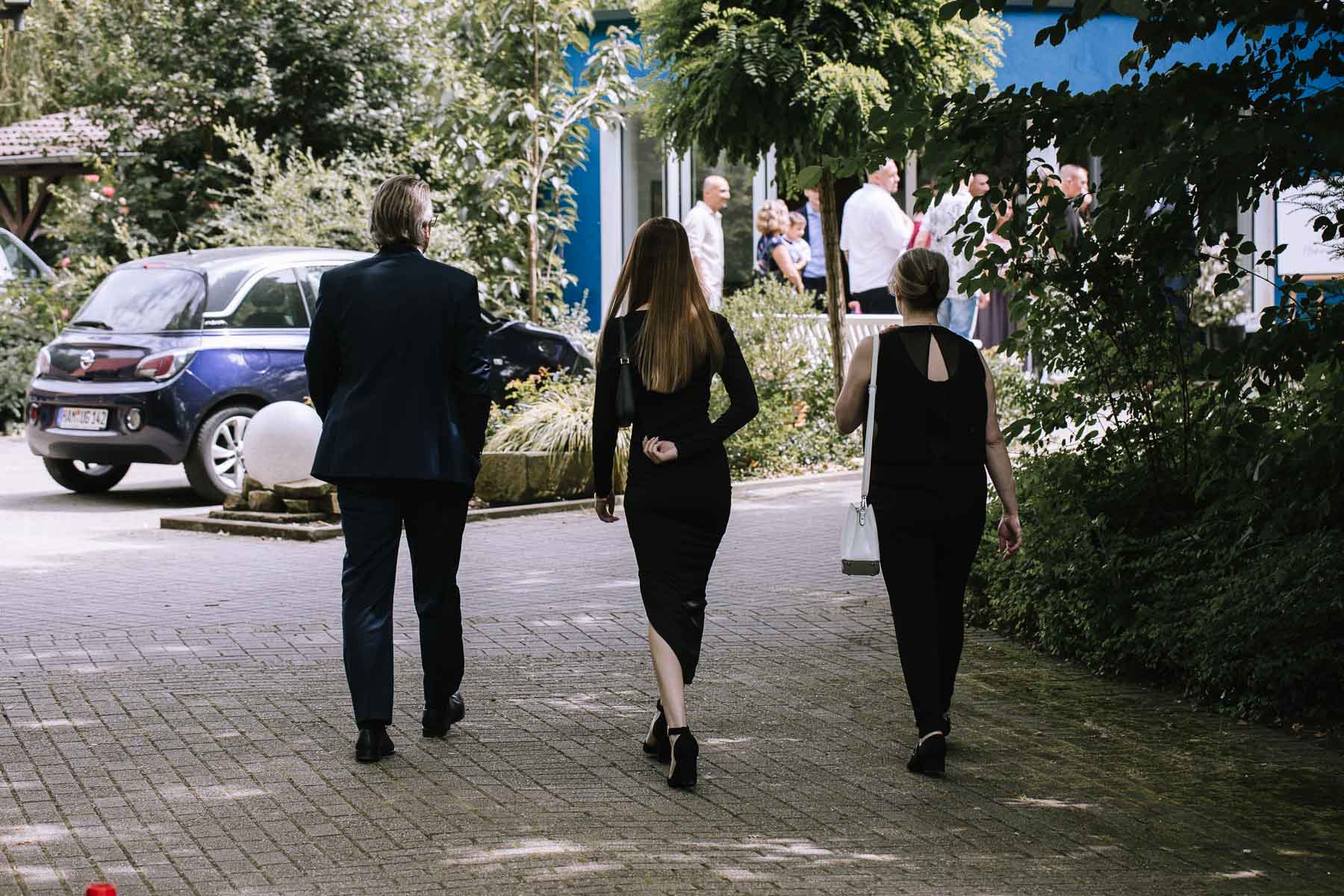 Gänsehaut pur! Nach dieser emotionalen Begegnung ging es weiter zur Freien Trauung. Der Hof Middendorf war der perfekte Ort für eine solche Zeremonie – idyllisch, ruhig, und dennoch voller Leben. Es war eine ganz persönliche, intime Atmosphäre, in der Julia und Henning sich das Ja-Wort gaben. Direkt im Anschluss an die Trauung warteten die Gäste auf das frisch vermählte Paar, und was für ein Empfang! Ein Schwarz-Gelbes Spalier! Henning ist ein riesiger BVB-Fan, und das war natürlich ein absoluter Highlight-Moment. Die Begeisterung war spürbar, als Henning voller Stolz durch das Spalier ging – und ganz nebenbei, der Clou: Im Ring von Henning ist der Signal-Iduna-Park eingraviert. Eine wahre Hommage an sein Herz für Borussia Dortmund! Nach dieser emotionalen Zeremonie fuhren wir weiter ins Hotel am Kloster in Werne. Der moderne Saal im Dachgeschoss war wirklich ein Traum. Riesige Fensterfronten, die den Raum in ein wunderschönes, warmes Licht tauchten, und der Rooftop-Balkon, von dem man einen atemberaubenden Ausblick hatte – ein ganz besonderer Ort für eine Feier, die genauso einzigartig war wie das Brautpaar selbst. Als die Gäste nach und nach eintrafen, spielte der DJ schon moderne Bachata-Musik – eine so entspannte Stimmung, die sofort alle in Feierlaune versetzte. Ich habe die Freude und das Lachen der Gäste förmlich gespürt. Man konnte die Liebe und die Freude von Julia und Henning und ihrer Familie und Freunden in jedem Moment sehen. Aber nicht nur die Stimmung war besonders, sondern auch die Reden der Väter. Beide Väter hielten Worte, die das Herz berührten. Es waren nicht nur Geschichten über die Kindheit der beiden, sondern auch tiefgründige und sehr emotionale Gedanken über die Bedeutung von Familie, Liebe und Zusammenhalt. Ich habe wirklich nicht nur mit den Augen, sondern auch mit dem Herzen fotografiert – solche Momente darf man nicht verpassen. Wenn ich an Julia und Henning denke, dann sehe ich eine Hochzeit voller Emotionen, persönlicher Details und einer unglaublichen Stimmung. Jeder Moment war einzigartig, und ich bin so dankbar, dass ich Teil dieses besonderen Tages sein durfte. Für mich als Hochzeitsfotografin gibt es kaum etwas Schöneres, als die Liebe zwischen zwei Menschen auf solche Weise festzuhalten – die zarten, emotionalen Momente genauso wie die ausgelassenen, fröhlichen Augenblicke. Ich wünsche Julia und Henning alles Liebe und freue mich, diese wunderschönen Erinnerungen für sie auf Bildern festgehalten zu haben!